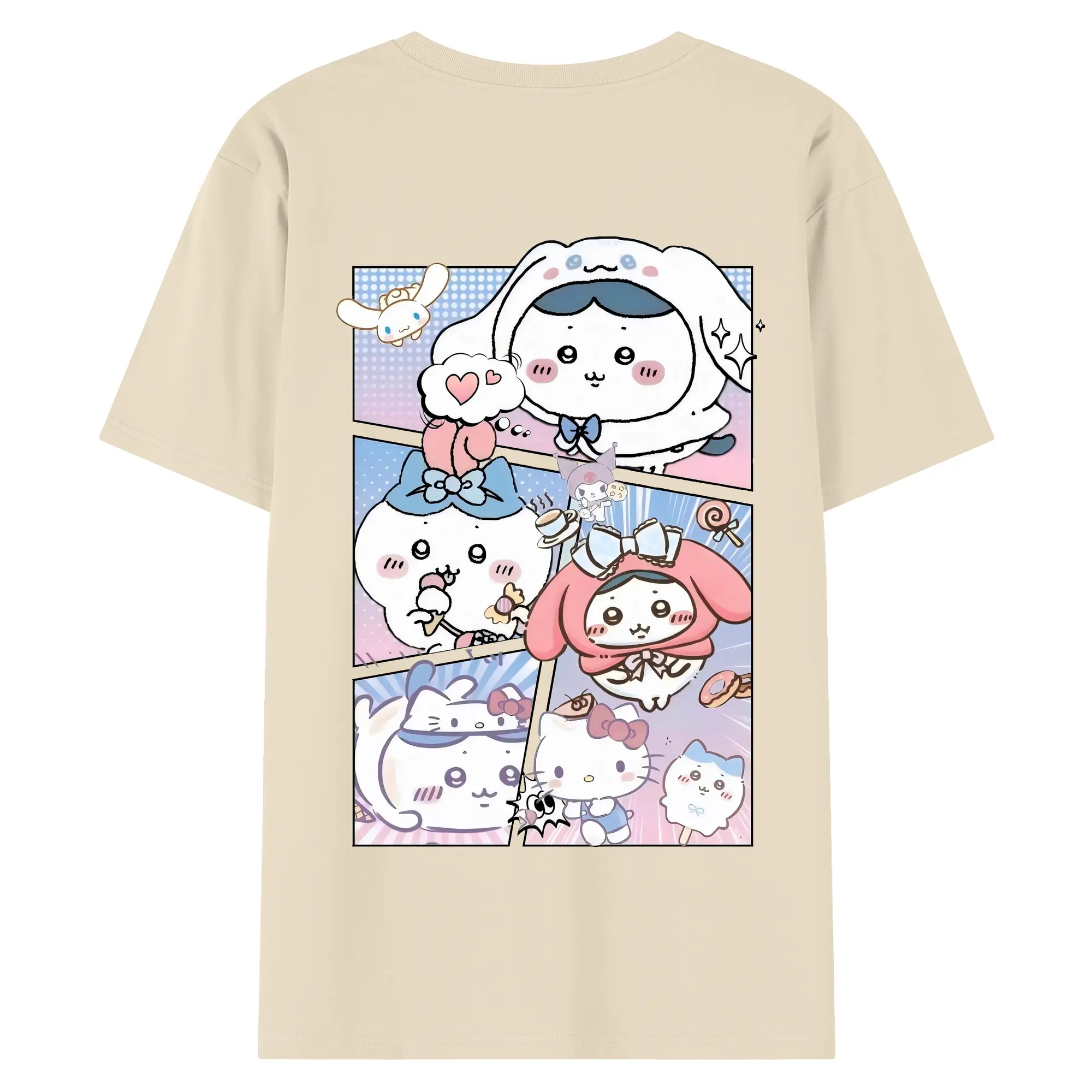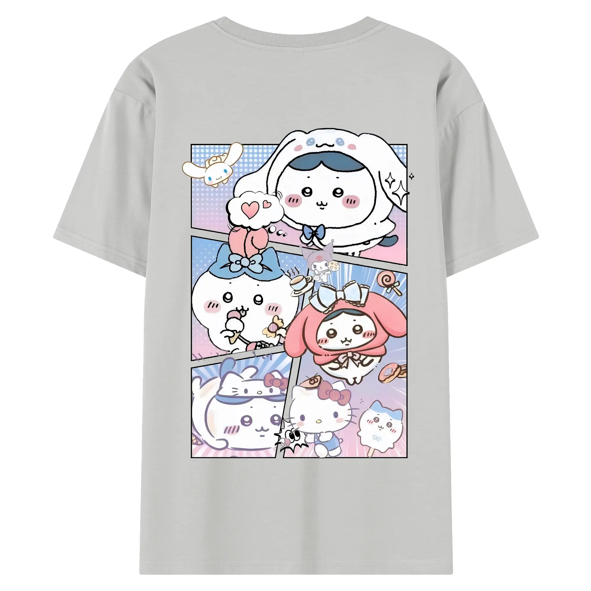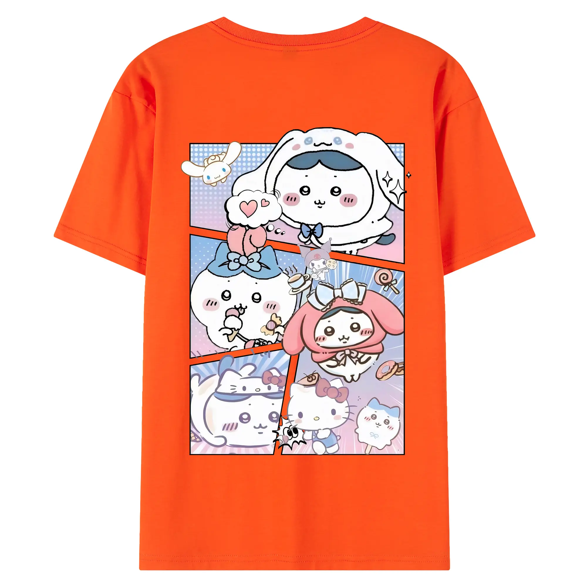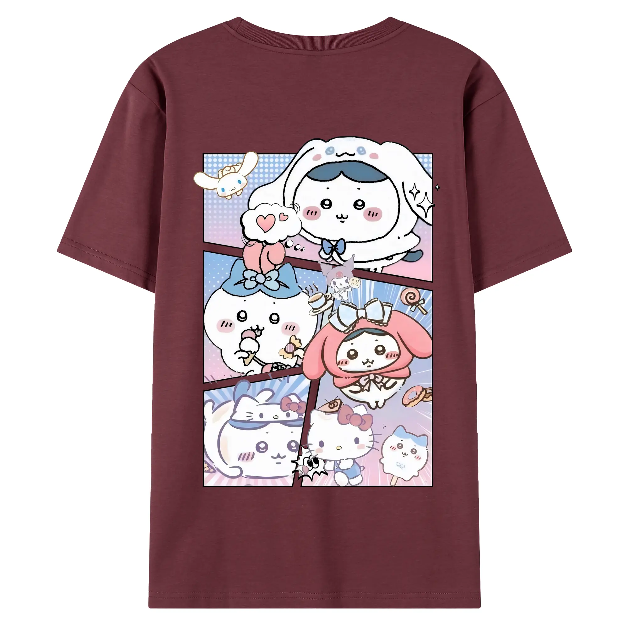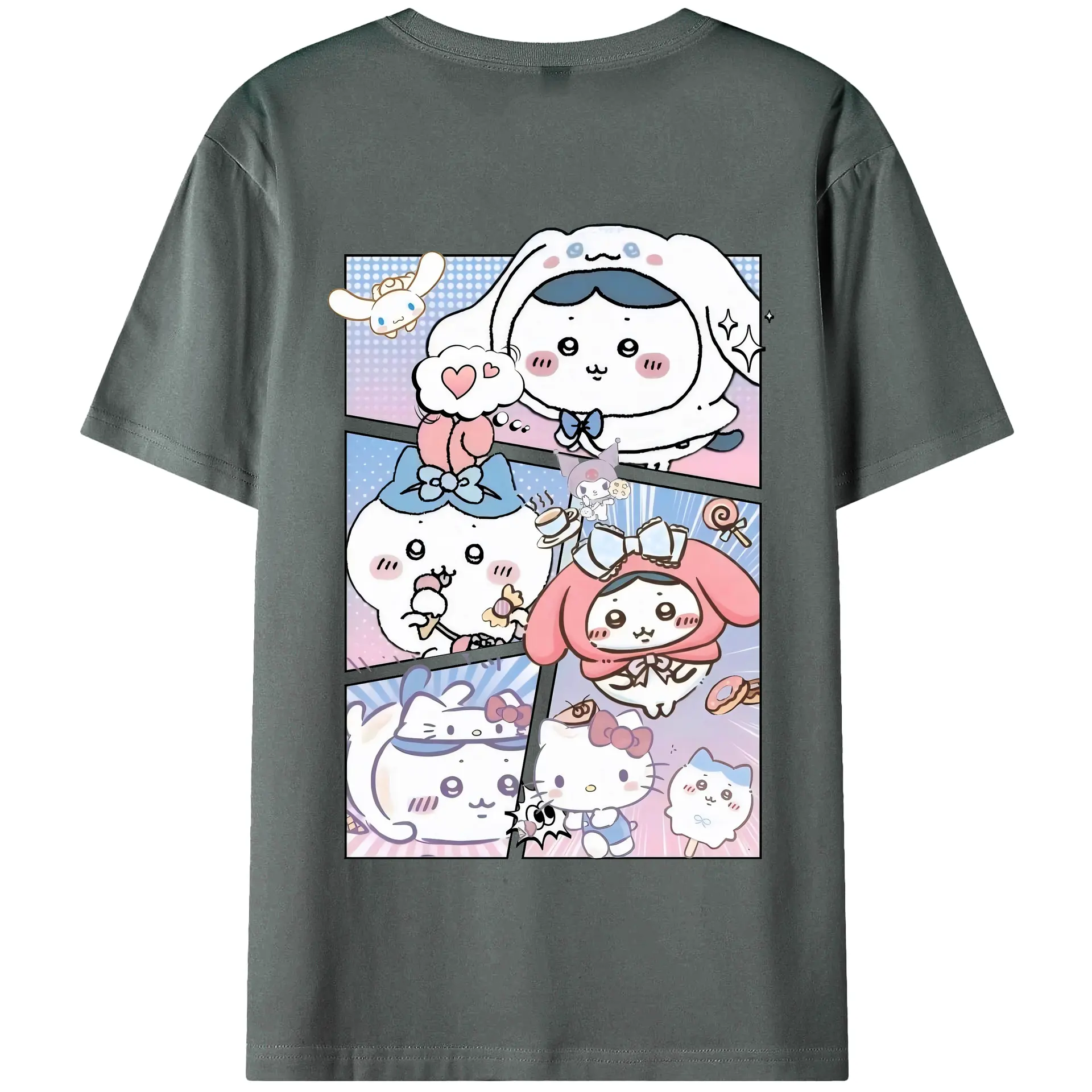 ちい が わ グッズ ハチワレ - 綿100% ヴィンテージ風 半袖Tシャツ ・ 背面プリント ・ 柔らか肌触り ・ 通気性 快適 ・ スポーツ カジュアル 外出用