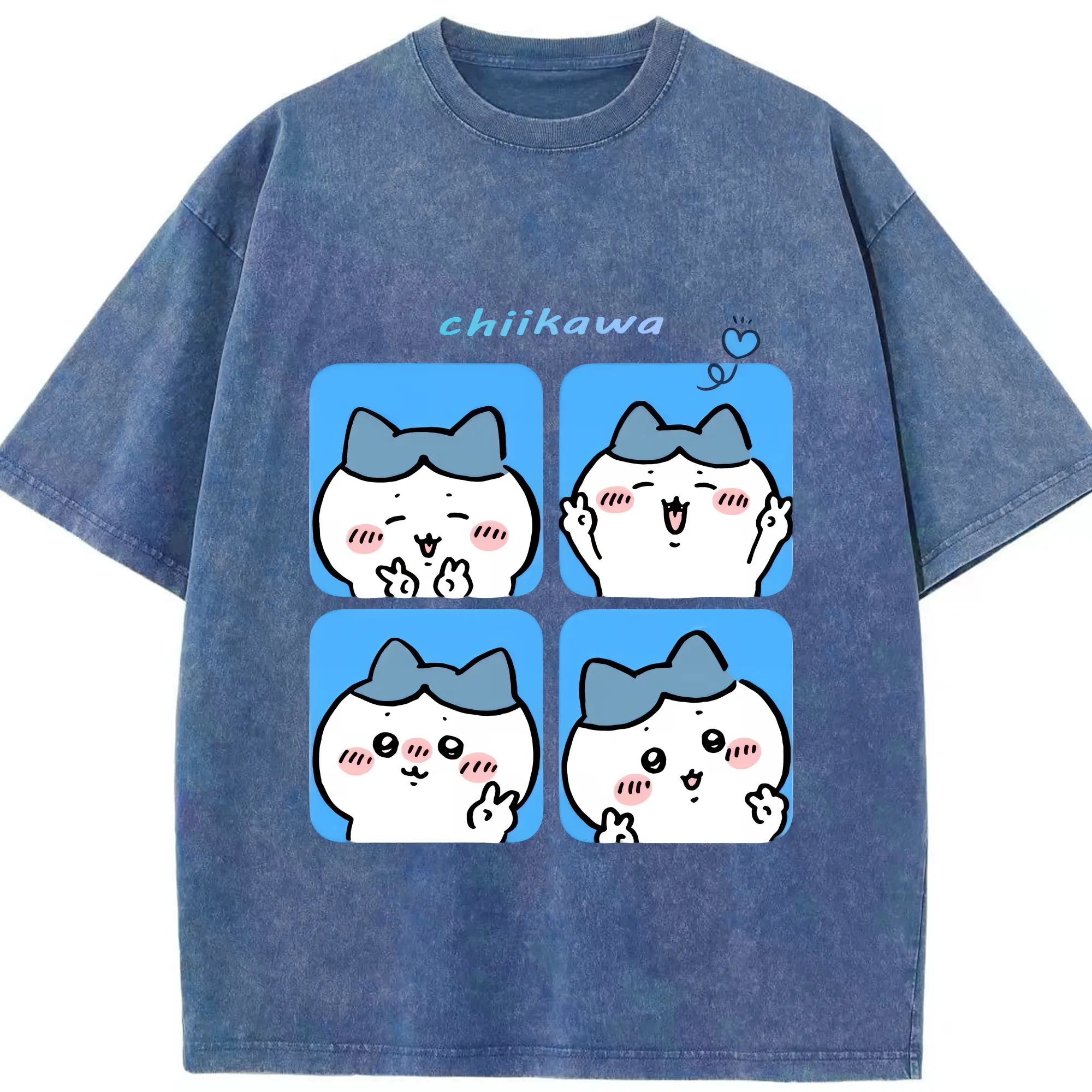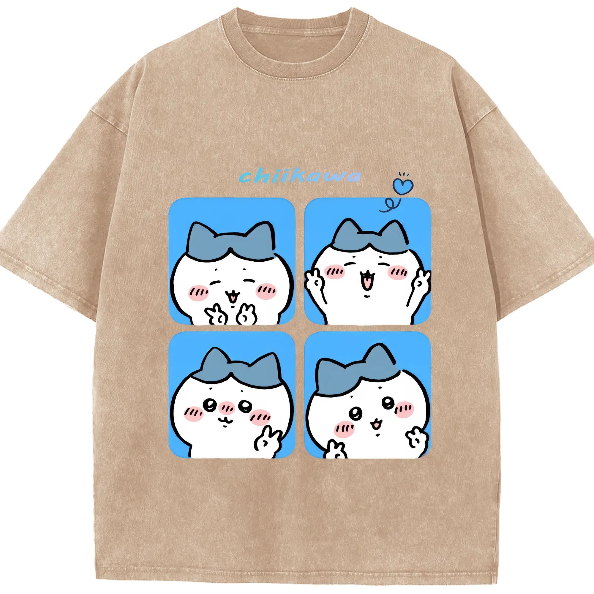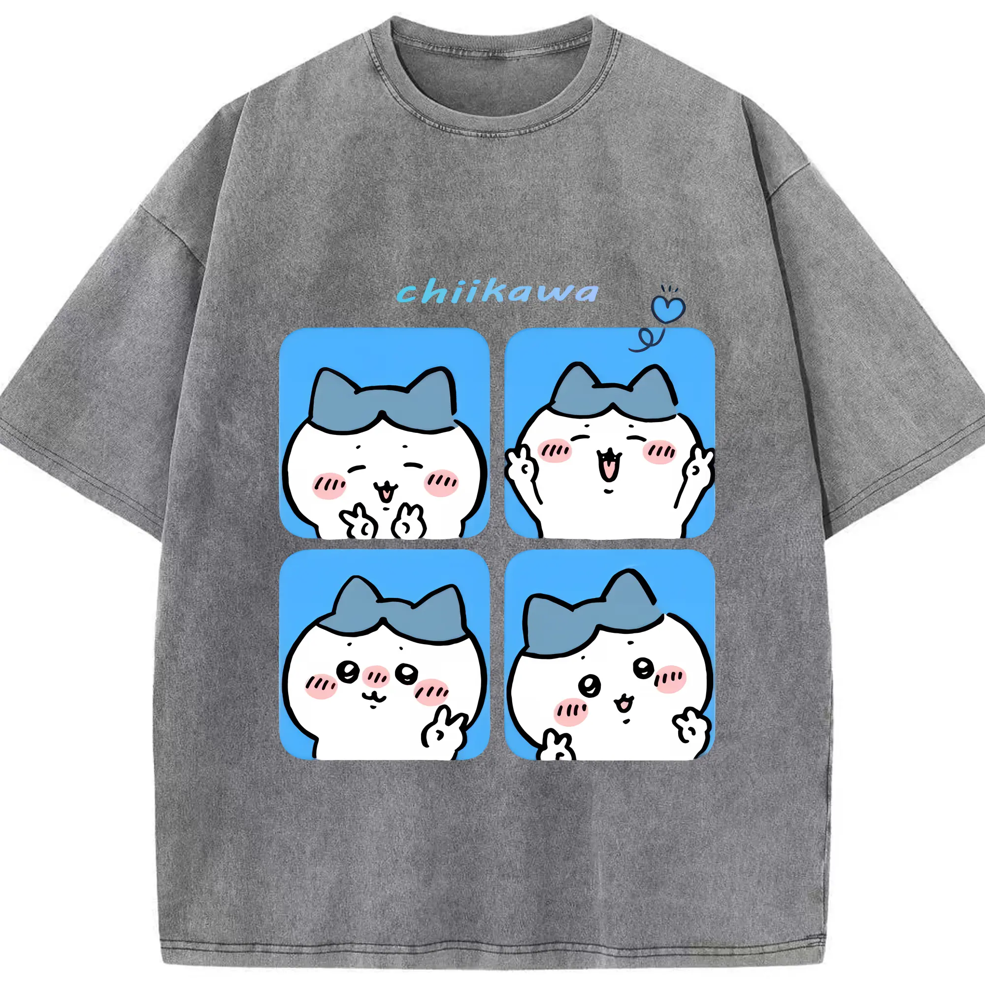 ちい が わ グッズ ハチワレ - 綿100% ヴィンテージ風 半袖Tシャツ ・ 背面プリント ・ 柔らか肌触り ・ 通気性 快適 ・ スポーツ カジュアル 外出用