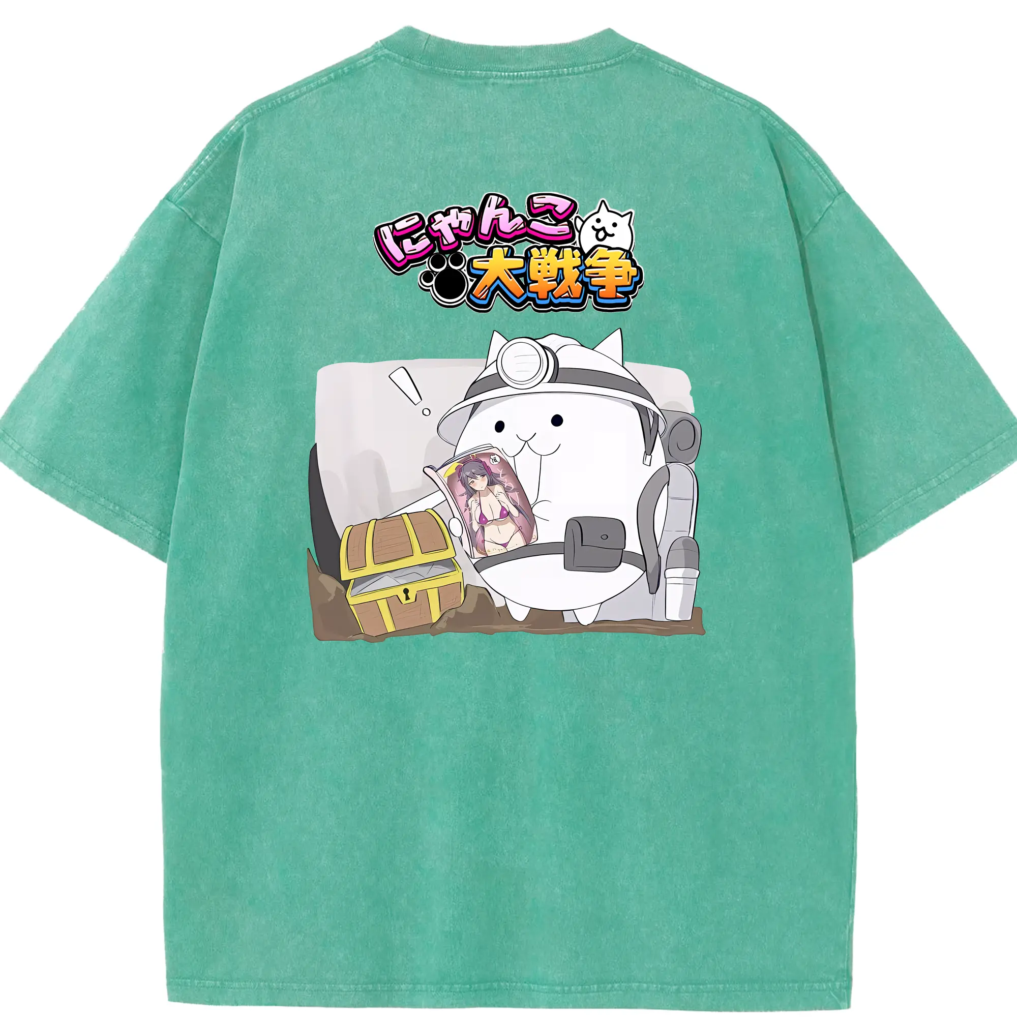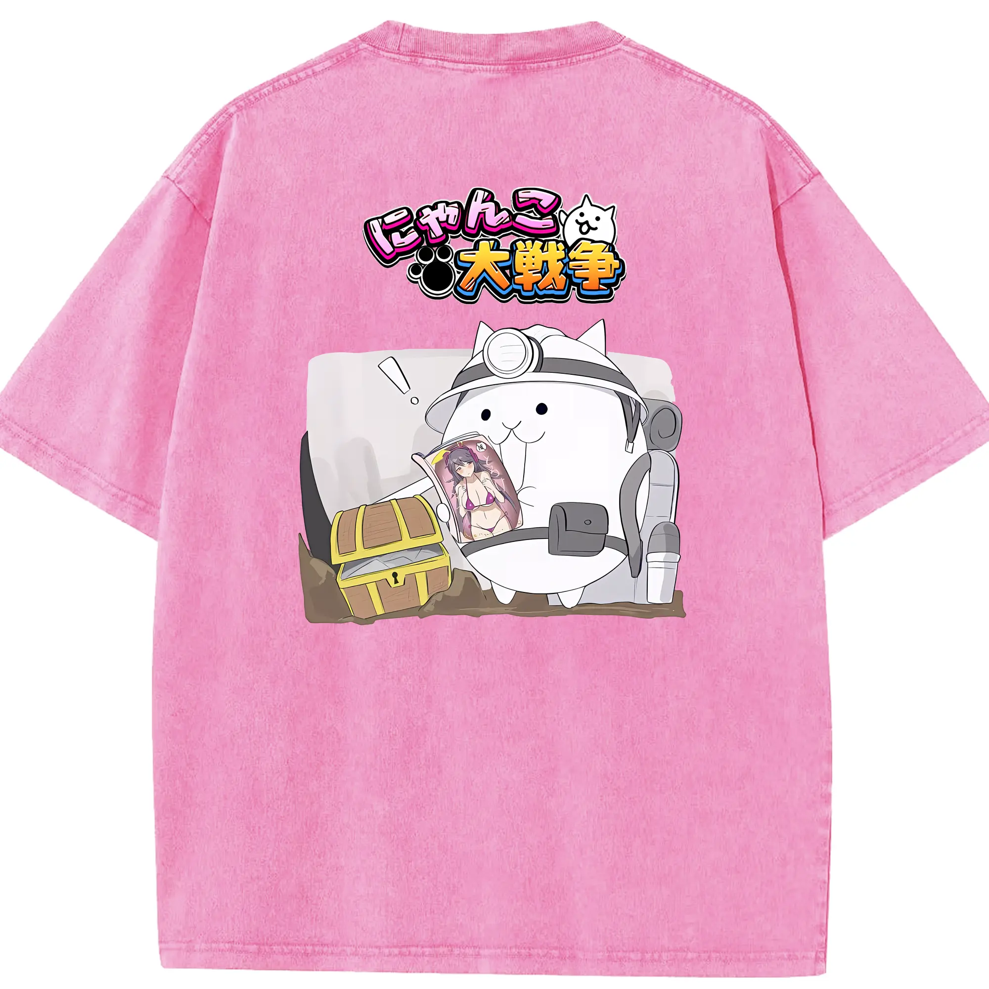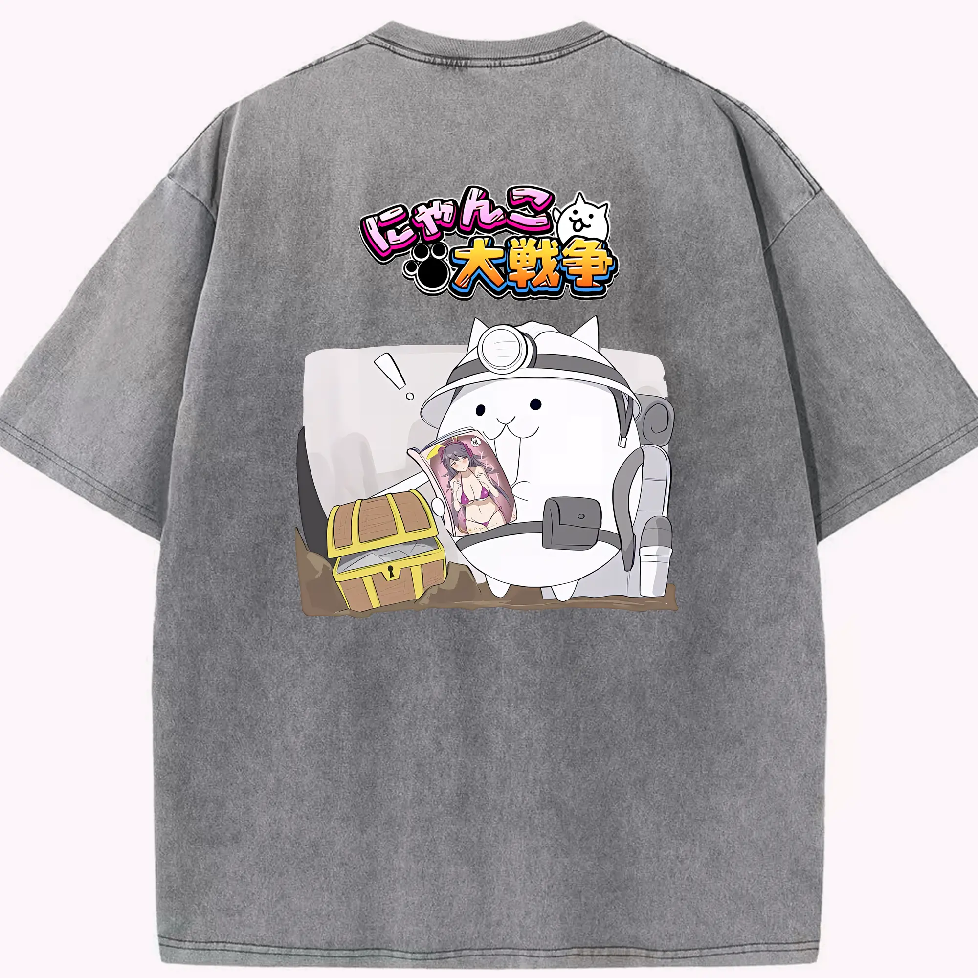 にゃんこ大戦争 グッズ - 綿100% ヴィンテージ風 半袖Tシャツ ・ フロントプリント ・ 柔らか肌触り ・ 通気性 快適 ・ スポーツ カジュアル 外出用