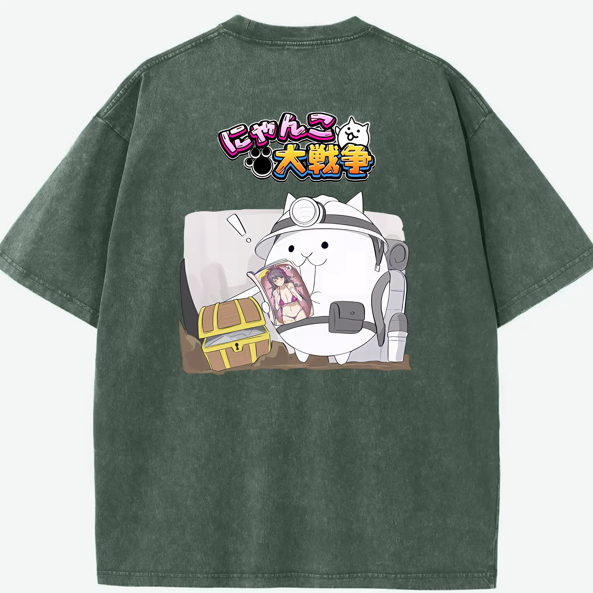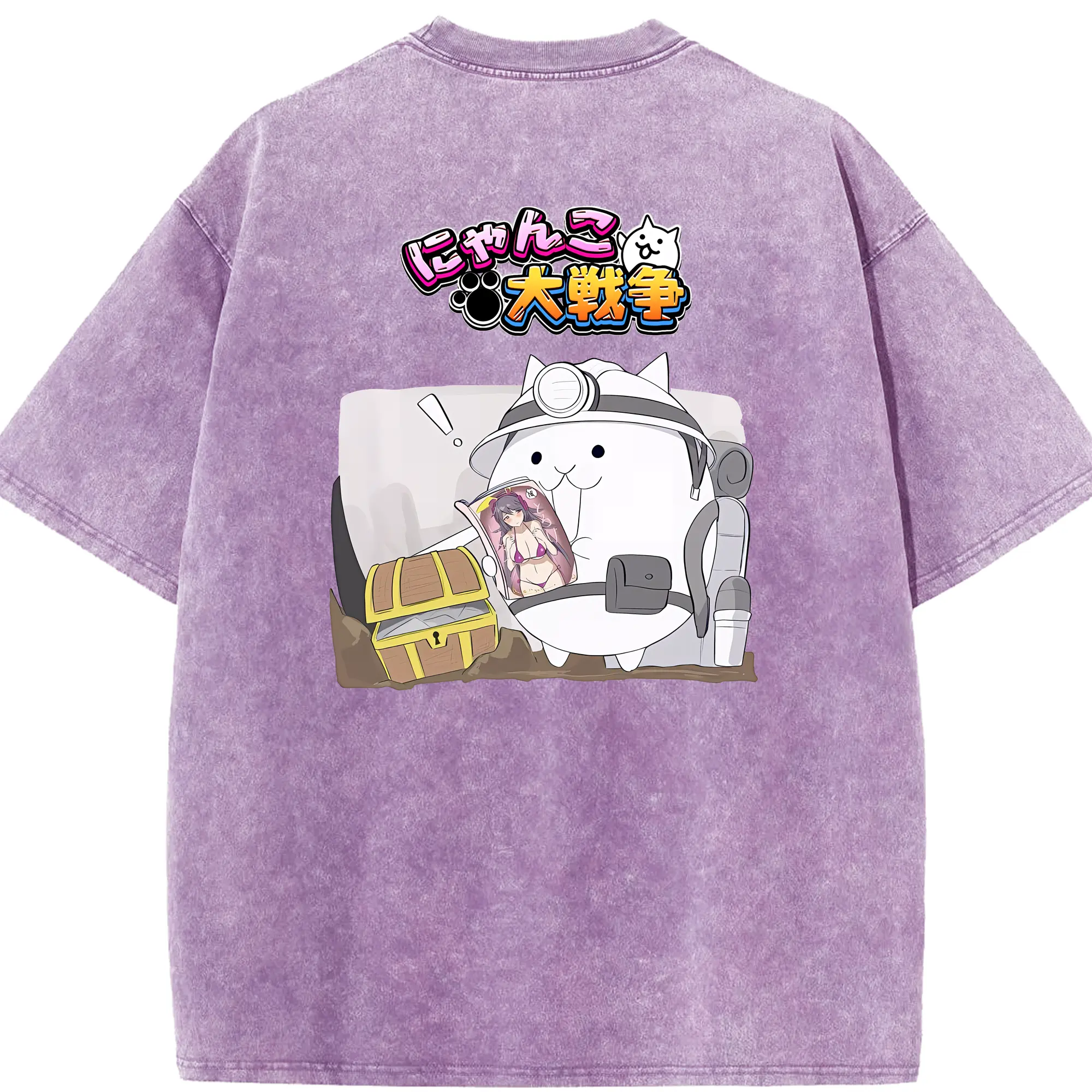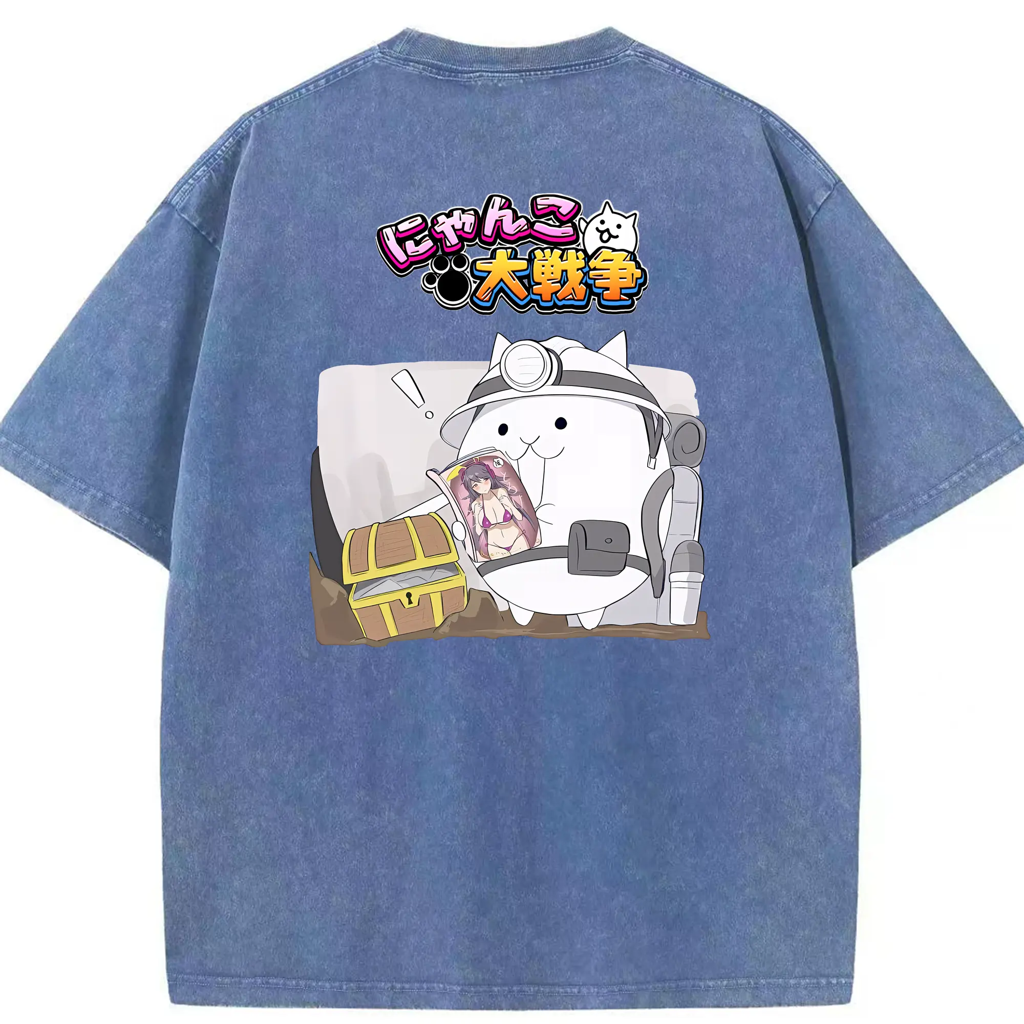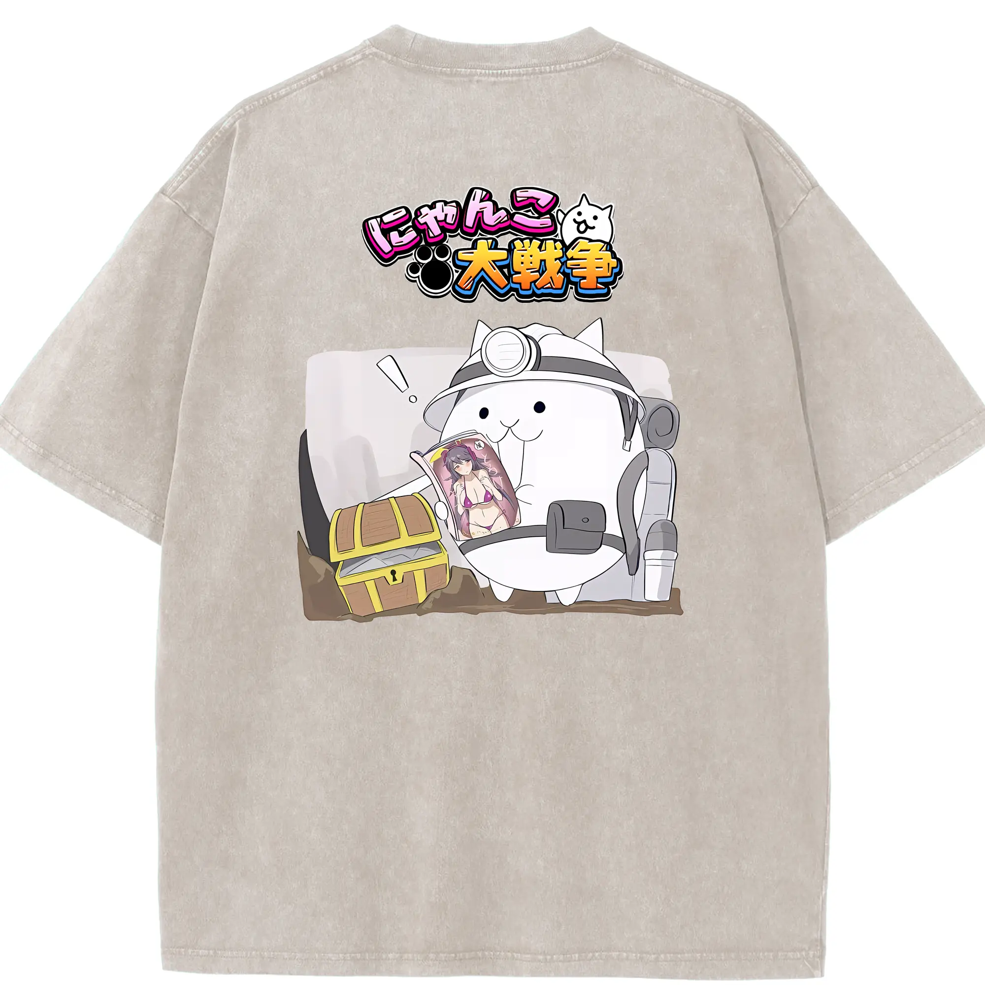 にゃんこ大戦争 グッズ - 綿100% ヴィンテージ風 半袖Tシャツ ・ フロントプリント ・ 柔らか肌触り ・ 通気性 快適 ・ スポーツ カジュアル 外出用