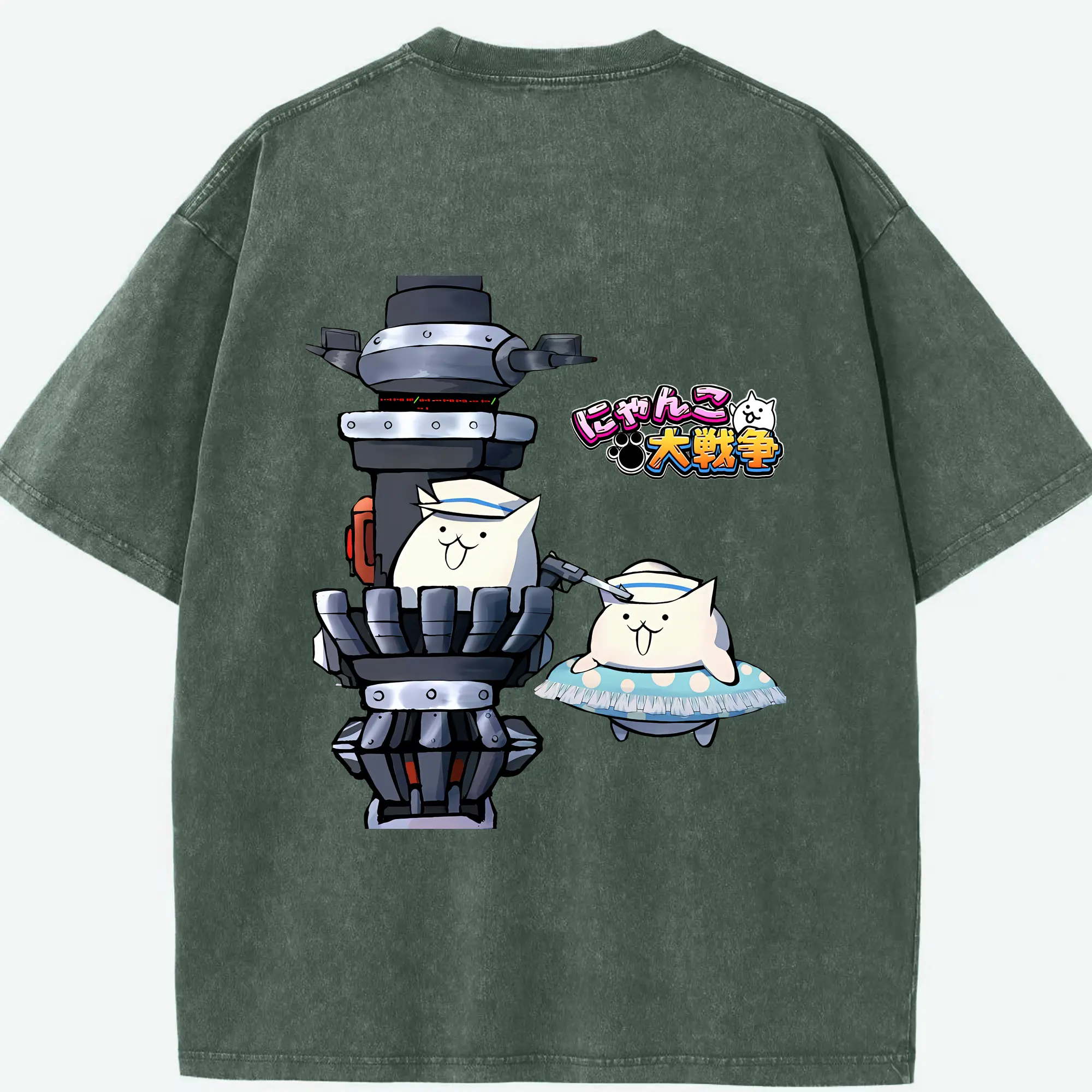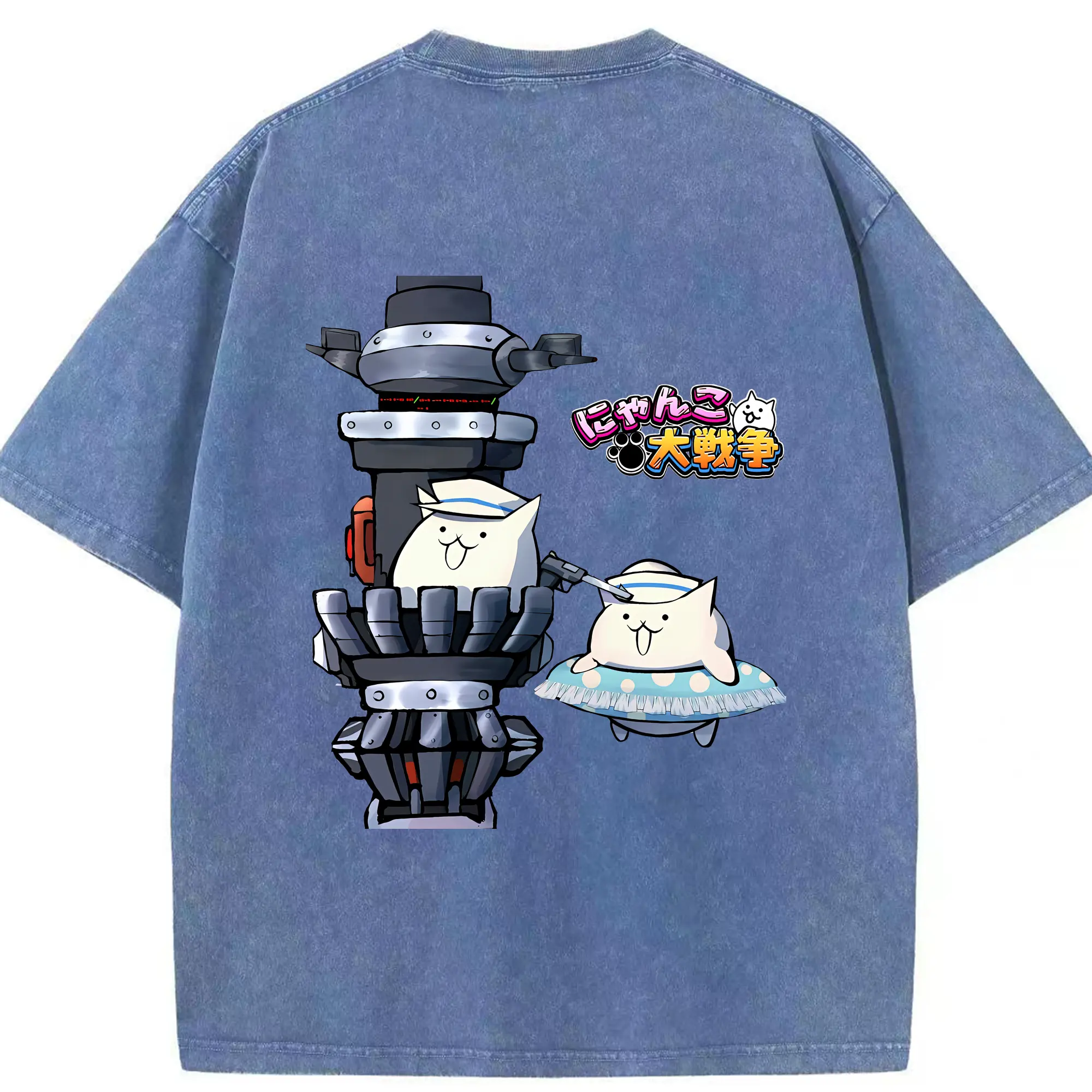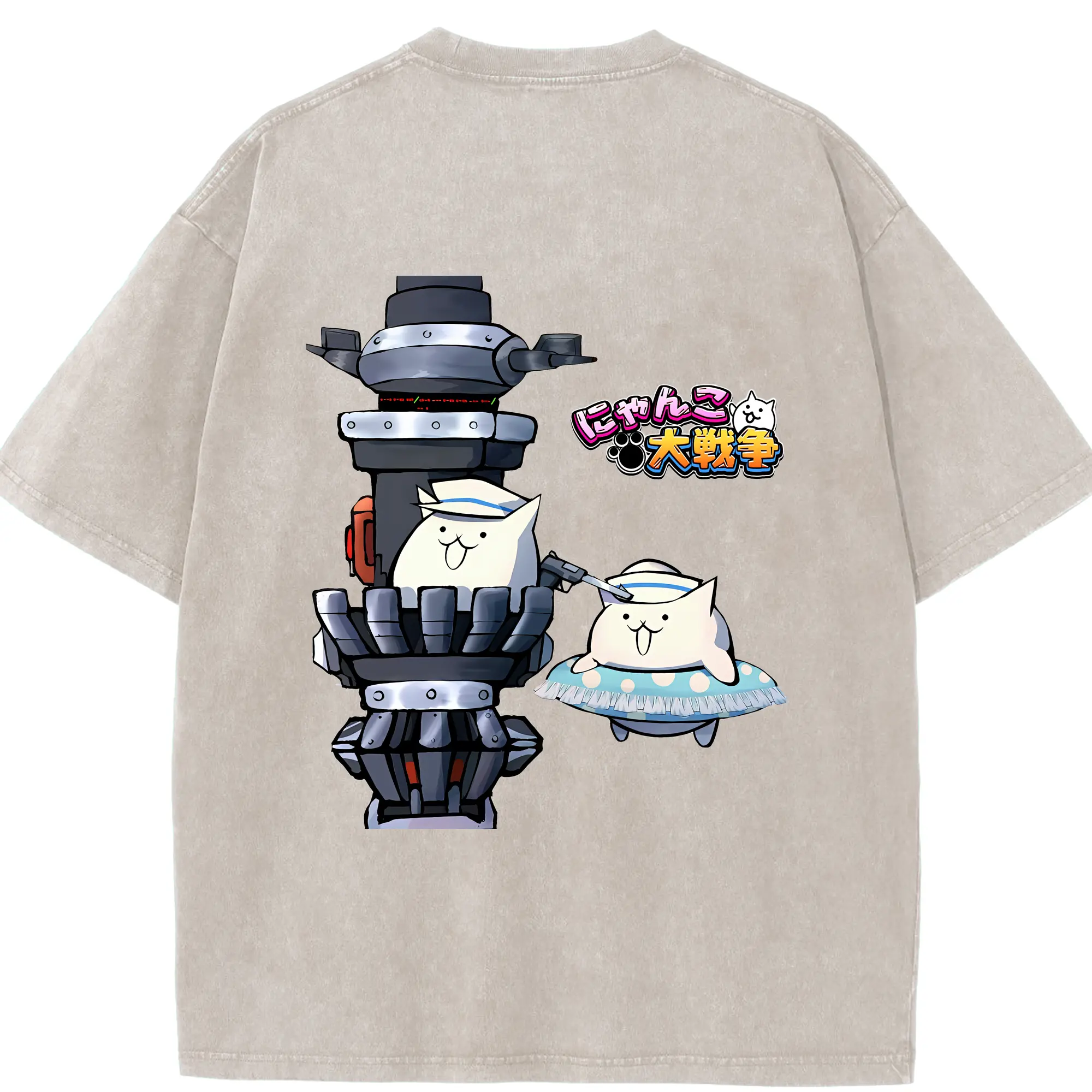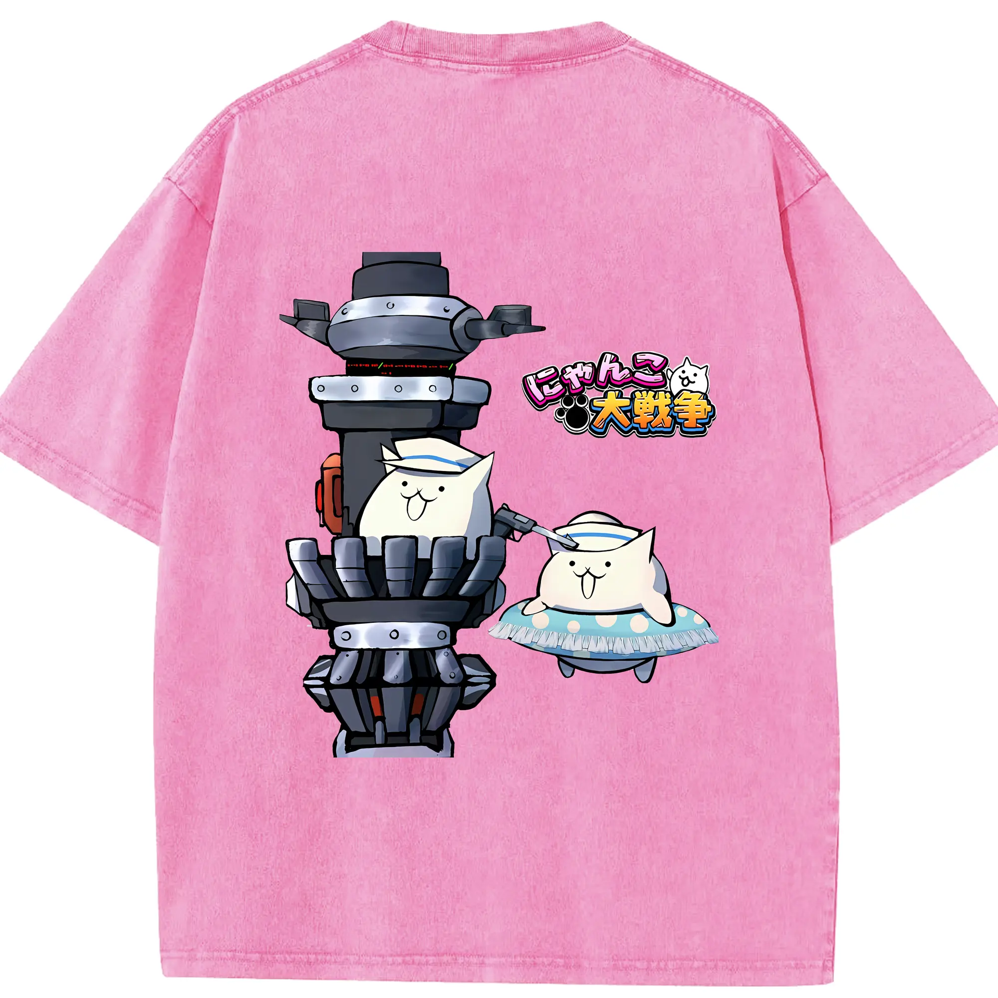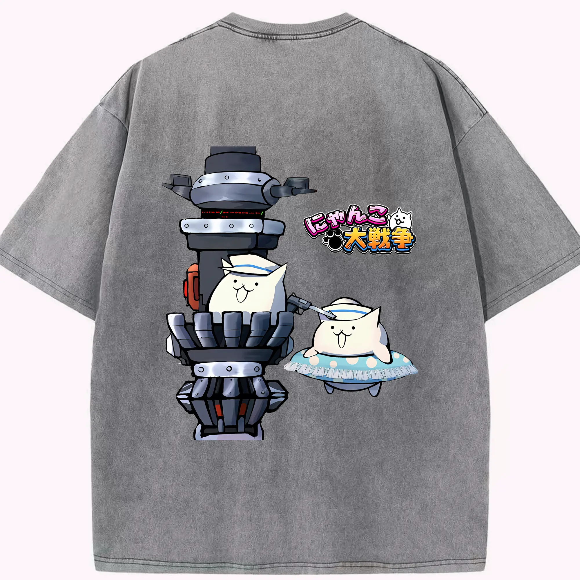 にゃんこ大戦争 グッズ - 綿100% ヴィンテージ風 半袖Tシャツ ・ フロントプリント ・ 柔らか肌触り ・ 通気性 快適 ・ スポーツ カジュアル 外出用