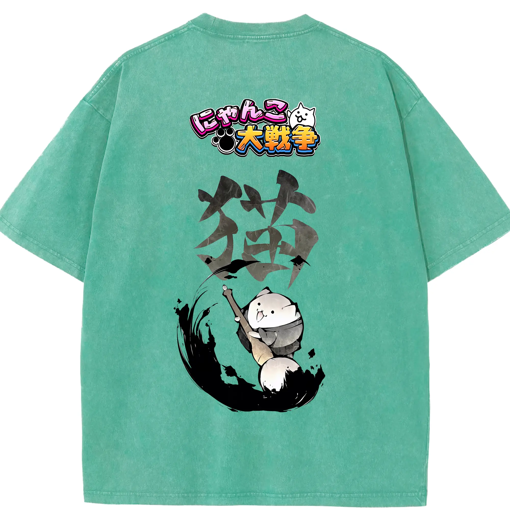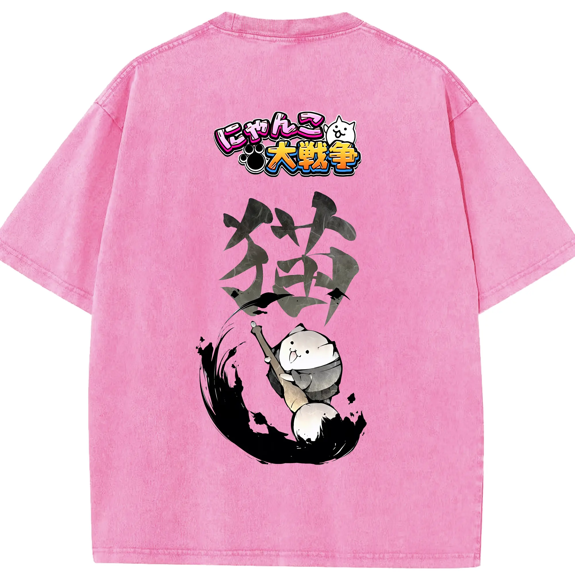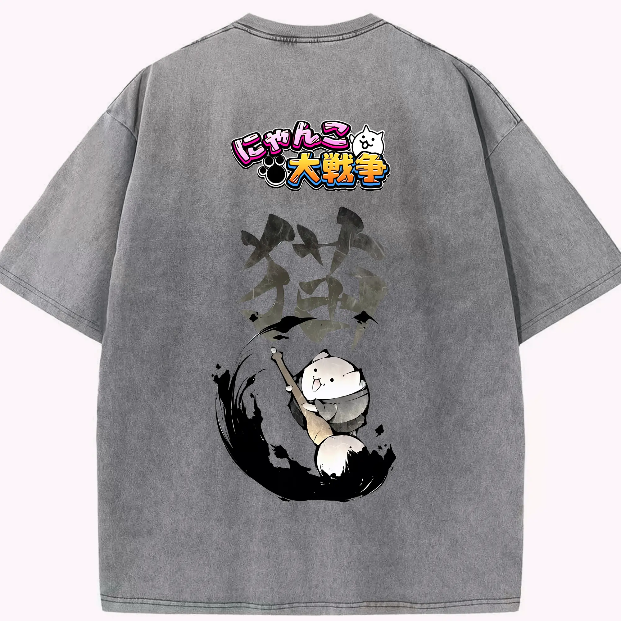 にゃんこ大戦争 グッズ - 綿100% ヴィンテージ風 半袖Tシャツ ・ フロントプリント ・ 柔らか肌触り ・ 通気性 快適 ・ スポーツ カジュアル 外出用