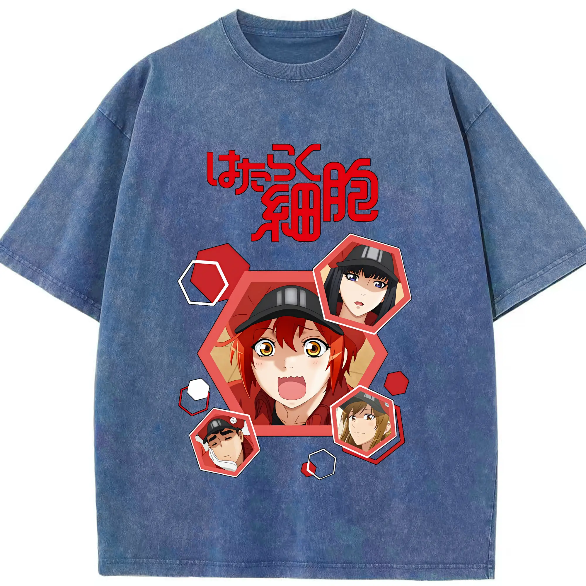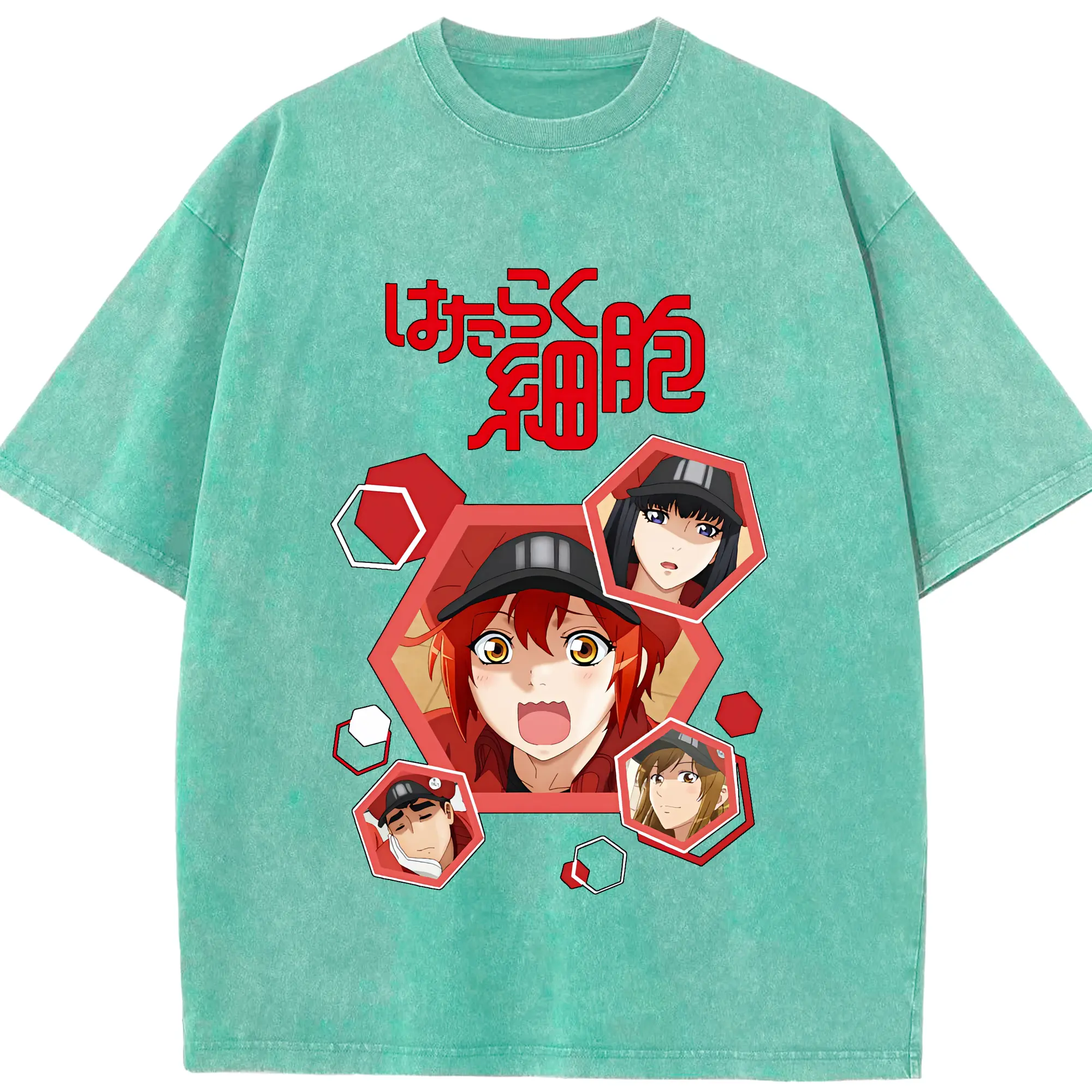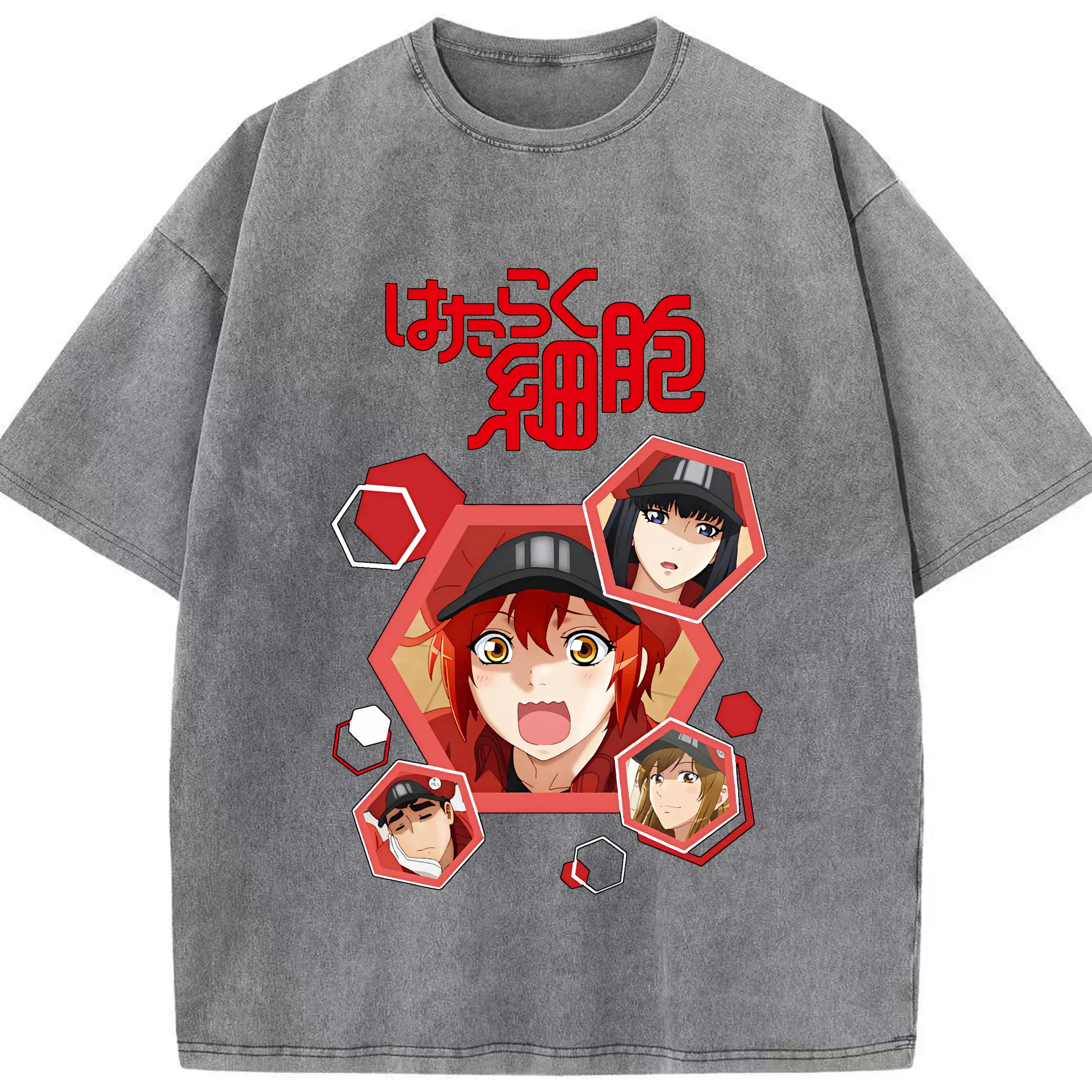 はたらく細胞 グッズ,赤血球 - 綿100% ヴィンテージ風 半袖Tシャツ ・ 背面プリント ・ 柔らか肌触り ・ 通気性 快適 ・ スポーツ カジュアル 外出用