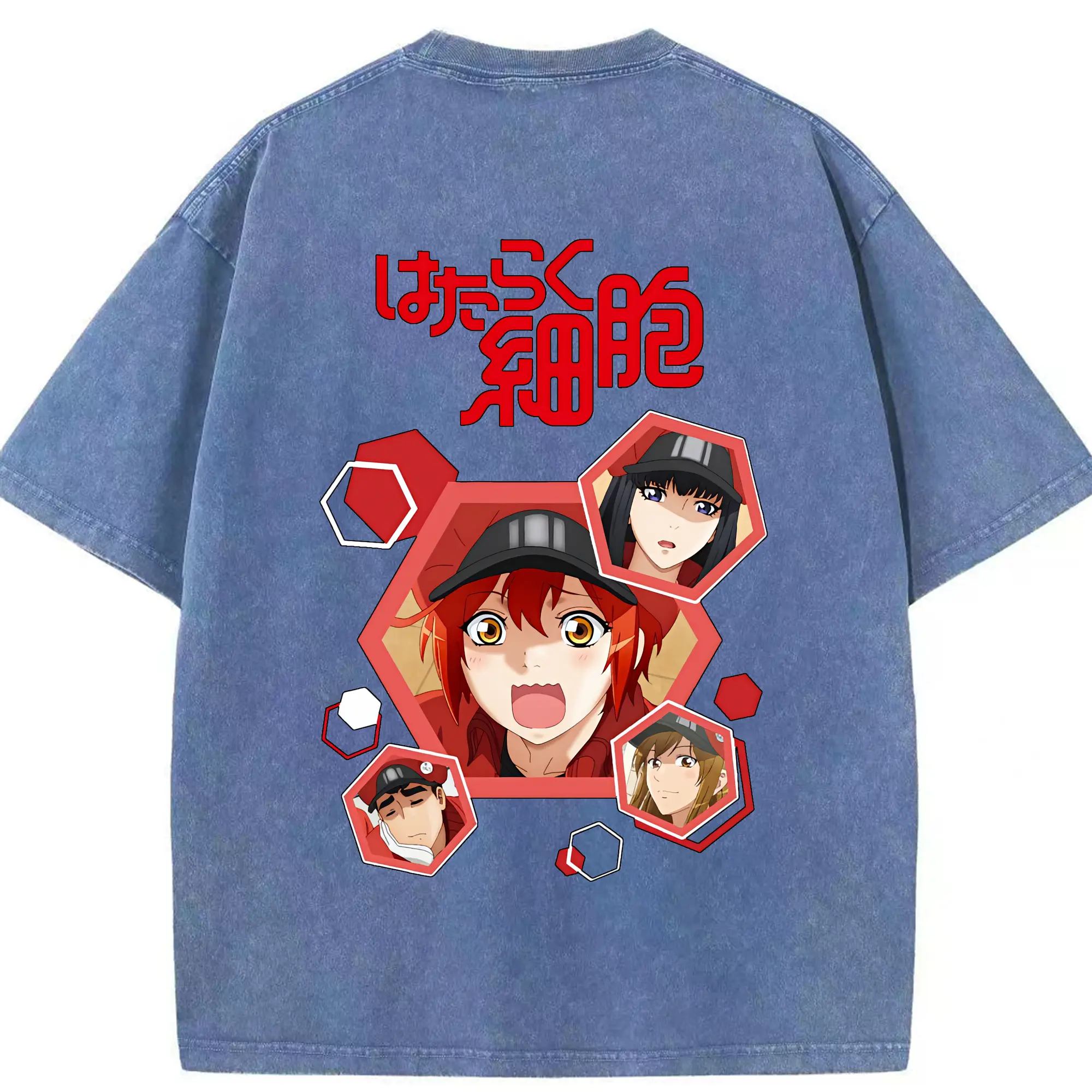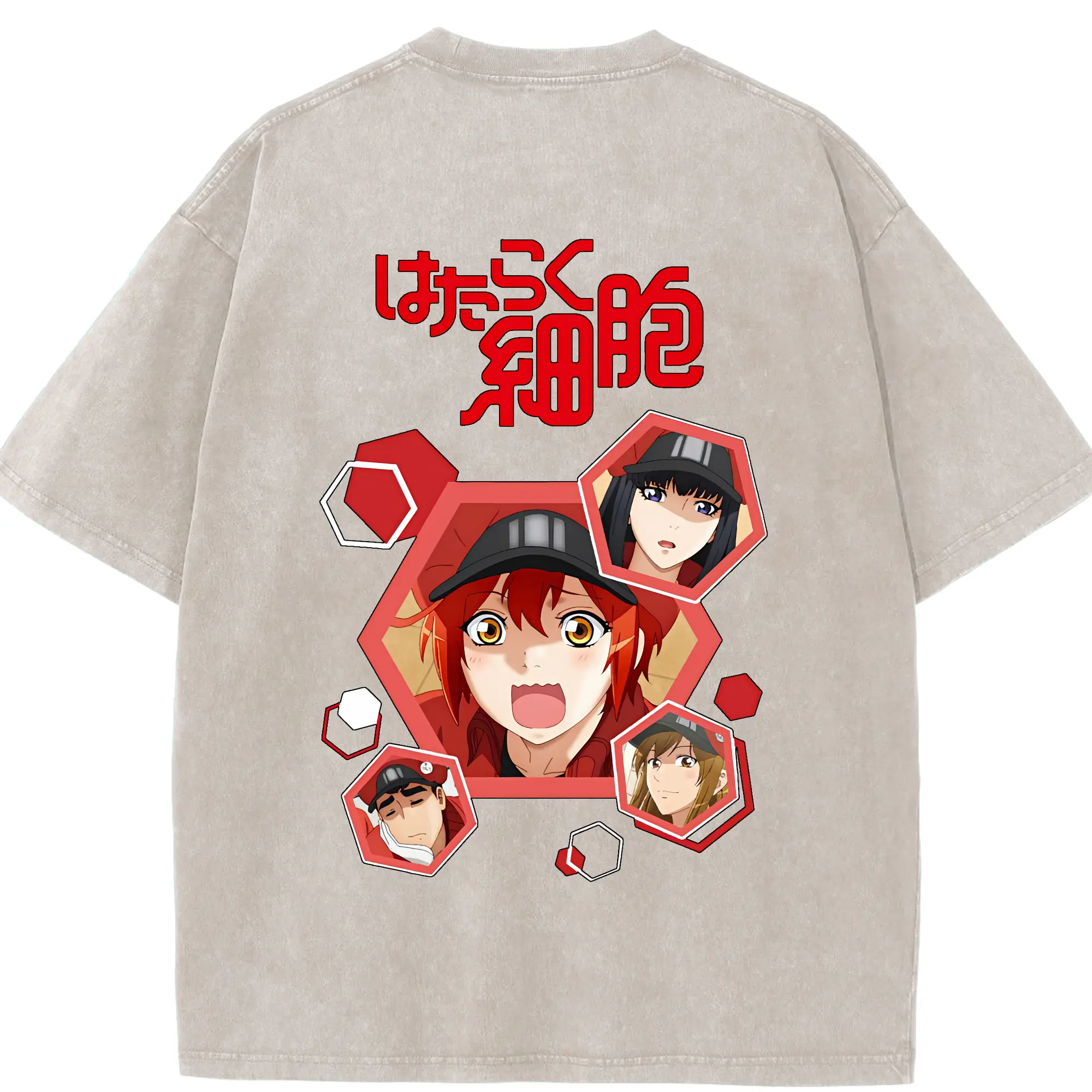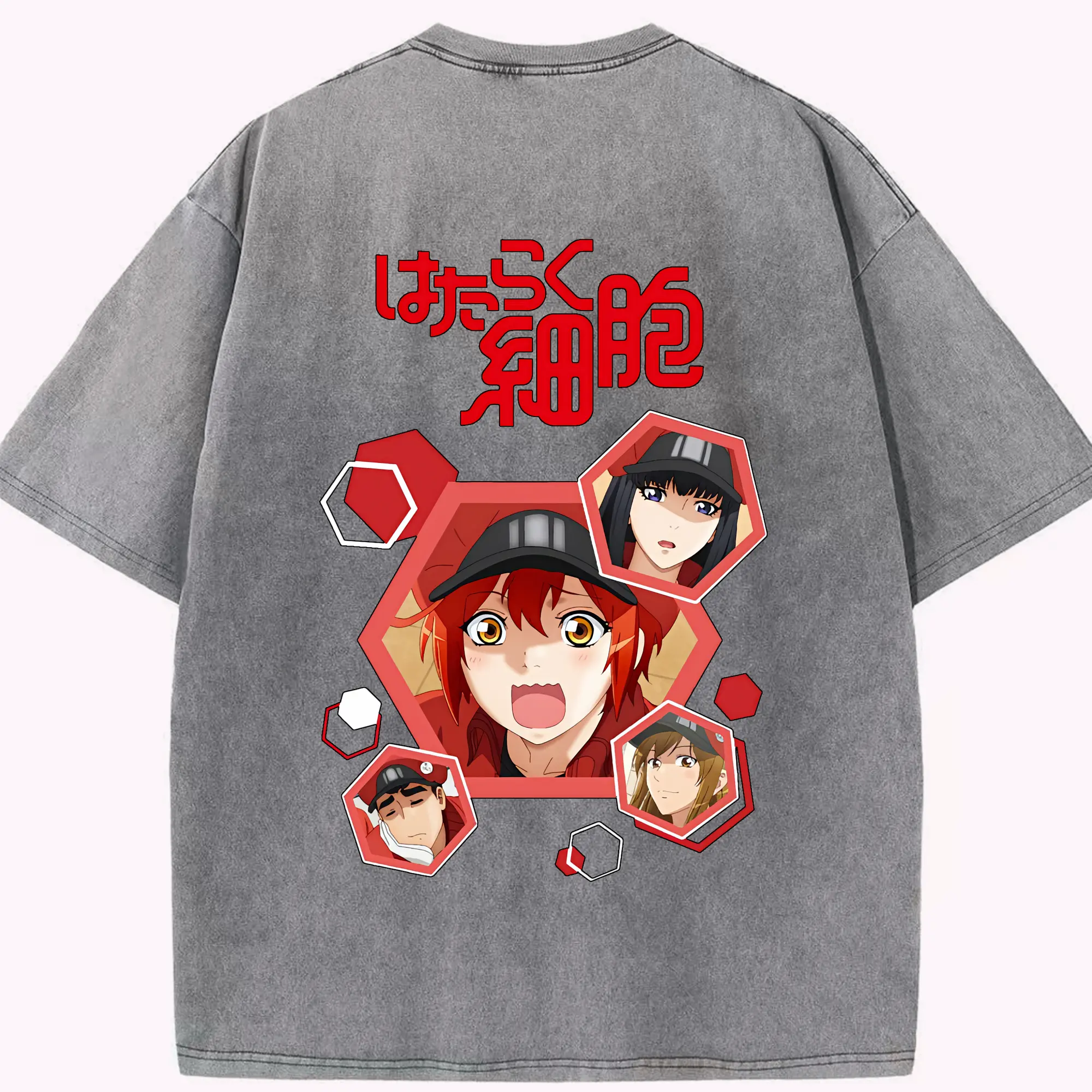はたらく細胞 グッズ,赤血球 - 綿100% ヴィンテージ風 半袖Tシャツ ・ フロントプリント ・ 柔らか肌触り ・ 通気性 快適 ・ スポーツ カジュアル 外出用