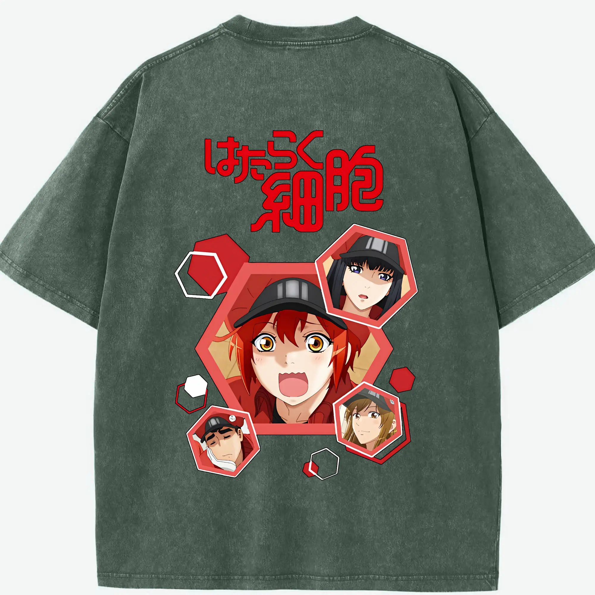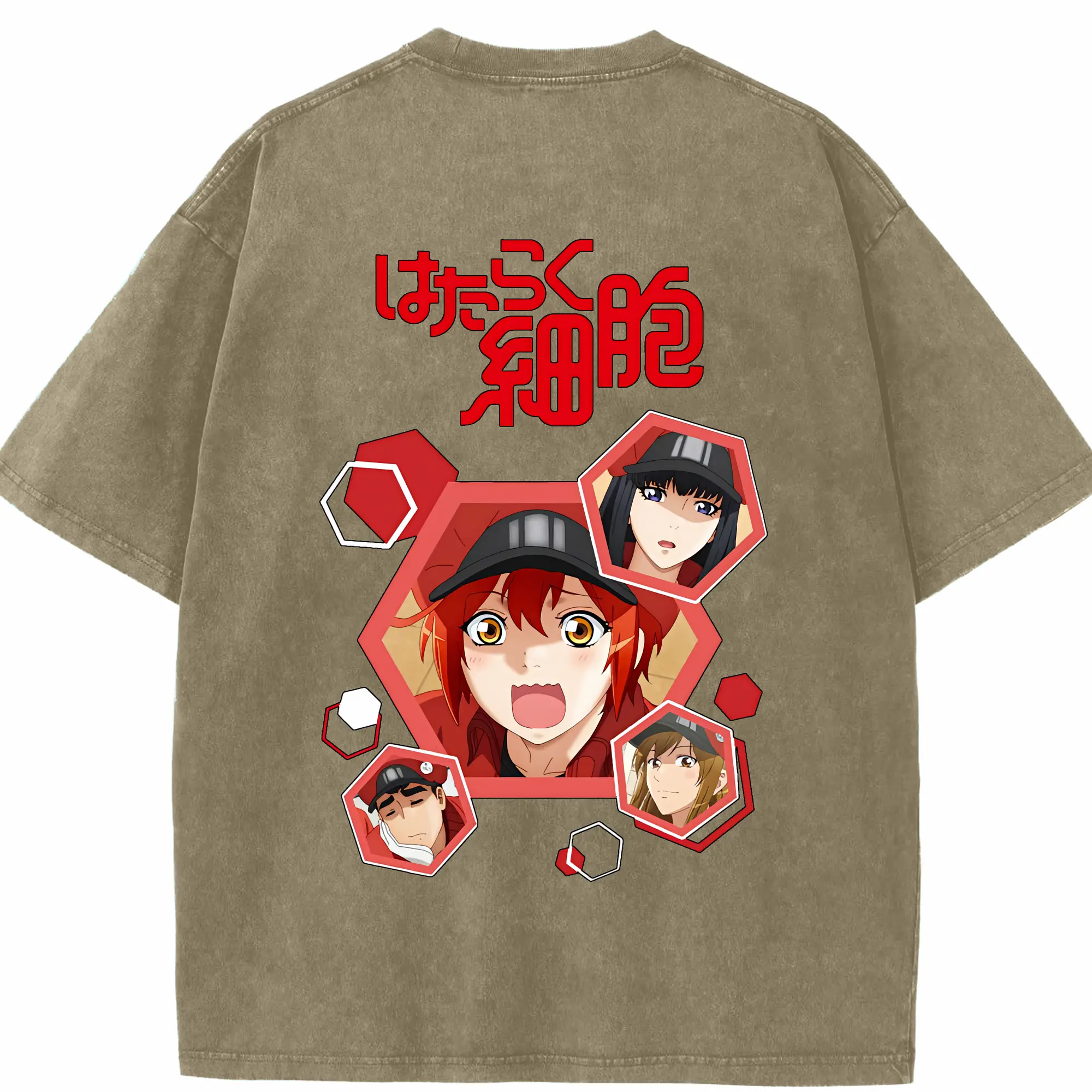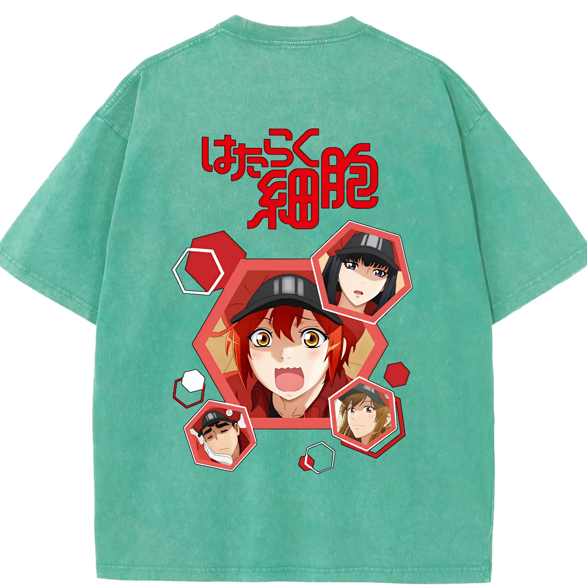 はたらく細胞 グッズ,赤血球 - 綿100% ヴィンテージ風 半袖Tシャツ ・ フロントプリント ・ 柔らか肌触り ・ 通気性 快適 ・ スポーツ カジュアル 外出用