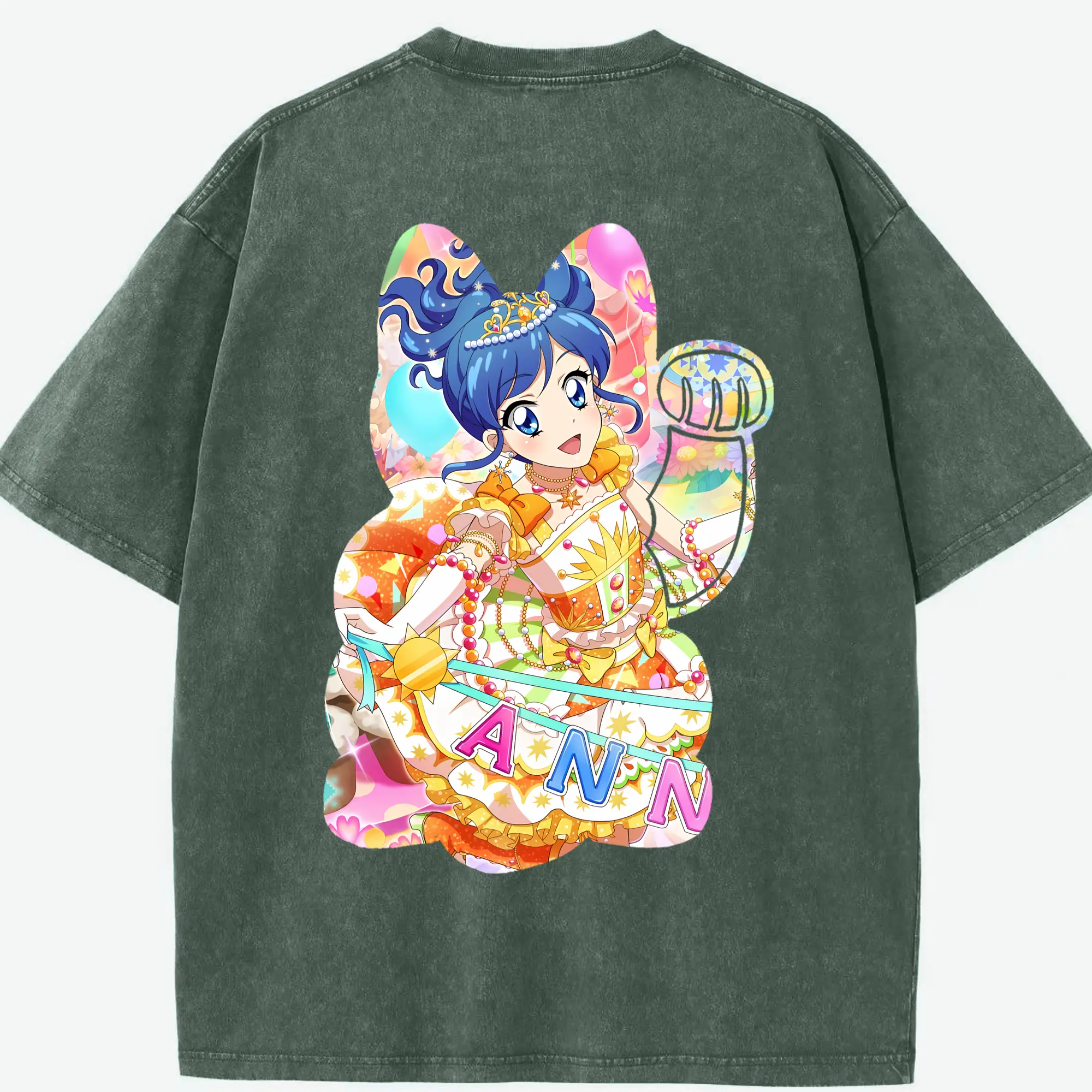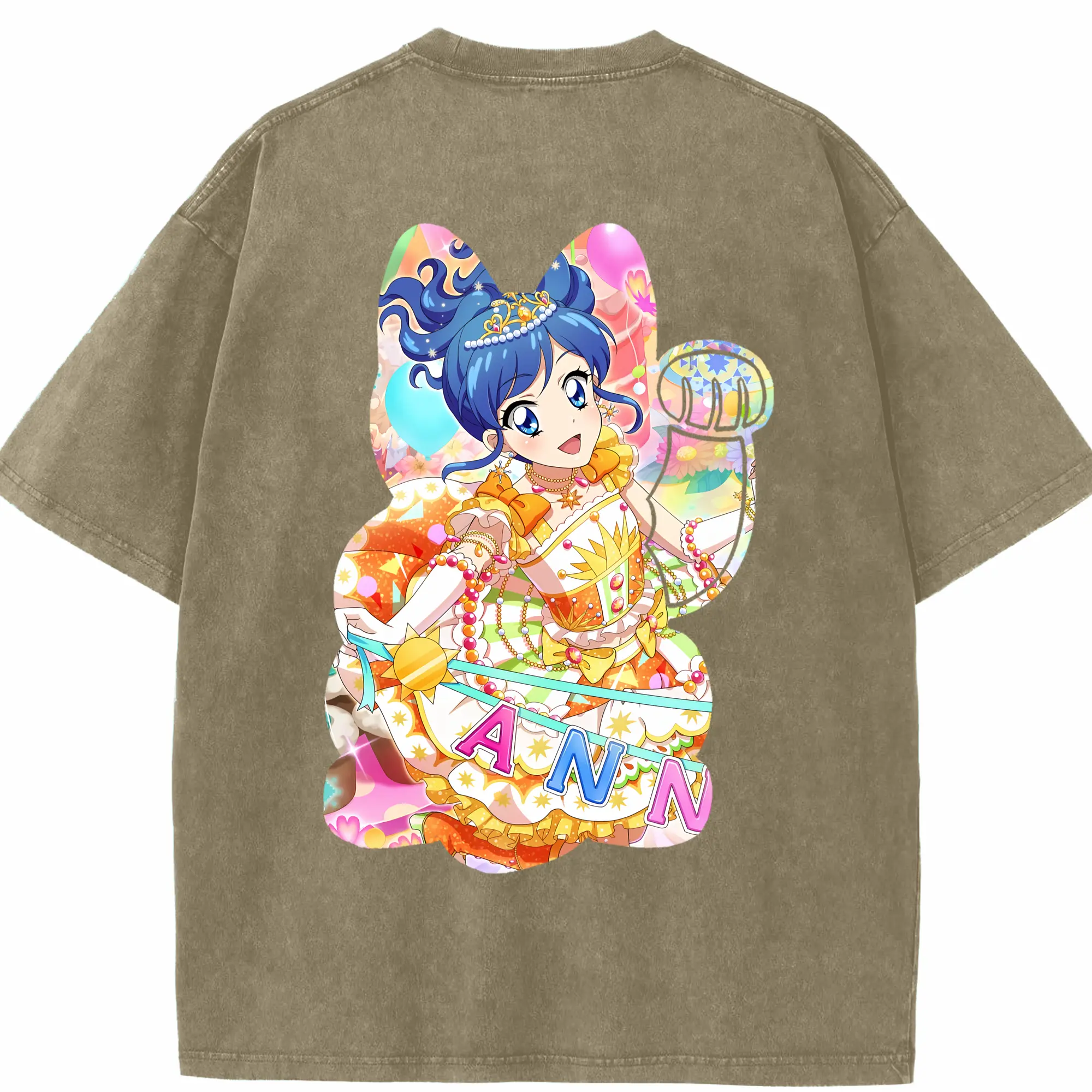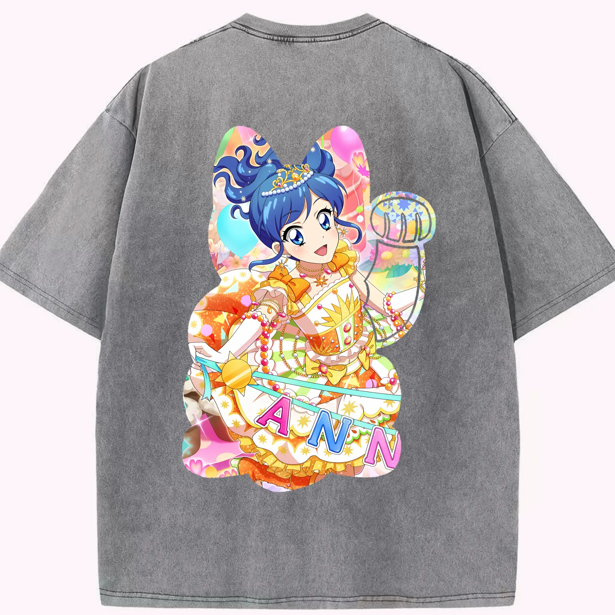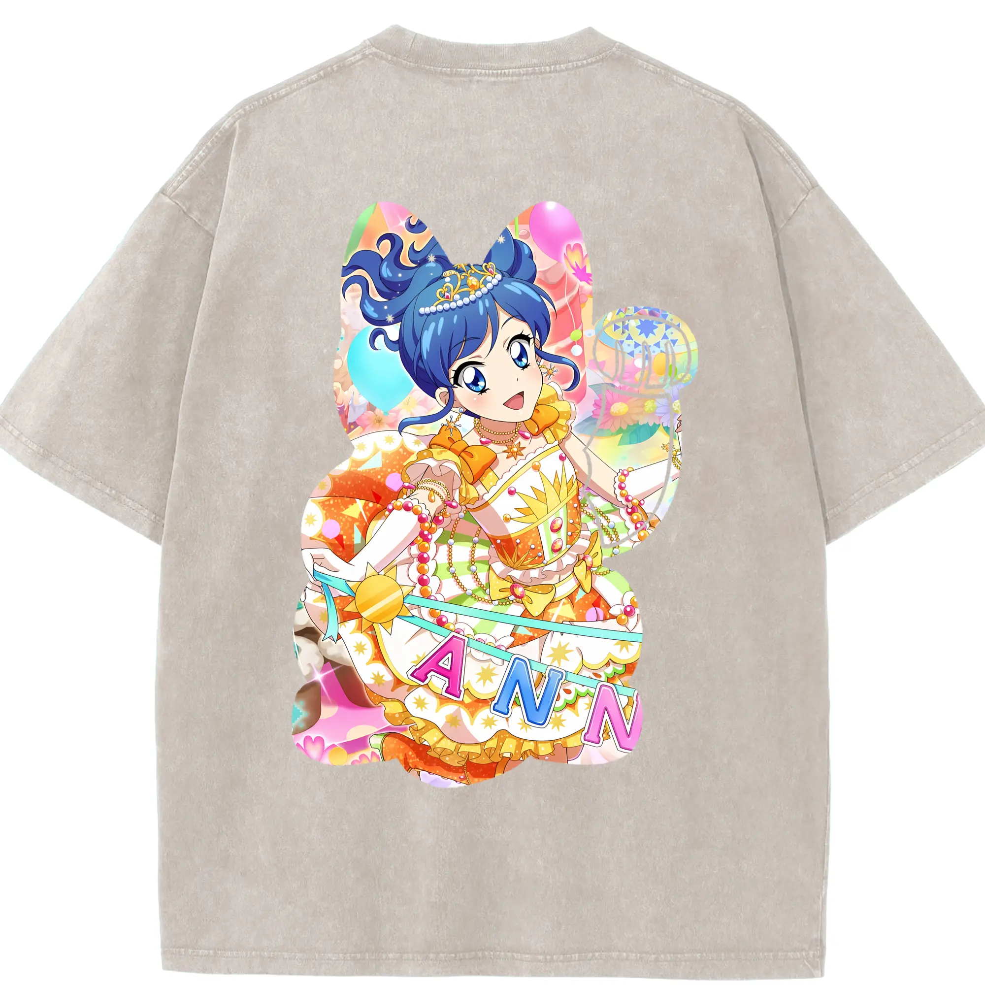 アイカツ グッズ 霧矢 あおい - 綿100% ヴィンテージ風 半袖Tシャツ ・ フロントプリント ・ 柔らか肌触り ・ 通気性 快適 ・ スポーツ カジュアル 外出用