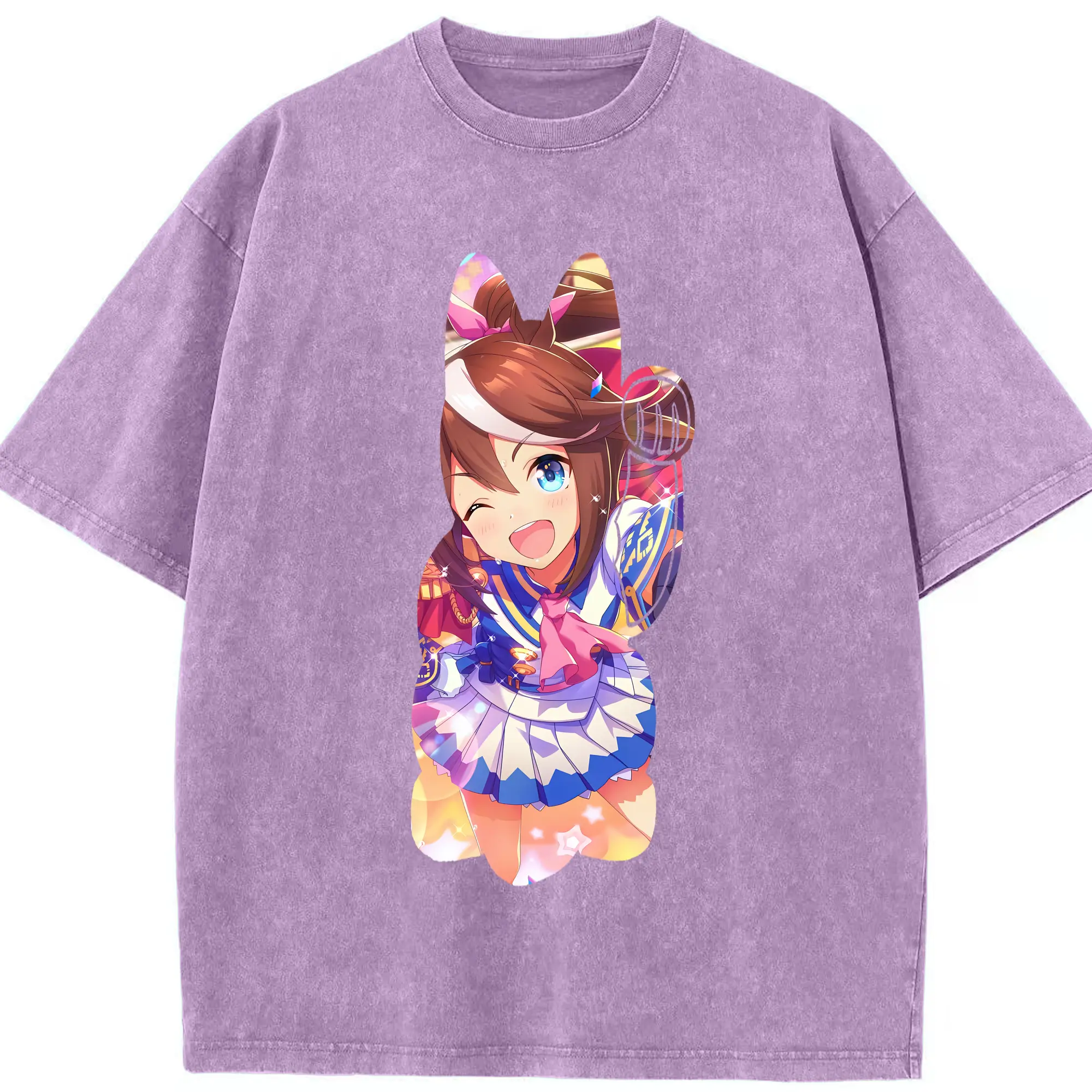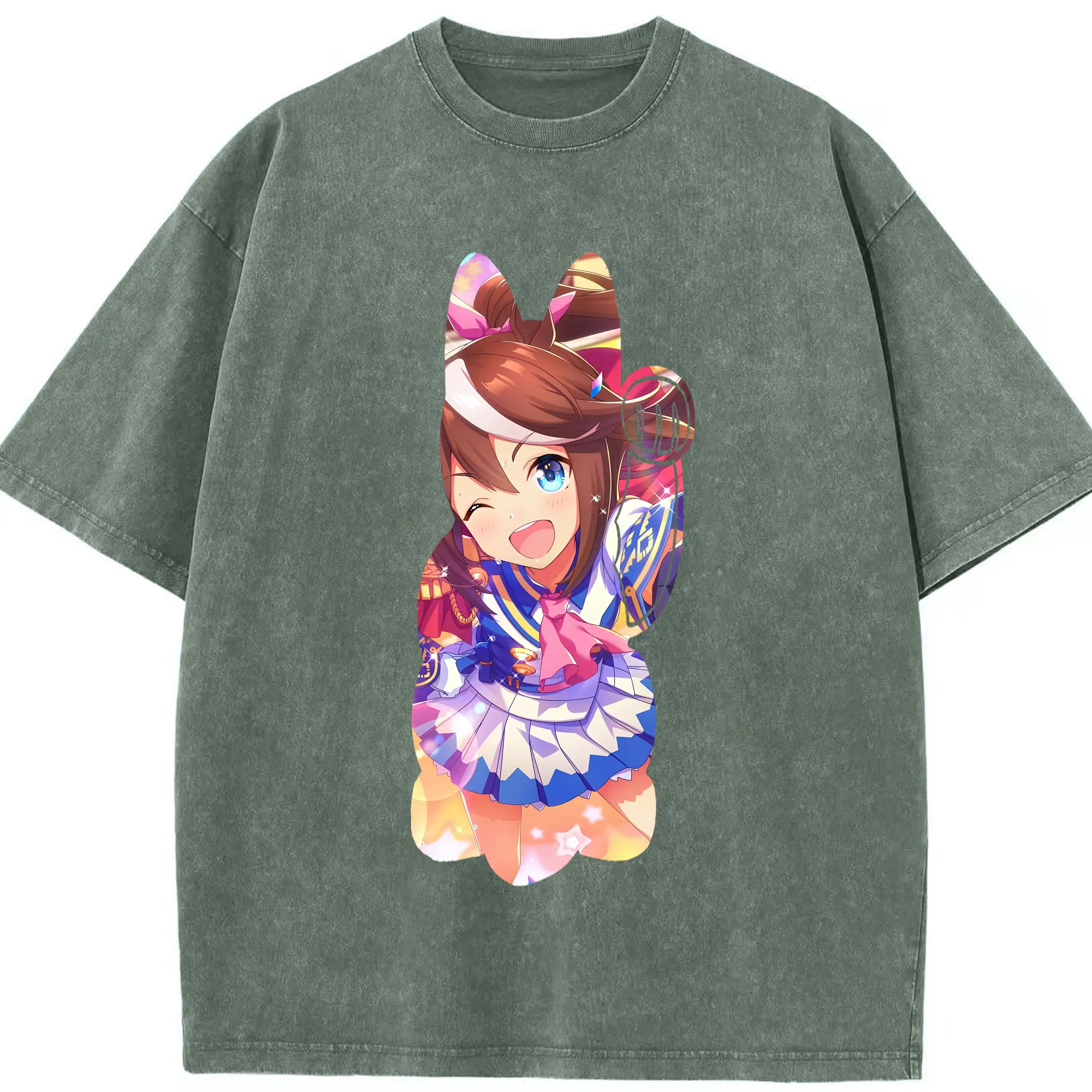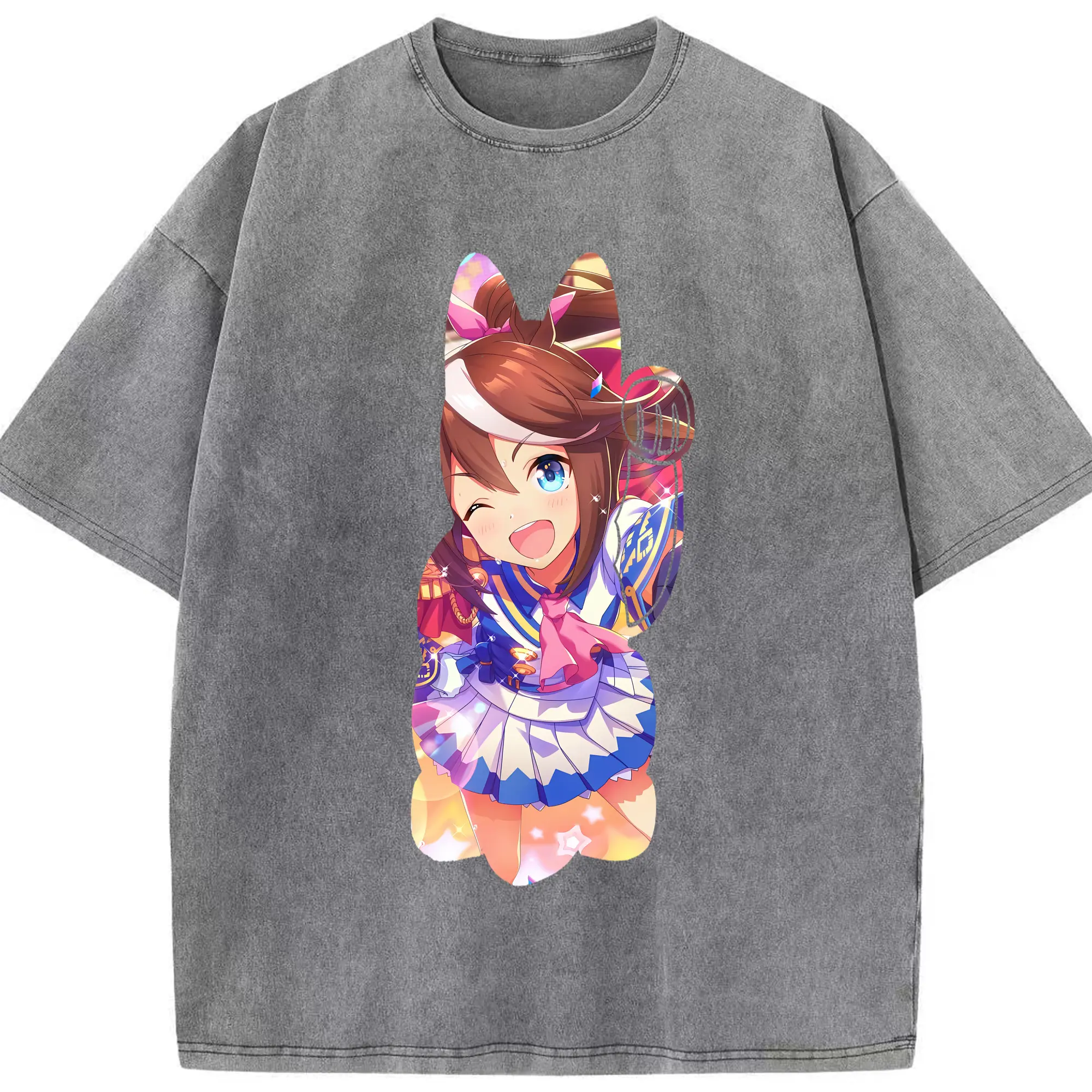 ウマ娘 プリティーダービー グッズ トウカイテイオー - 綿100% ヴィンテージ風 半袖Tシャツ ・ 背面プリント ・ 柔らか肌触り ・ 通気性 快適 ・ スポーツ カジュアル 外出用