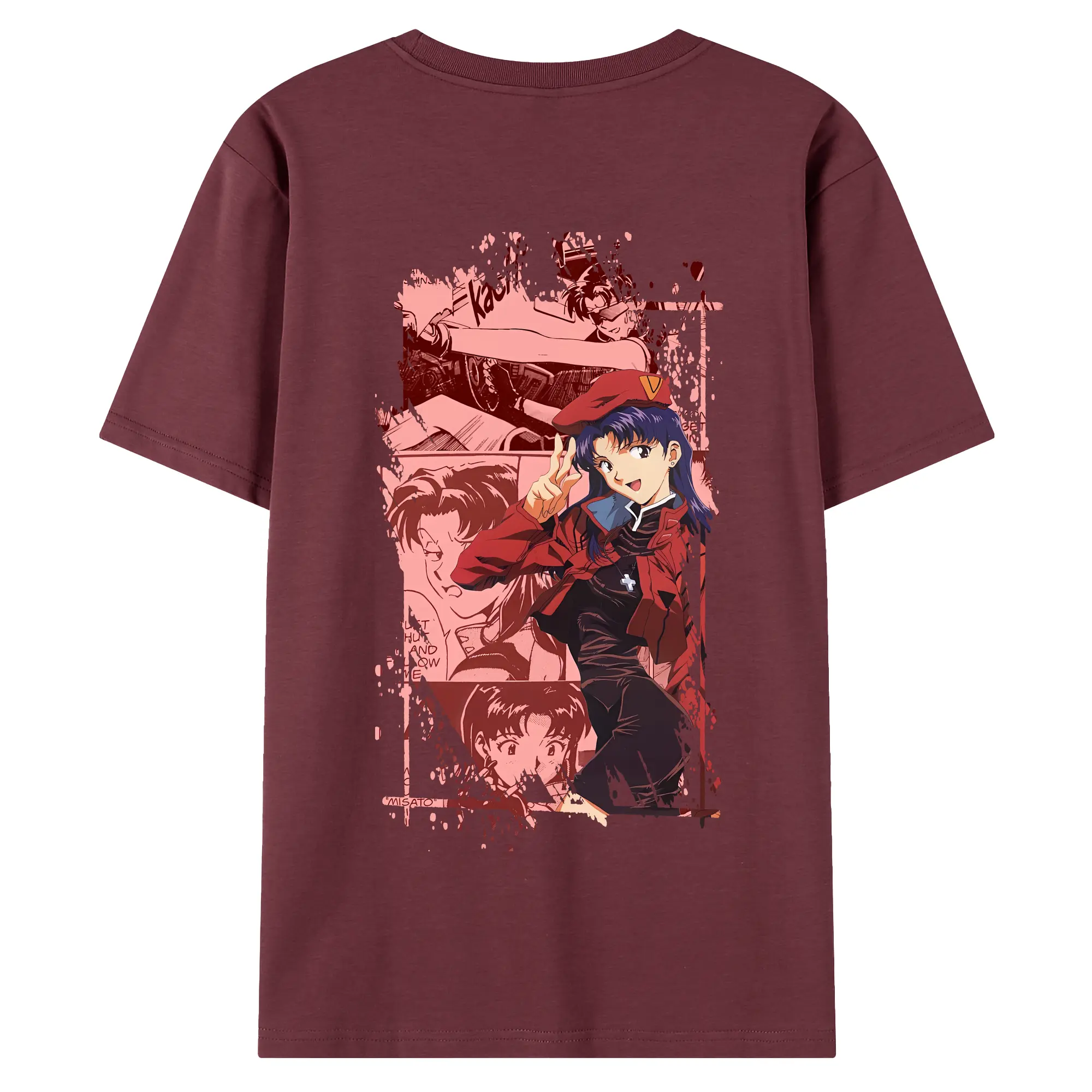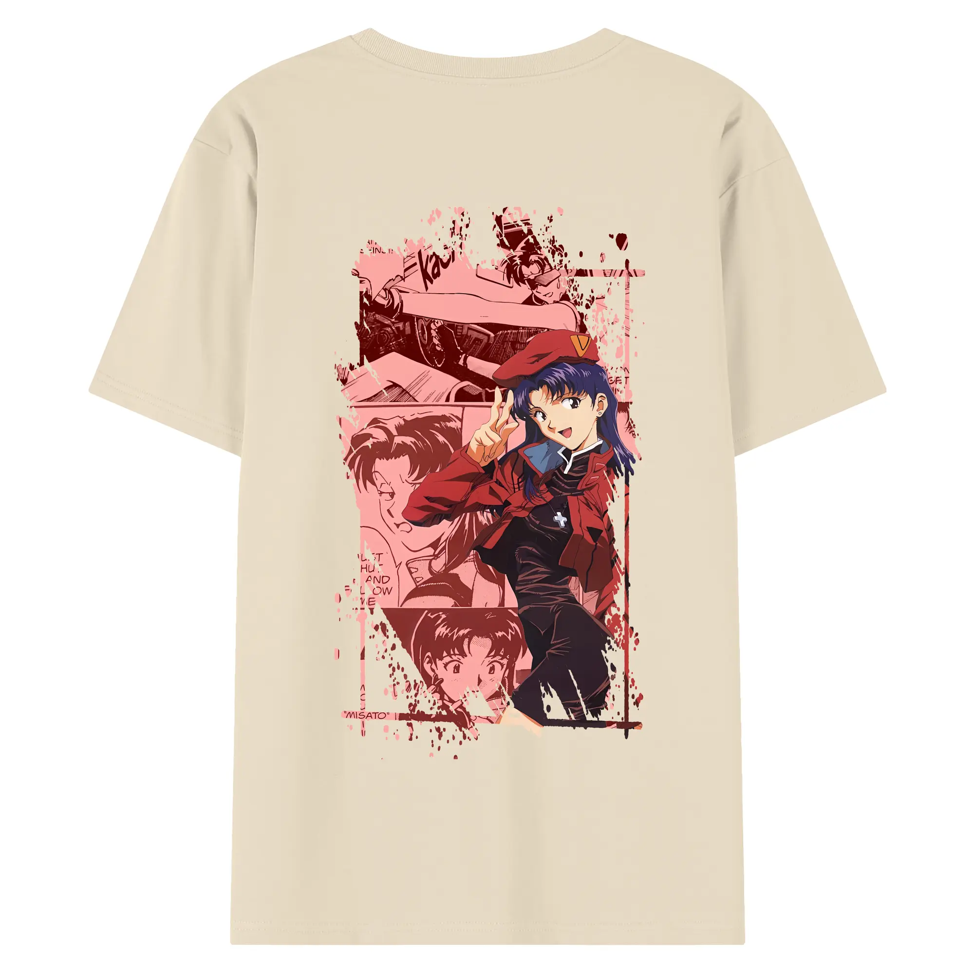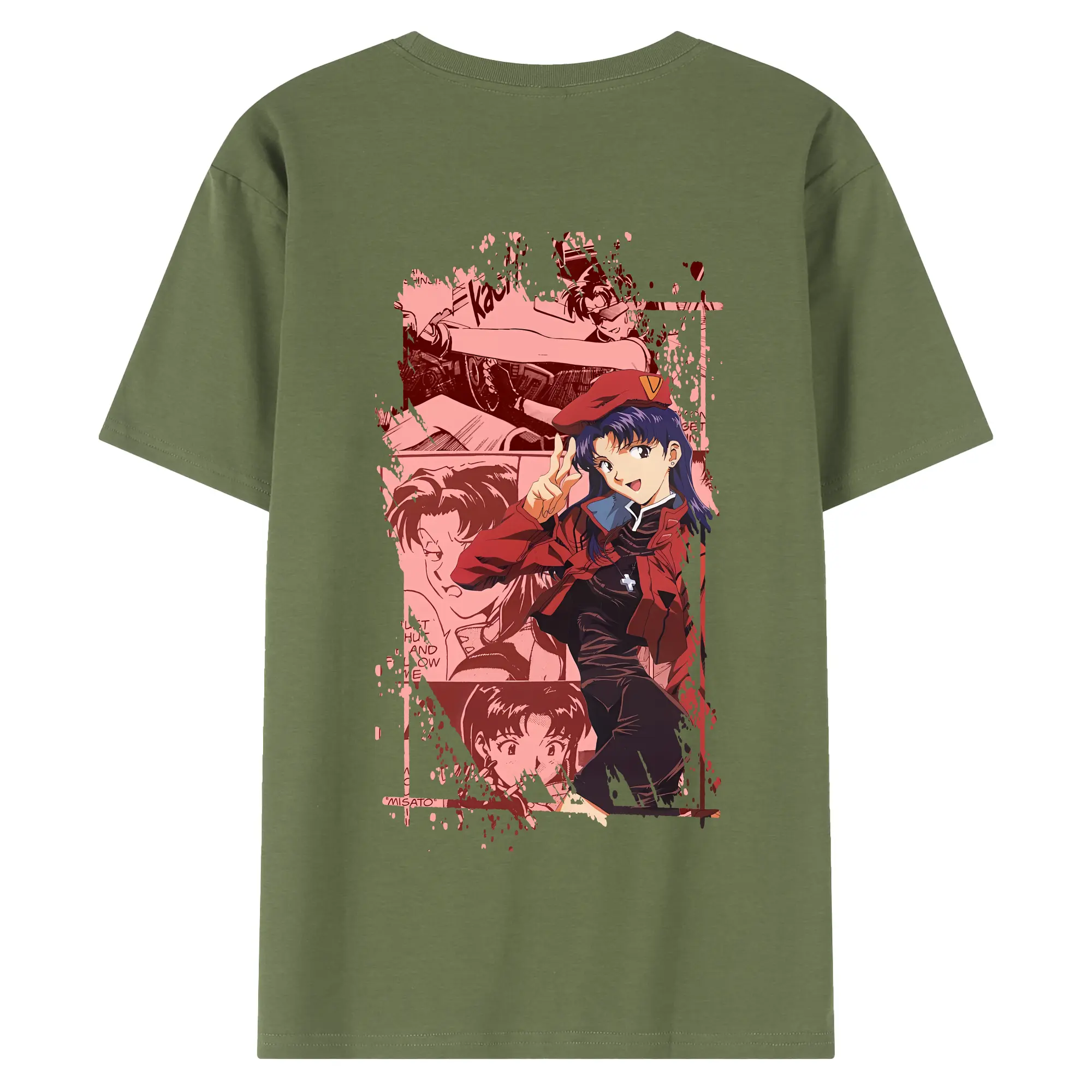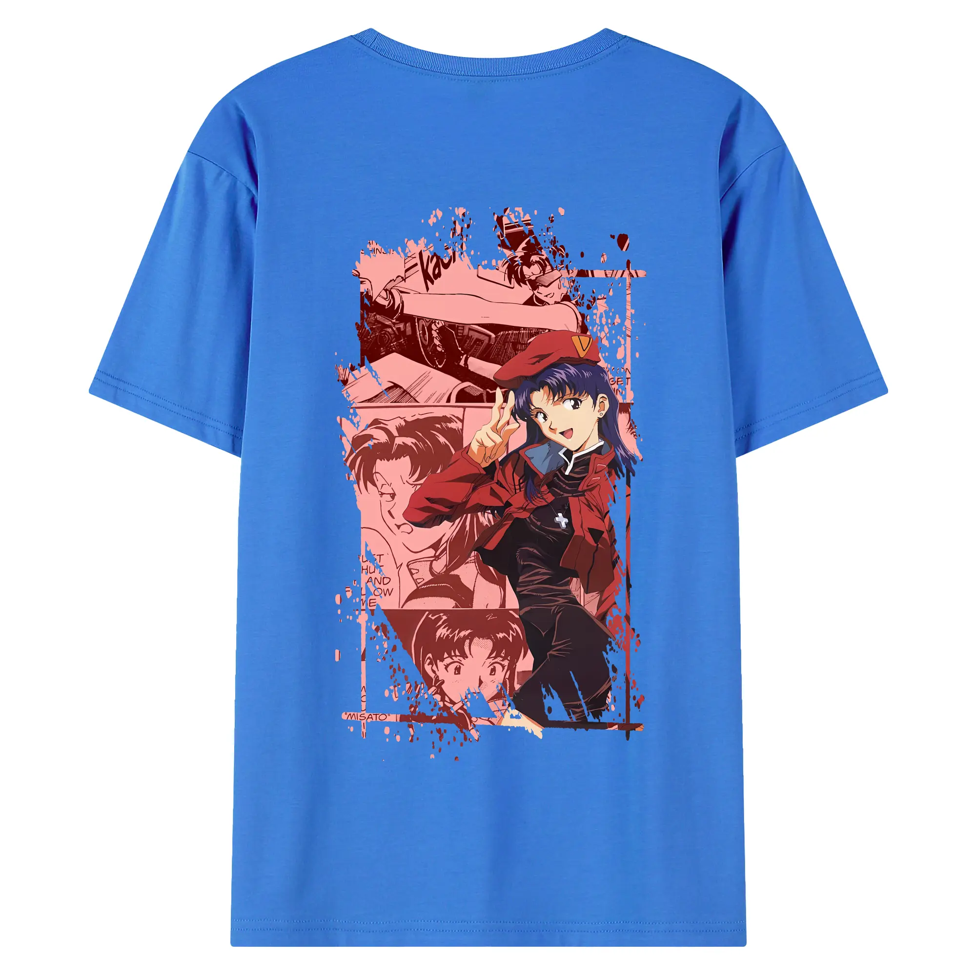 エヴァンゲリオン グッズ,葛城ミサト - 綿100% ヴィンテージ風 半袖Tシャツ ・ 背面プリント ・ 柔らか肌触り ・ 通気性 快適 ・ スポーツ カジュアル 外出用
