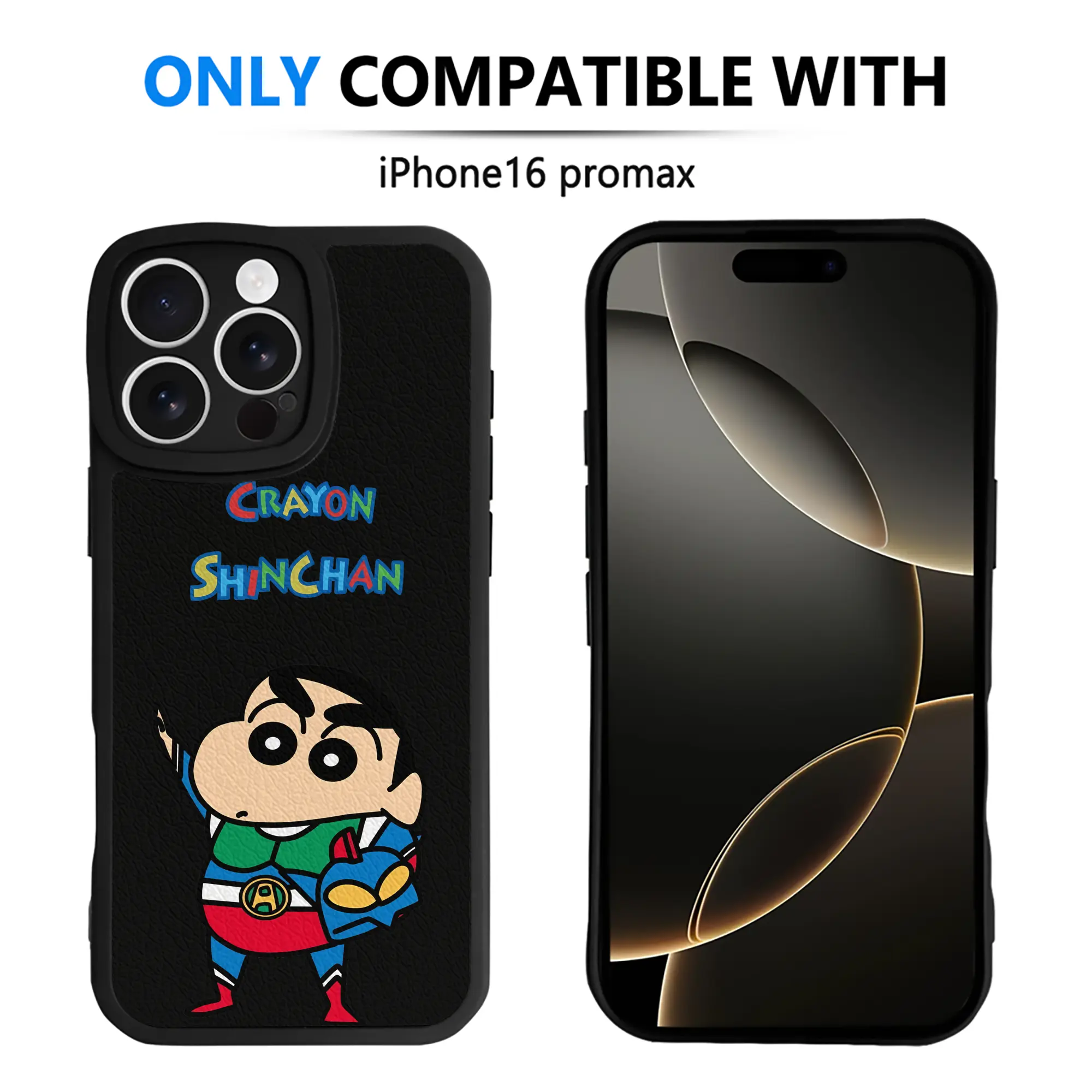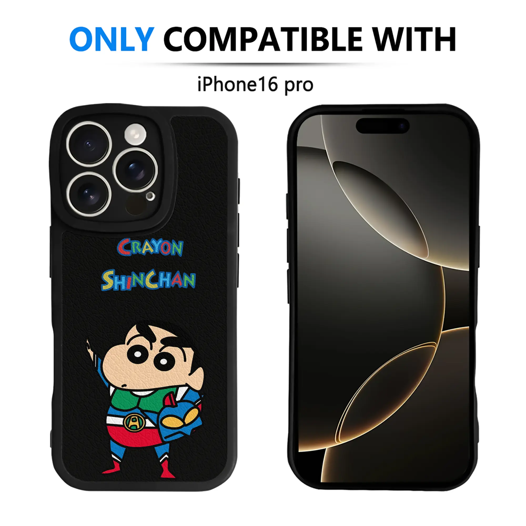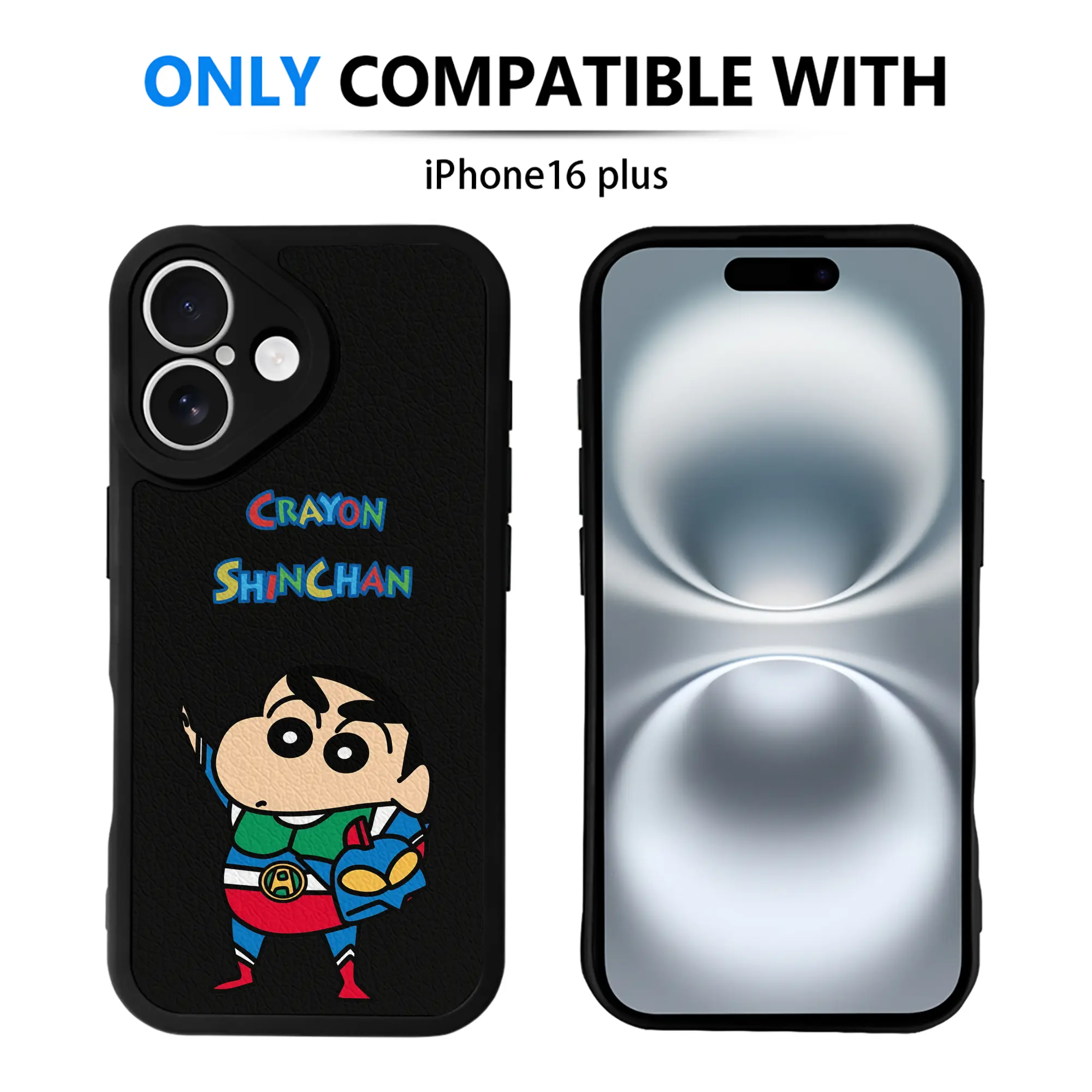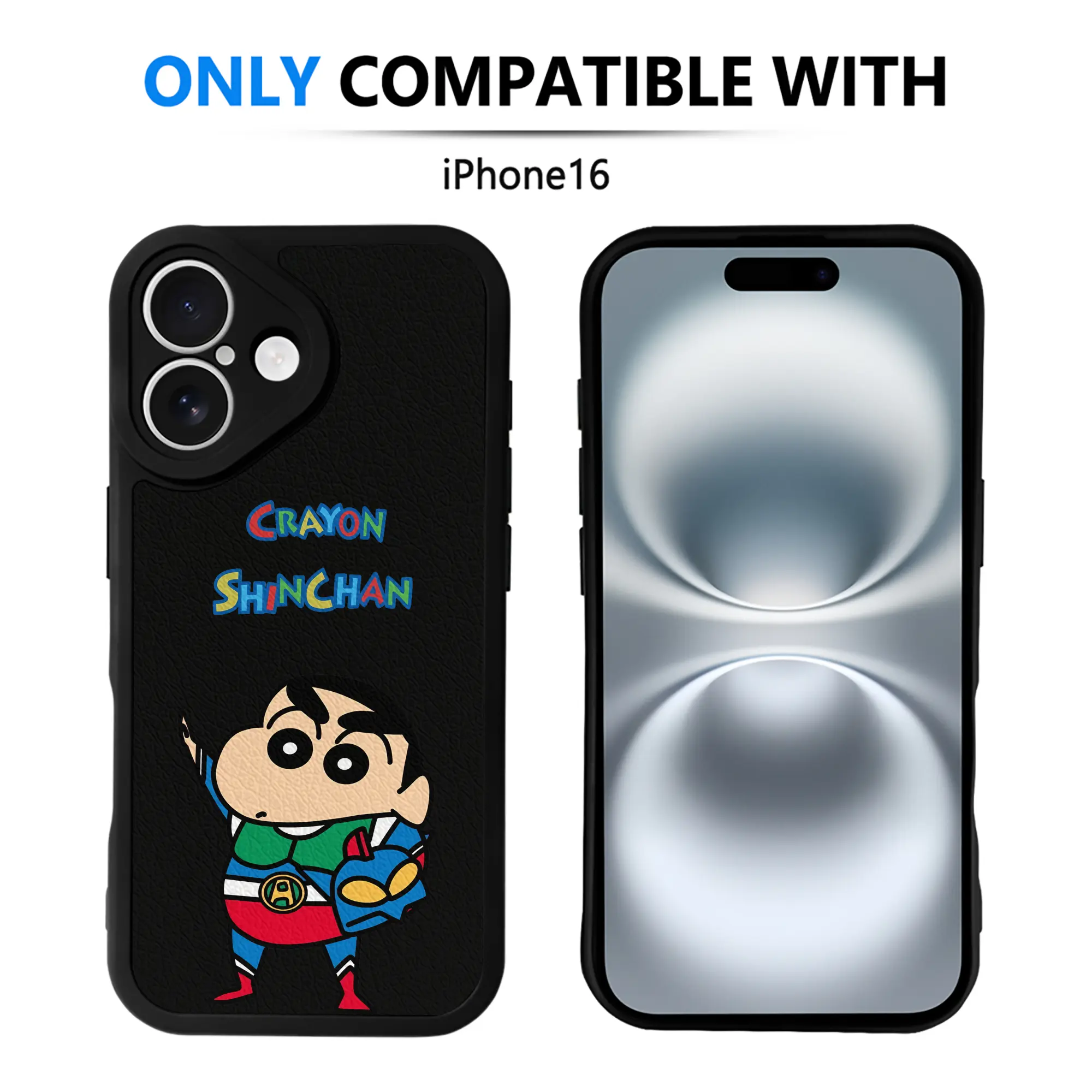 クレヨンしんちゃん グッズ アクション仮面 - IPhone 16シリーズ対応 ・ シリコンスマホケース ・ レザー調 ・ 高精度フィット ・ 耐衝撃 ・ ワイヤレス充電対応 ・ 精密カット
