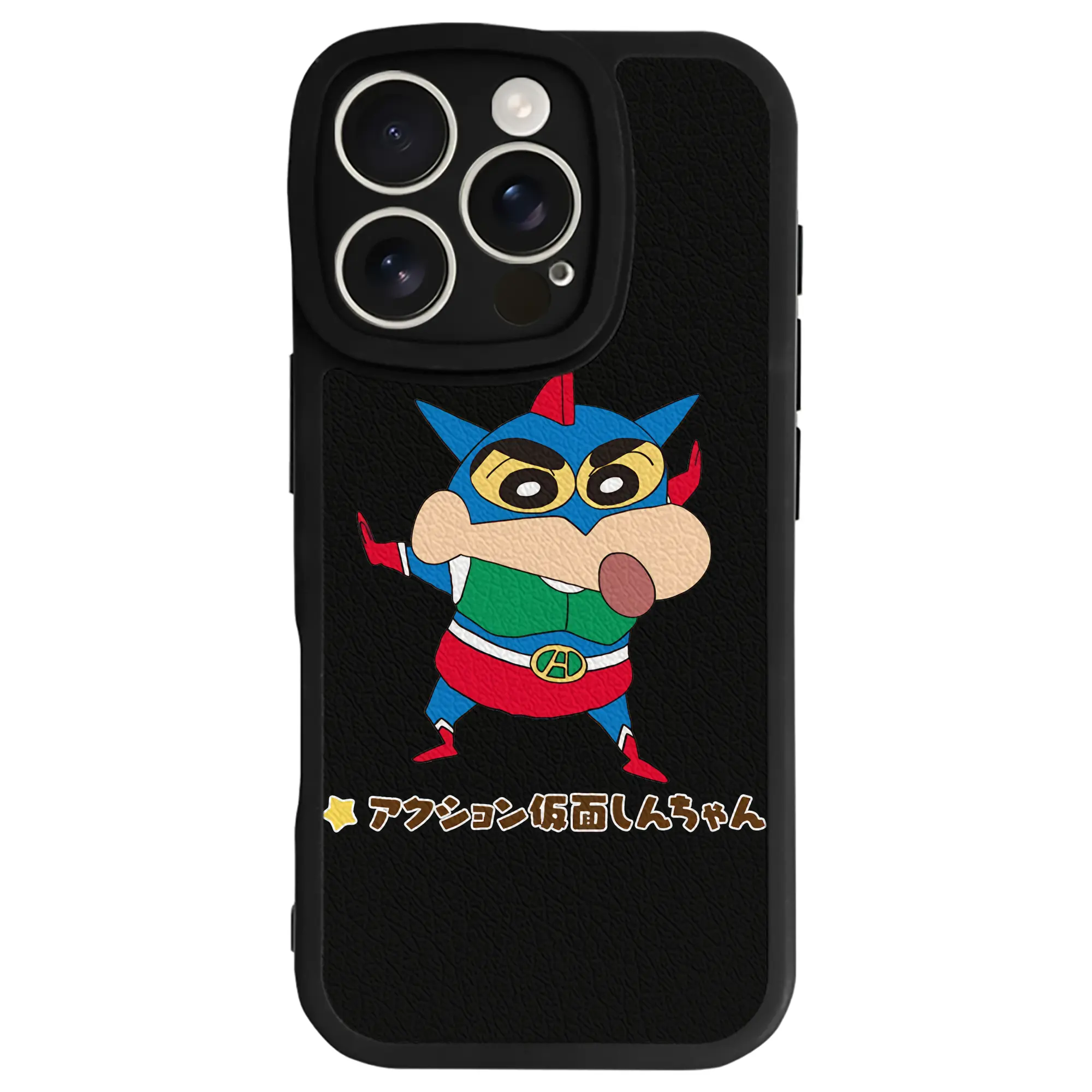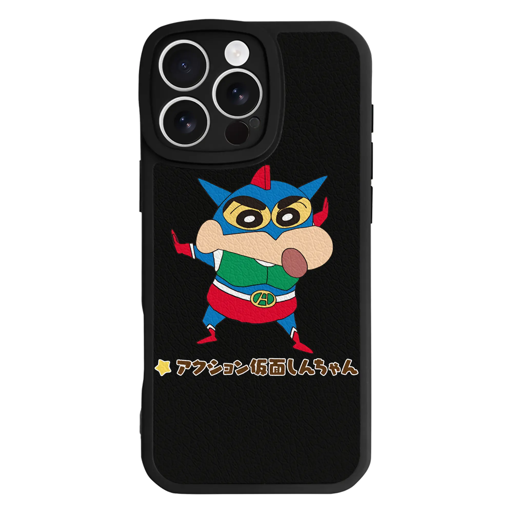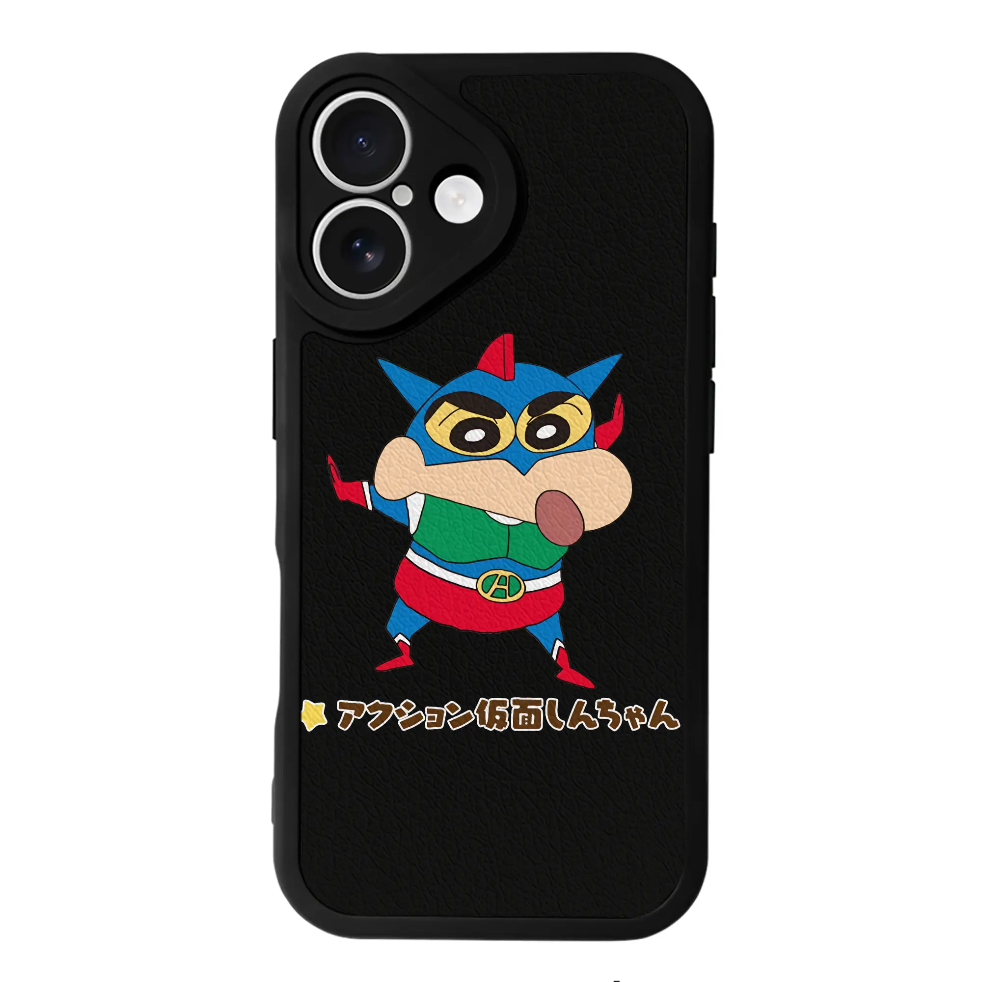 クレヨンしんちゃん グッズ アクション仮面 - IPhone 16シリーズ対応 ・ シリコンスマホケース ・ レザー調 ・ 高精度フィット ・ 耐衝撃 ・ ワイヤレス充電対応 ・ 精密カット