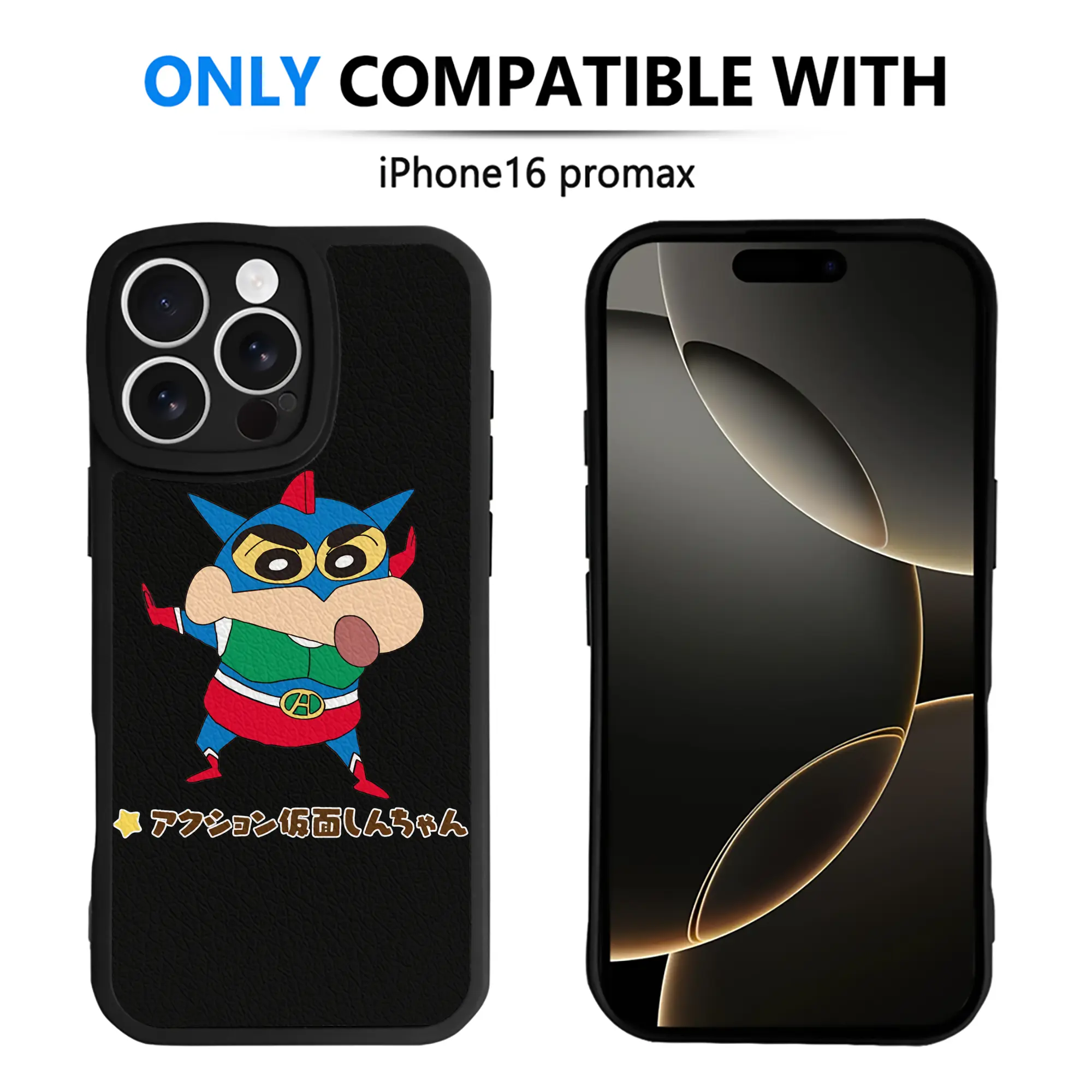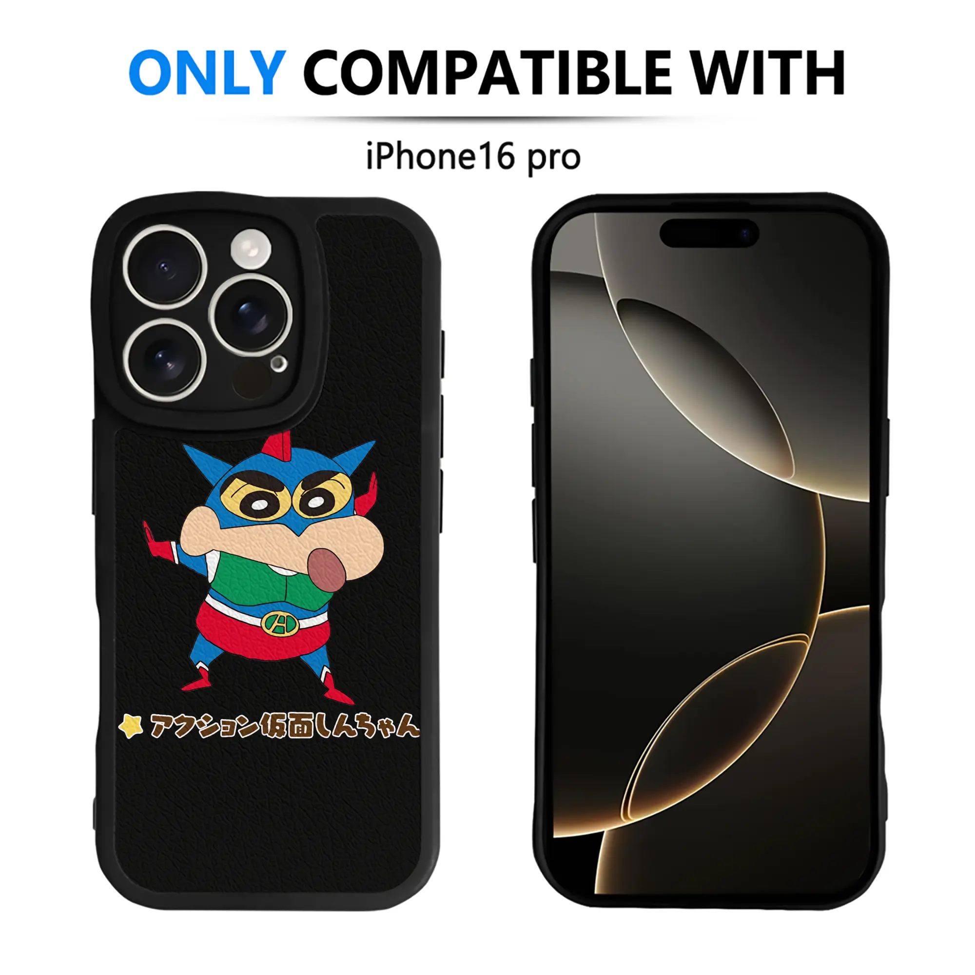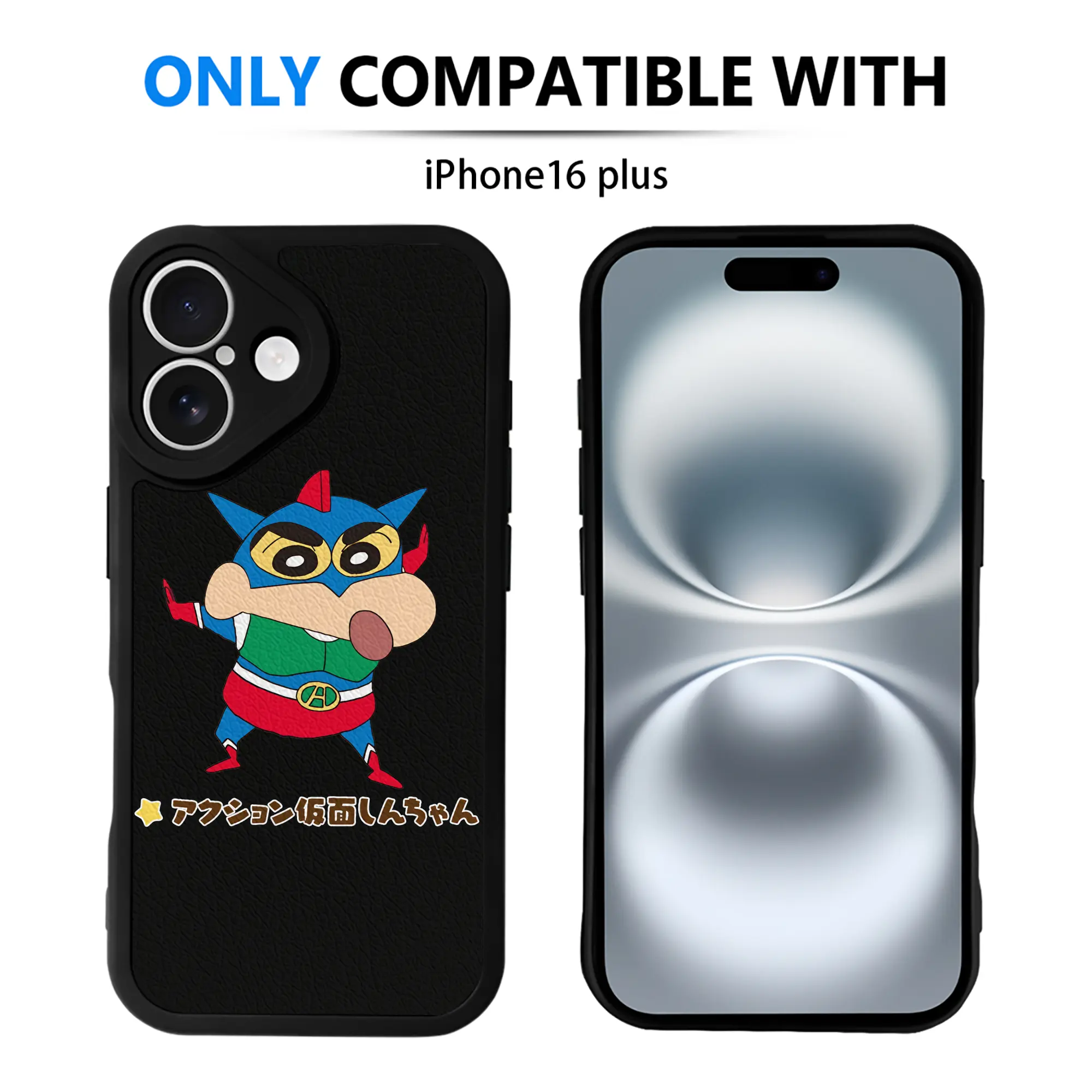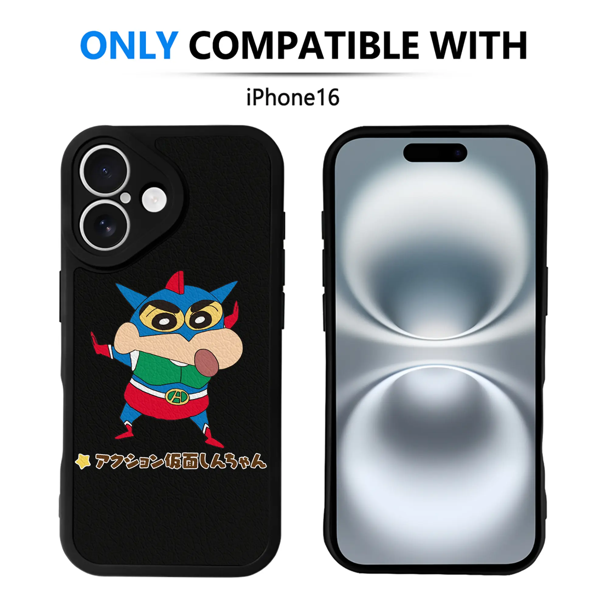 クレヨンしんちゃん グッズ アクション仮面 - IPhone 16シリーズ対応 ・ シリコンスマホケース ・ レザー調 ・ 高精度フィット ・ 耐衝撃 ・ ワイヤレス充電対応 ・ 精密カット