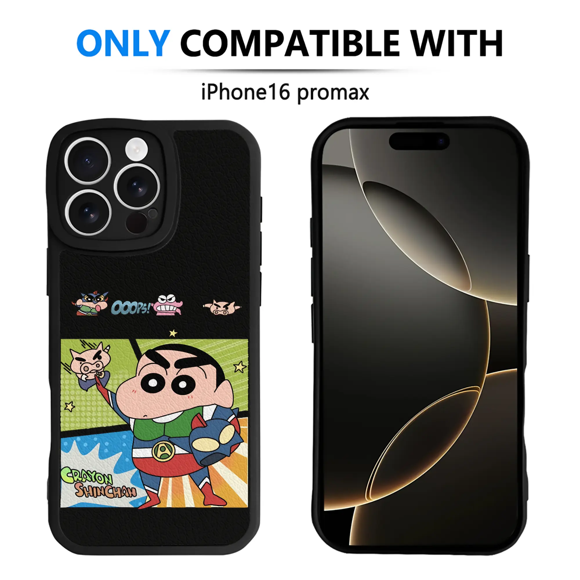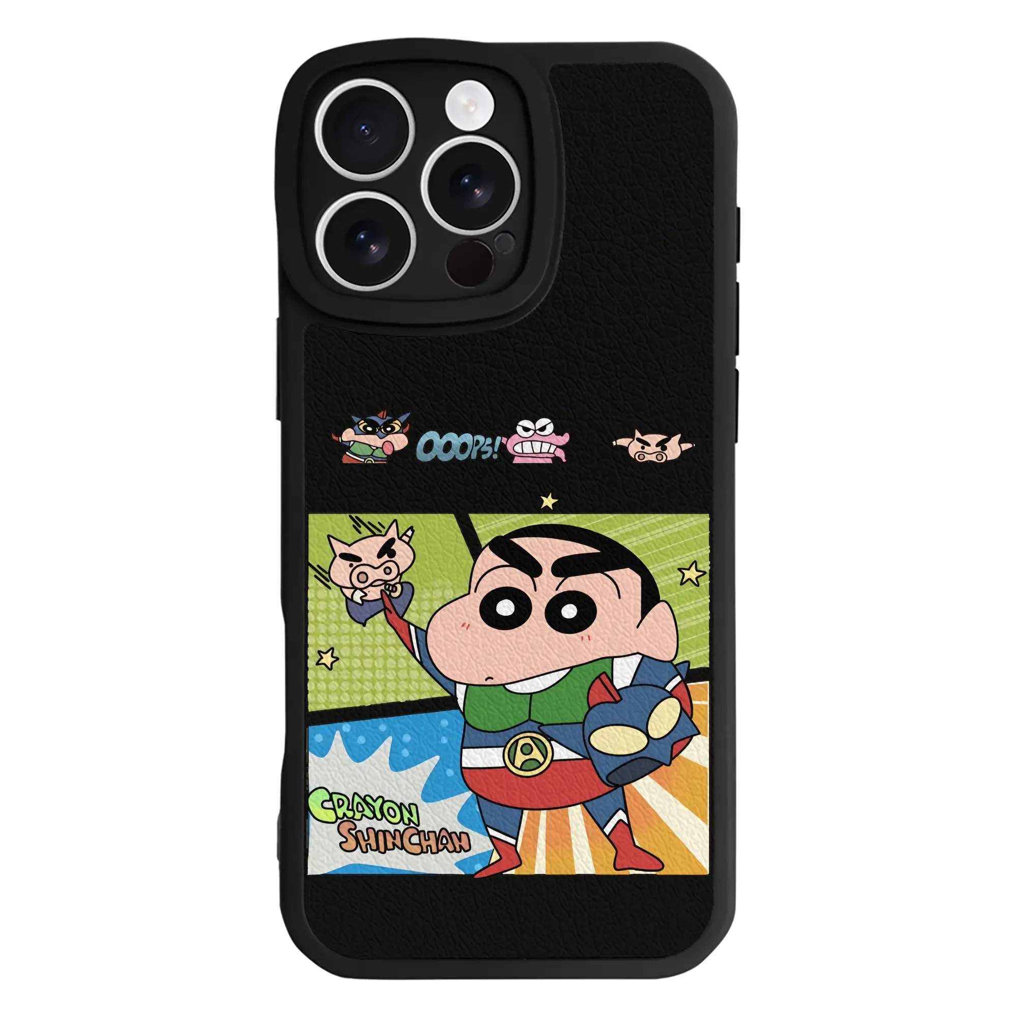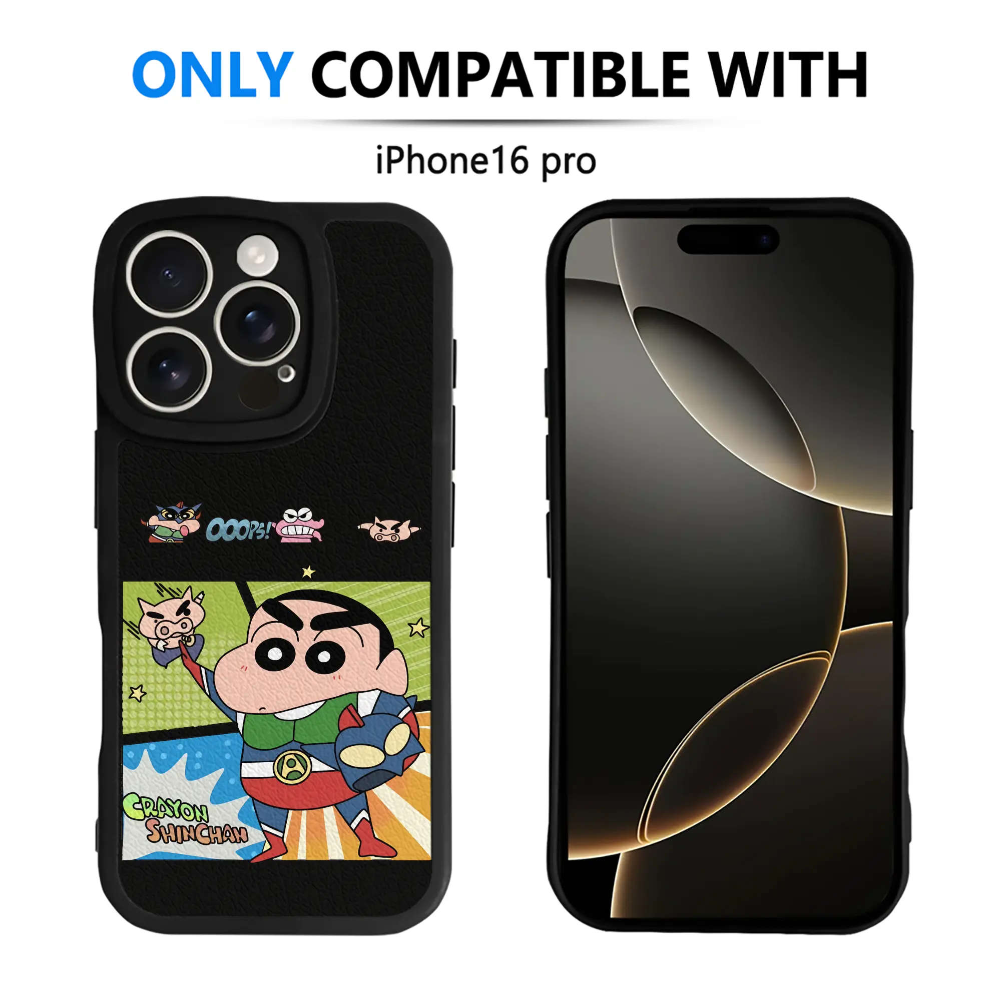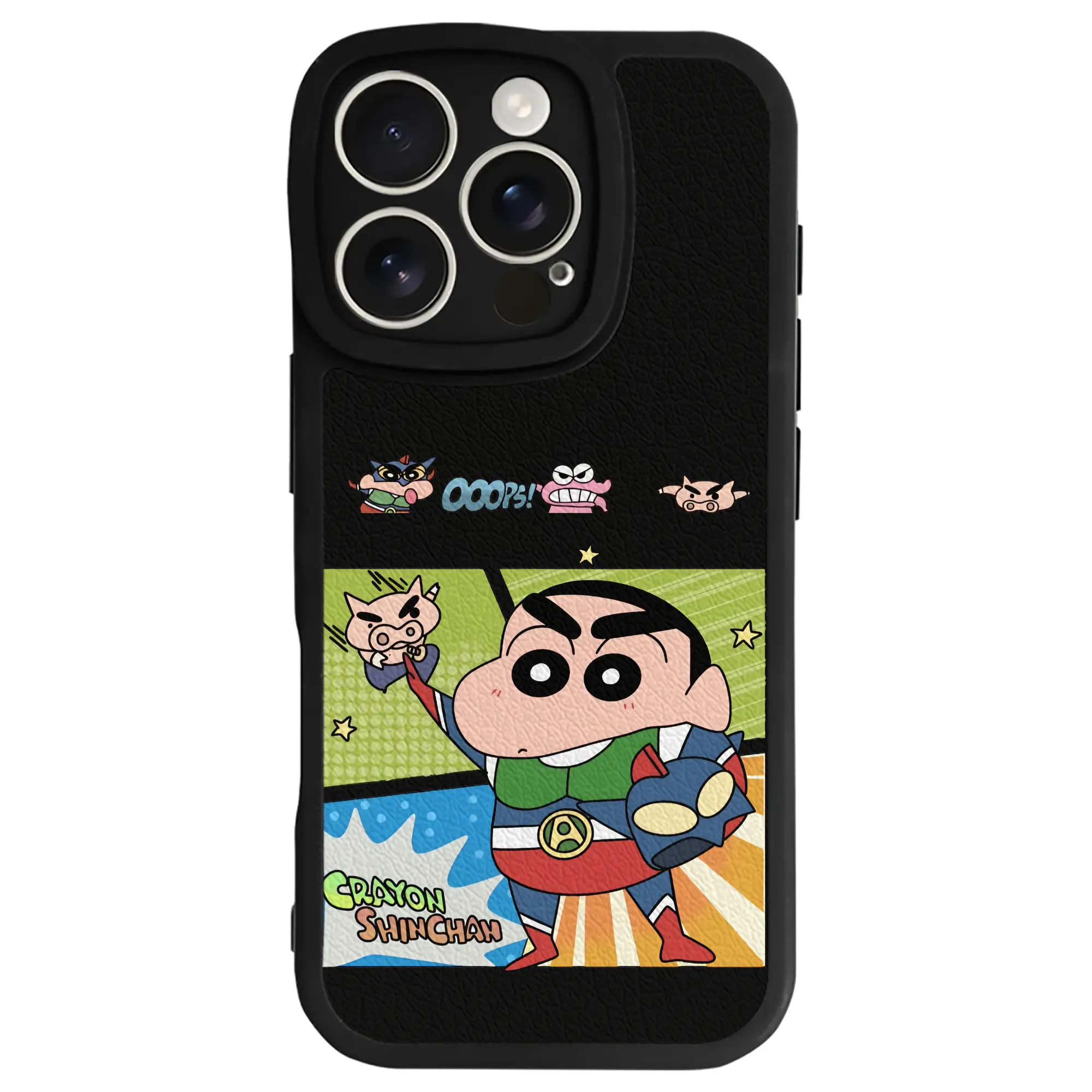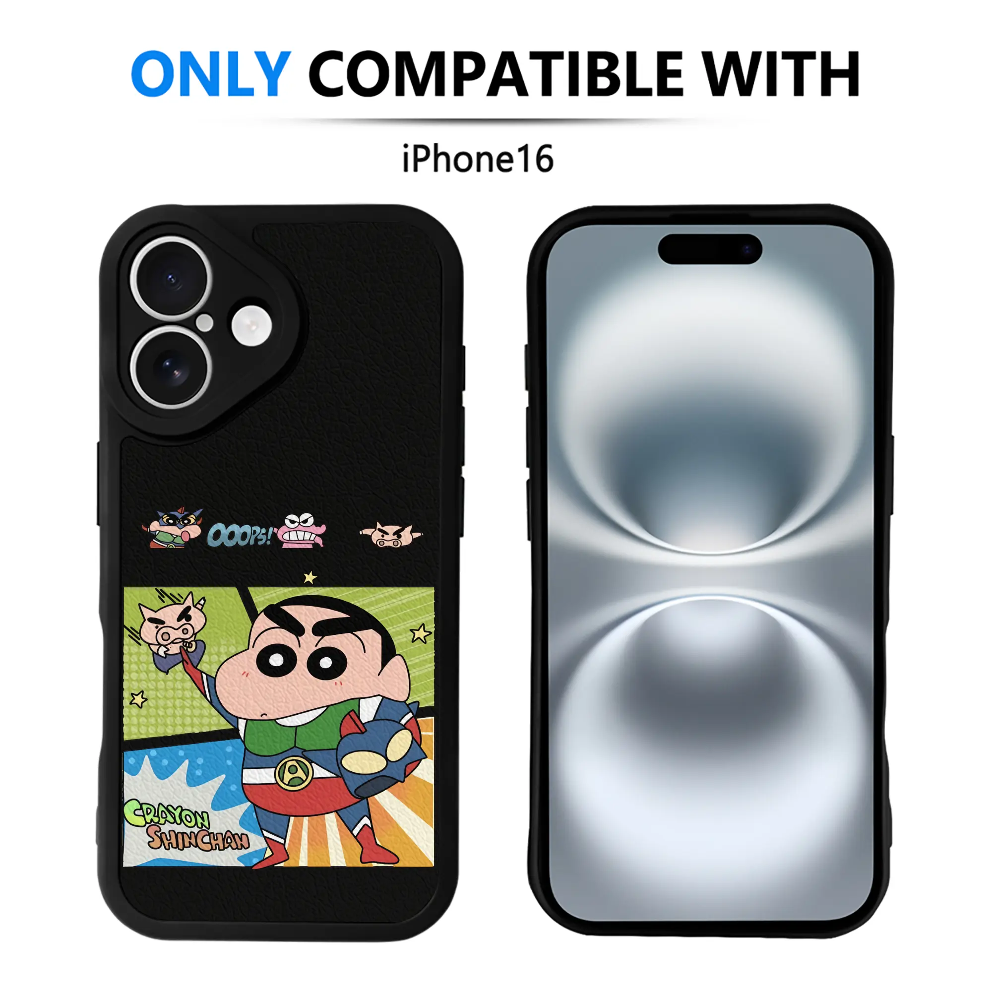 クレヨンしんちゃん グッズ アクション仮面 - IPhone 16シリーズ対応 ・ シリコンスマホケース ・ レザー調 ・ 高精度フィット ・ 耐衝撃 ・ ワイヤレス充電対応 ・ 精密カット
