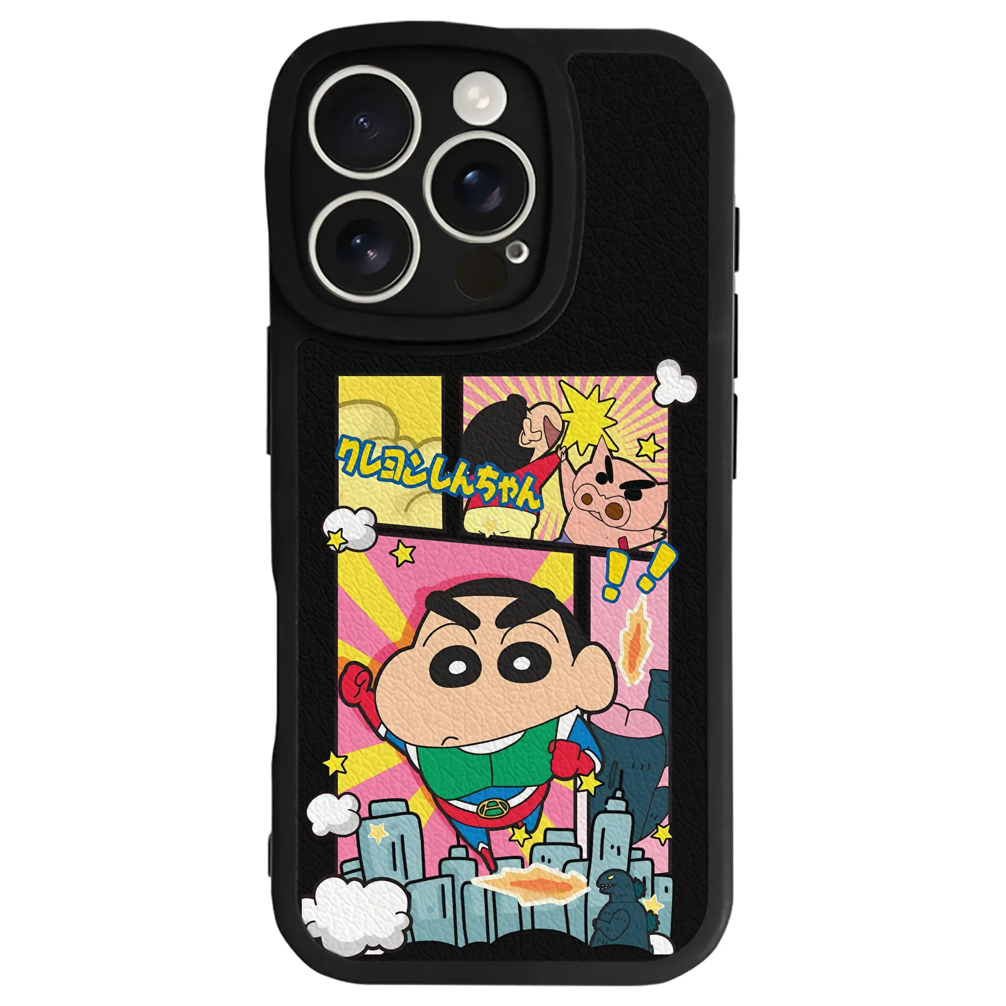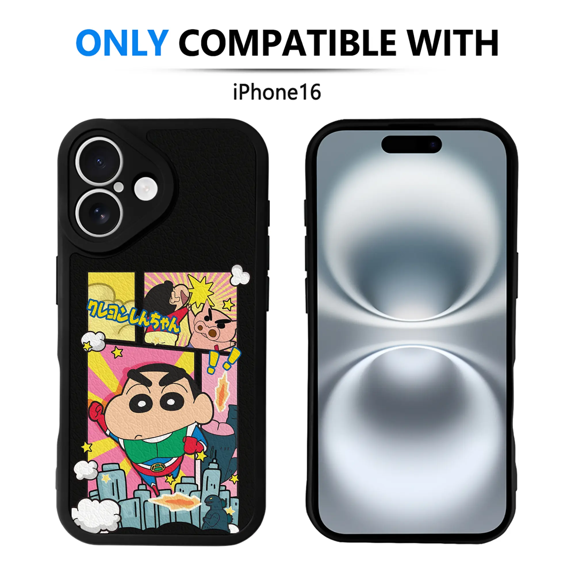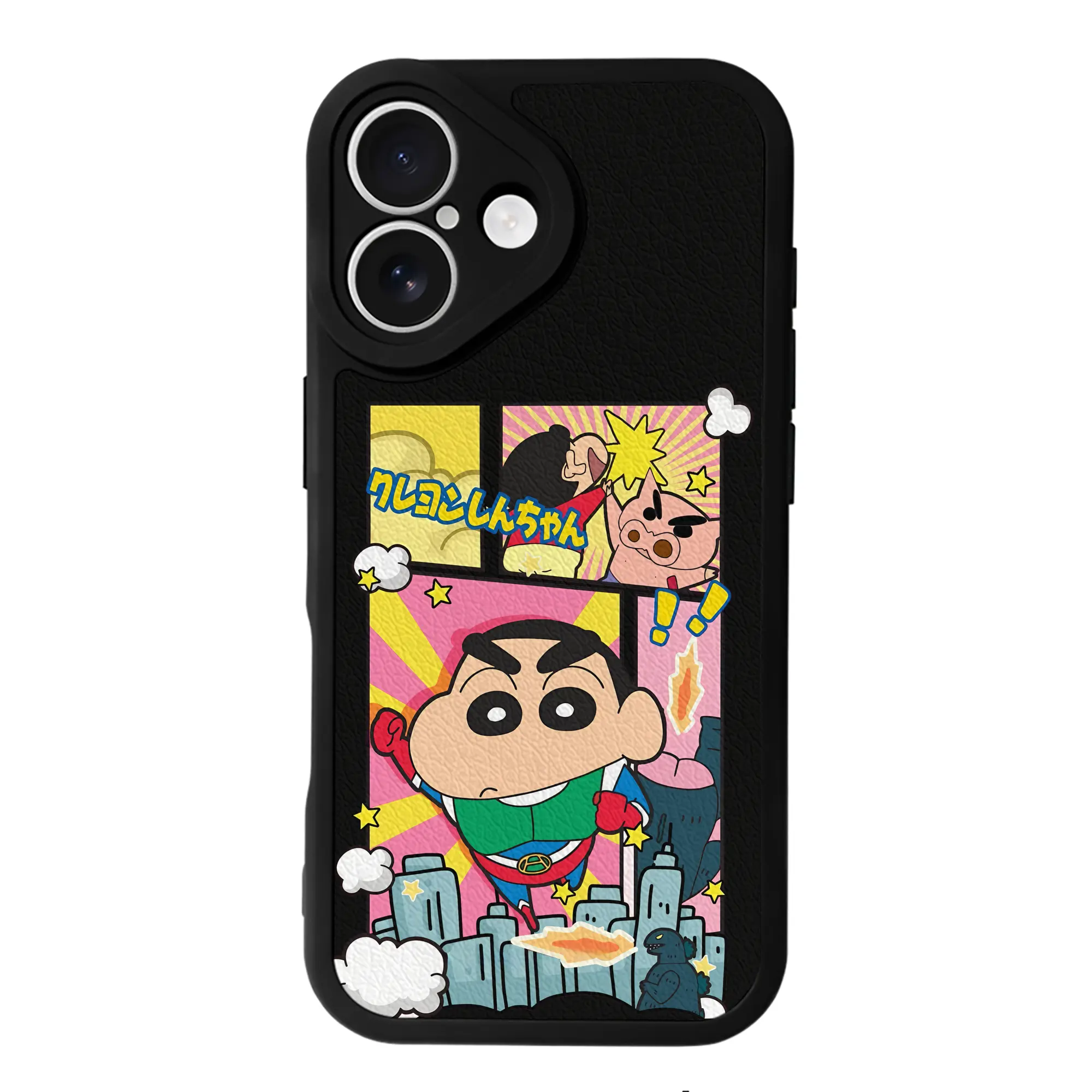 クレヨンしんちゃん グッズ アクション仮面 - IPhone 16シリーズ対応 ・ シリコンスマホケース ・ レザー調 ・ 高精度フィット ・ 耐衝撃 ・ ワイヤレス充電対応 ・ 精密カット