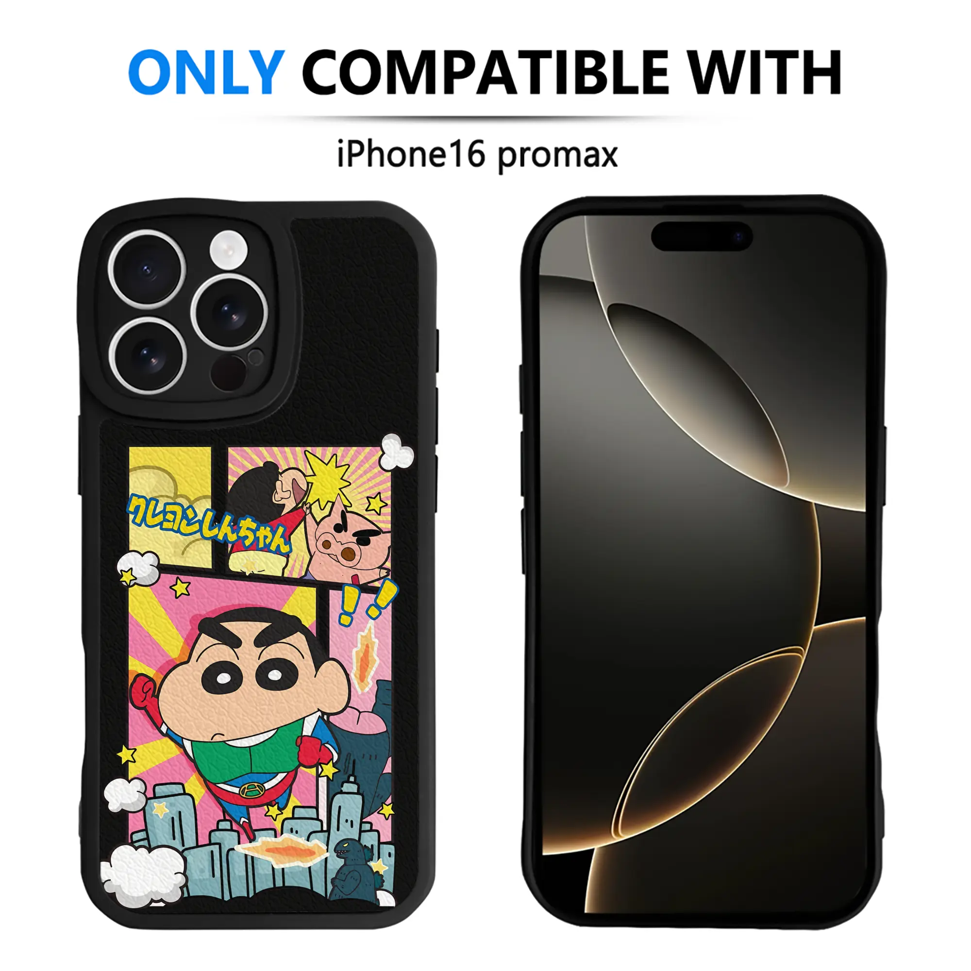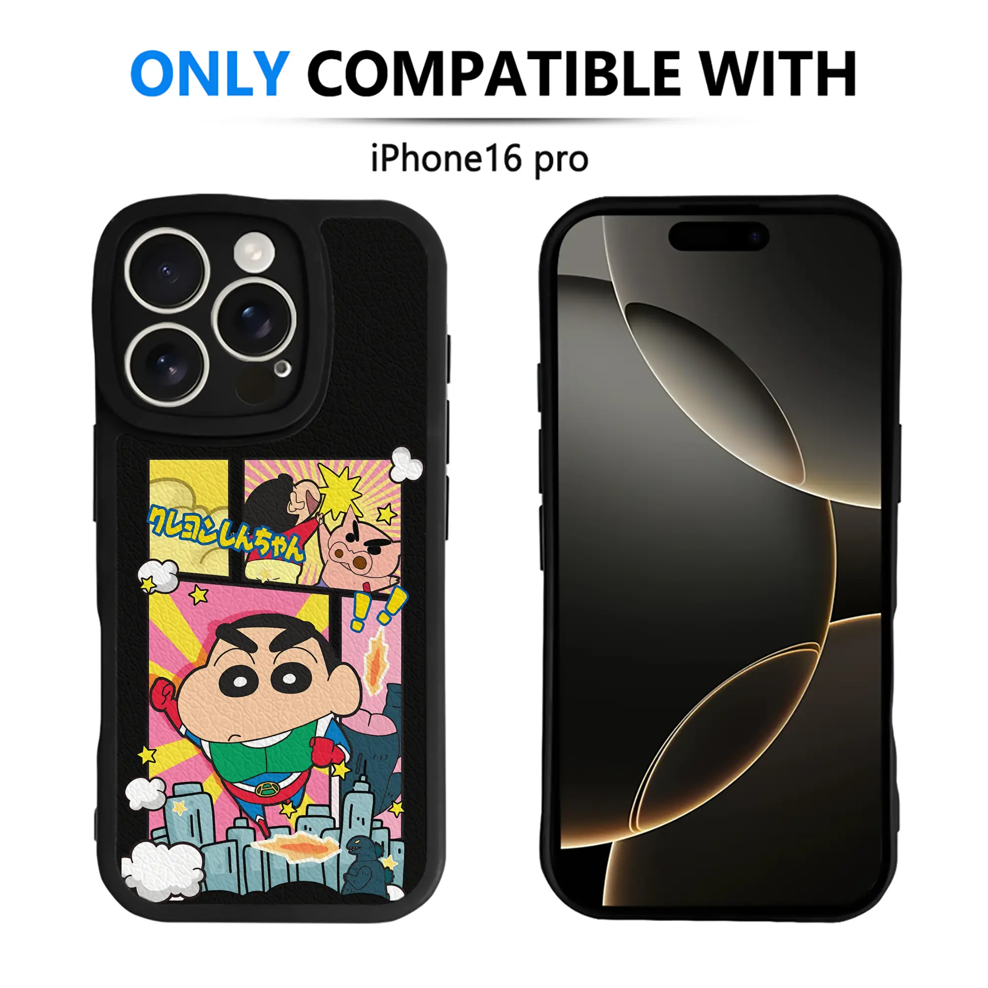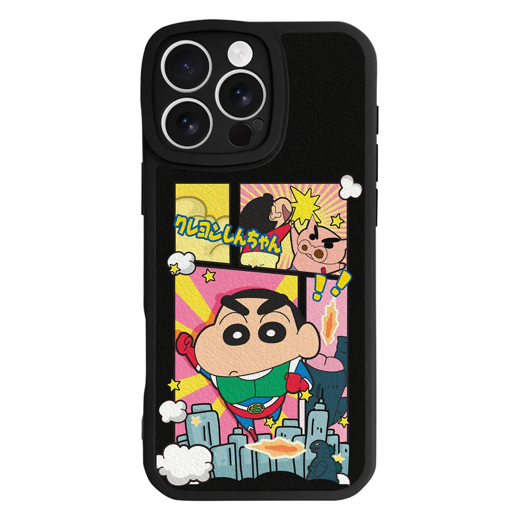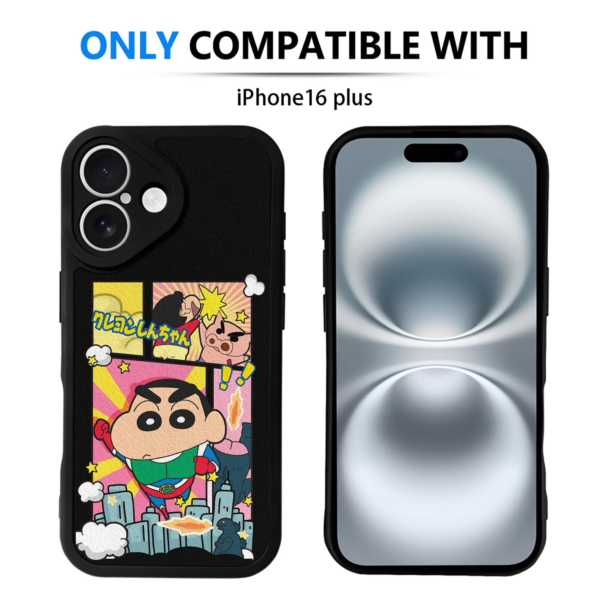 クレヨンしんちゃん グッズ アクション仮面 - IPhone 16シリーズ対応 ・ シリコンスマホケース ・ レザー調 ・ 高精度フィット ・ 耐衝撃 ・ ワイヤレス充電対応 ・ 精密カット