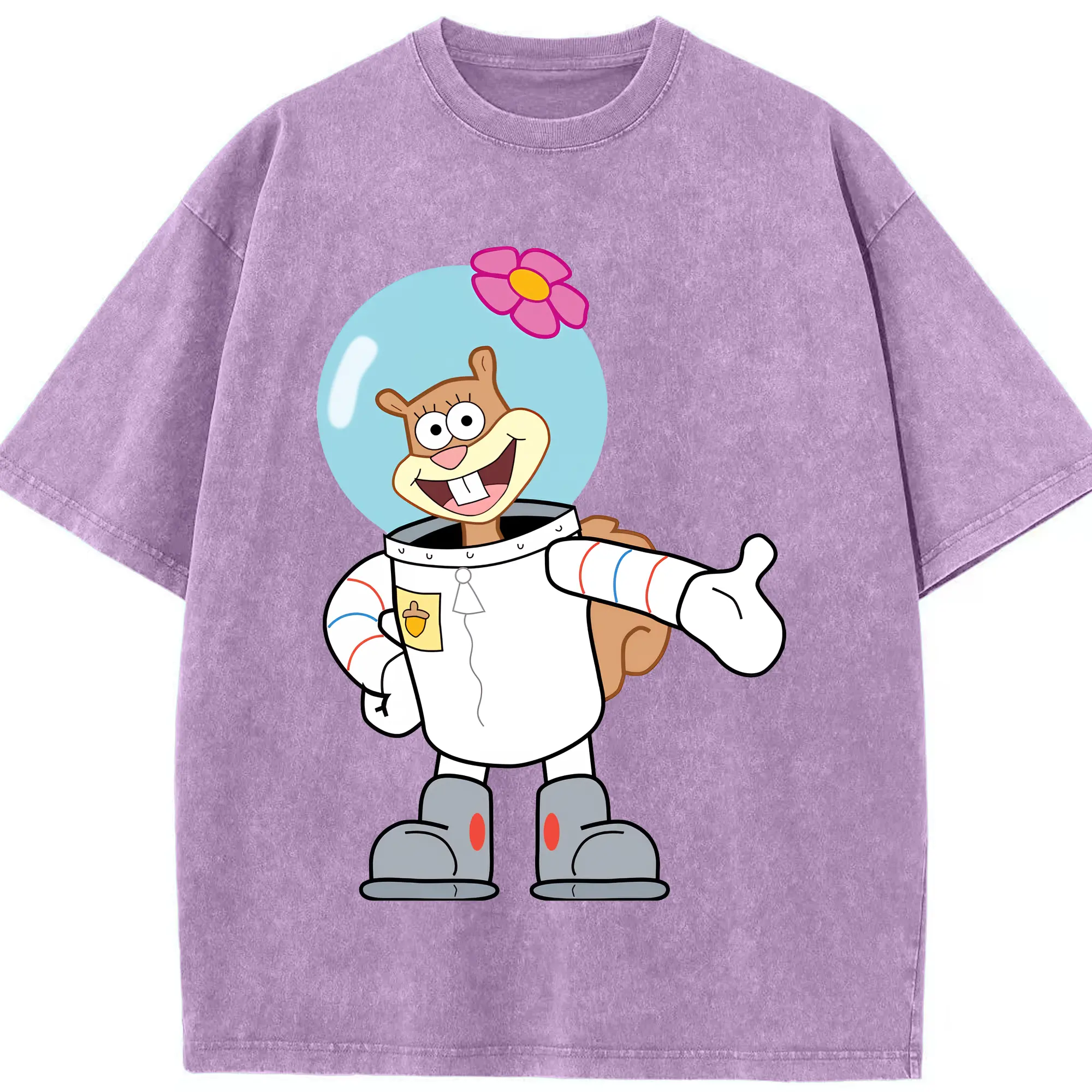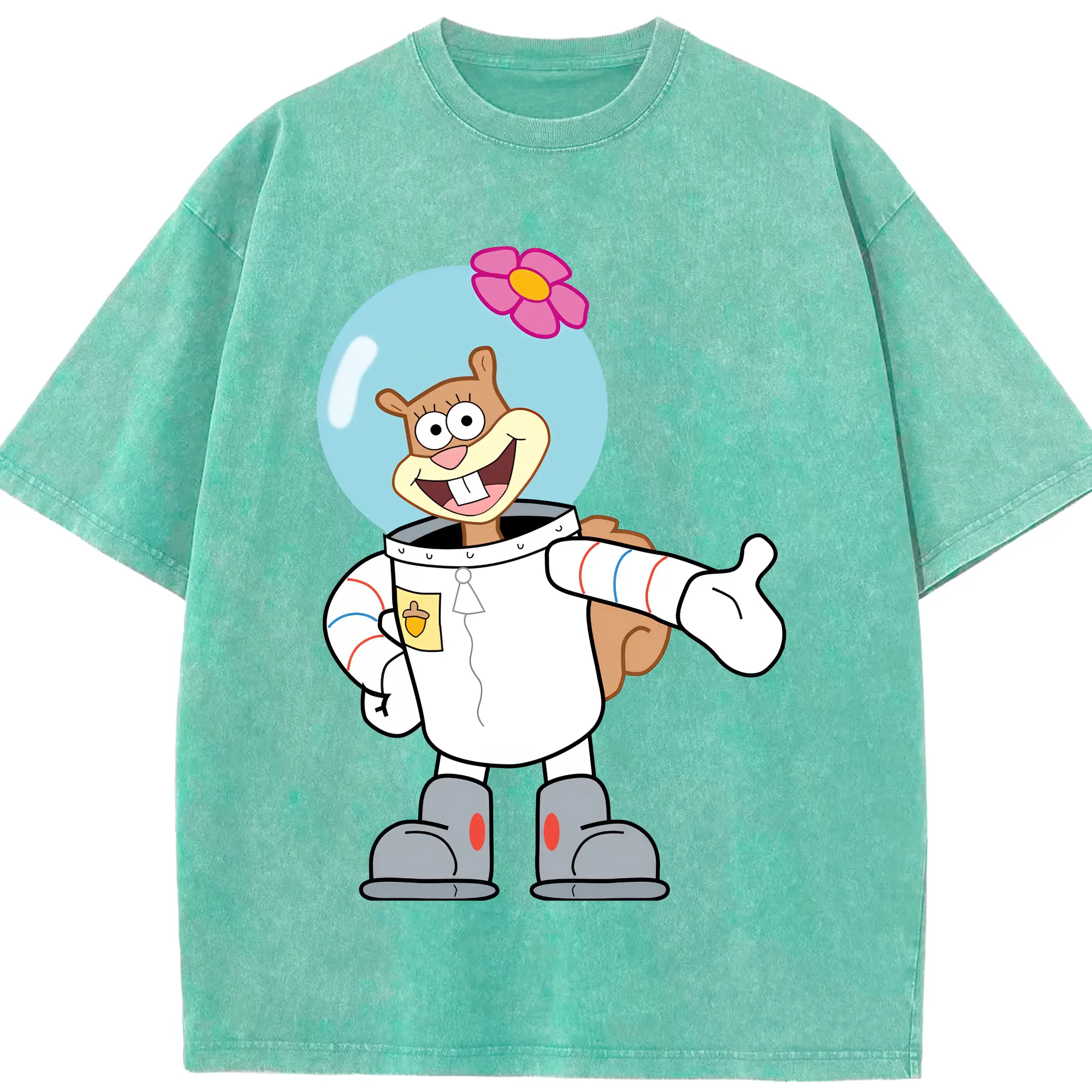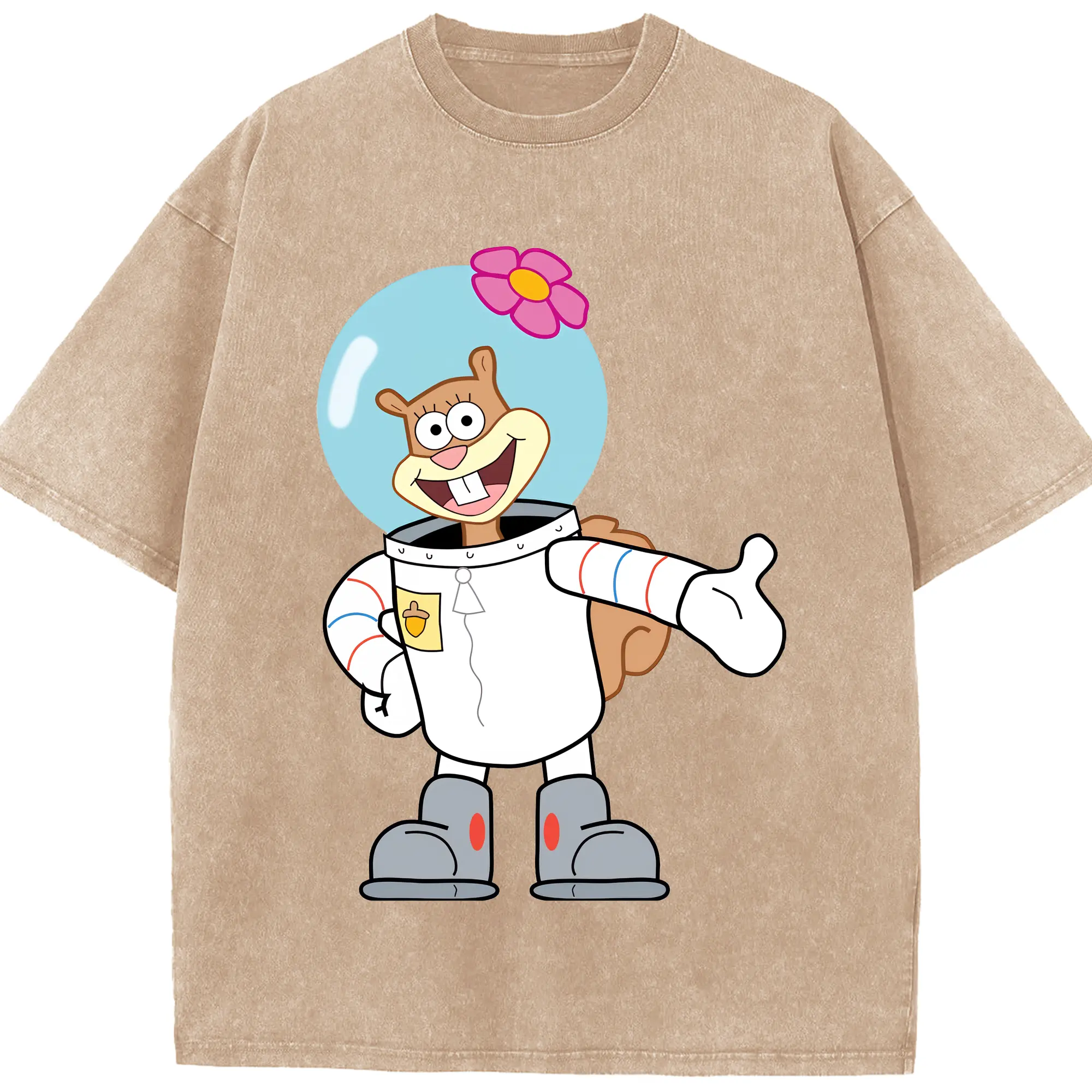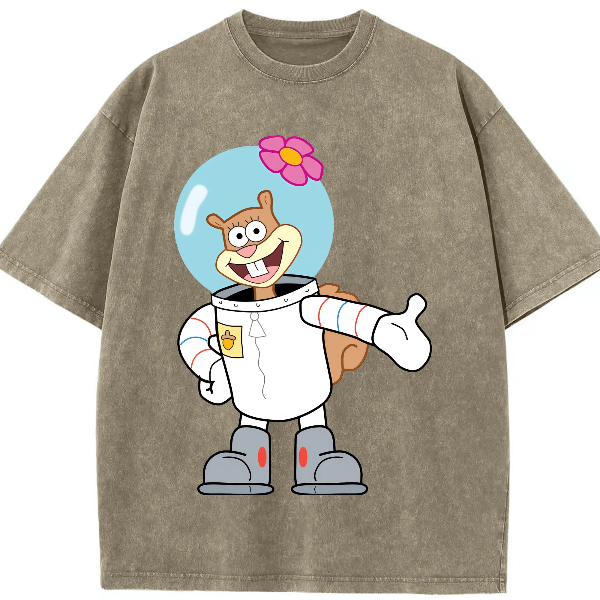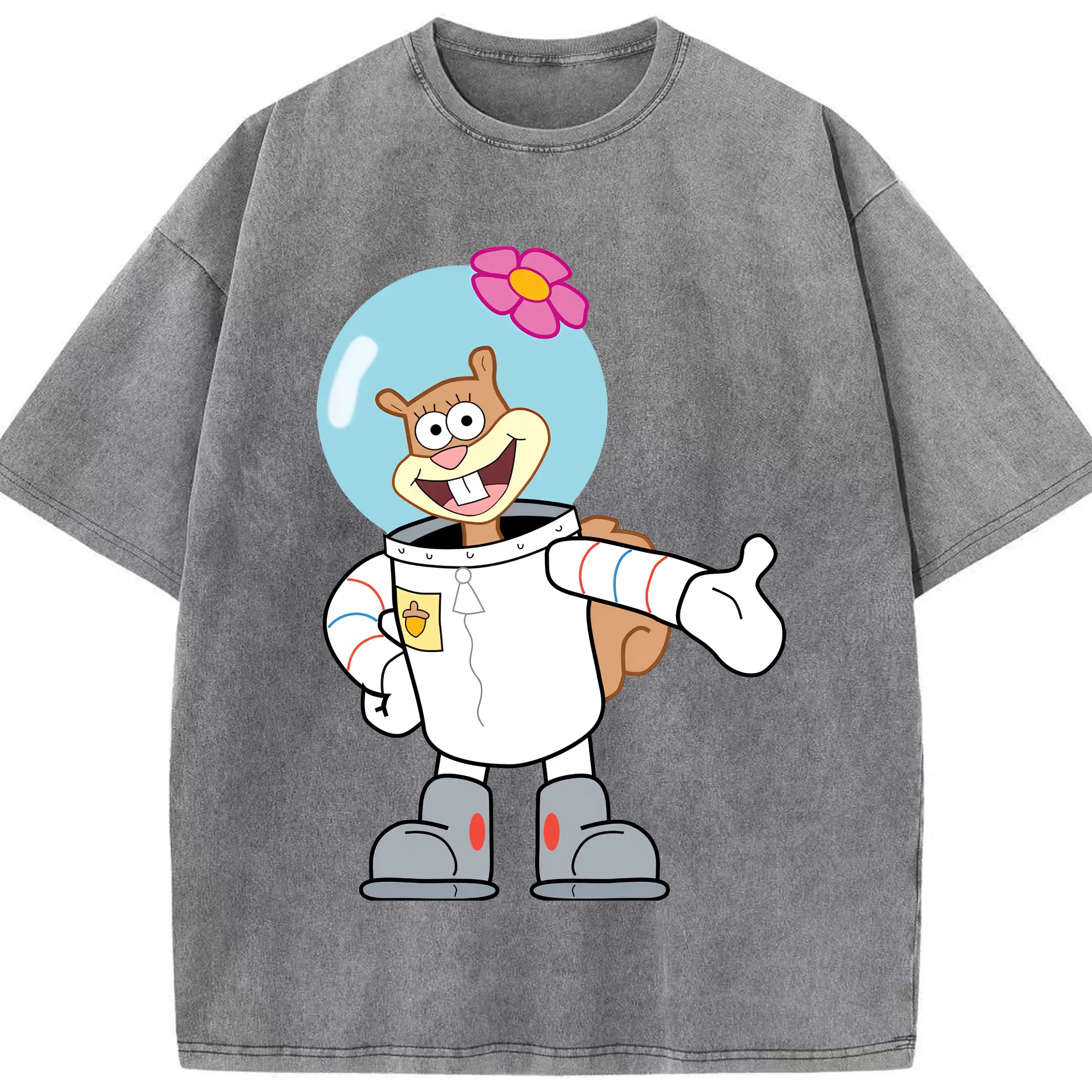 スポンジボブ グッズ サンディ - 綿100% ヴィンテージ風 半袖Tシャツ ・ 背面プリント ・ 柔らか肌触り ・ 通気性 快適 ・ スポーツ カジュアル 外出用