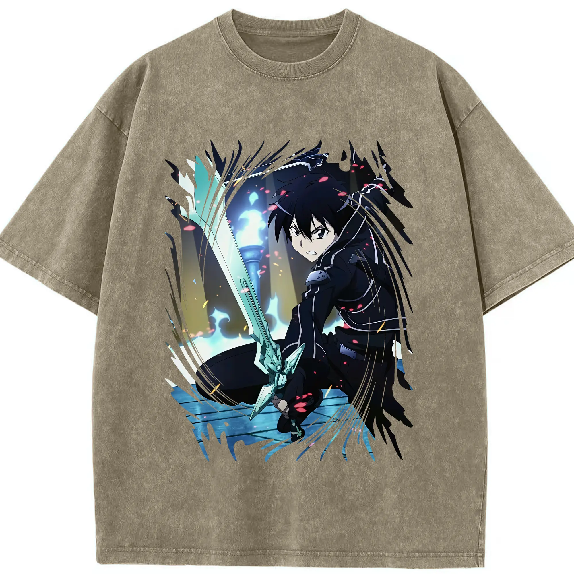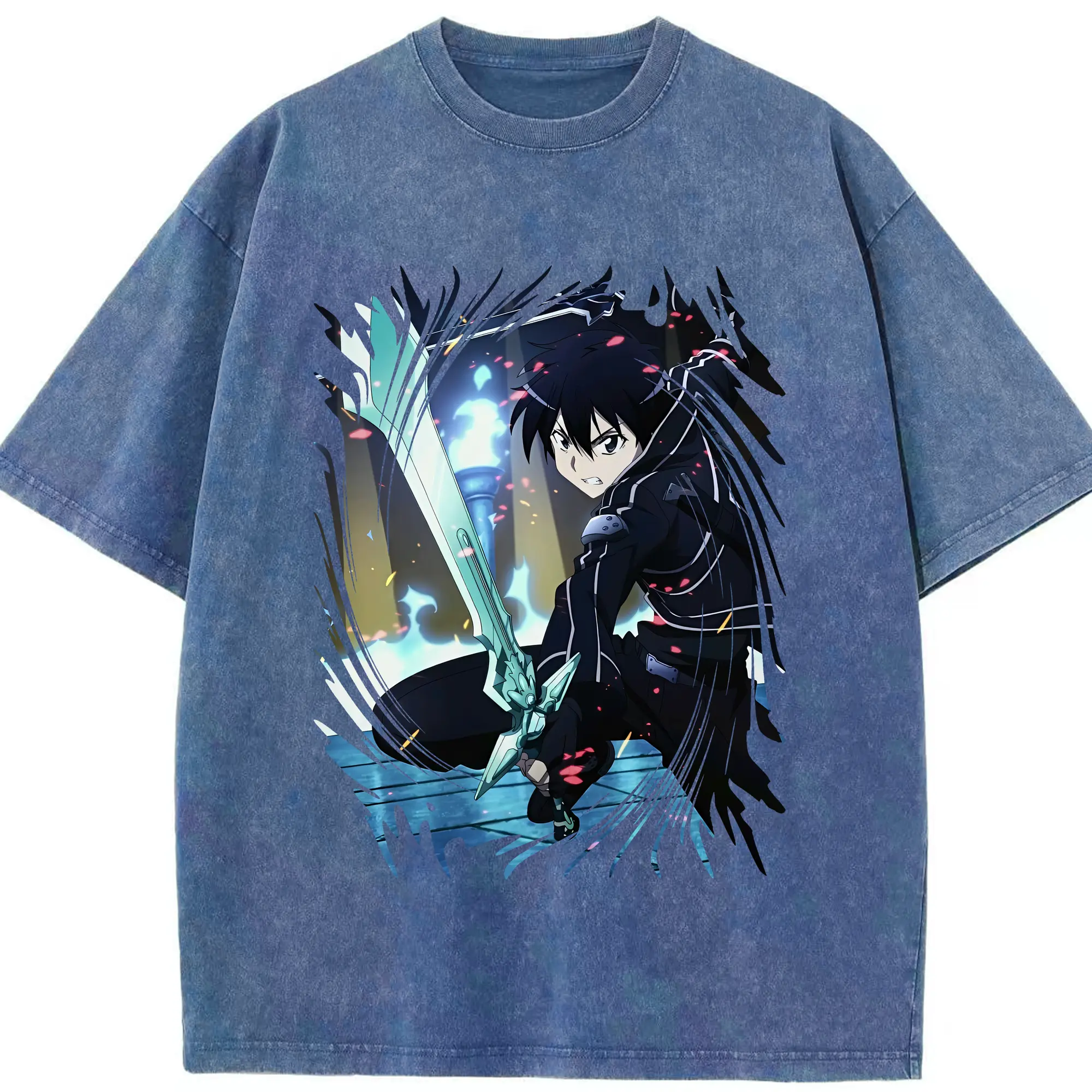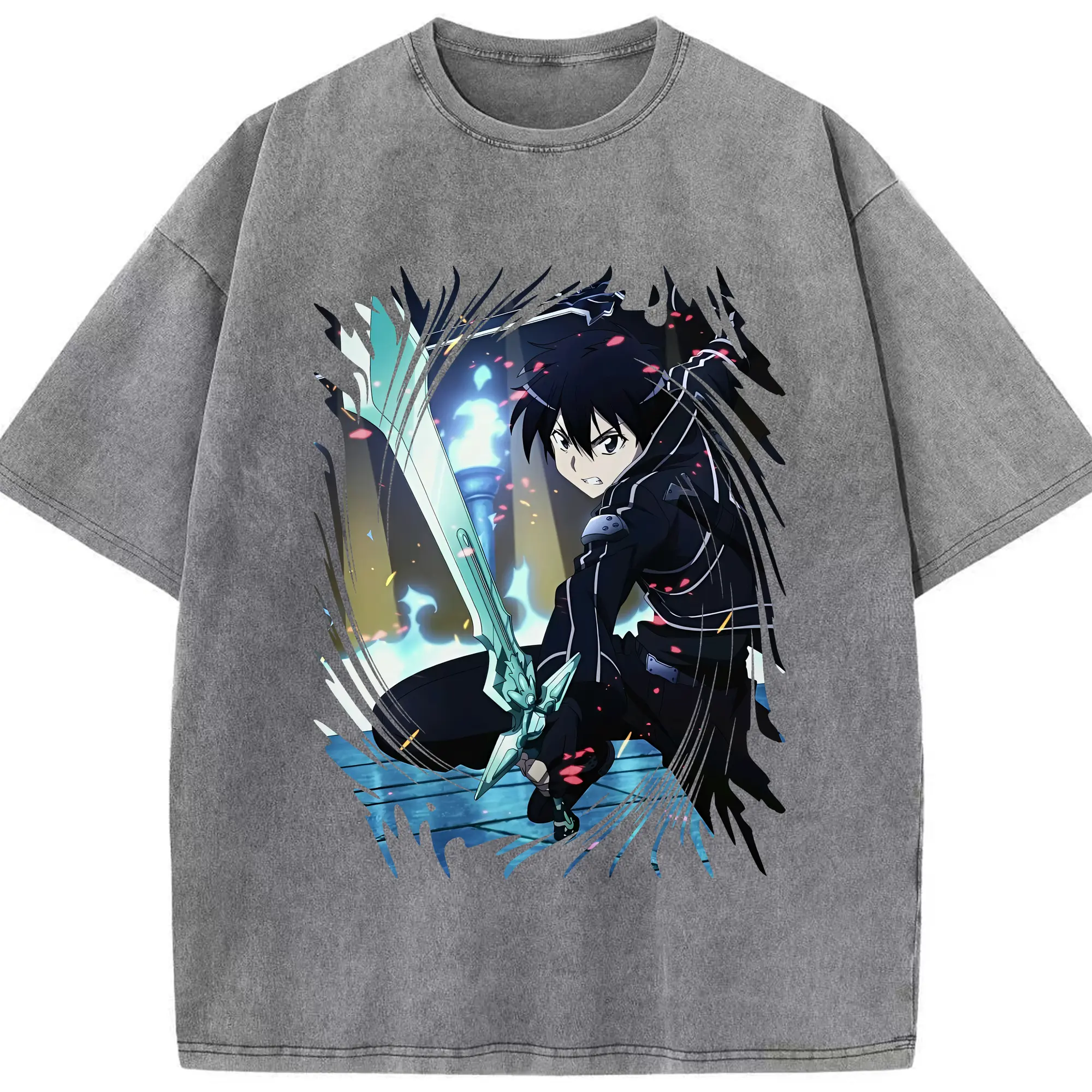 ソードアートオンライン グッズ キリト - 綿100% ヴィンテージ風 半袖Tシャツ ・ 背面プリント ・ 柔らか肌触り ・ 通気性 快適 ・ スポーツ カジュアル 外出用