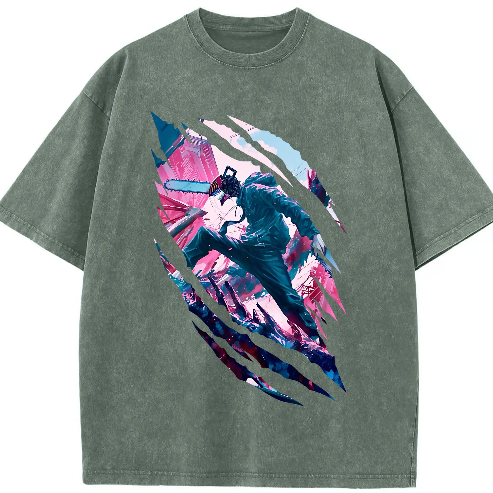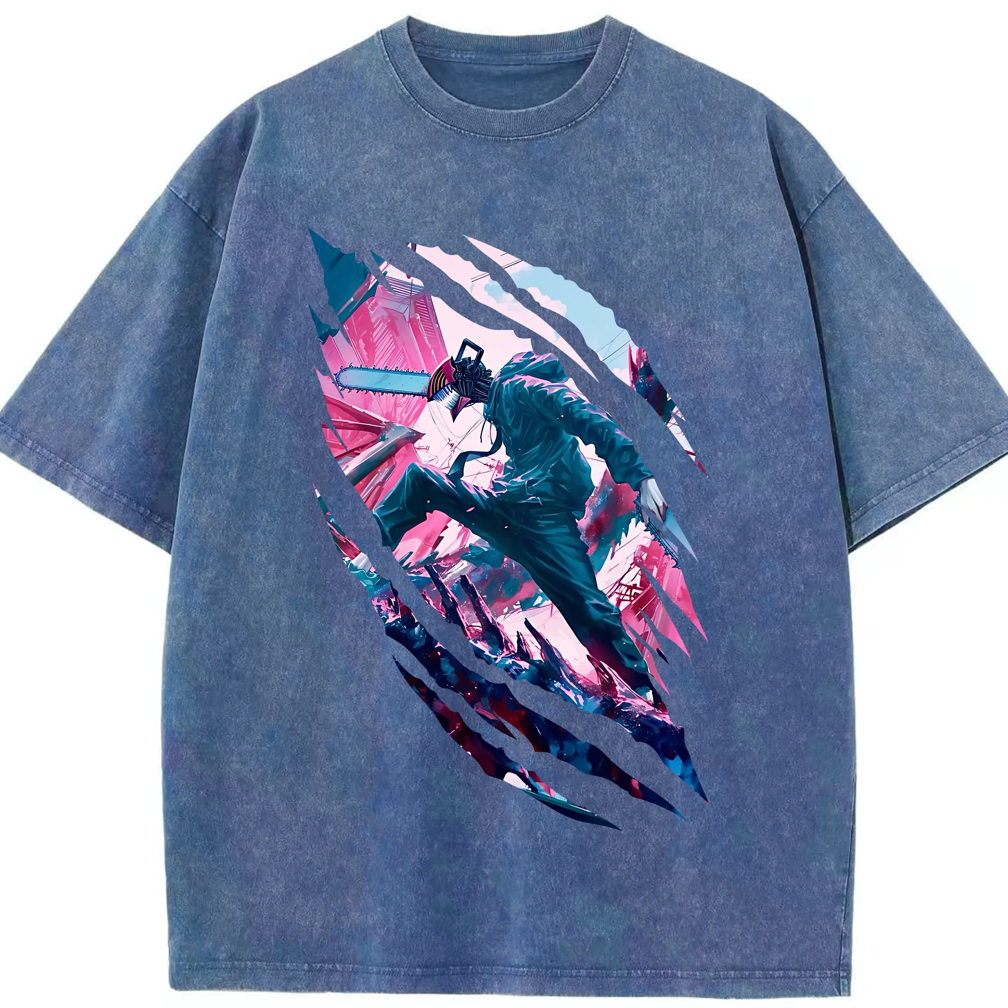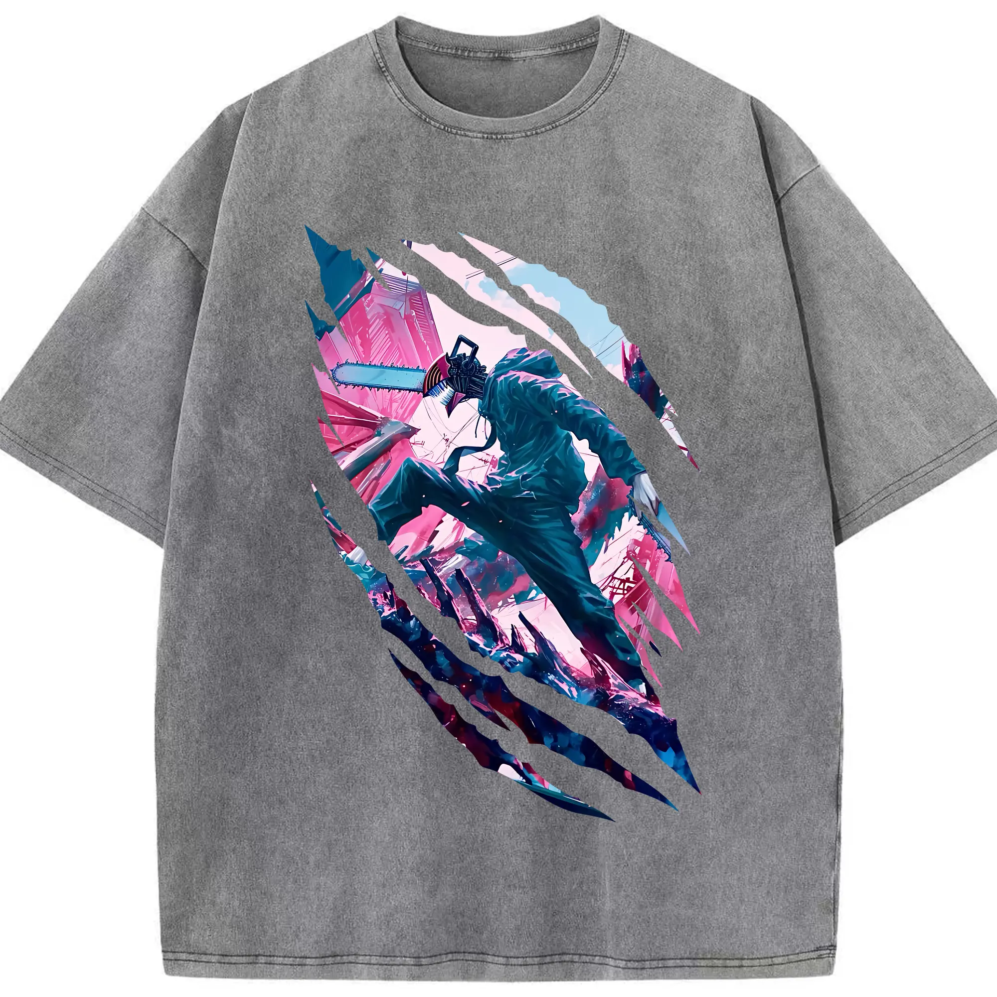 チェンソーマン グッズ,デンジ - 綿100% ヴィンテージ風 半袖Tシャツ ・ 背面プリント ・ 柔らか肌触り ・ 通気性 快適 ・ スポーツ カジュアル 外出用