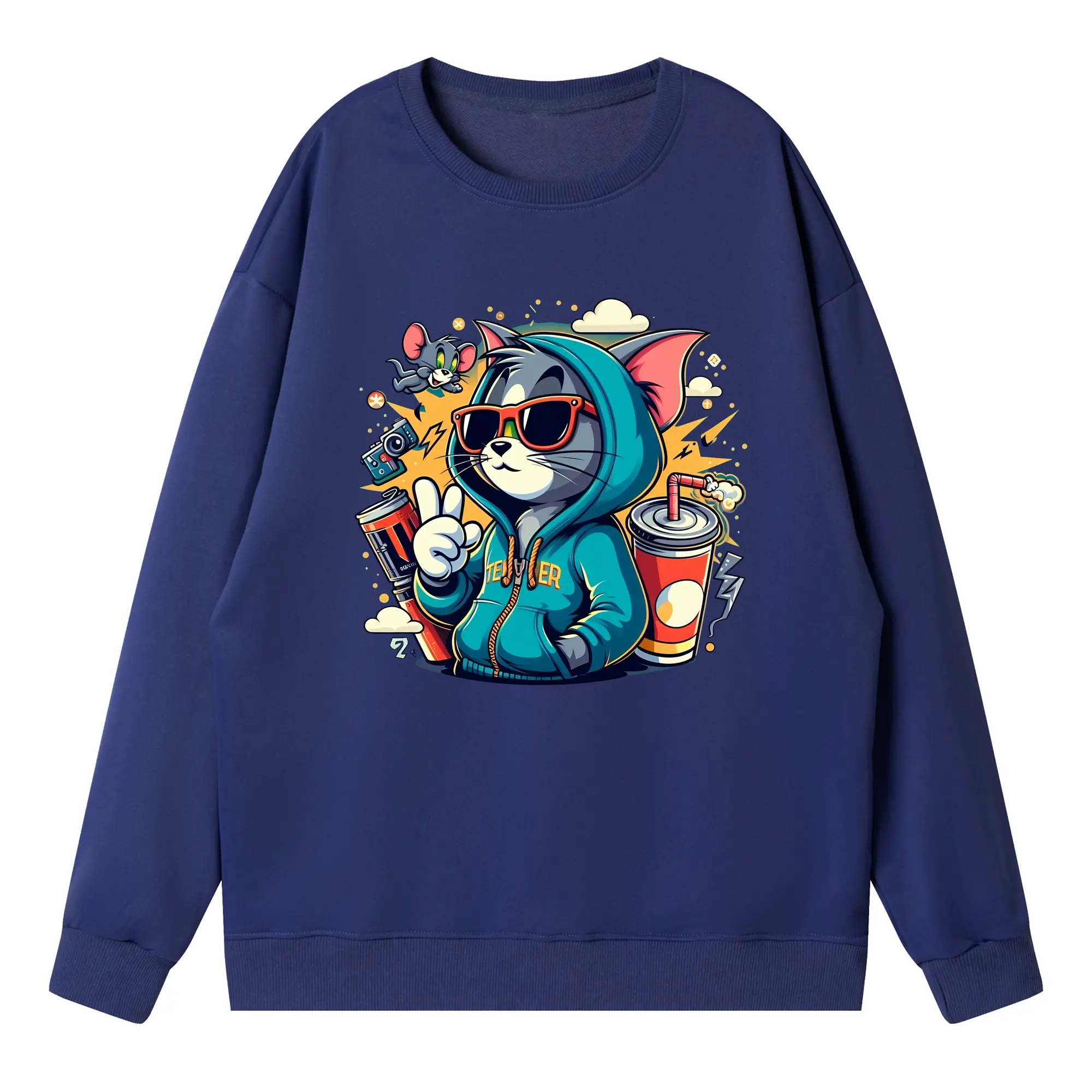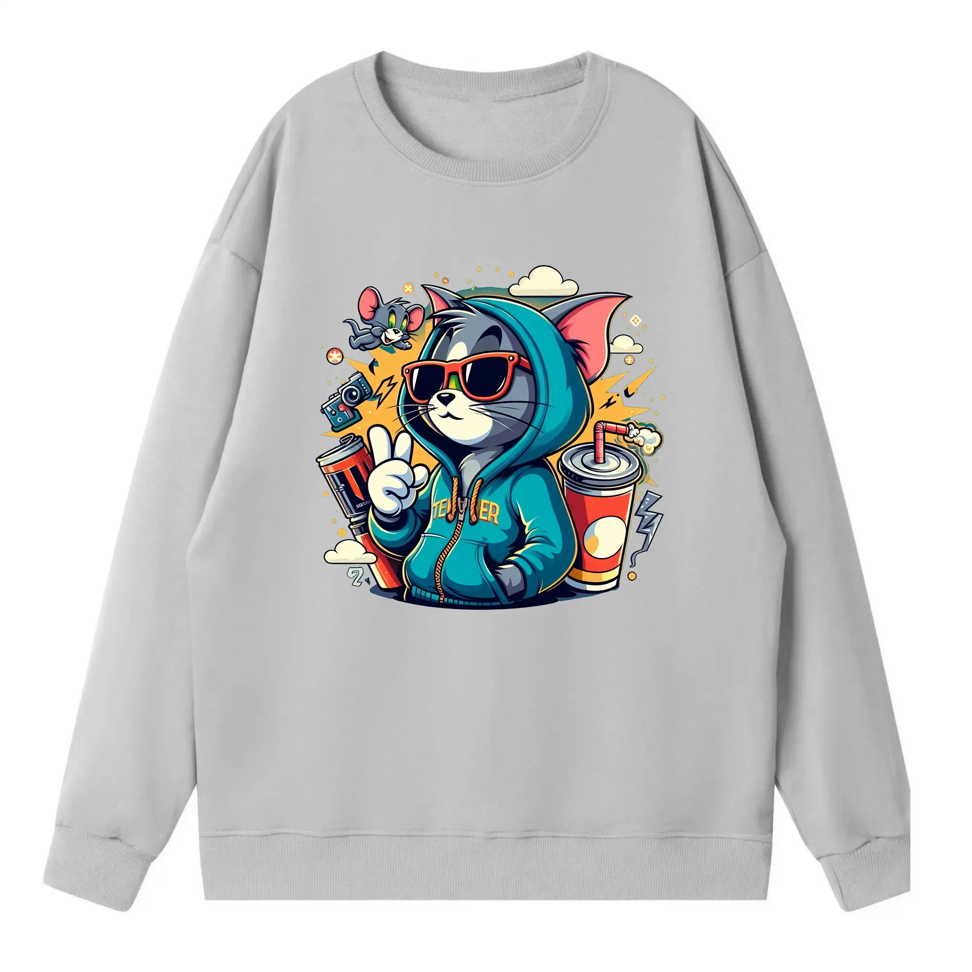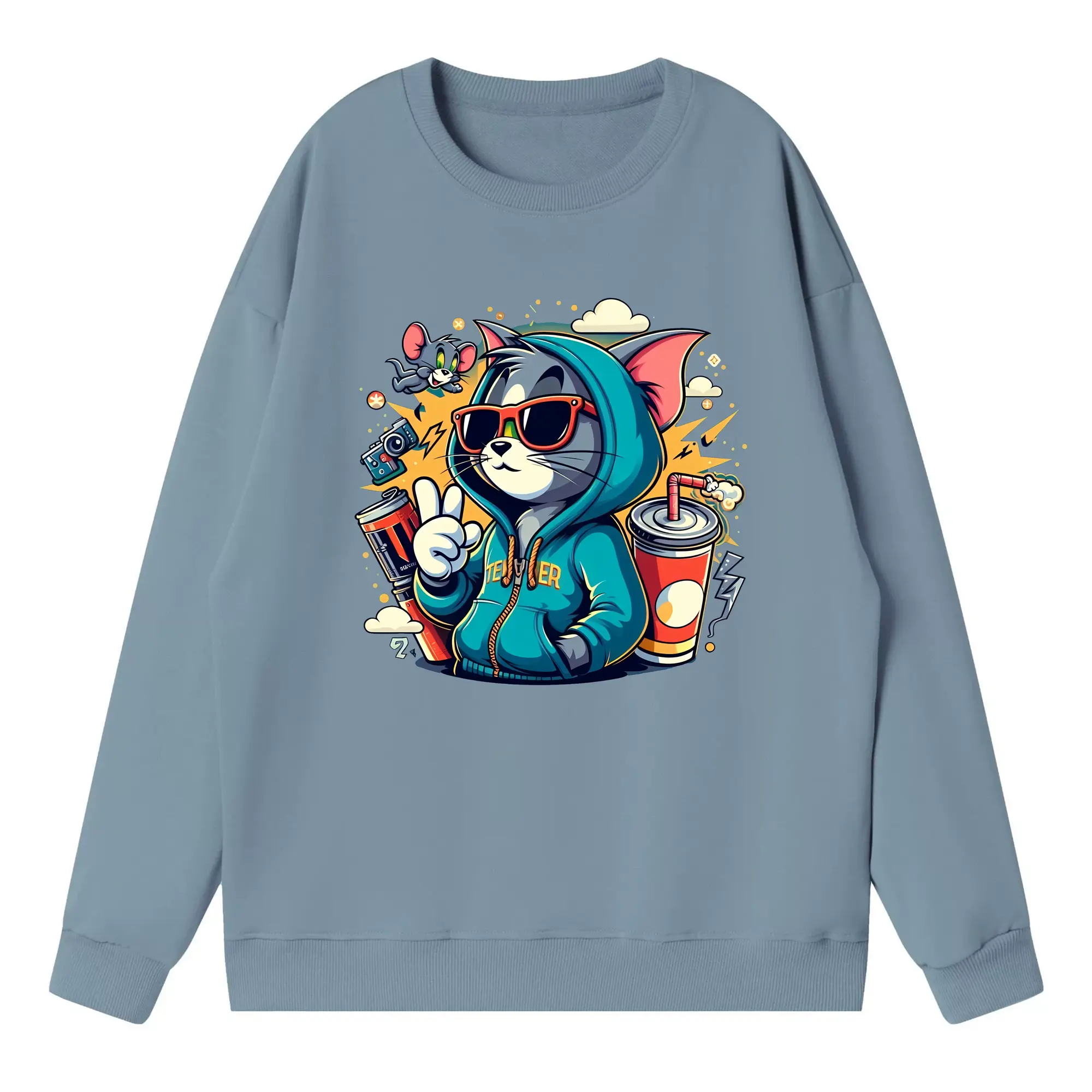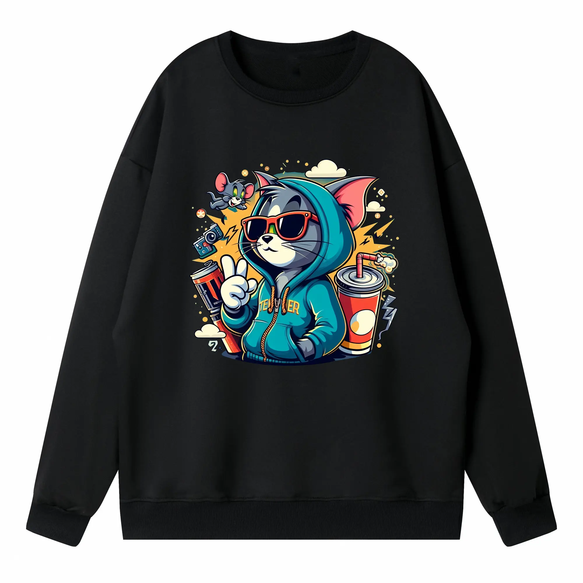トムとジェリー グッズ トム - 高品質 クルーネック スウェット ・ コットン59% ポリエステル41% ・ ユニセックス 長袖 トレーナー ・ カジュアル デイリー スポーツ 散歩用