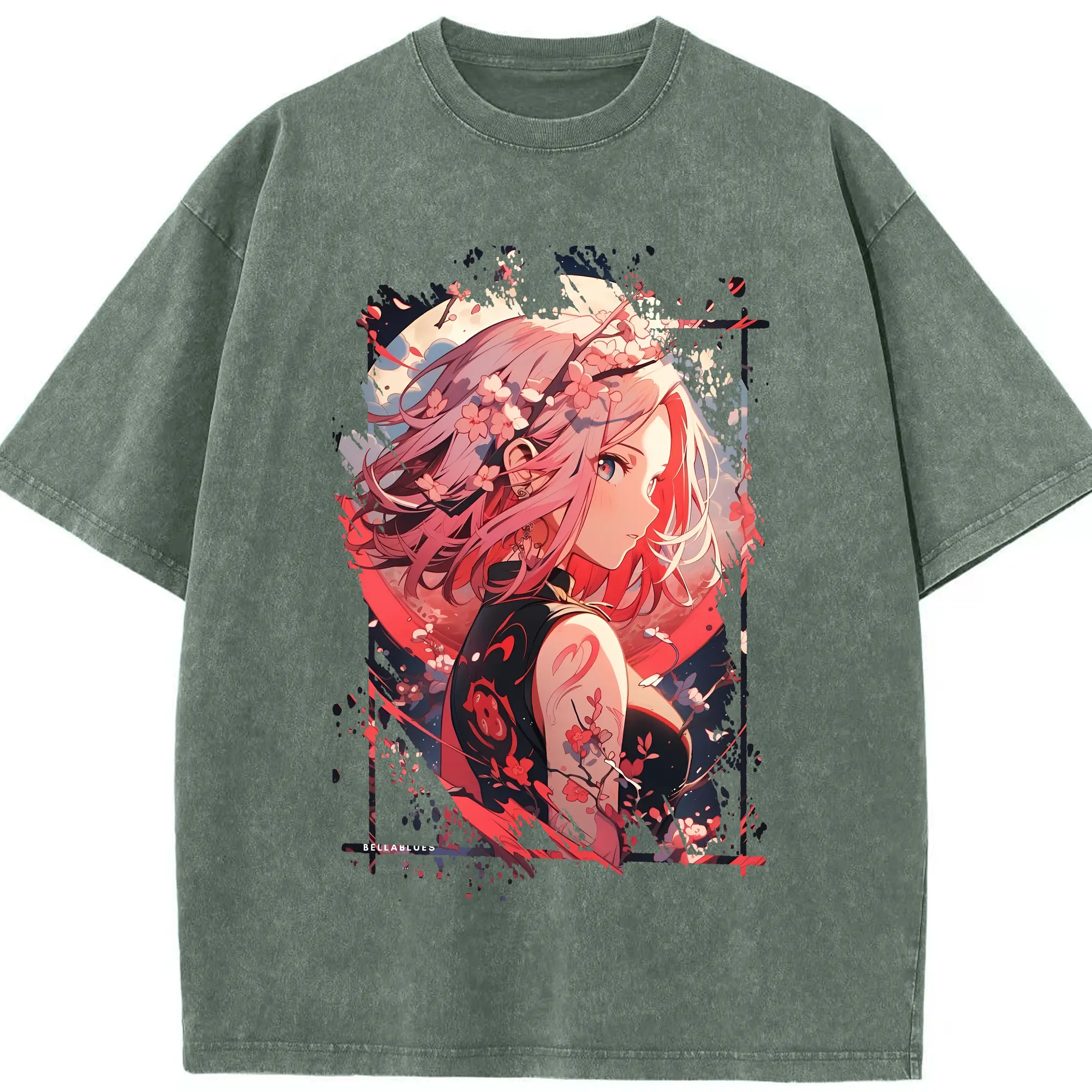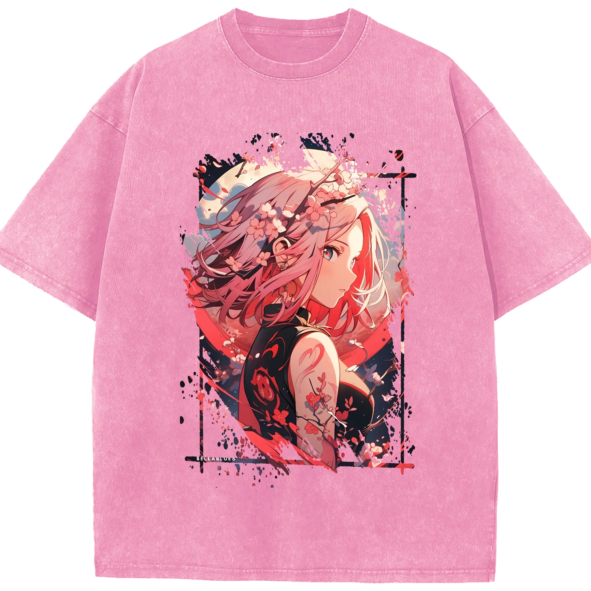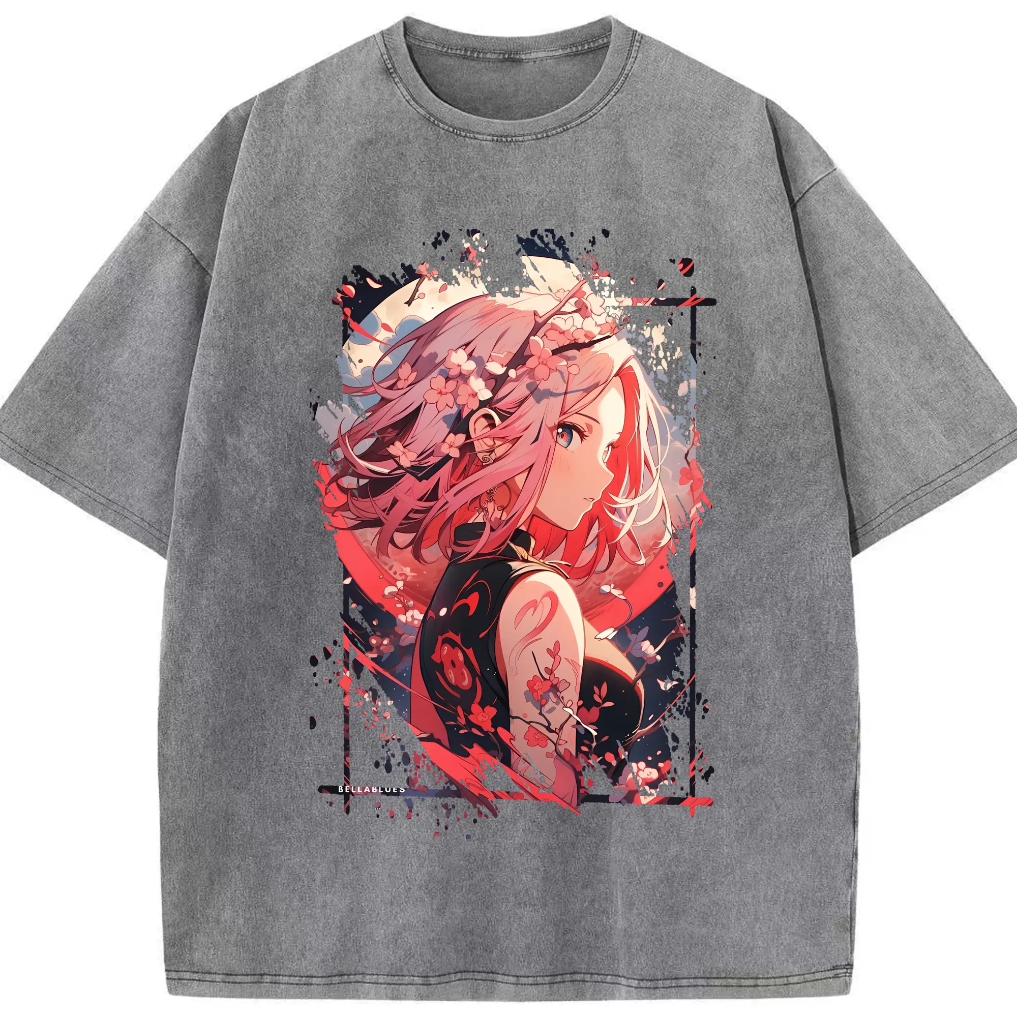 ナルト グッズ はるの さくら - 綿100% ヴィンテージ風 半袖Tシャツ ・ 背面プリント ・ 柔らか肌触り ・ 通気性 快適 ・ スポーツ カジュアル 外出用