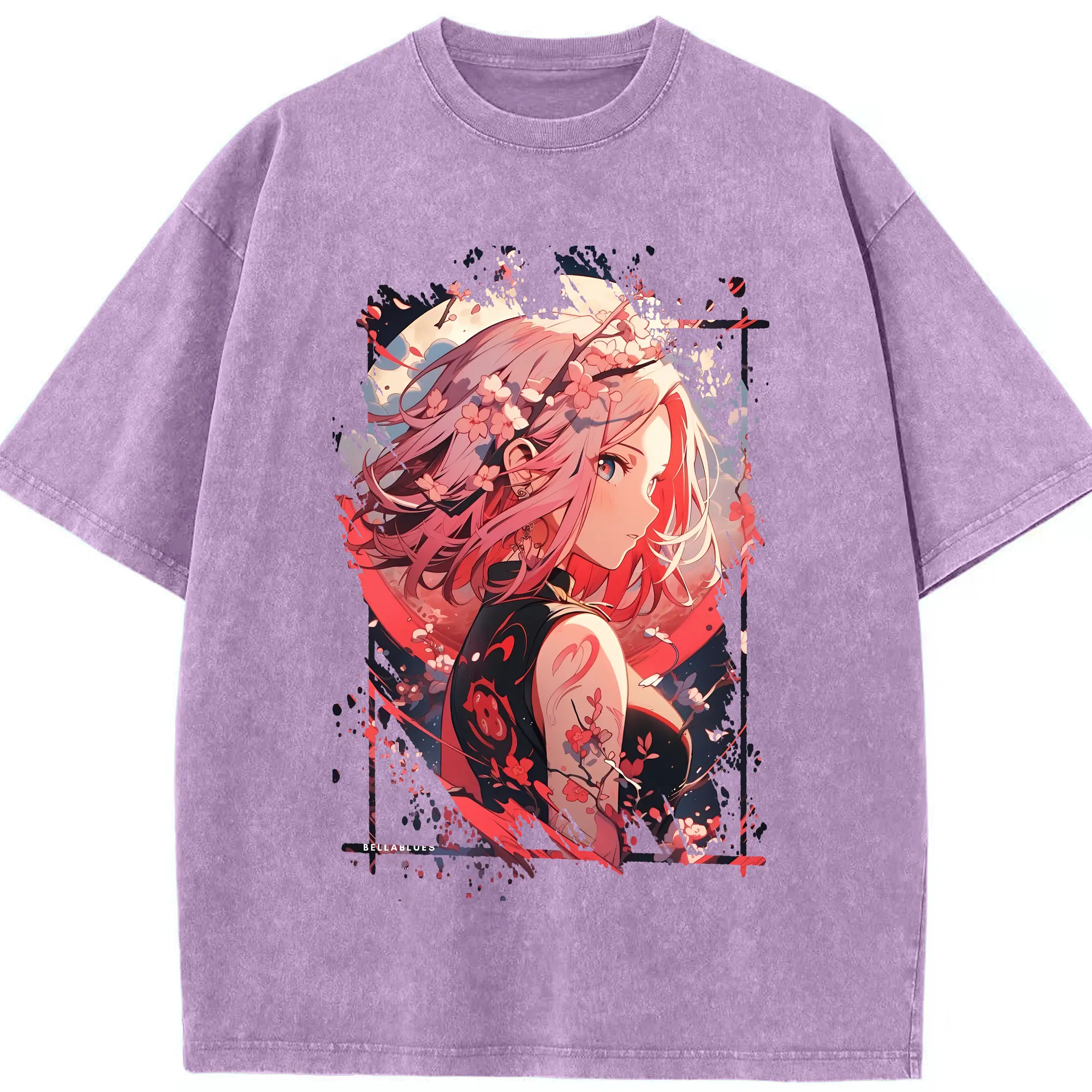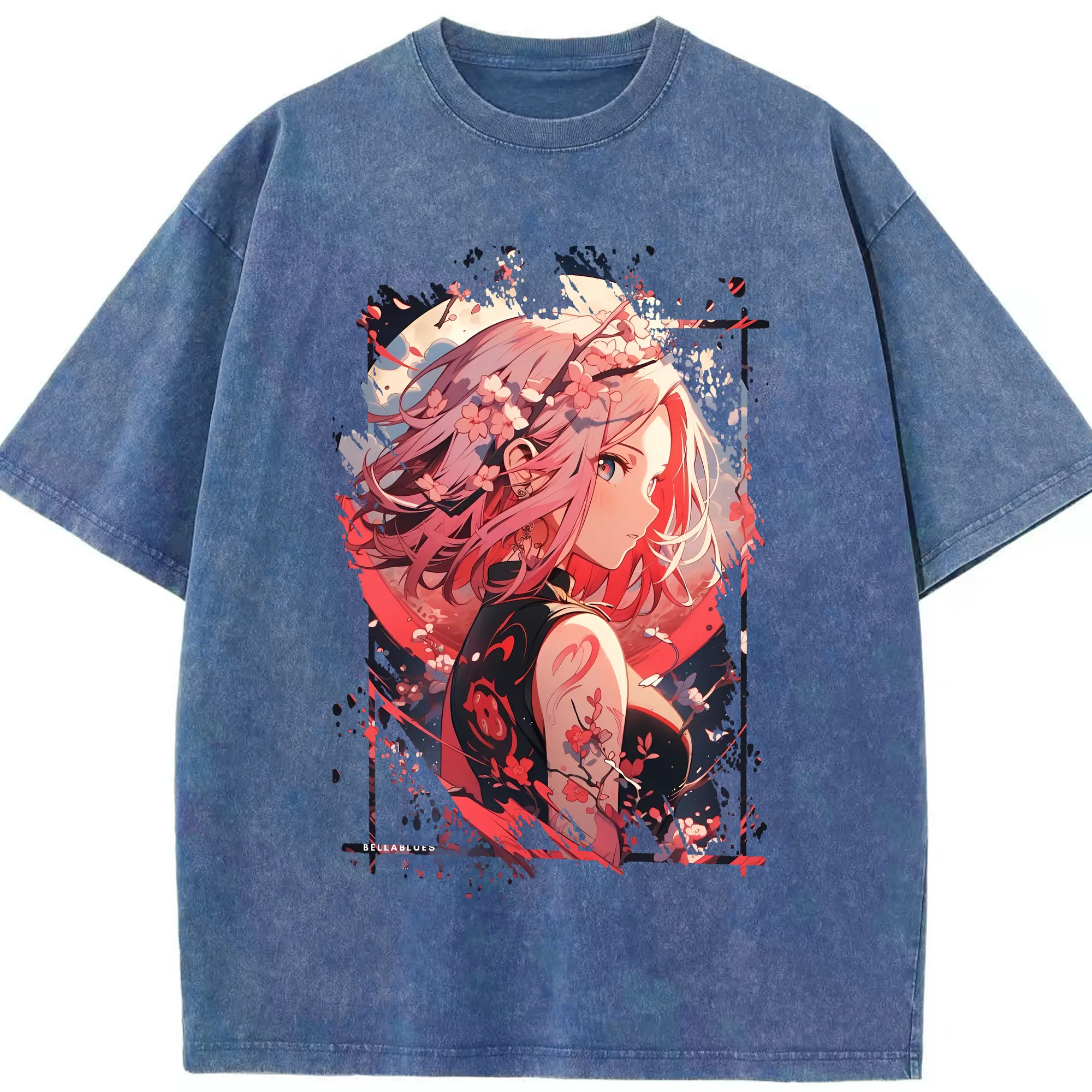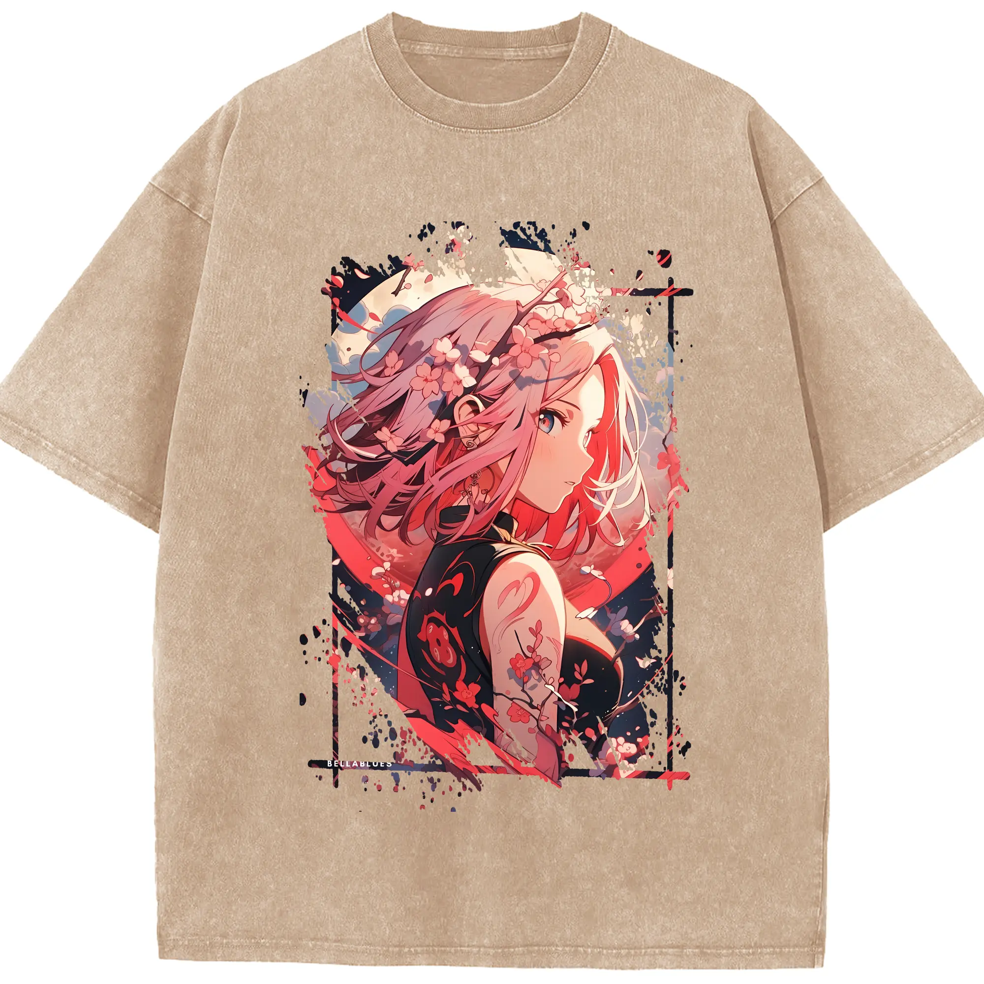 ナルト グッズ はるの さくら - 綿100% ヴィンテージ風 半袖Tシャツ ・ 背面プリント ・ 柔らか肌触り ・ 通気性 快適 ・ スポーツ カジュアル 外出用