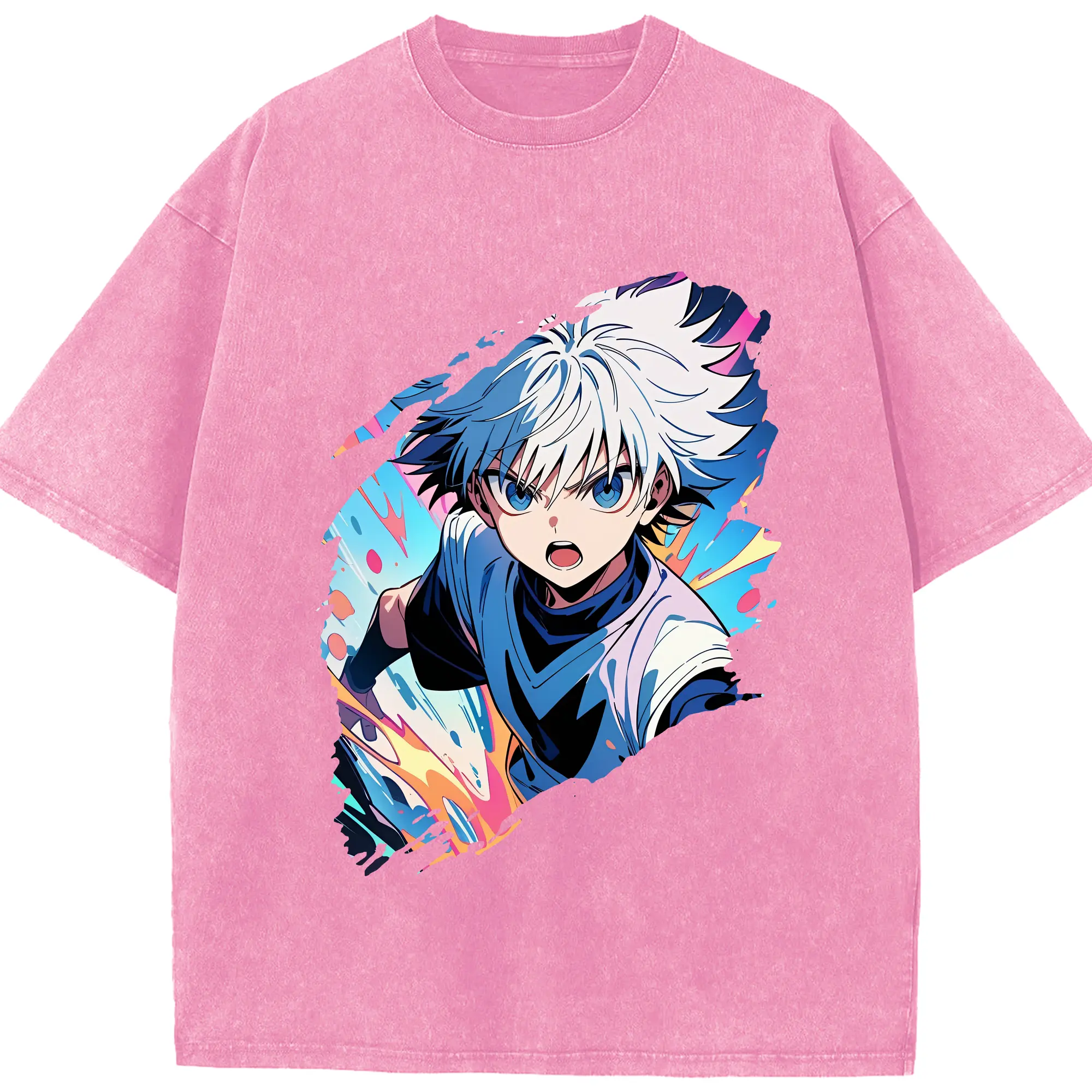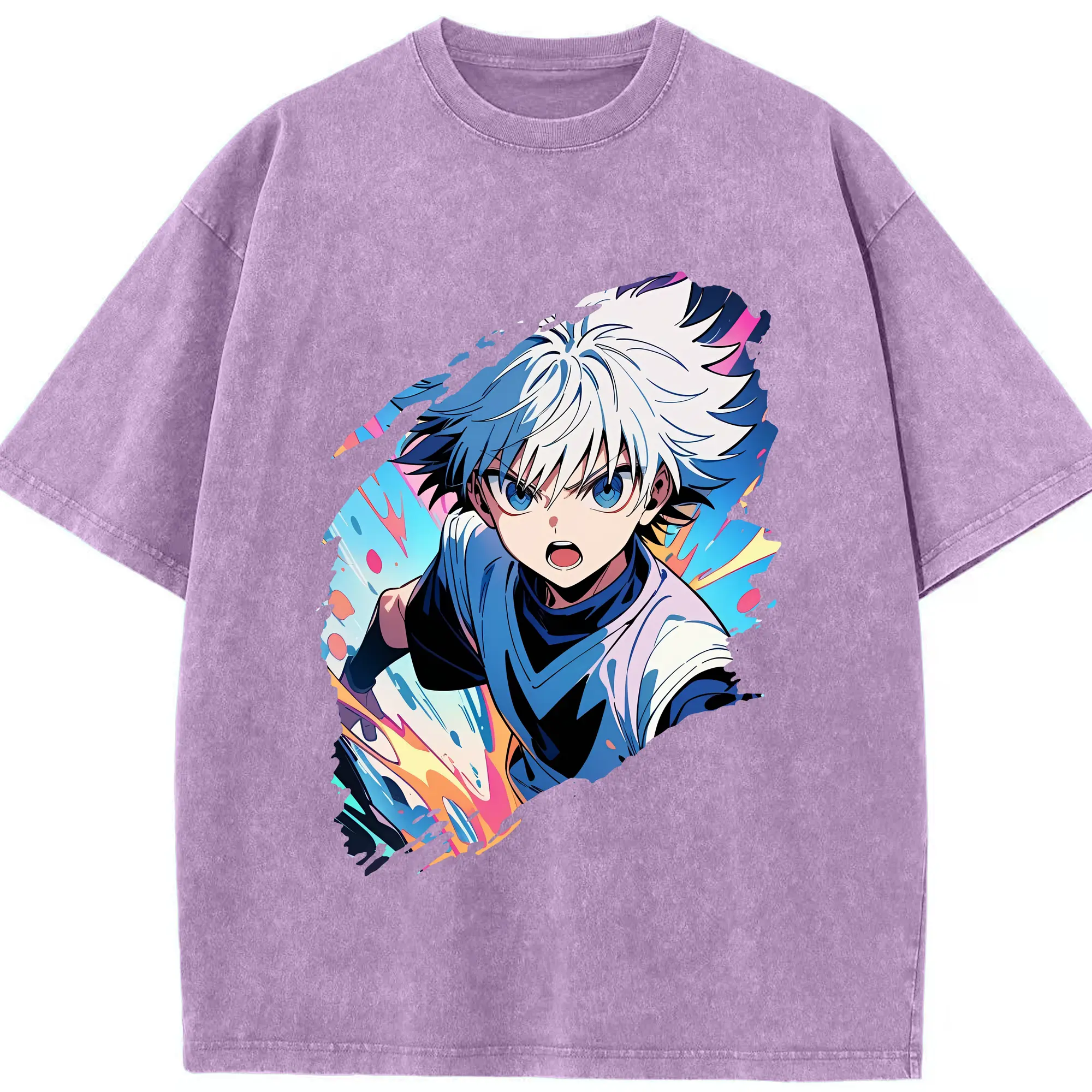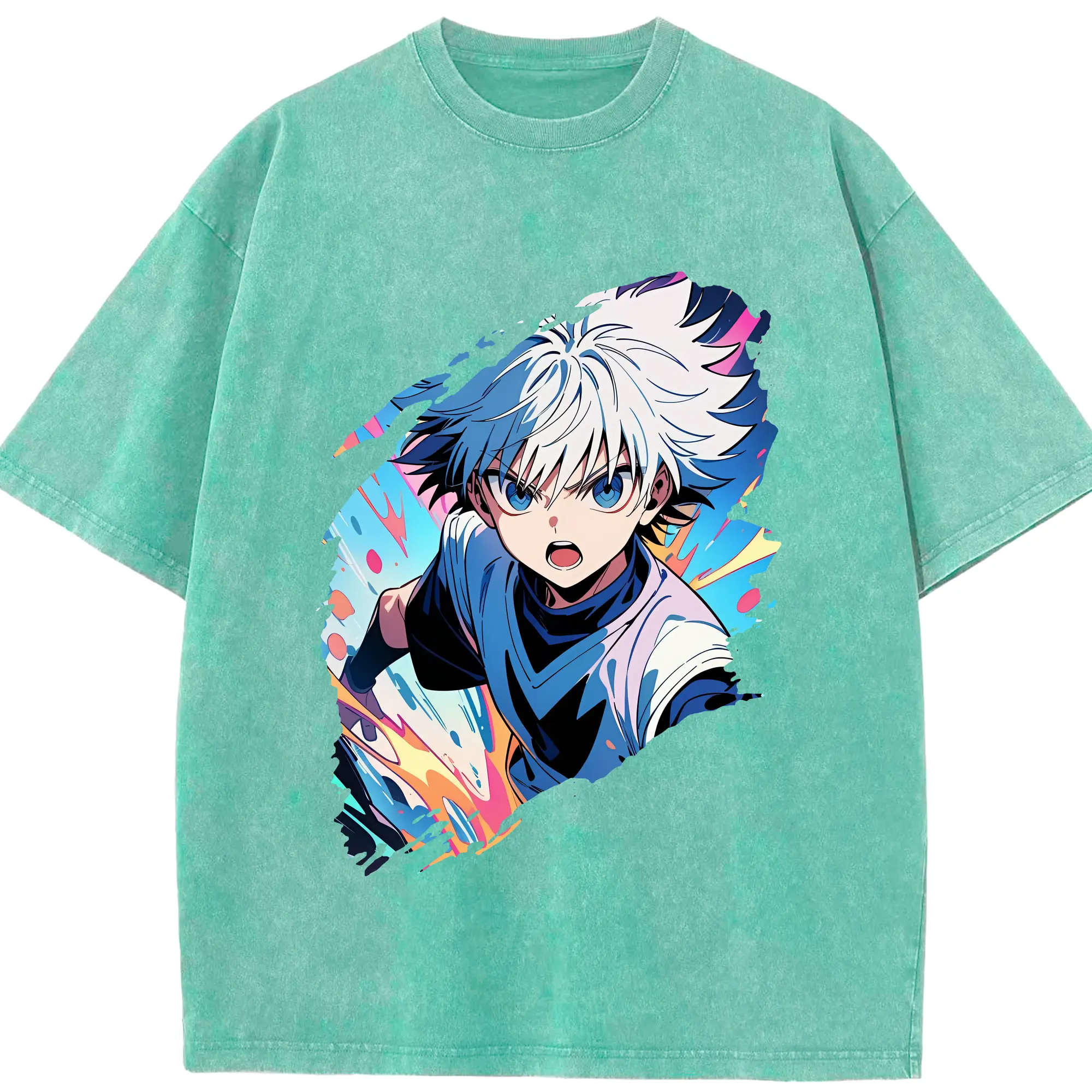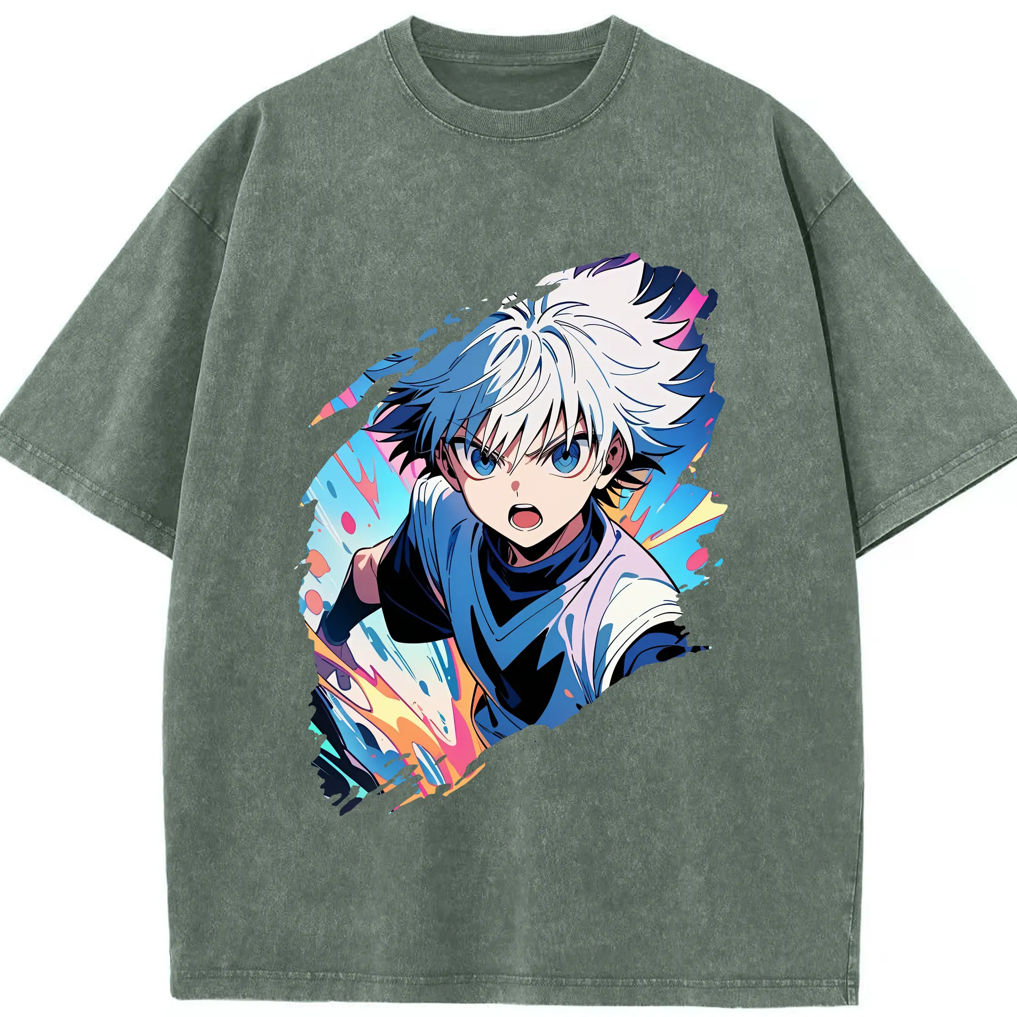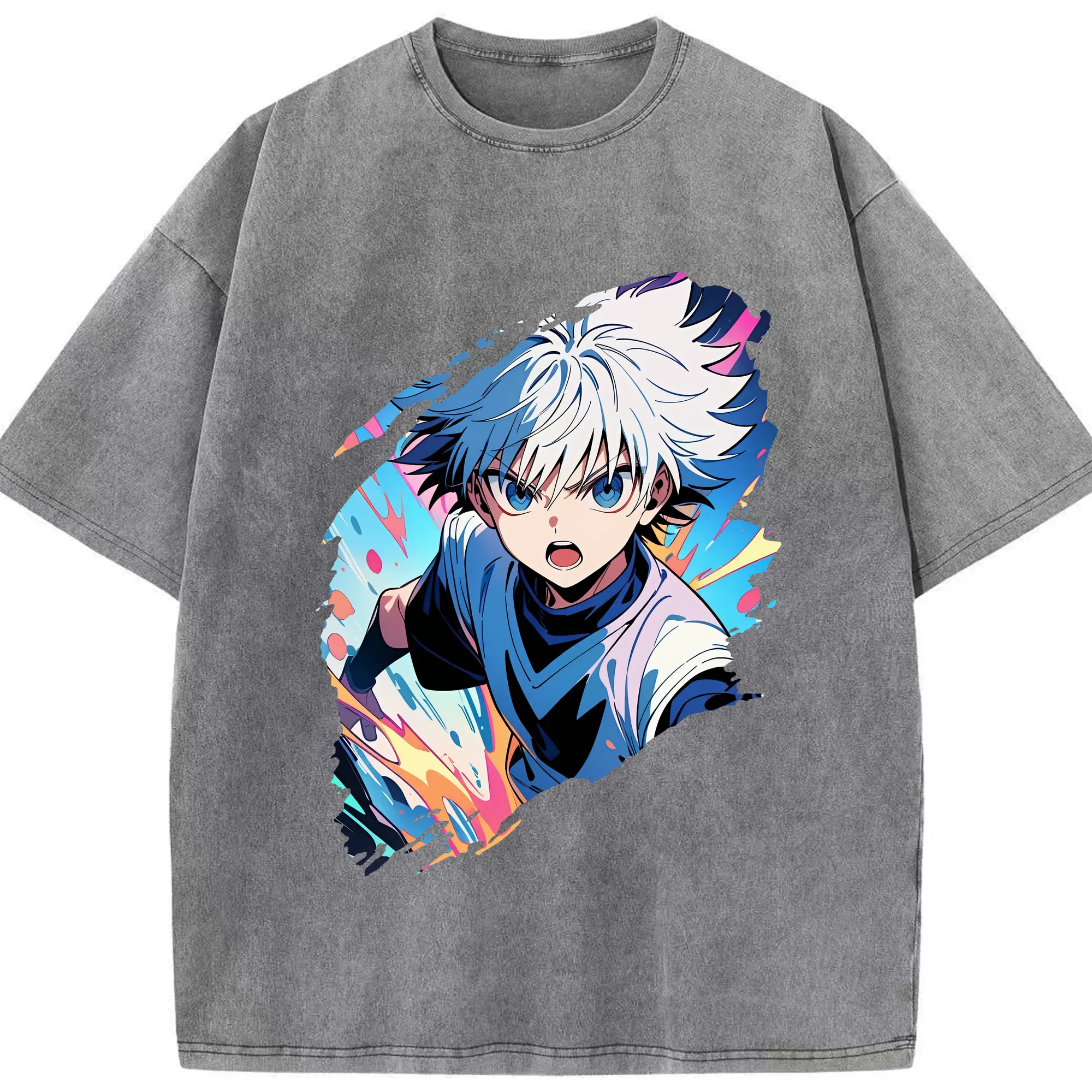 ハンター×ハンター グッズ キルア=ゾルディック - 綿100% ヴィンテージ風 半袖Tシャツ ・ 背面プリント ・ 柔らか肌触り ・ 通気性 快適 ・ スポーツ カジュアル 外出用