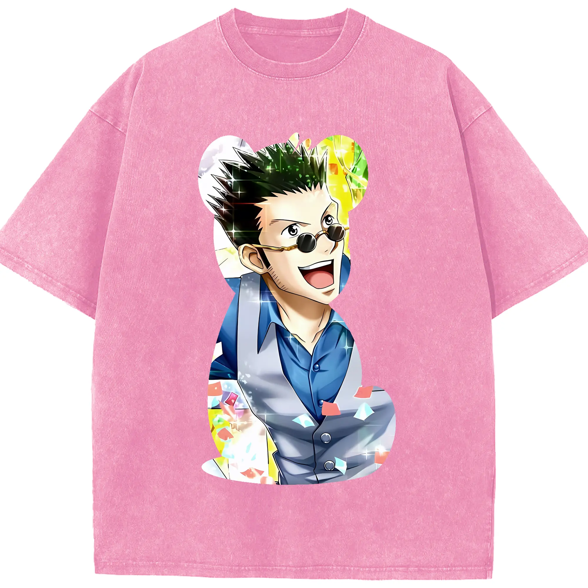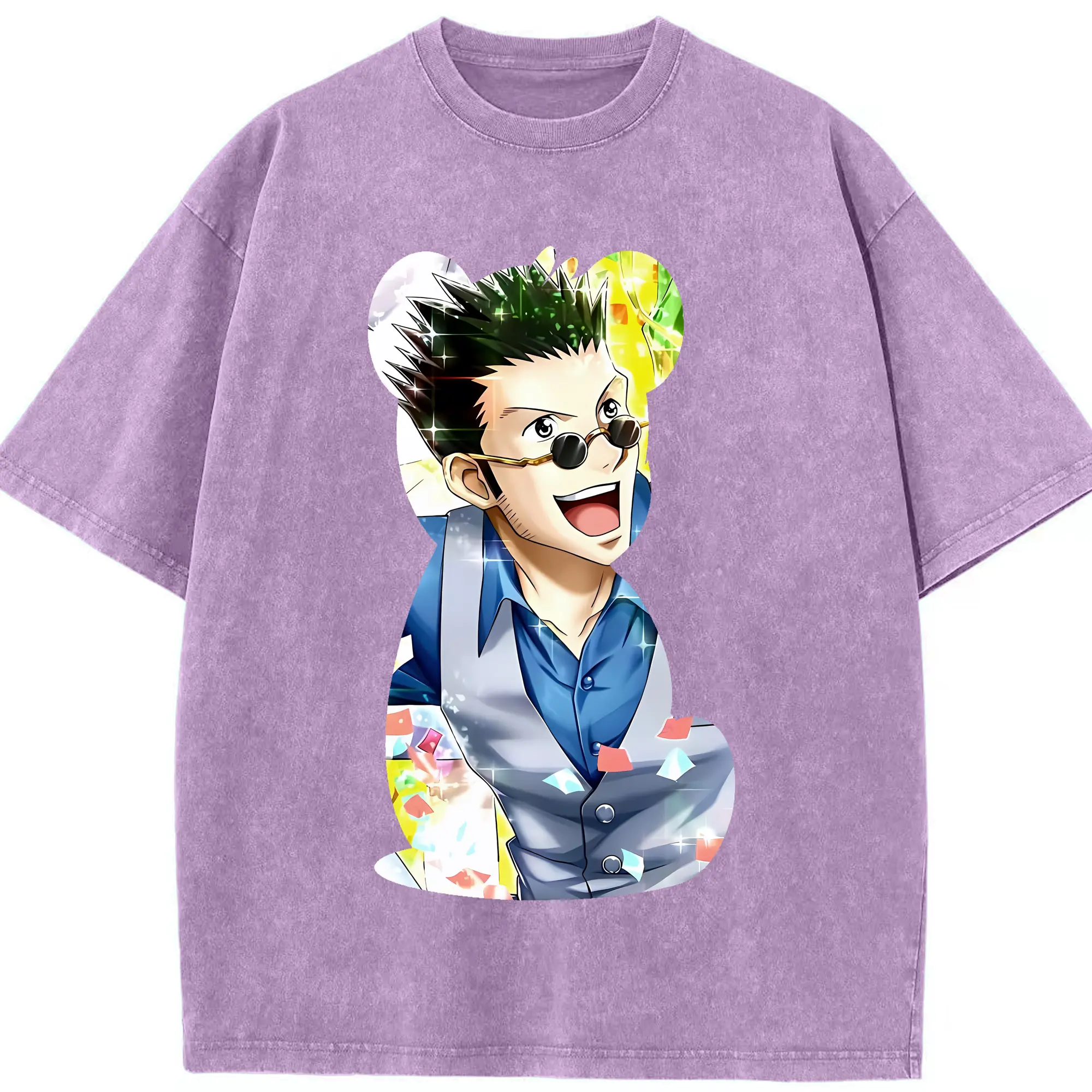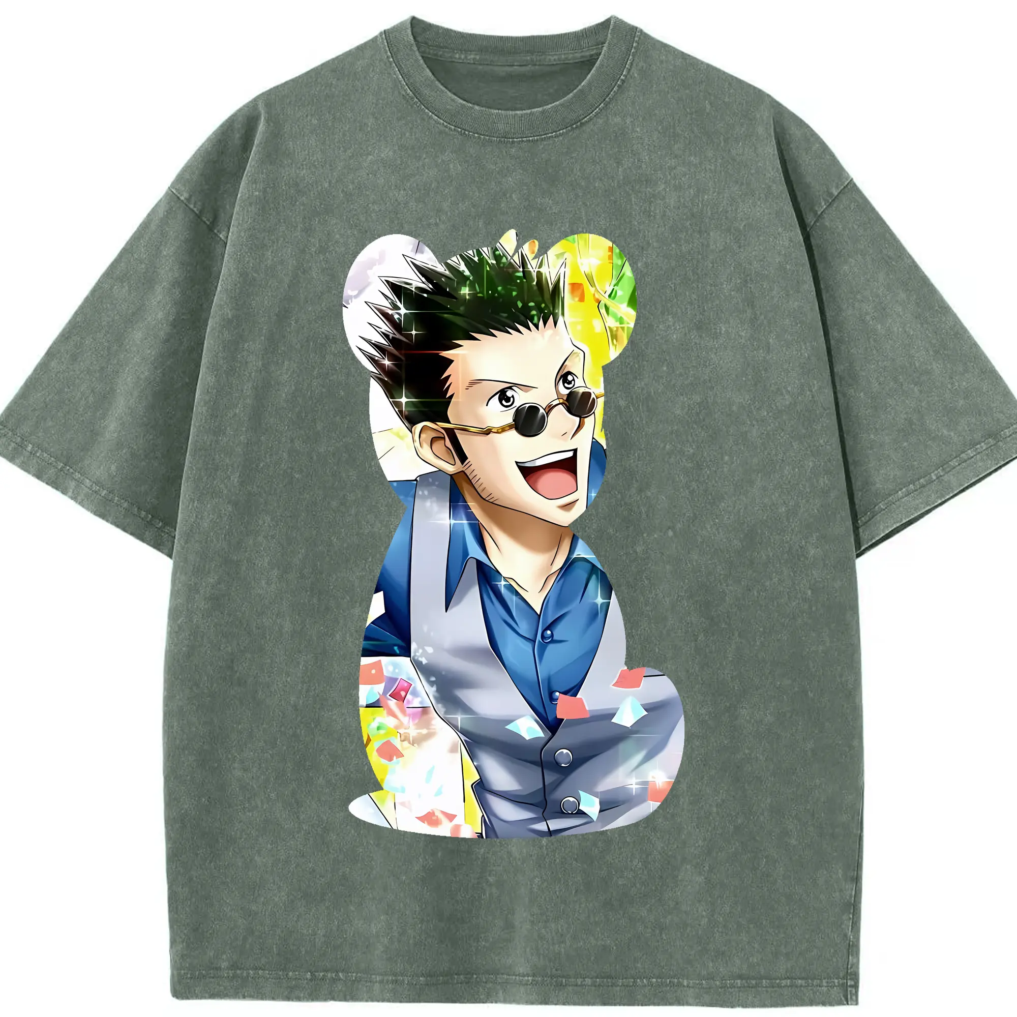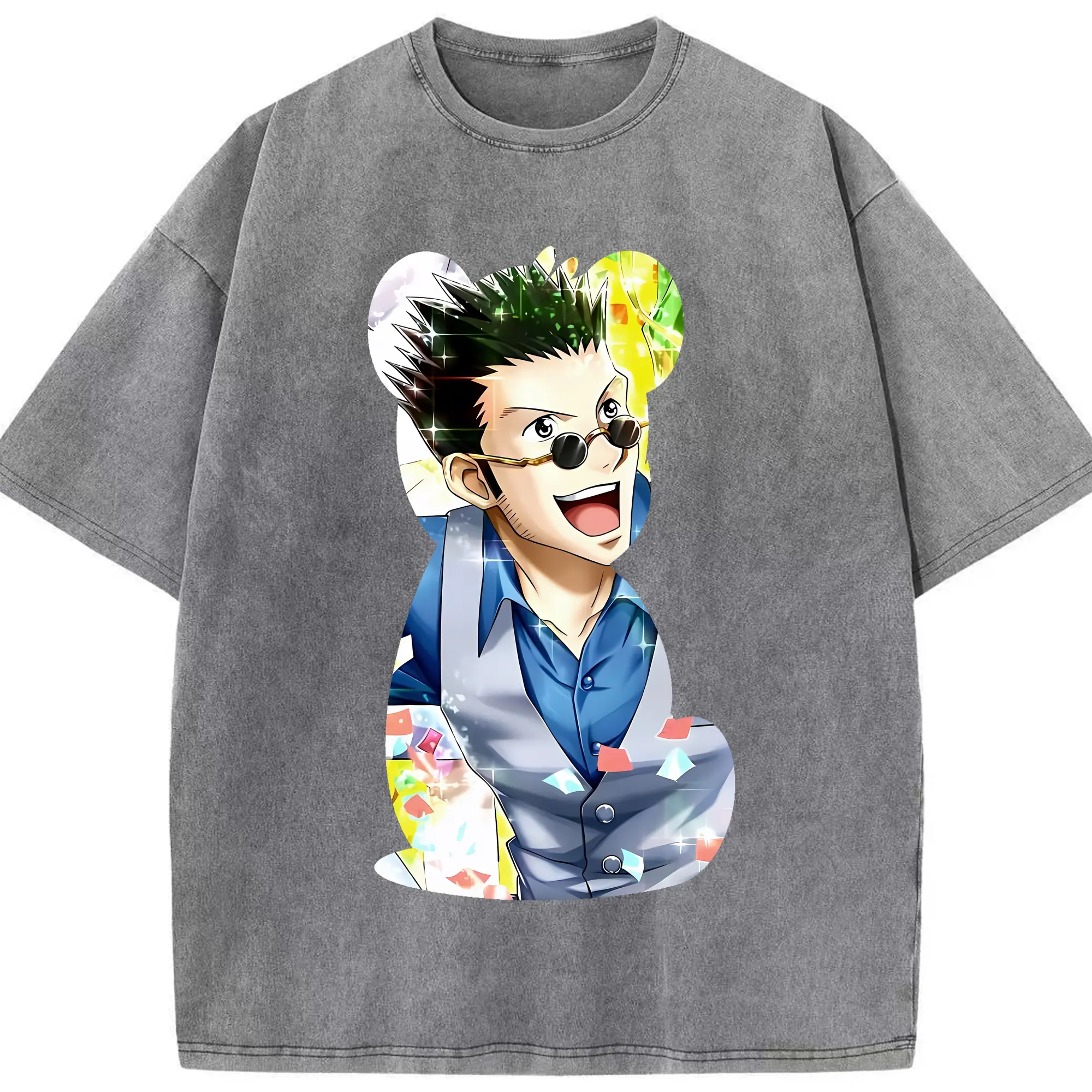 ハンター×ハンター グッズ レオリオ=パラディナイト - 綿100% ヴィンテージ風 半袖Tシャツ ・ 背面プリント ・ 柔らか肌触り ・ 通気性 快適 ・ スポーツ カジュアル 外出用