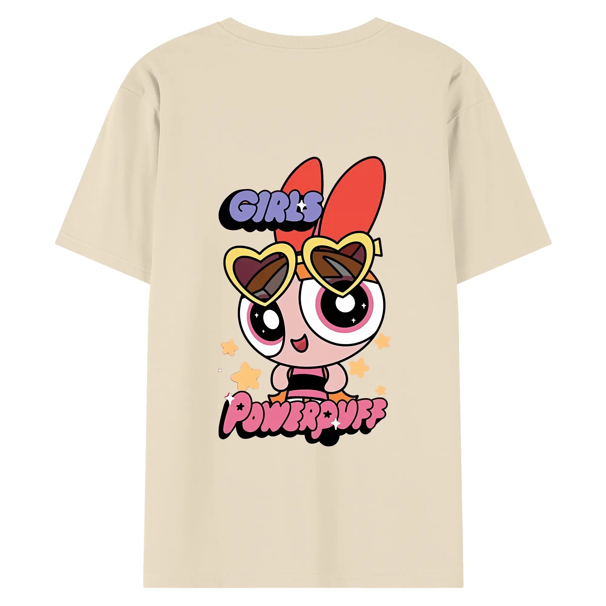 パワパフガールズ グッズ ブロッサム - 綿100% ヴィンテージ風 半袖Tシャツ ・ 背面プリント ・ 柔らか肌触り ・ 通気性 快適 ・ スポーツ カジュアル 外出用