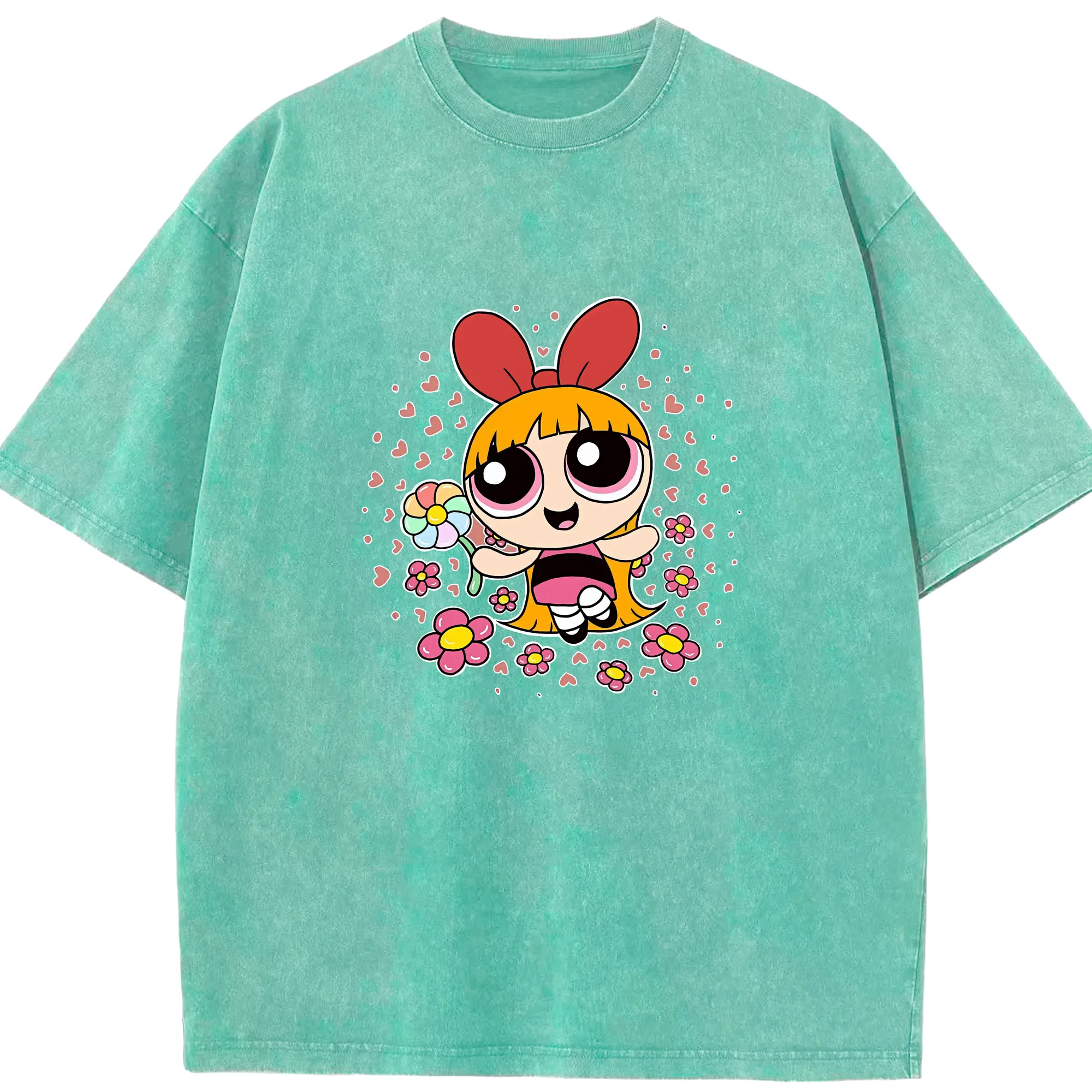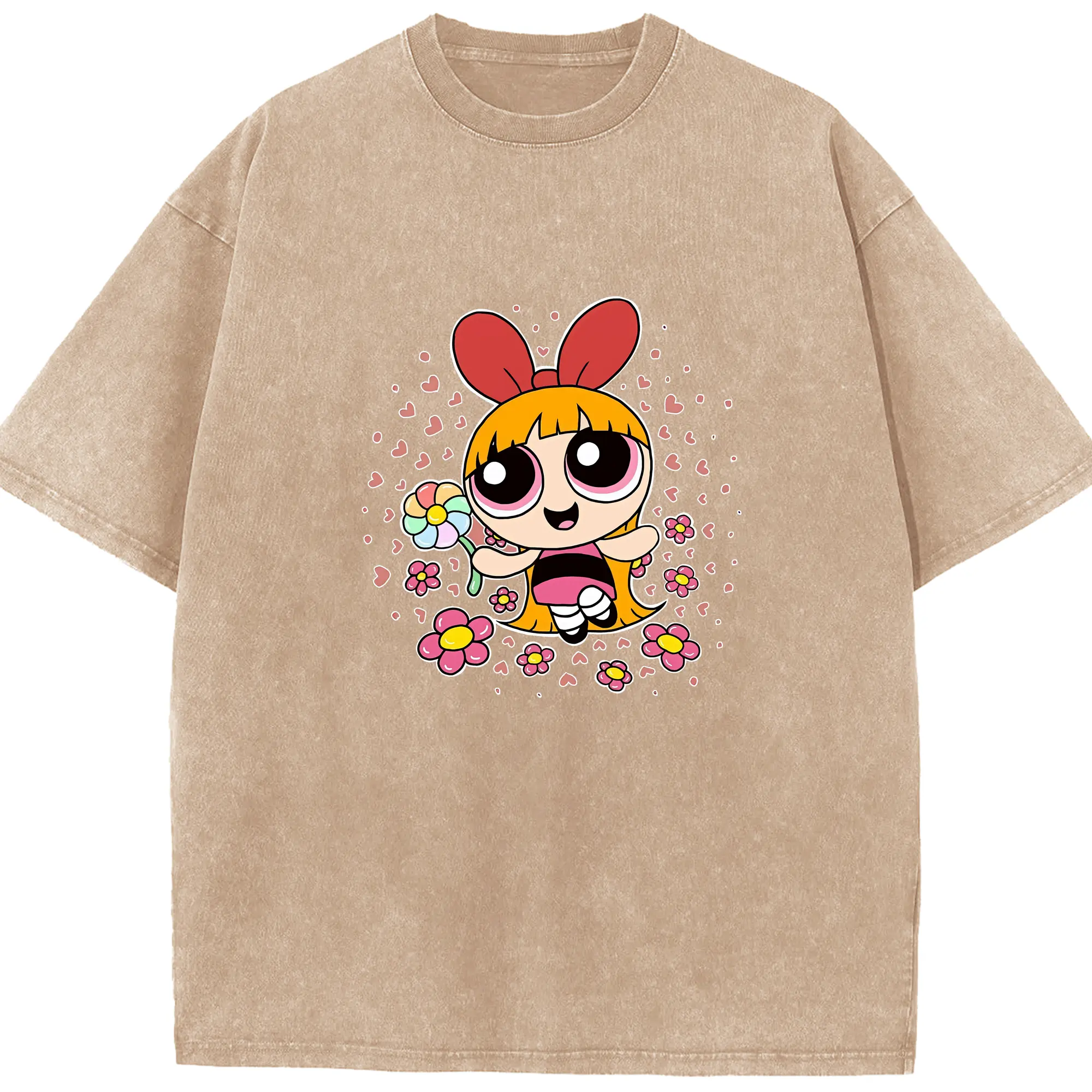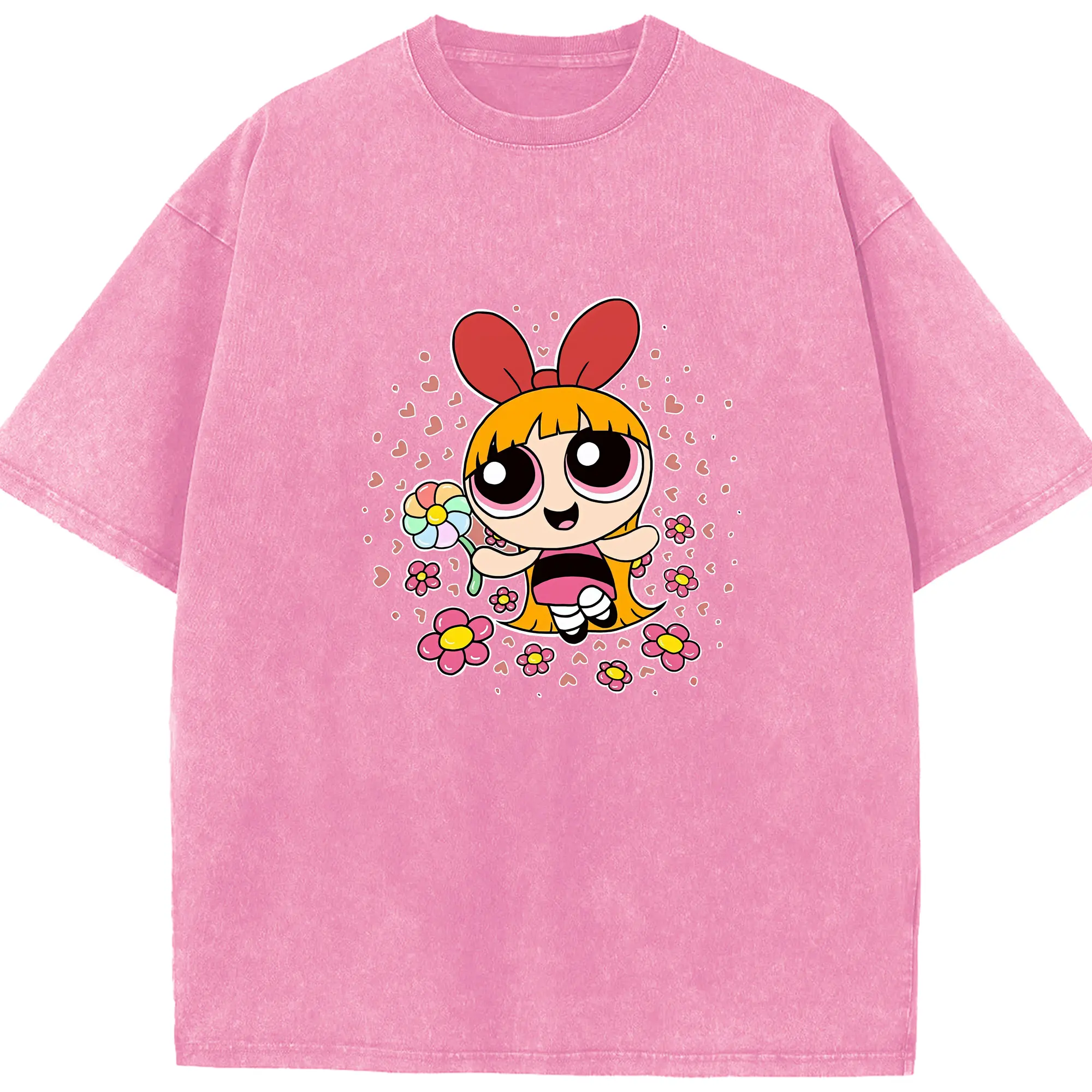 パワパフガールズ グッズ ブロッサム - 綿100% ヴィンテージ風 半袖Tシャツ ・ 背面プリント ・ 柔らか肌触り ・ 通気性 快適 ・ スポーツ カジュアル 外出用