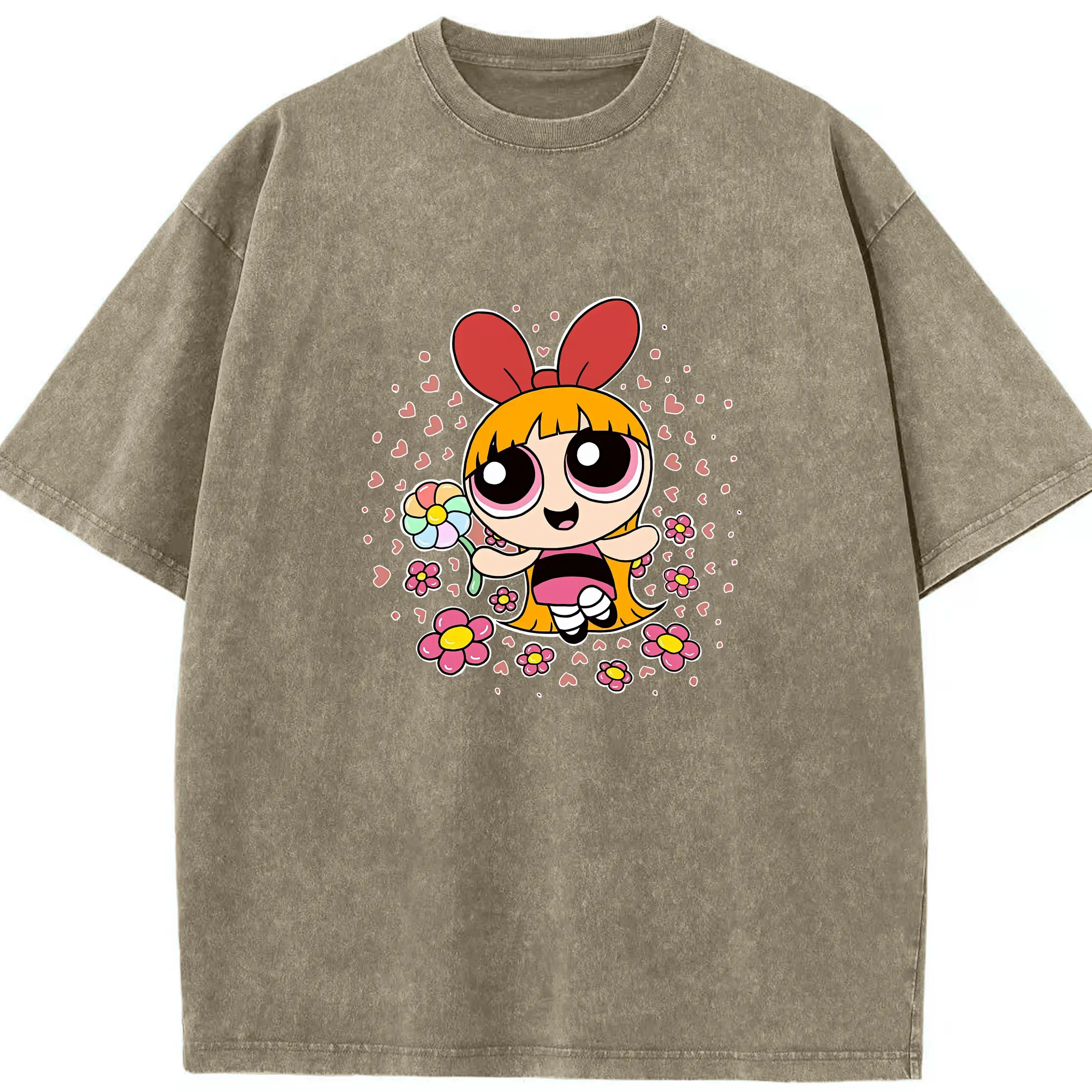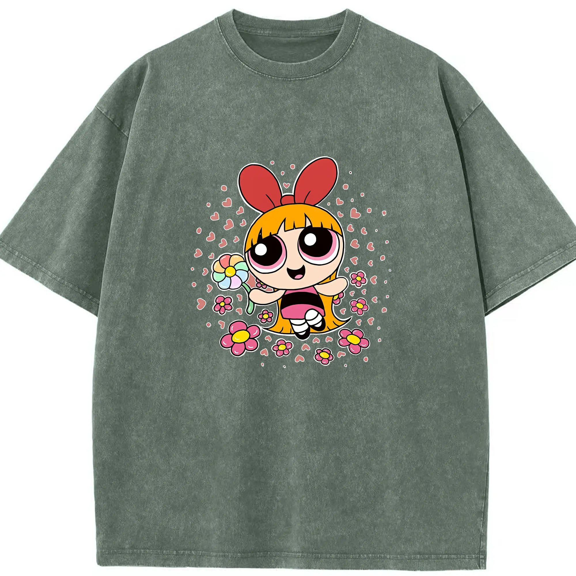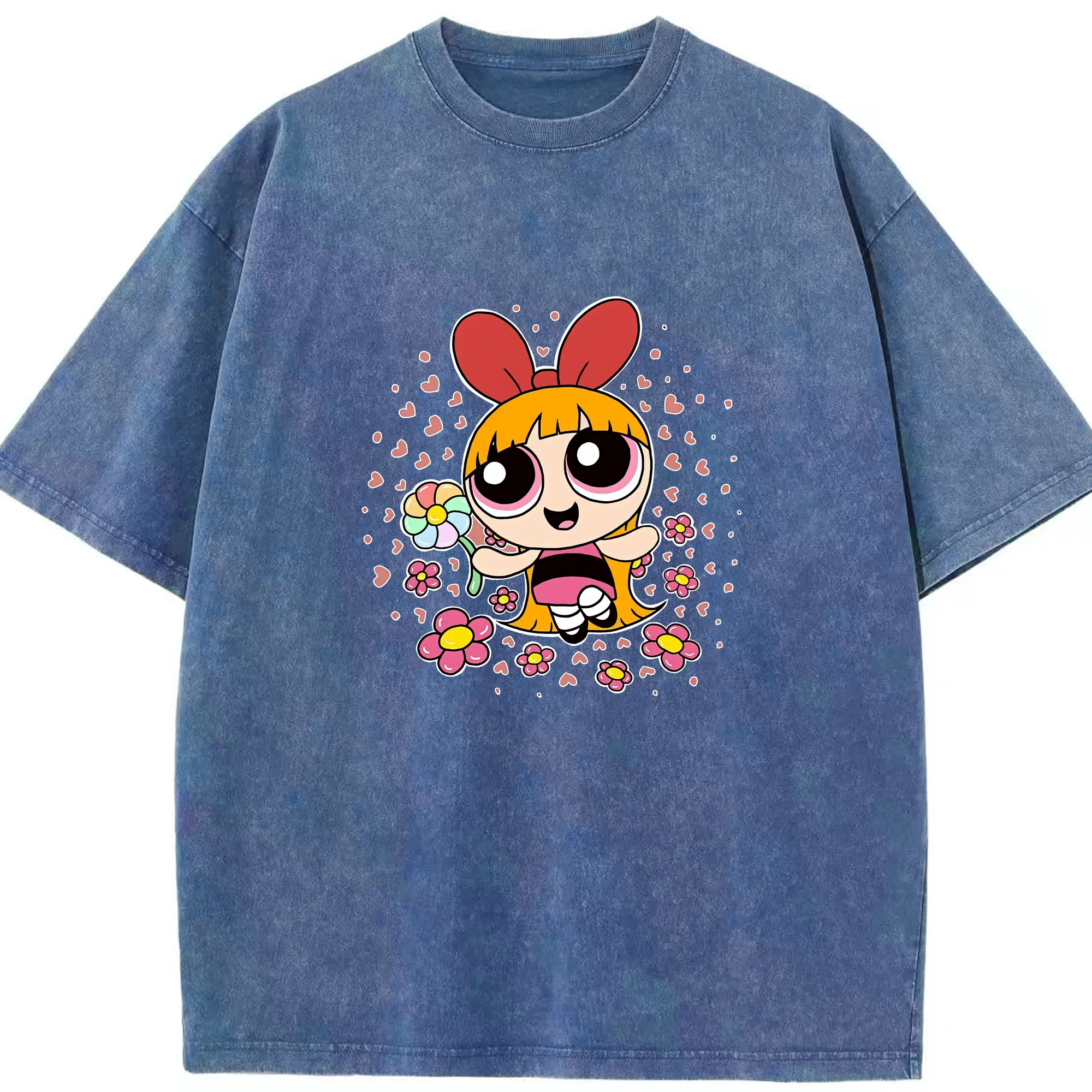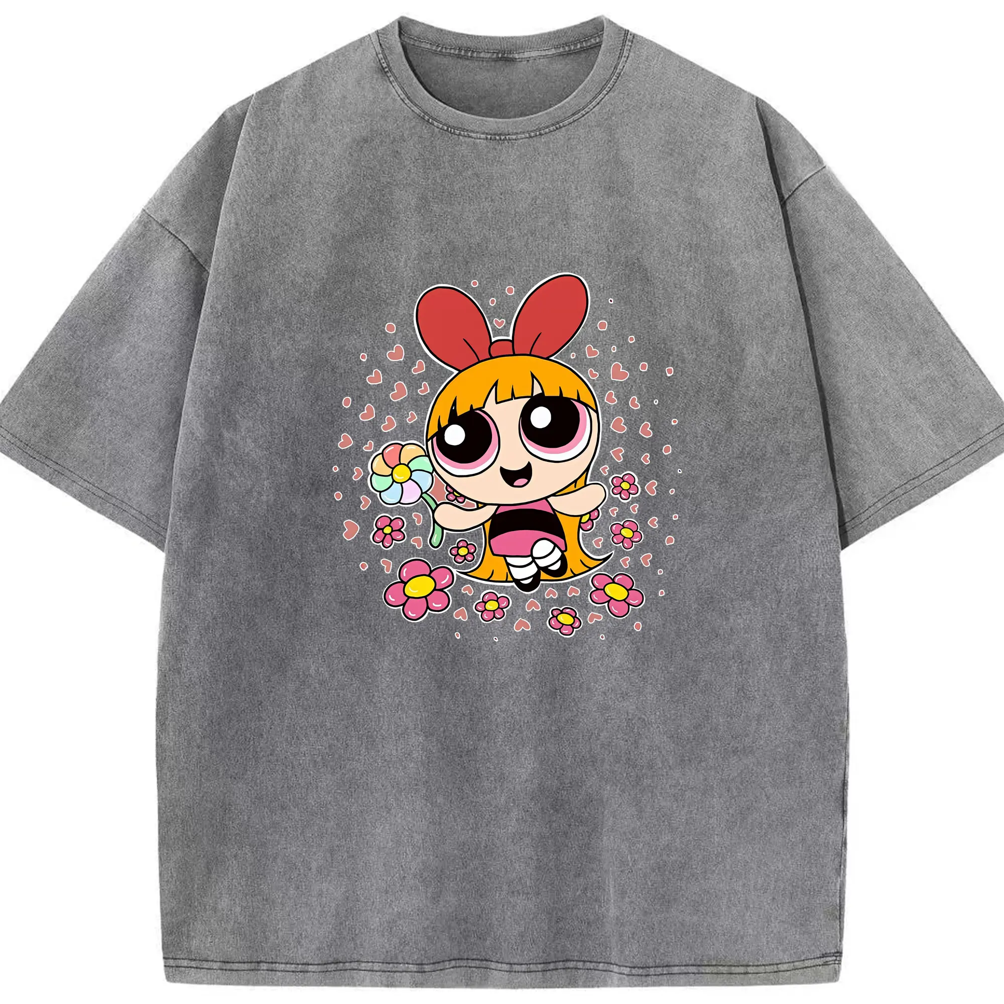 パワパフガールズ グッズ ブロッサム - 綿100% ヴィンテージ風 半袖Tシャツ ・ 背面プリント ・ 柔らか肌触り ・ 通気性 快適 ・ スポーツ カジュアル 外出用