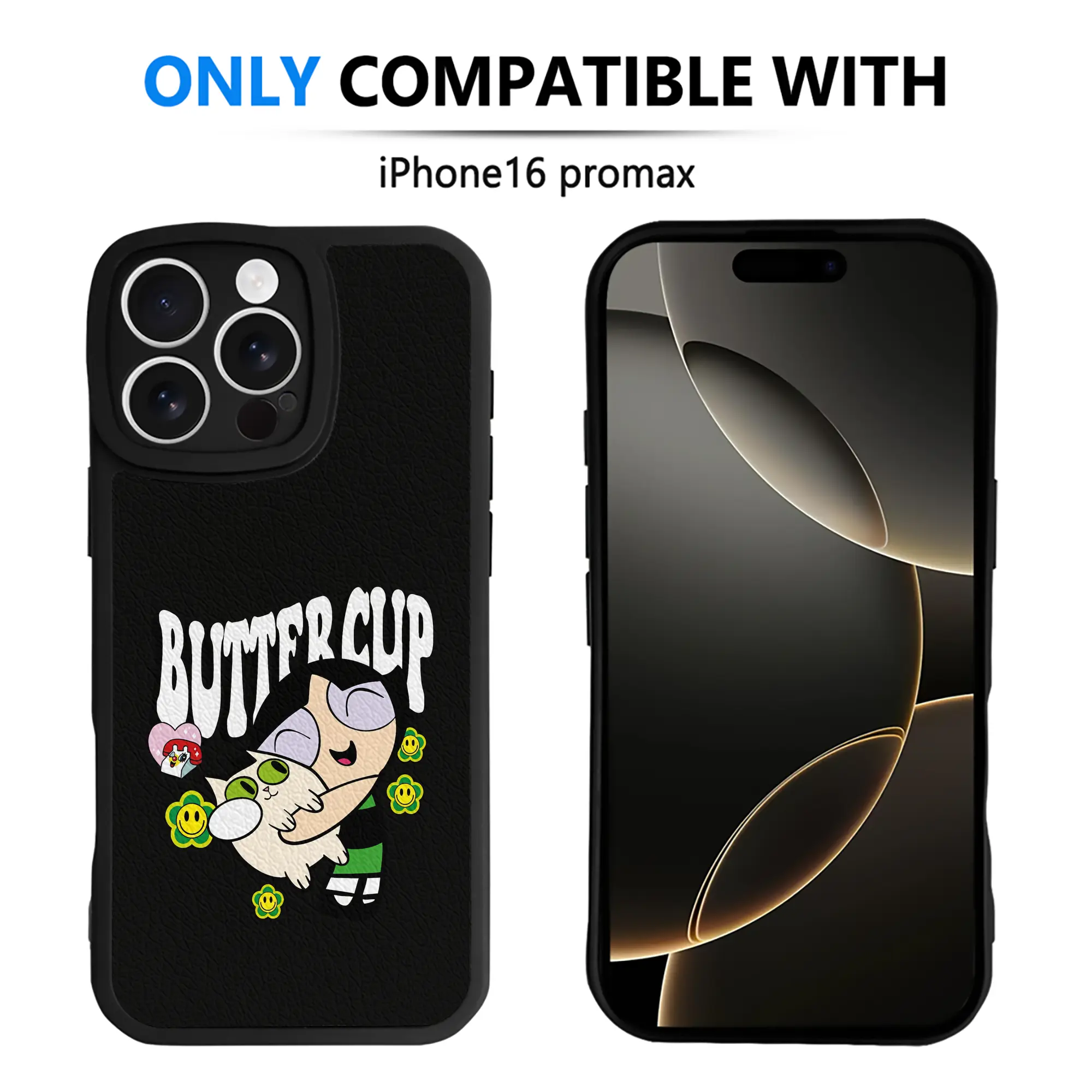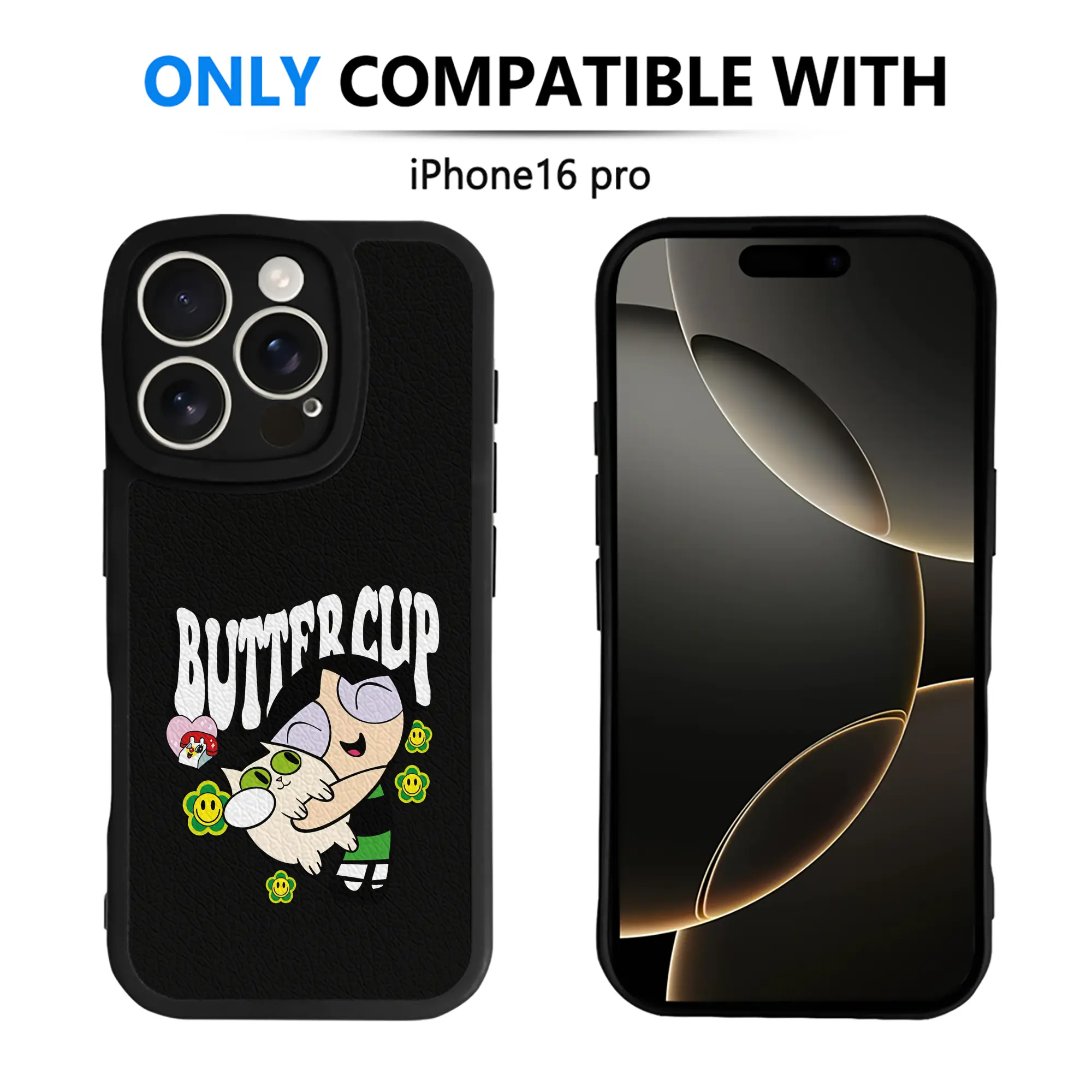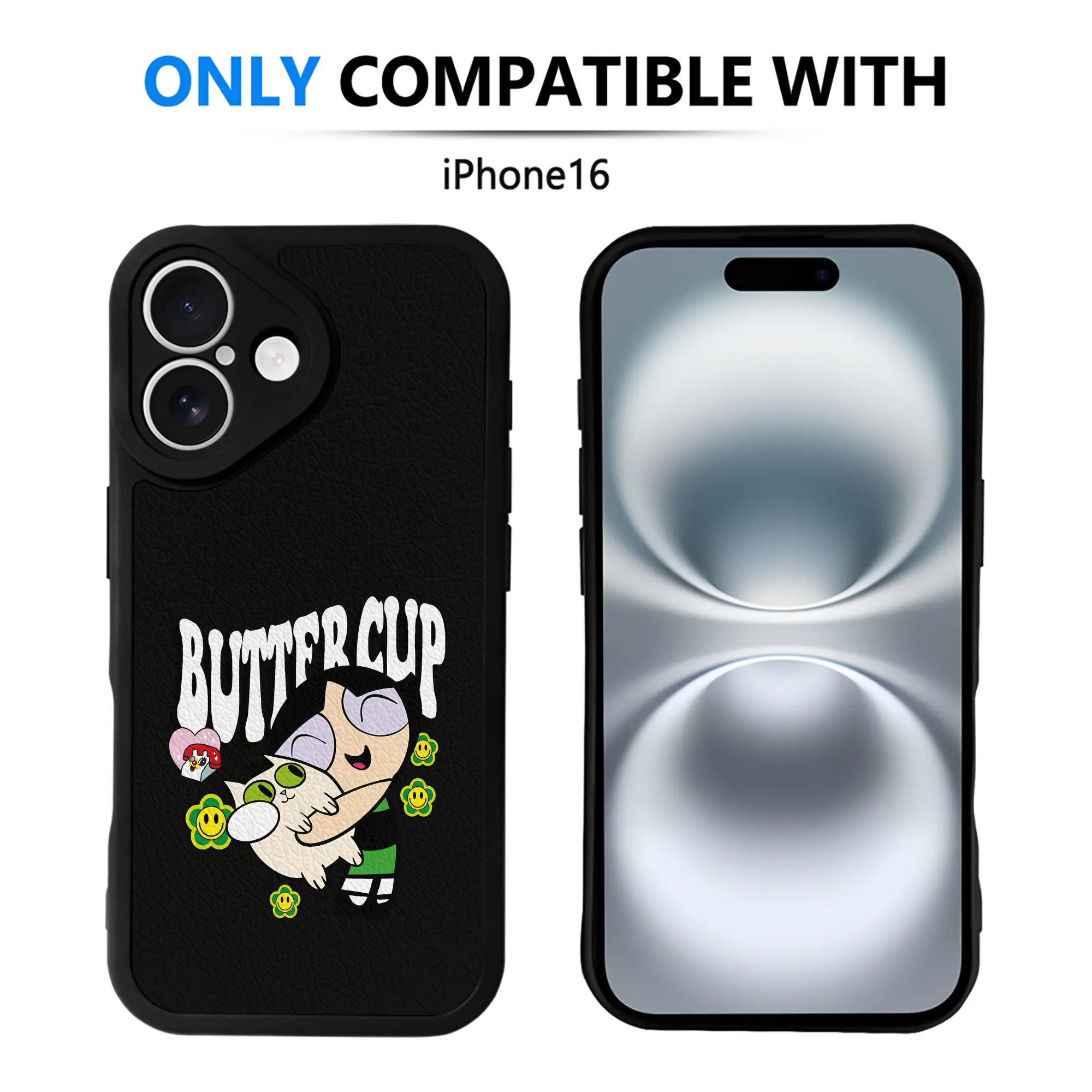 パワパフガールズ グッズ バターカップ - IPhone 16シリーズ対応 ・ シリコンスマホケース ・ レザー調 ・ 高精度フィット ・ 耐衝撃 ・ ワイヤレス充電対応 ・ 精密カット