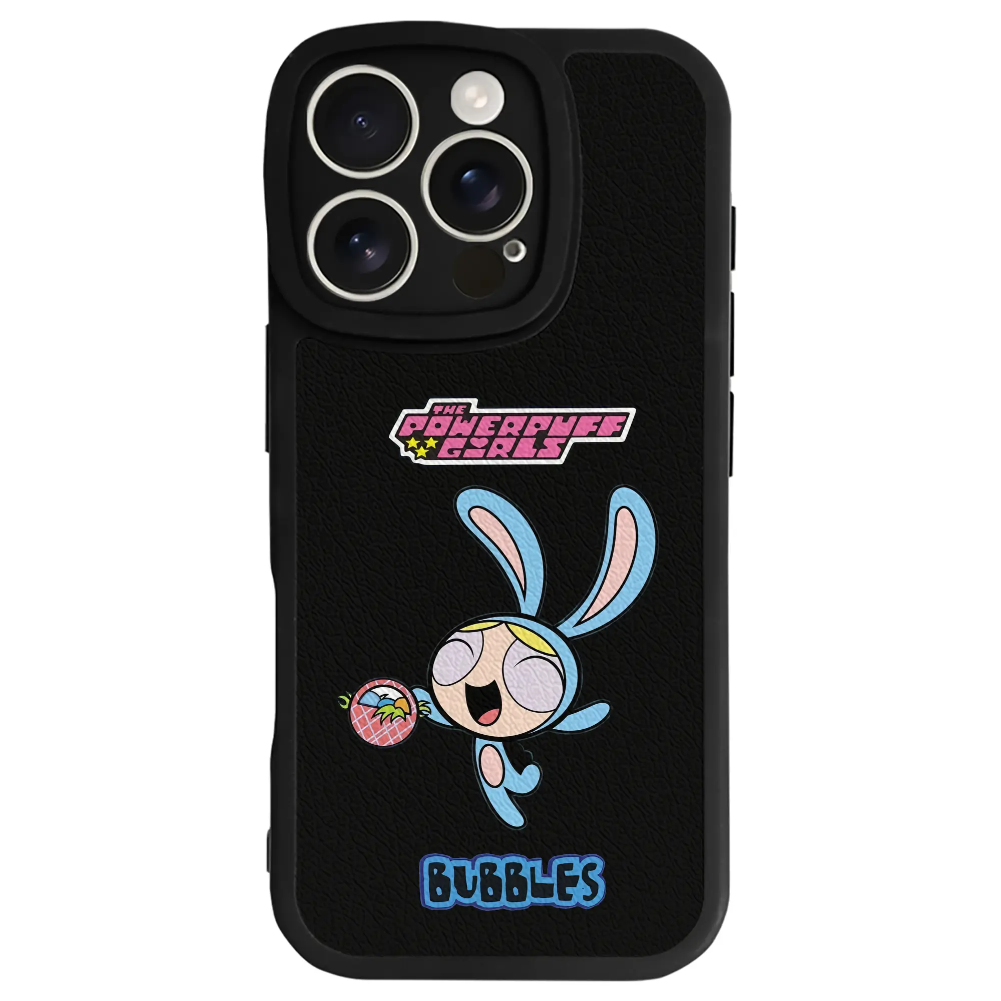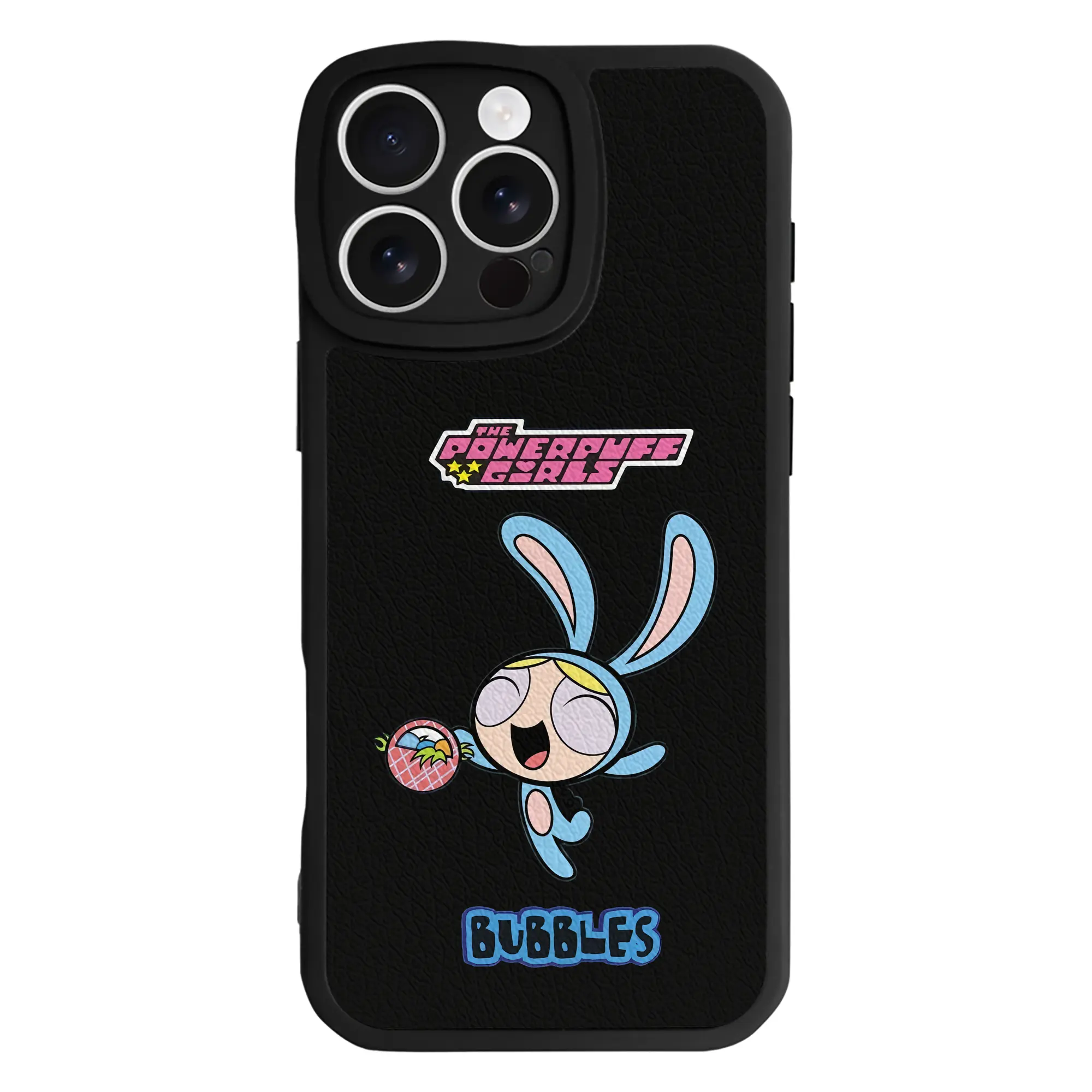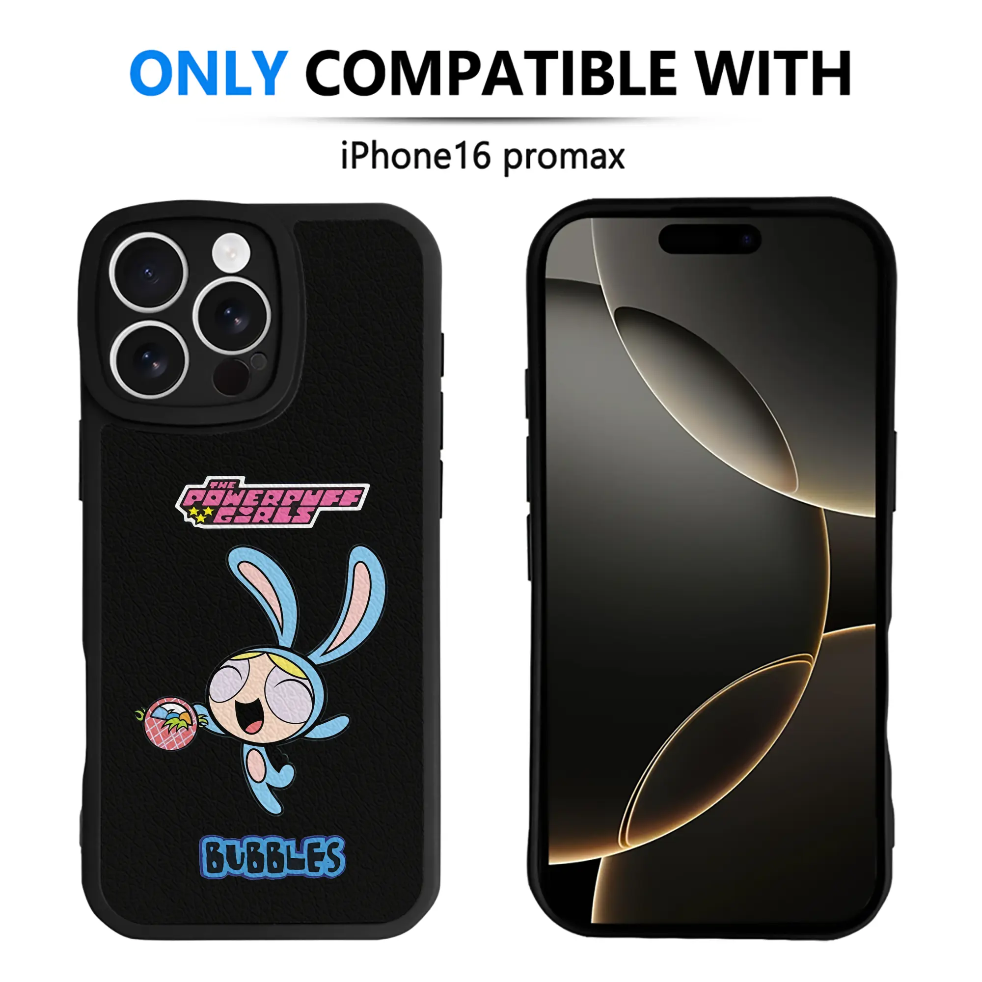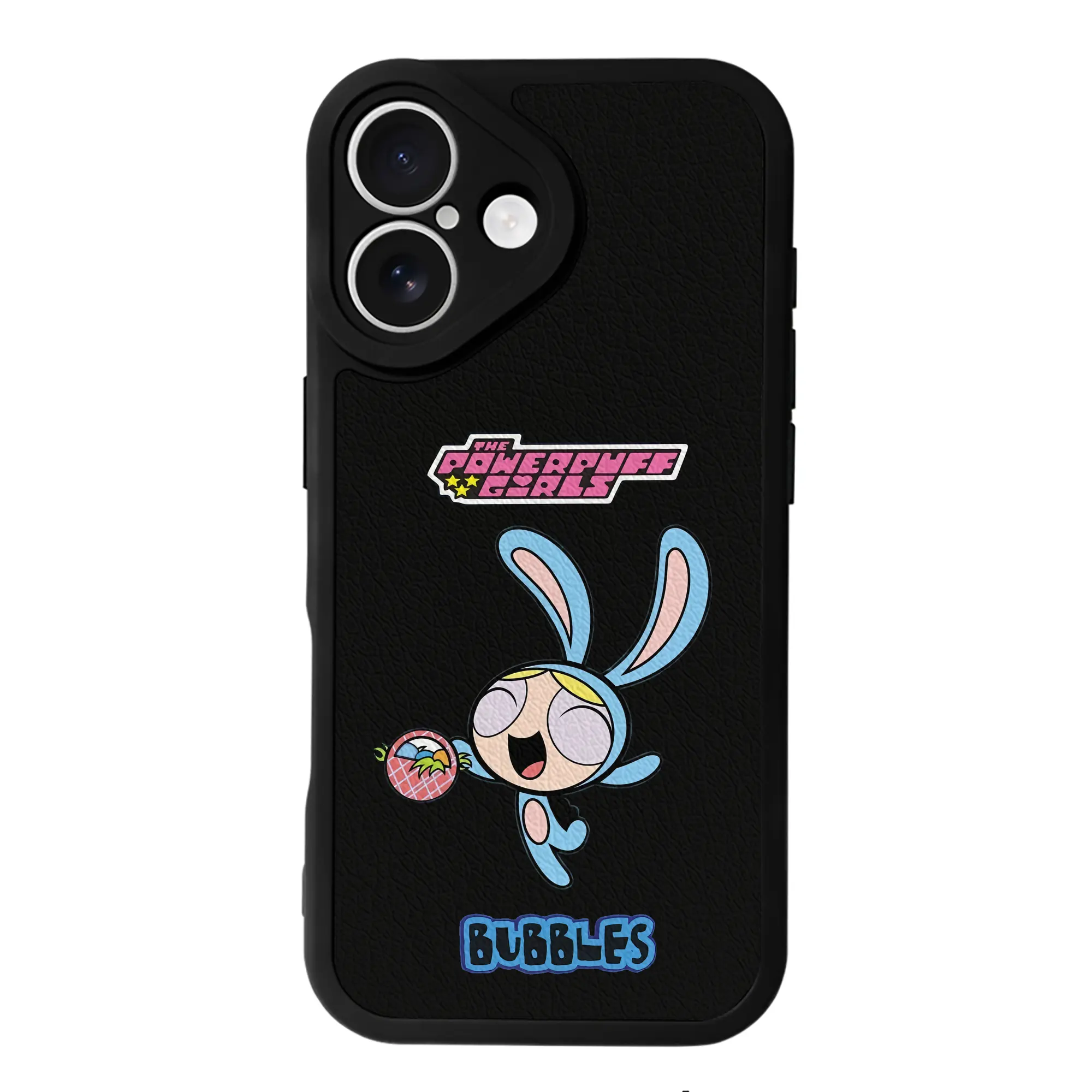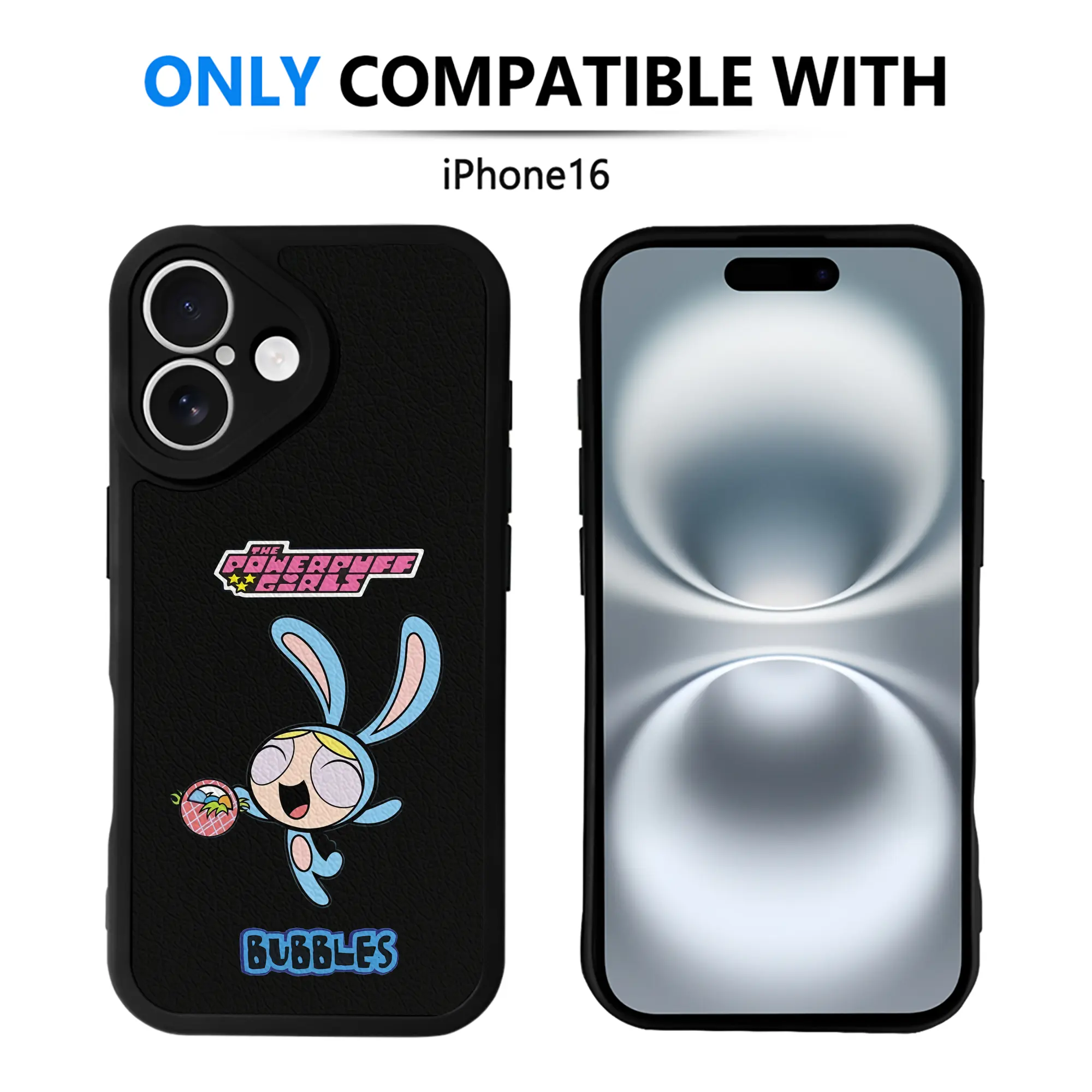 パワパフガールズ グッズ バブルス - IPhone 16シリーズ対応 ・ シリコンスマホケース ・ レザー調 ・ 高精度フィット ・ 耐衝撃 ・ ワイヤレス充電対応 ・ 精密カット