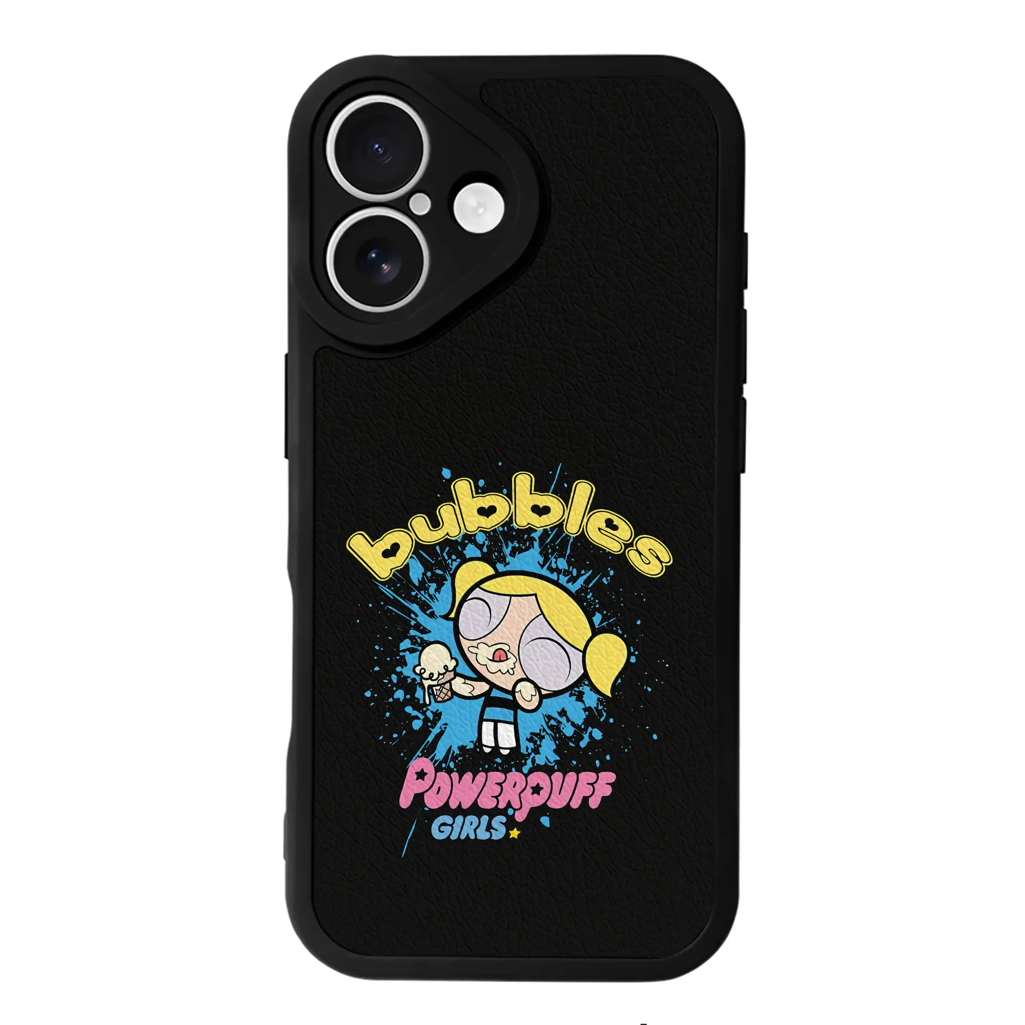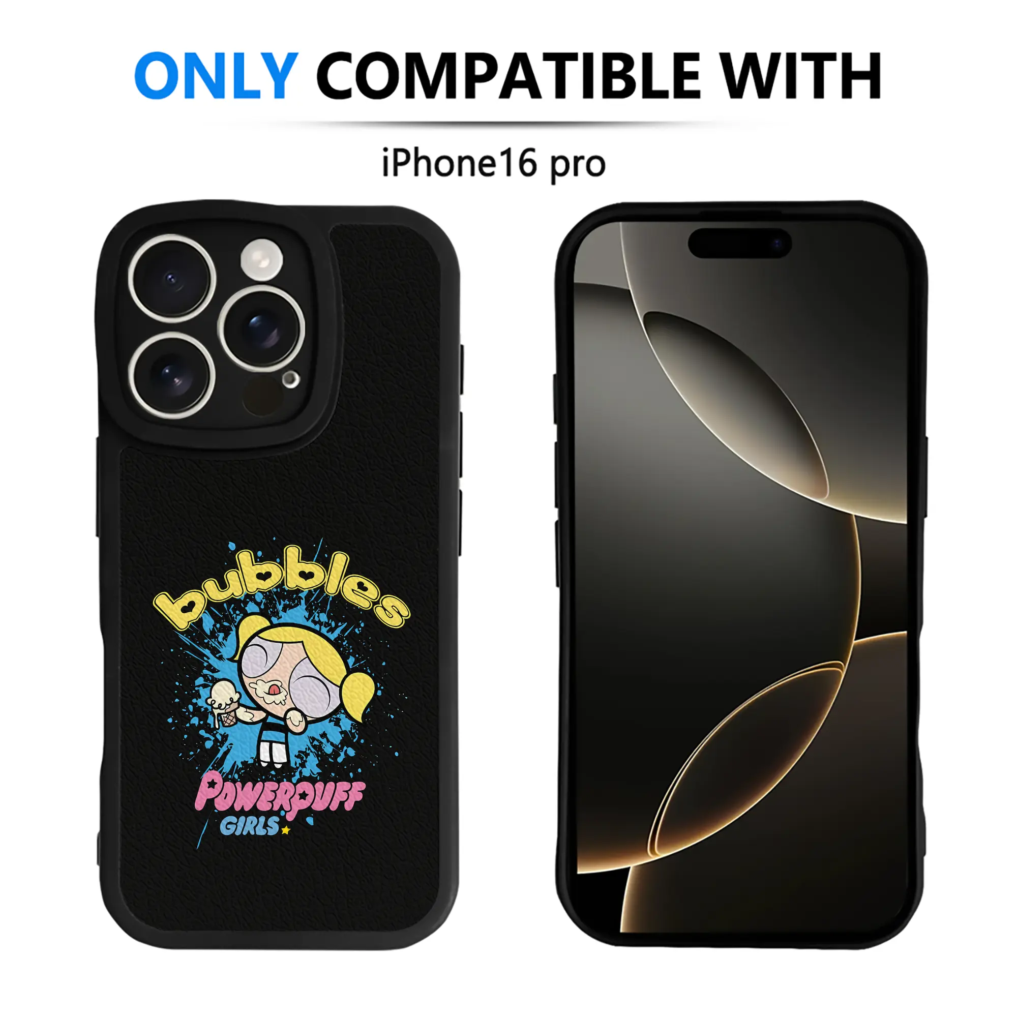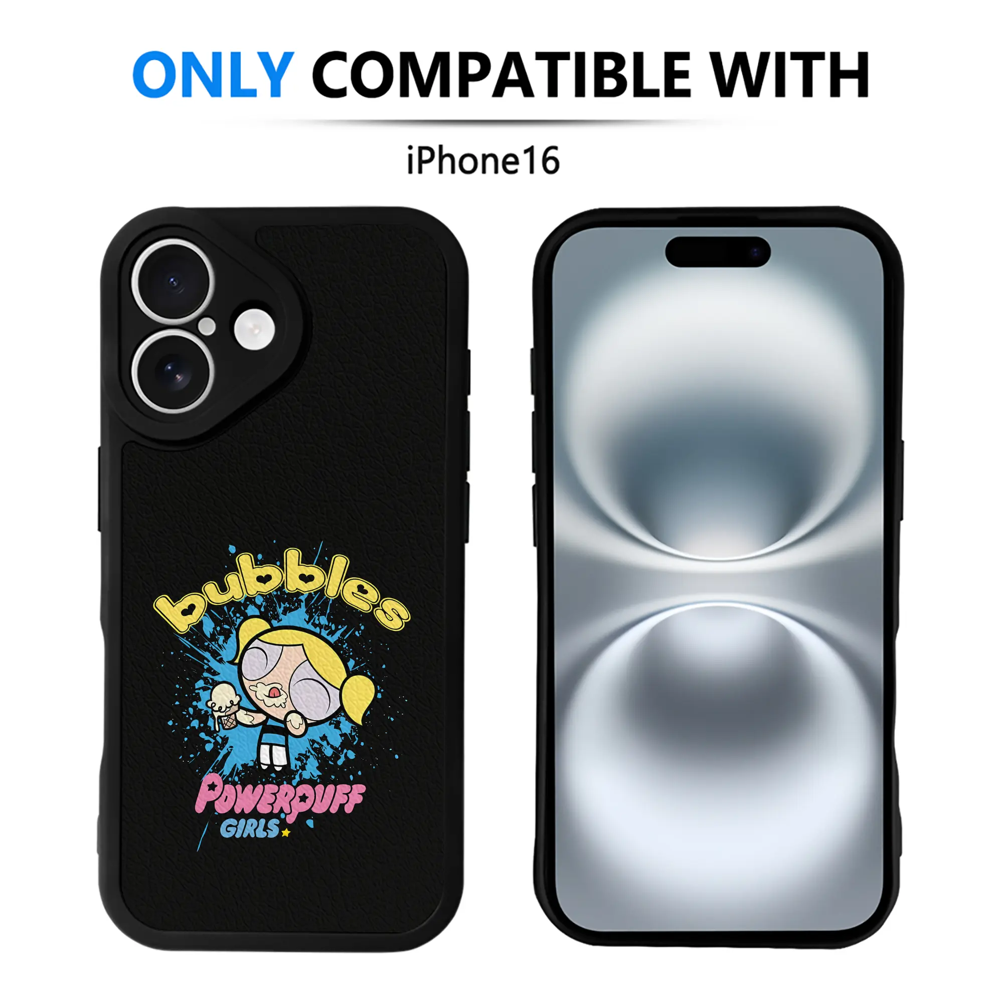 パワパフガールズ グッズ バブルス - IPhone 16シリーズ対応 ・ シリコンスマホケース ・ レザー調 ・ 高精度フィット ・ 耐衝撃 ・ ワイヤレス充電対応 ・ 精密カット