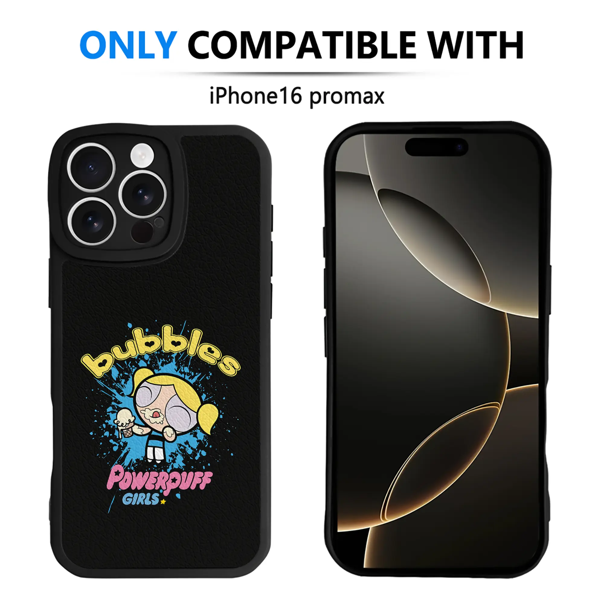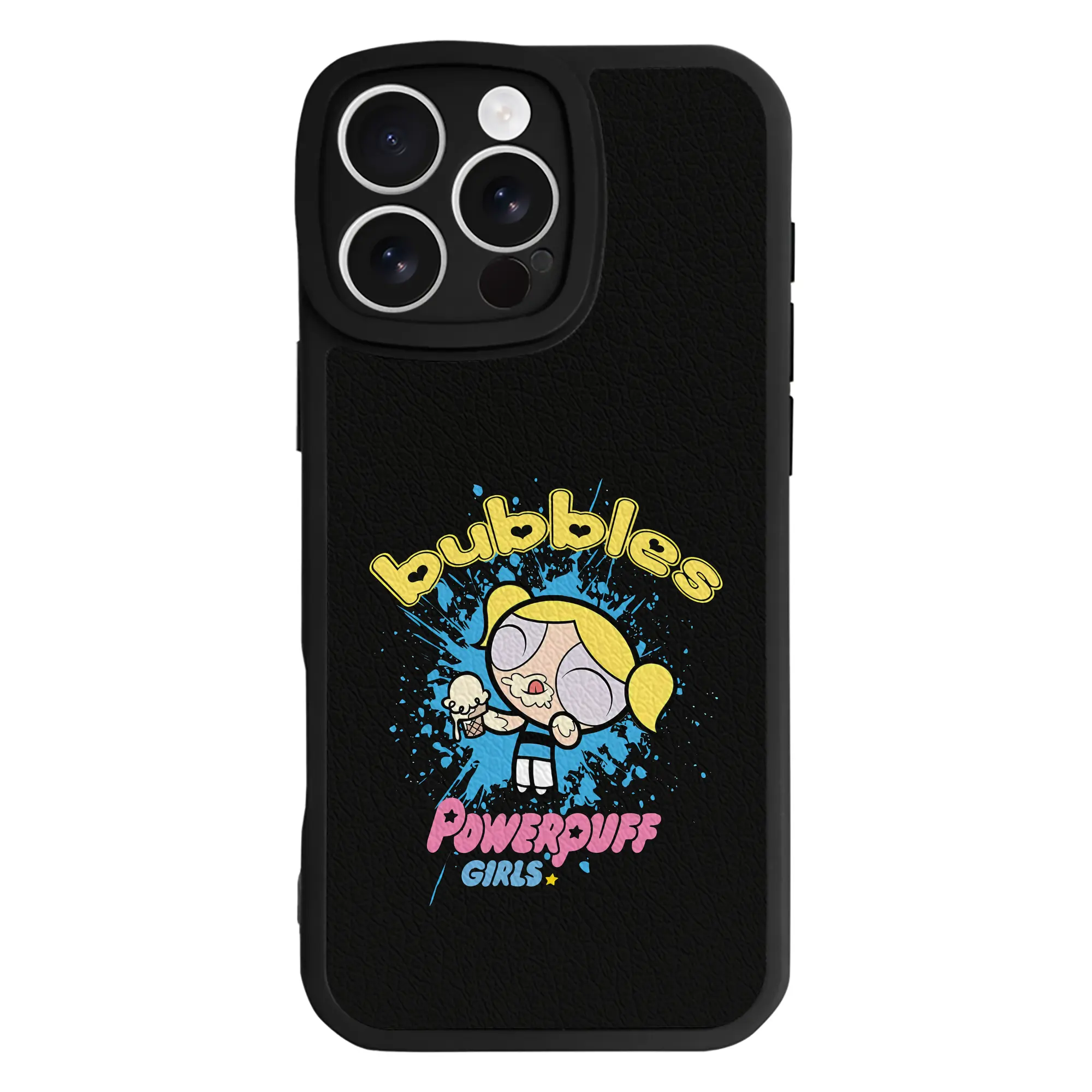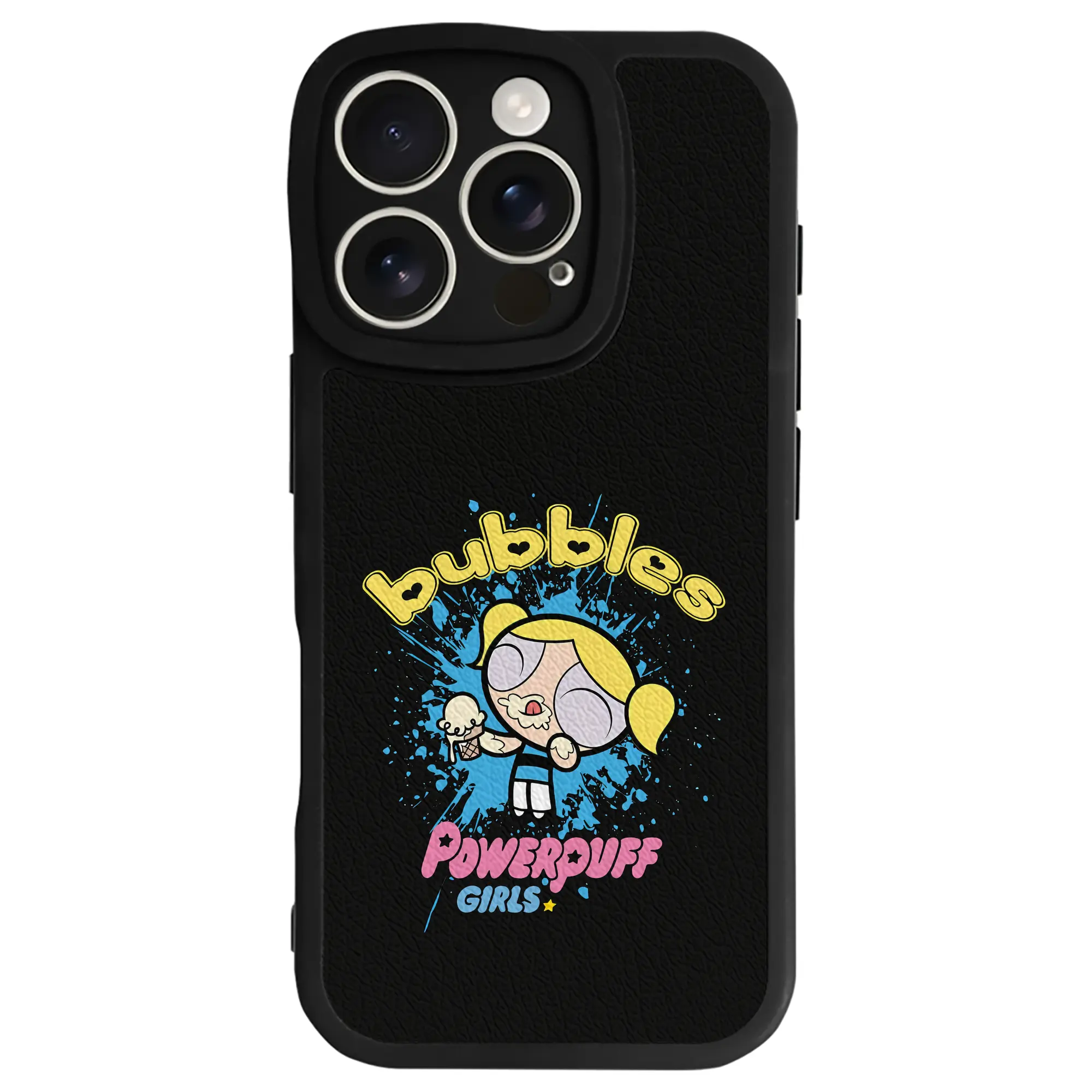 パワパフガールズ グッズ バブルス - IPhone 16シリーズ対応 ・ シリコンスマホケース ・ レザー調 ・ 高精度フィット ・ 耐衝撃 ・ ワイヤレス充電対応 ・ 精密カット