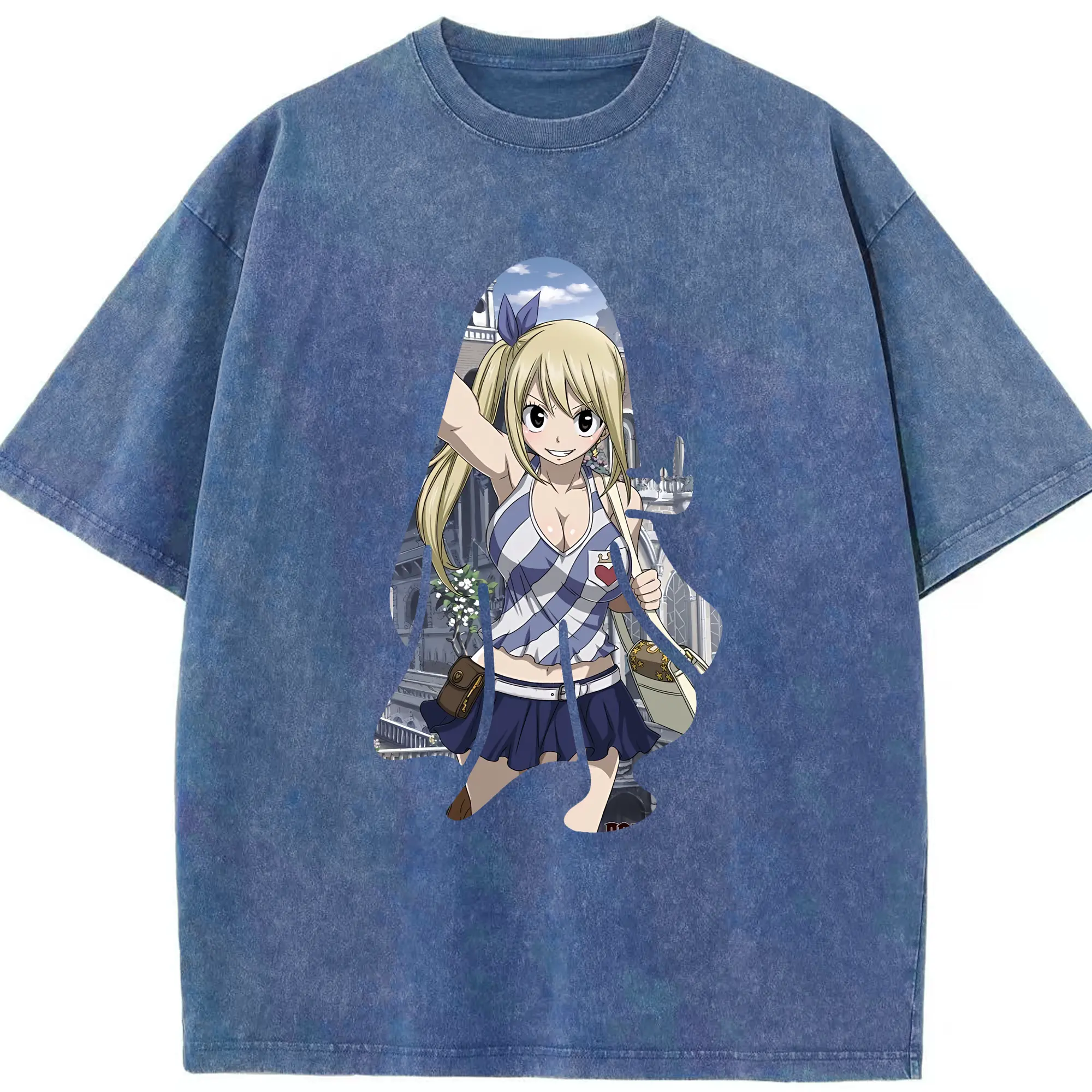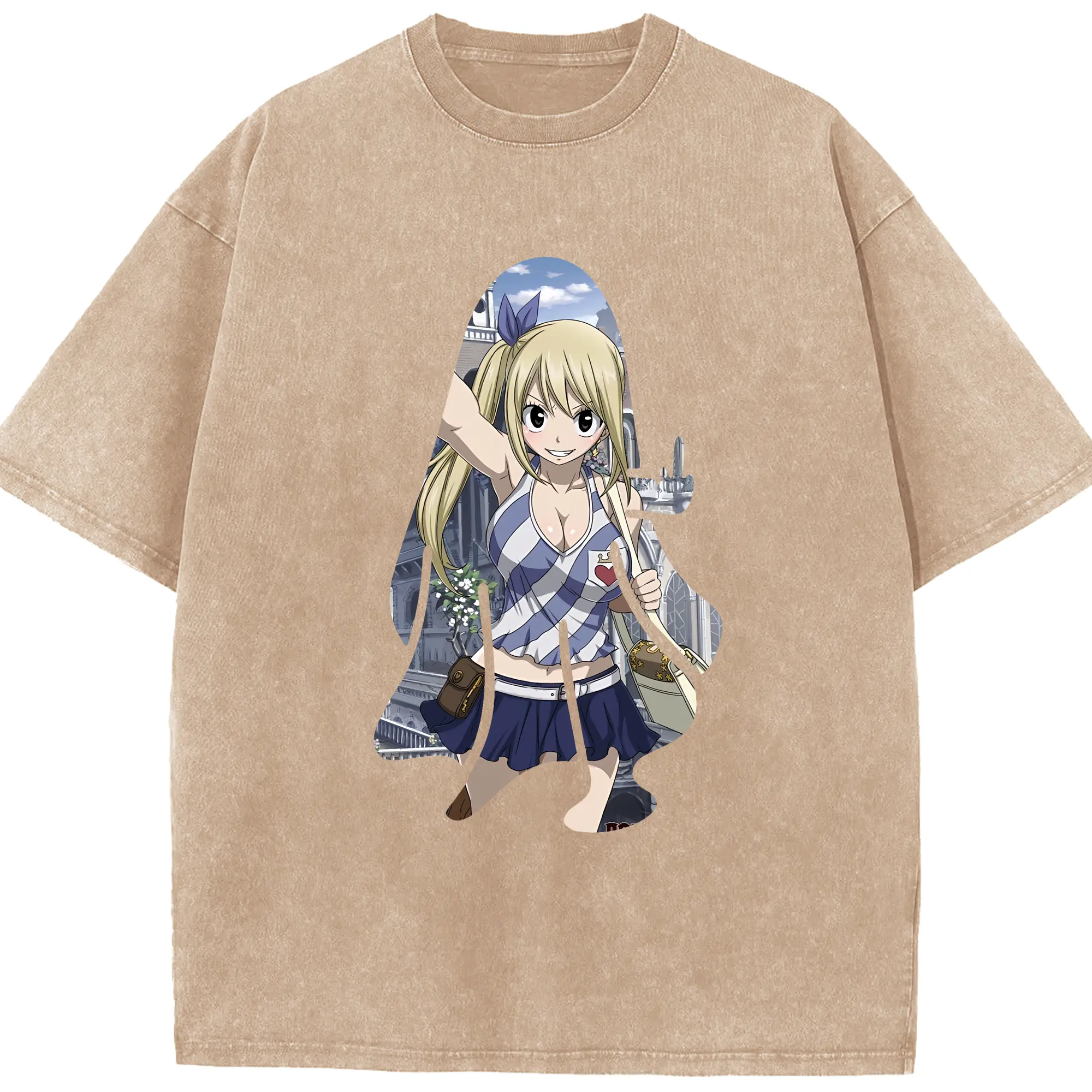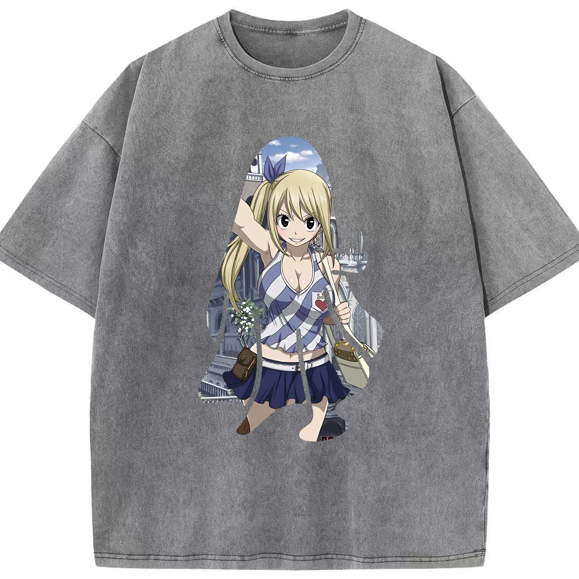 フェアリーテイル グッズ ルーシィ・ハートフィリア - 綿100% ヴィンテージ風 半袖Tシャツ ・ 背面プリント ・ 柔らか肌触り ・ 通気性 快適 ・ スポーツ カジュアル 外出用