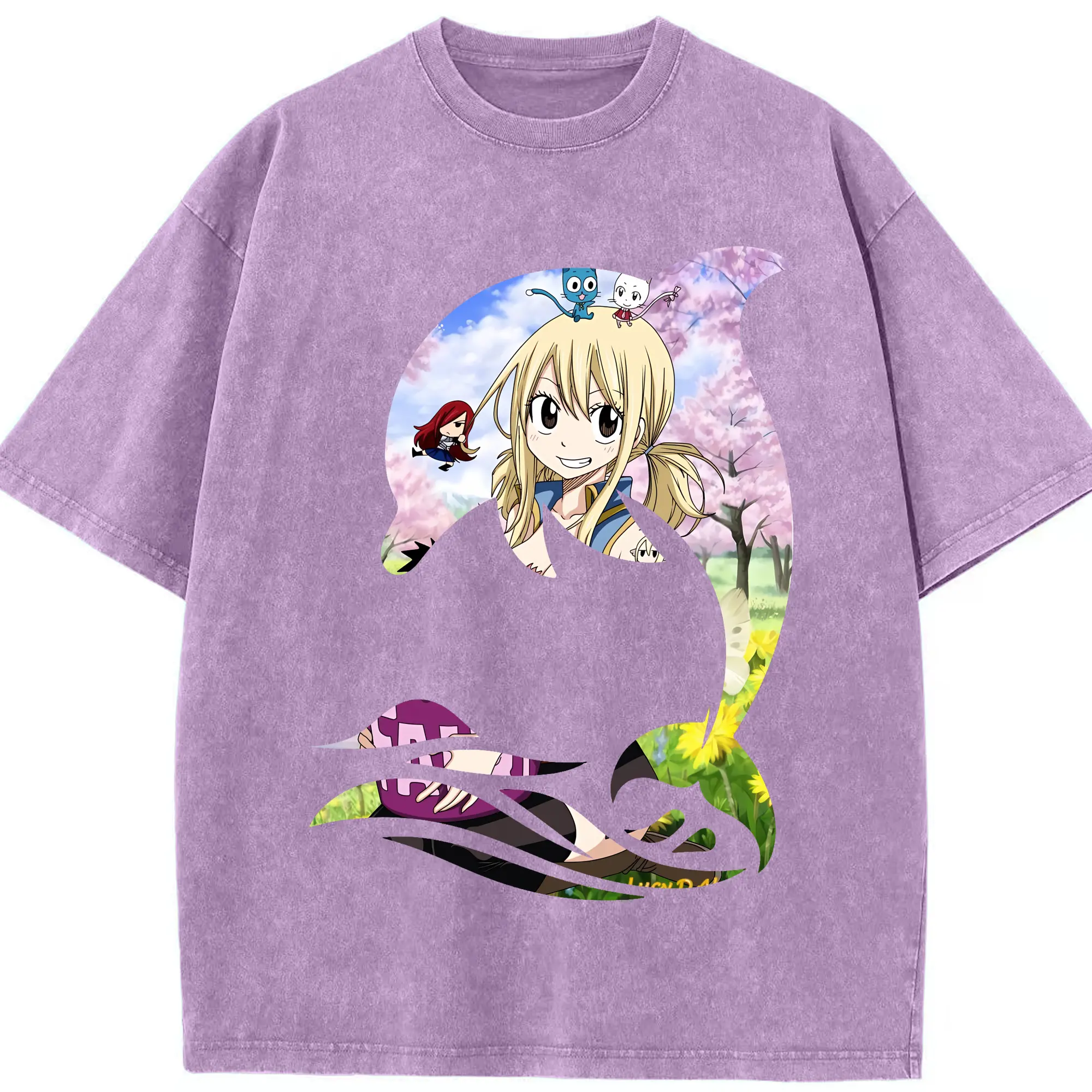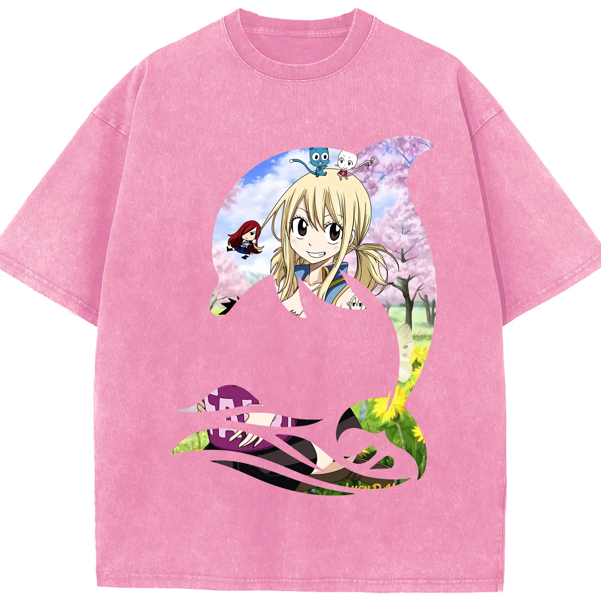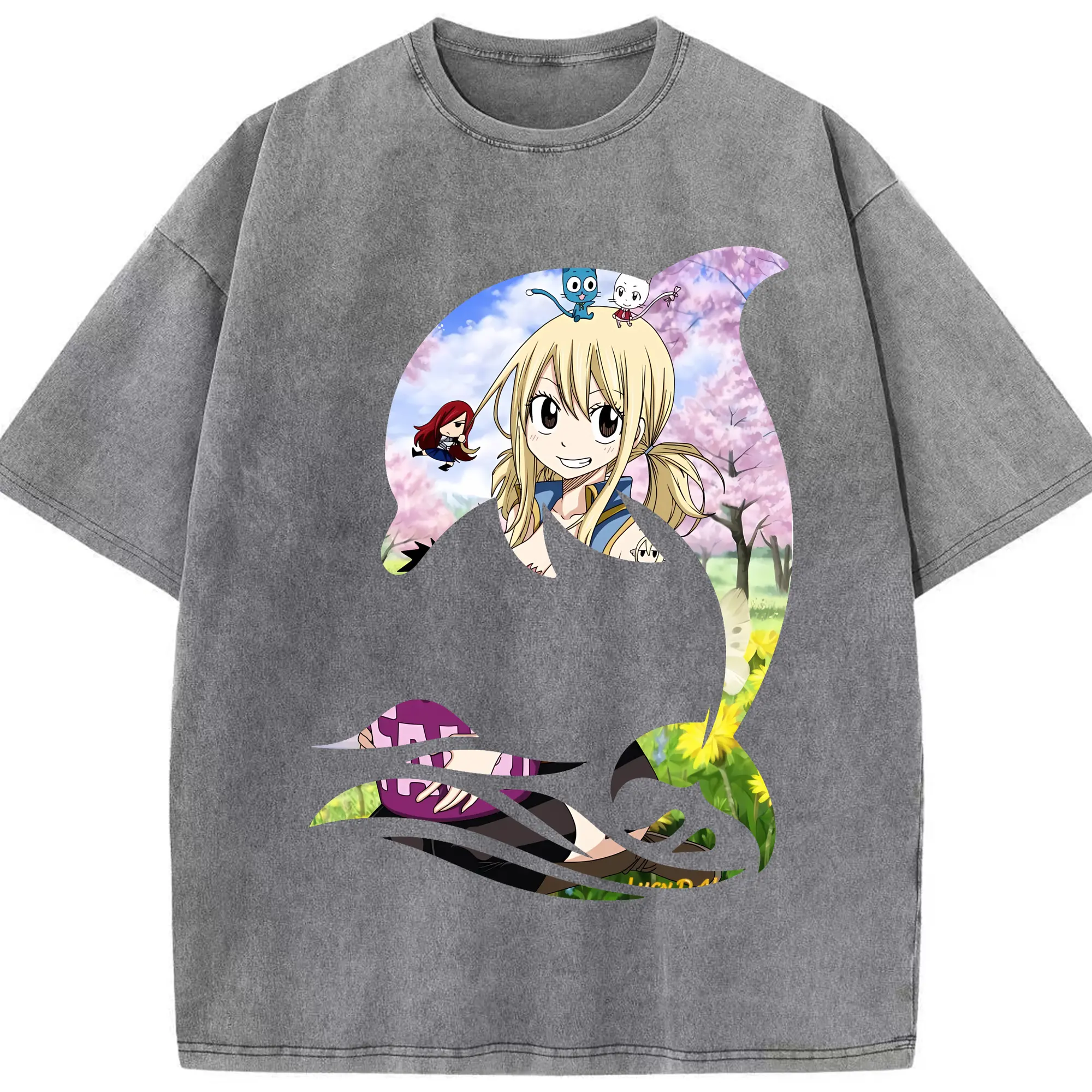 フェアリーテイル グッズ ルーシィ・ハートフィリア - 綿100% ヴィンテージ風 半袖Tシャツ ・ 背面プリント ・ 柔らか肌触り ・ 通気性 快適 ・ スポーツ カジュアル 外出用