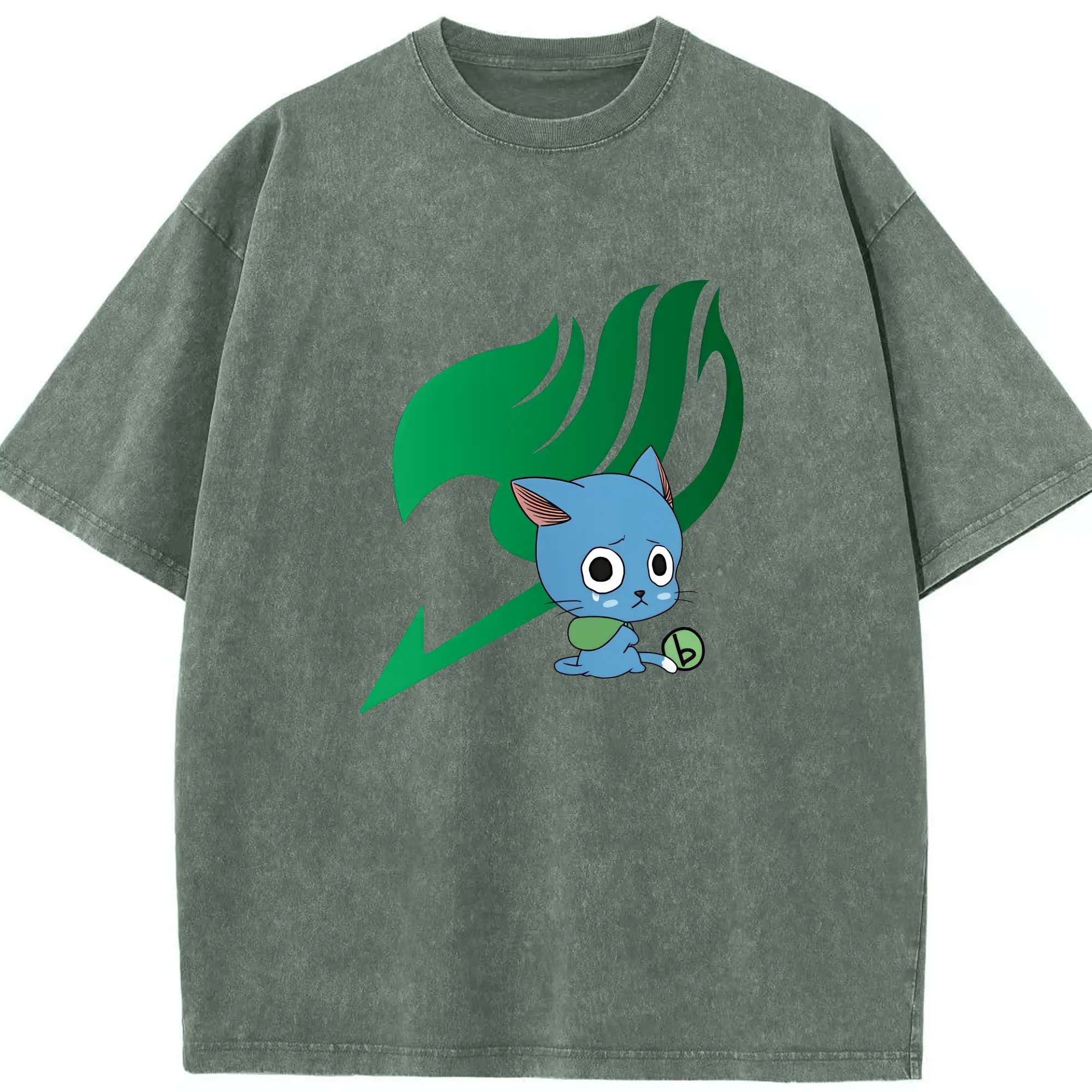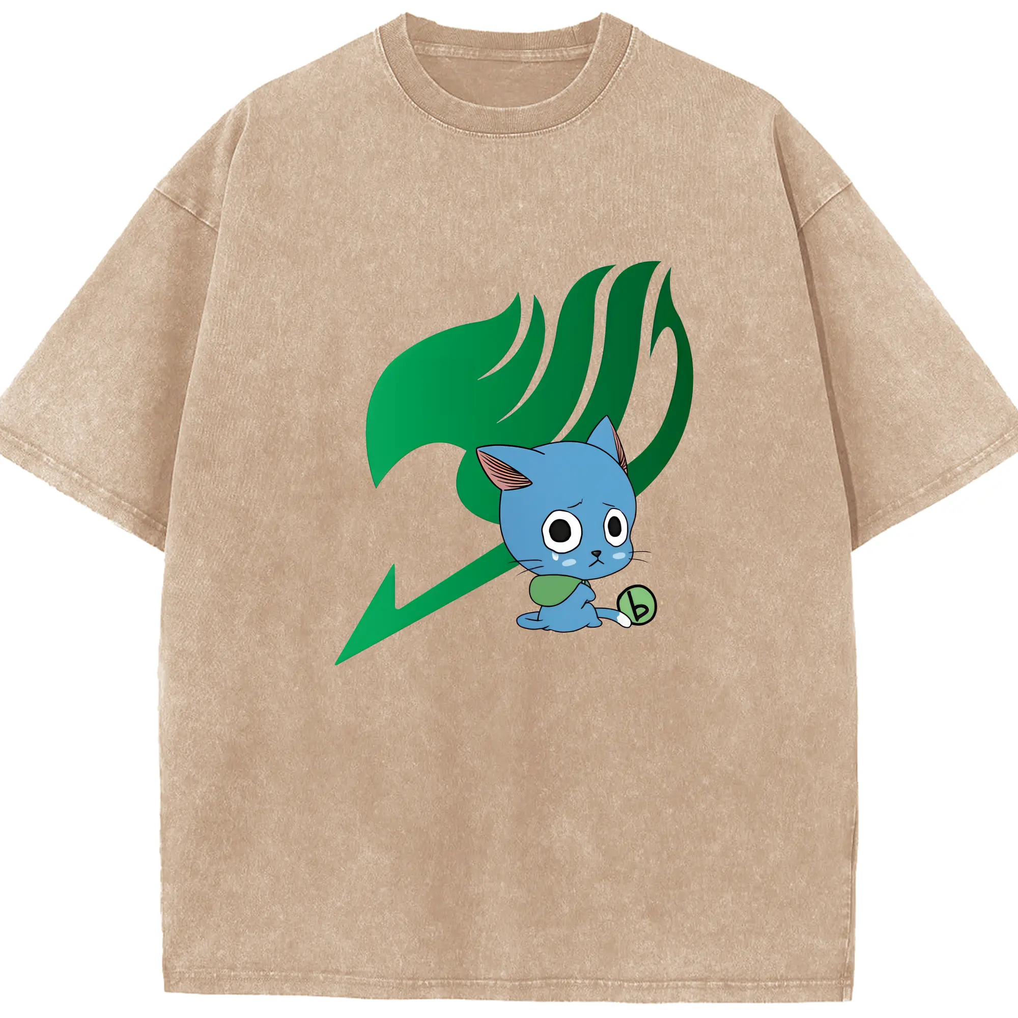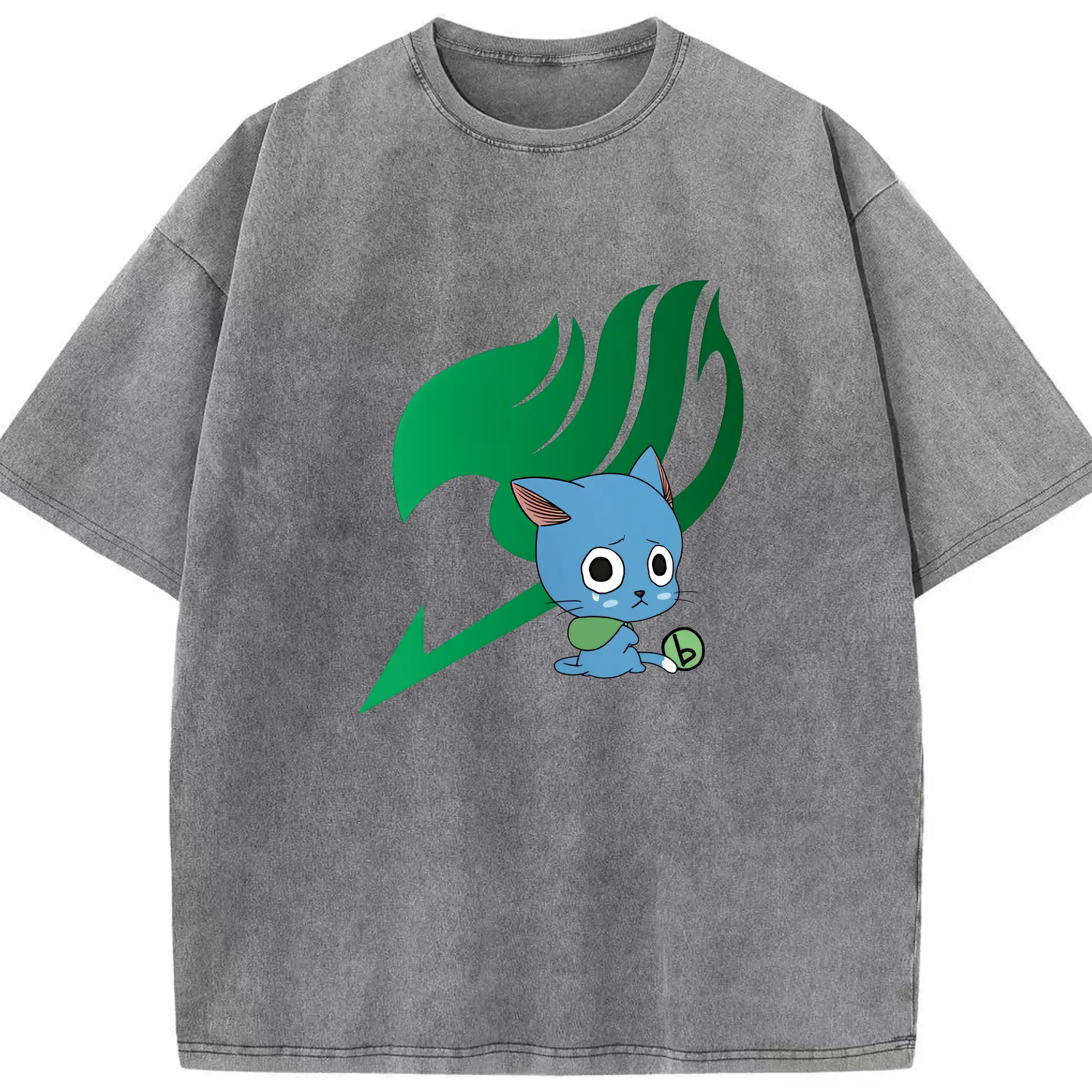 フェアリーテイル グッズ ハッピー - 綿100% ヴィンテージ風 半袖Tシャツ ・ 背面プリント ・ 柔らか肌触り ・ 通気性 快適 ・ スポーツ カジュアル 外出用