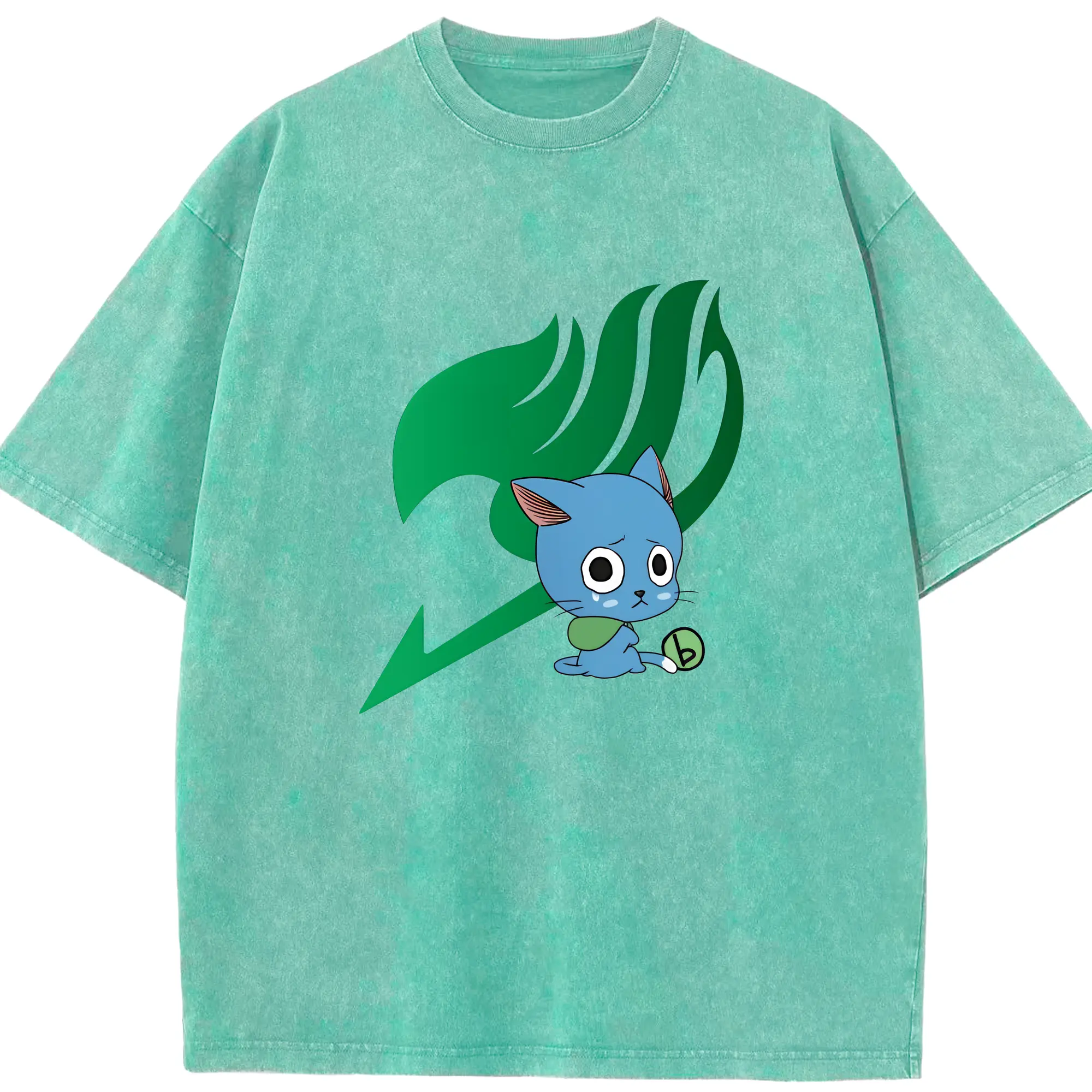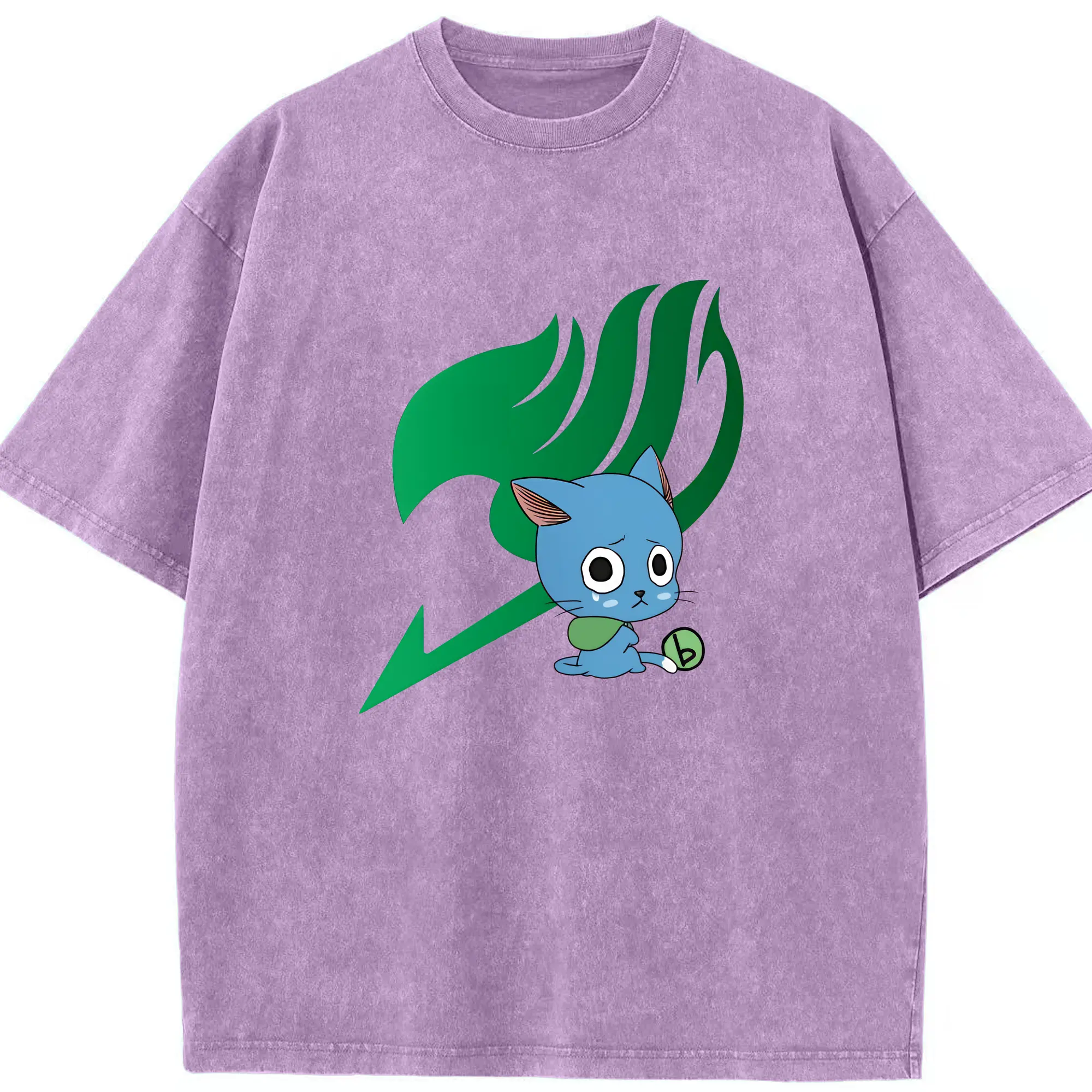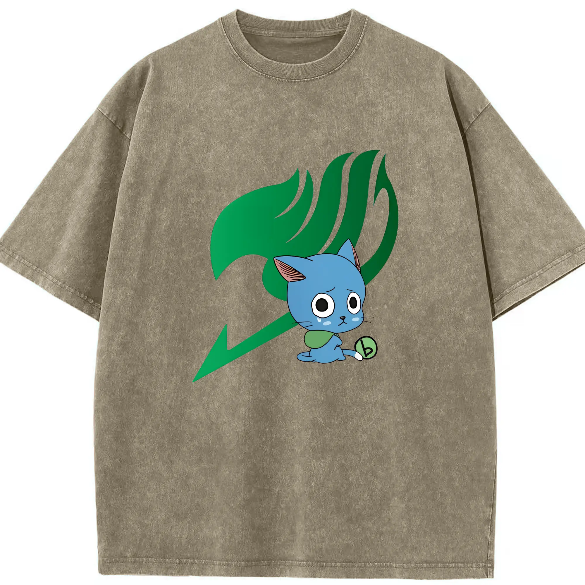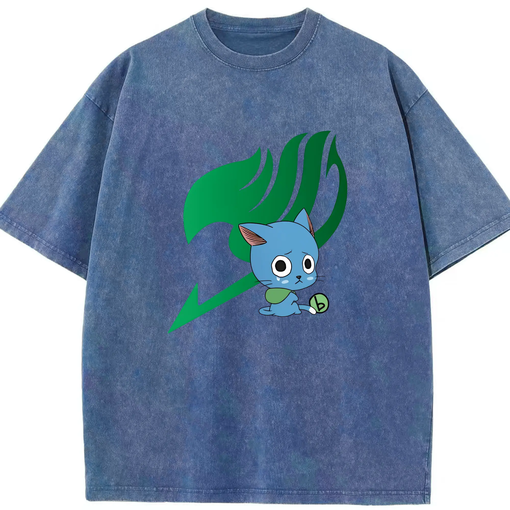 フェアリーテイル グッズ ハッピー - 綿100% ヴィンテージ風 半袖Tシャツ ・ 背面プリント ・ 柔らか肌触り ・ 通気性 快適 ・ スポーツ カジュアル 外出用