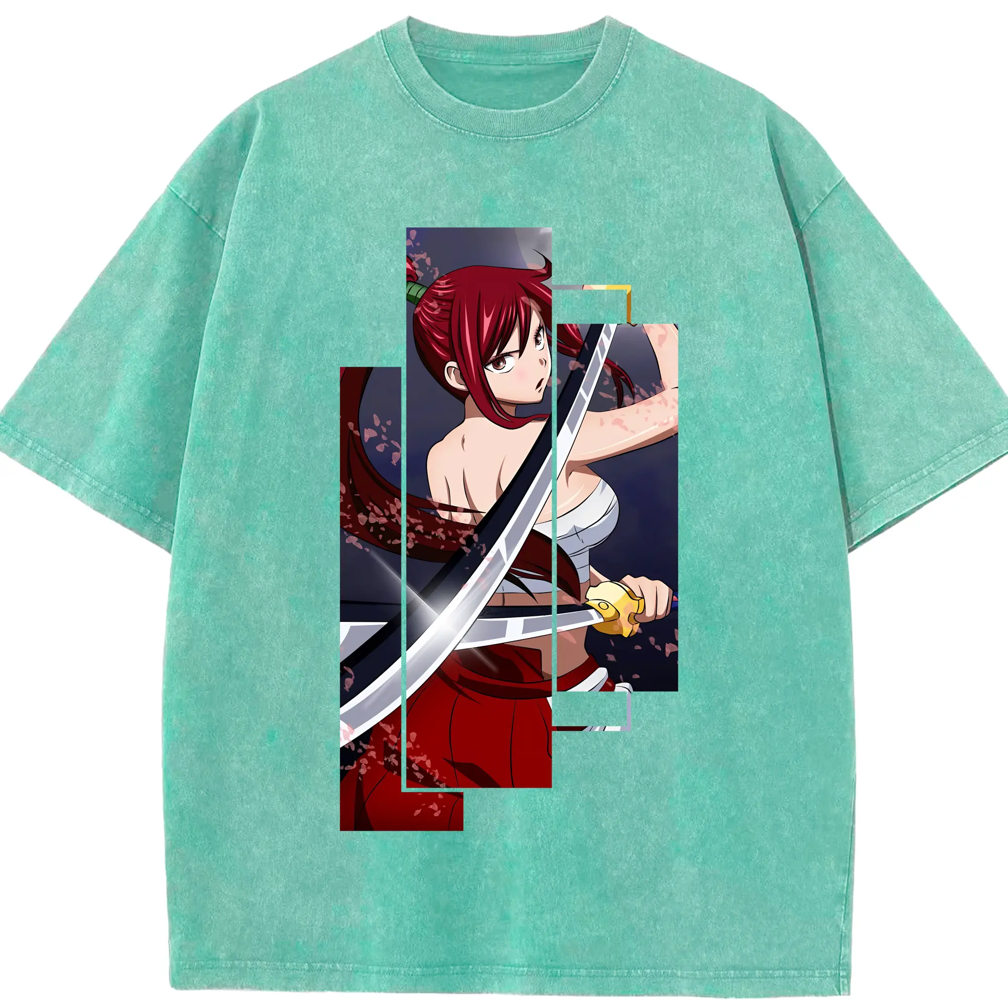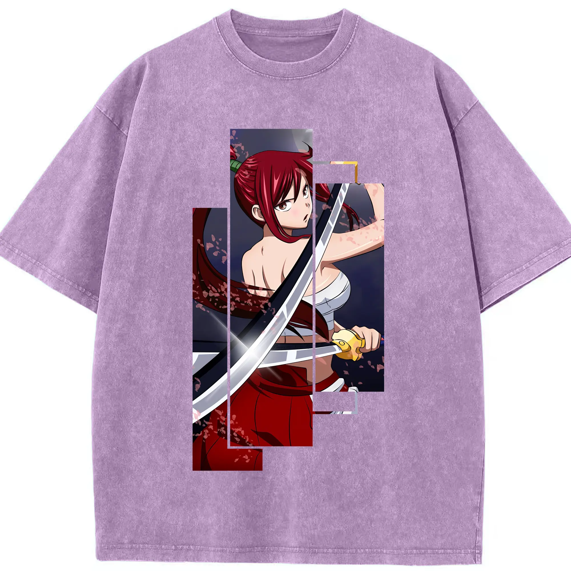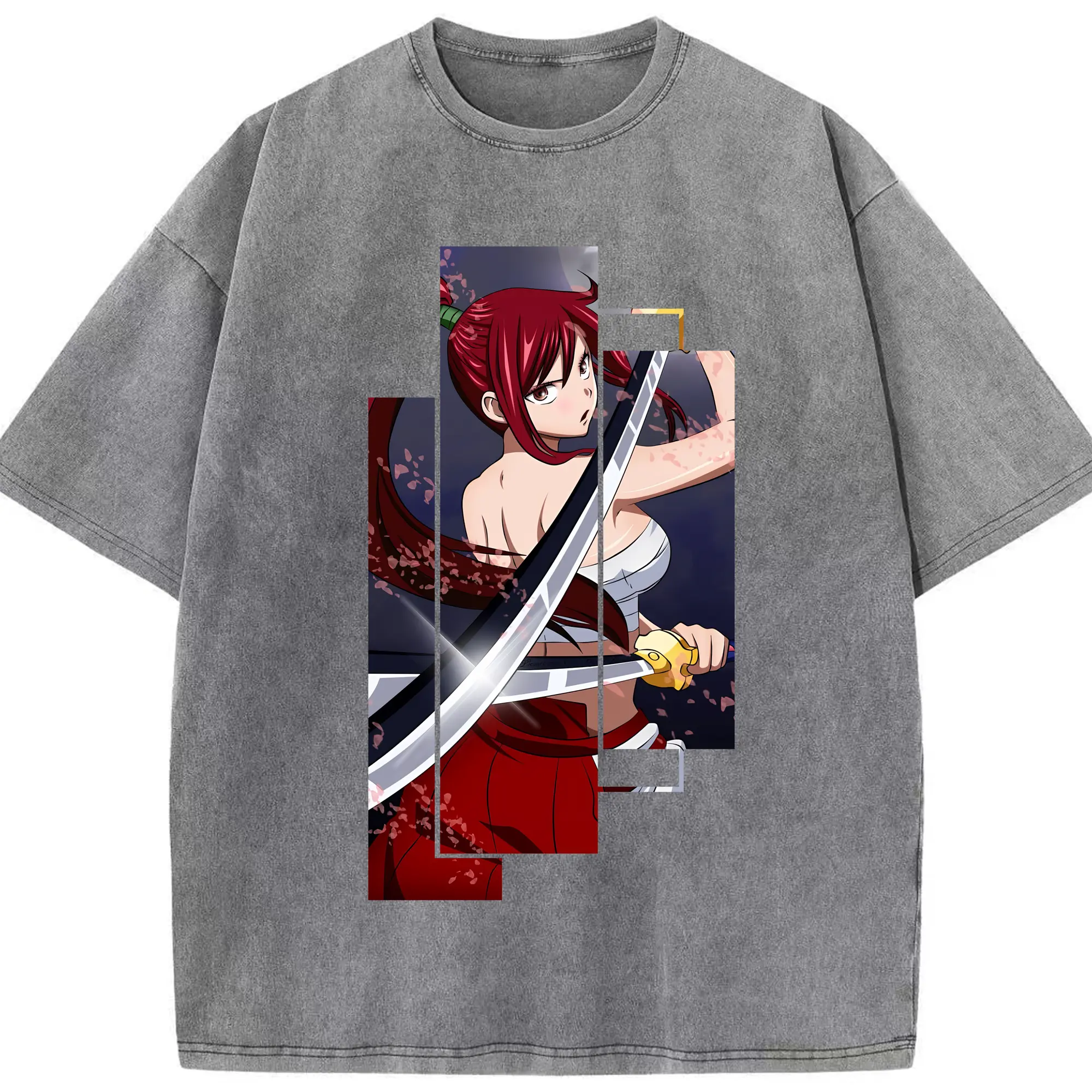 フェアリーテイル グッズ エルザ・スカーレット - 綿100% ヴィンテージ風 半袖Tシャツ ・ 背面プリント ・ 柔らか肌触り ・ 通気性 快適 ・ スポーツ カジュアル 外出用