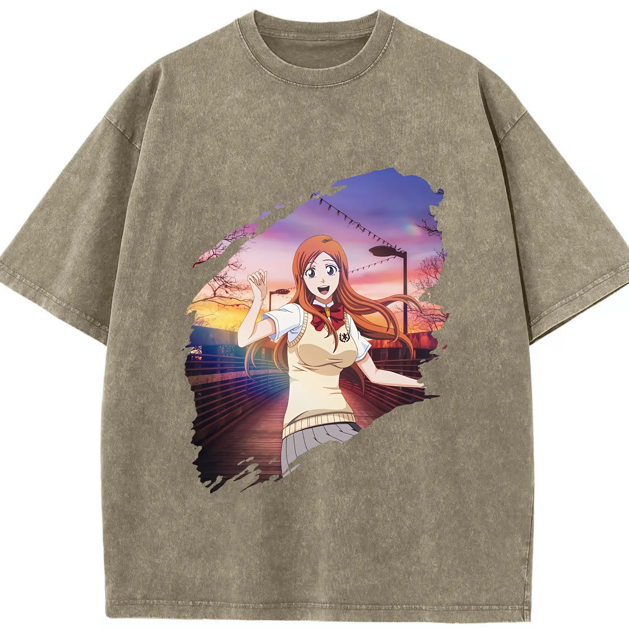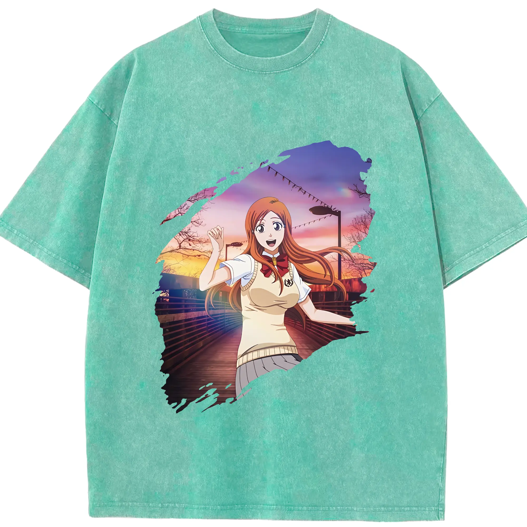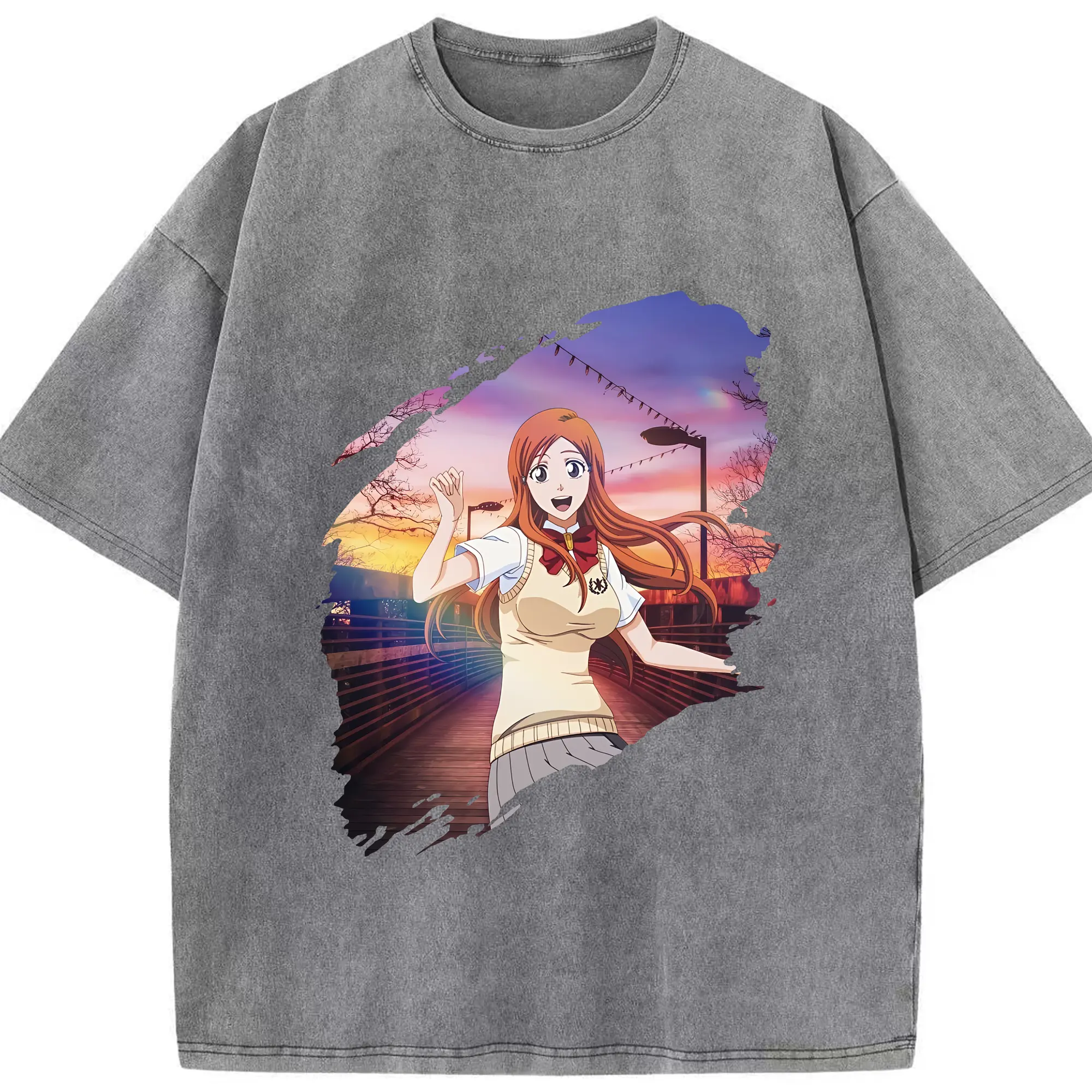 ブリーチ グッズ 井上 織姫 - 綿100% ヴィンテージ風 半袖Tシャツ ・ 背面プリント ・ 柔らか肌触り ・ 通気性 快適 ・ スポーツ カジュアル 外出用