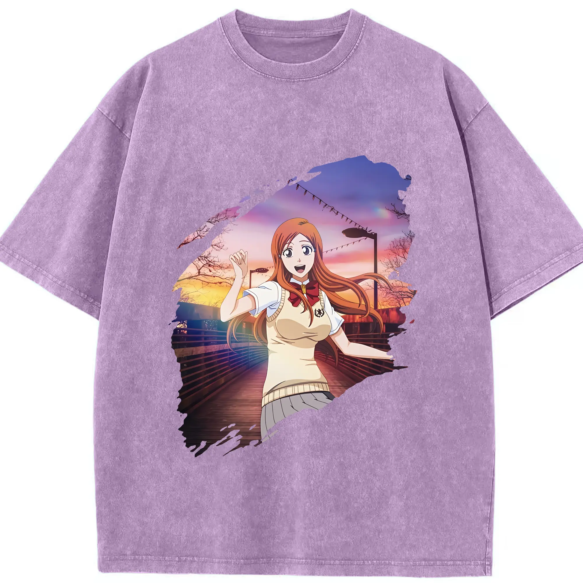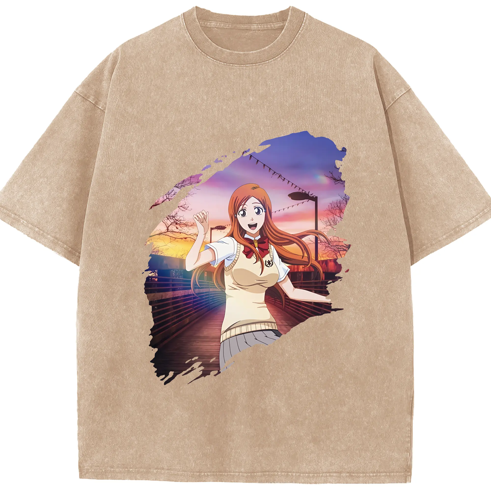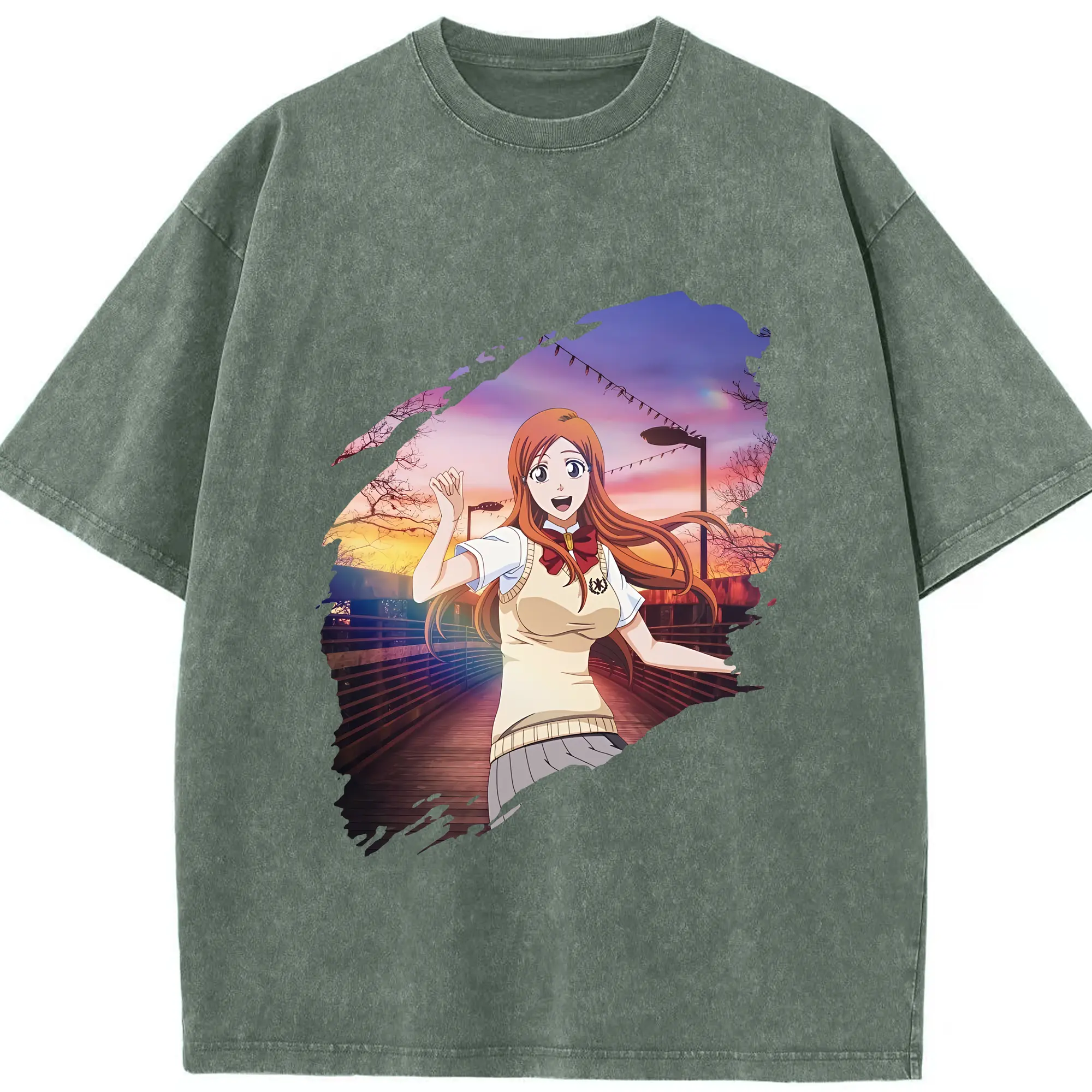 ブリーチ グッズ 井上 織姫 - 綿100% ヴィンテージ風 半袖Tシャツ ・ 背面プリント ・ 柔らか肌触り ・ 通気性 快適 ・ スポーツ カジュアル 外出用