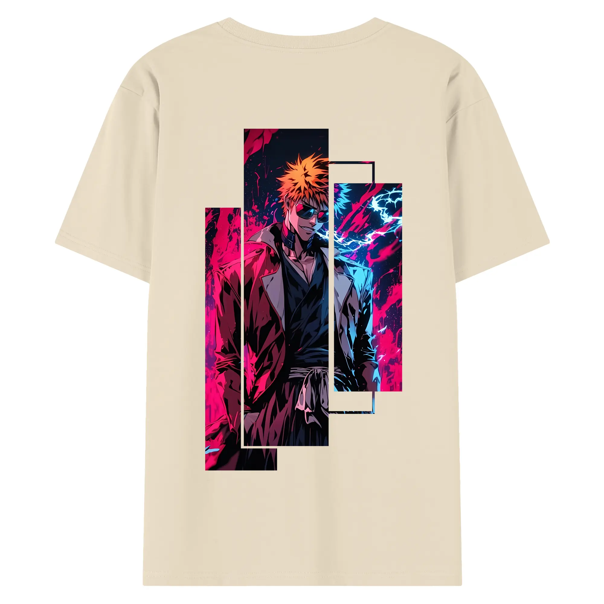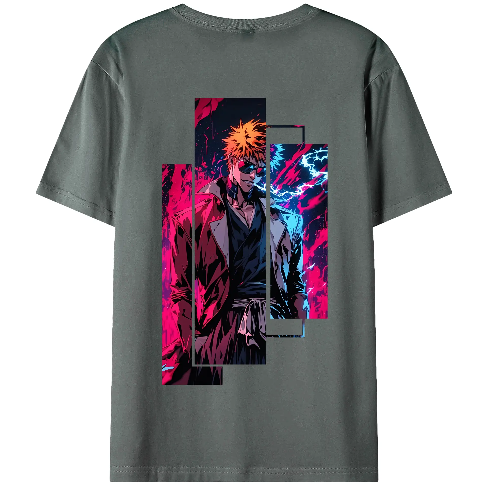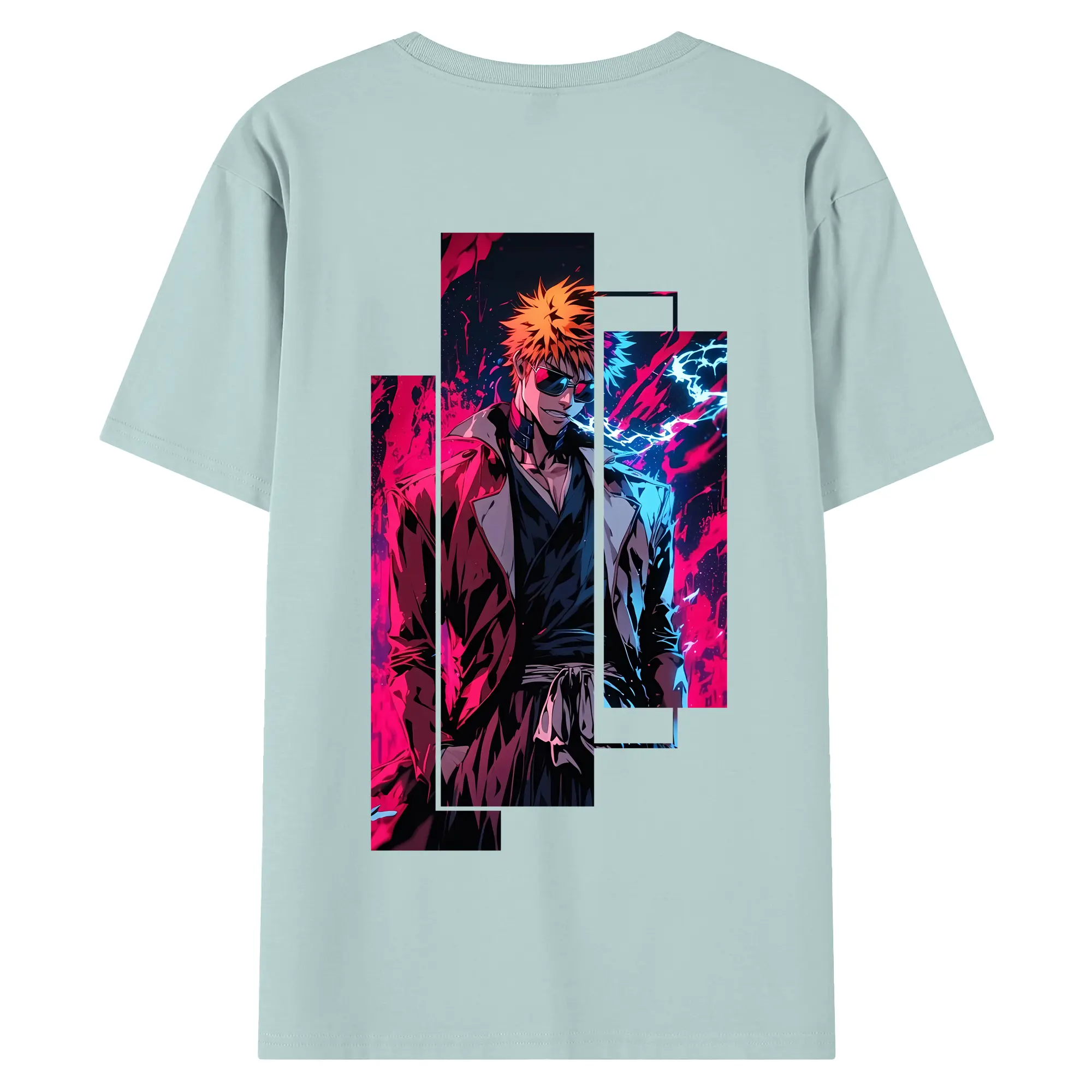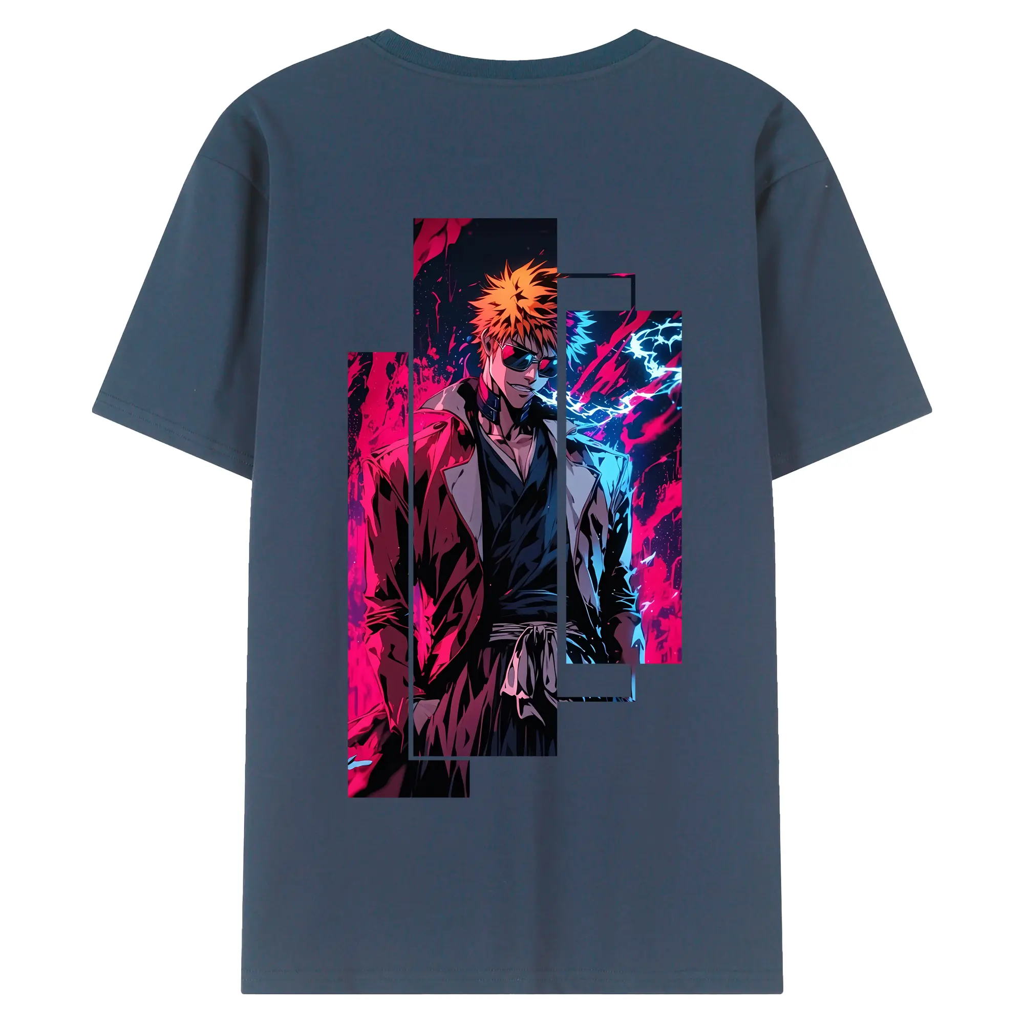 ブリーチ グッズ 黒崎 一護 - 綿100% ヴィンテージ風 半袖Tシャツ ・ 背面プリント ・ 柔らか肌触り ・ 通気性 快適 ・ スポーツ カジュアル 外出用