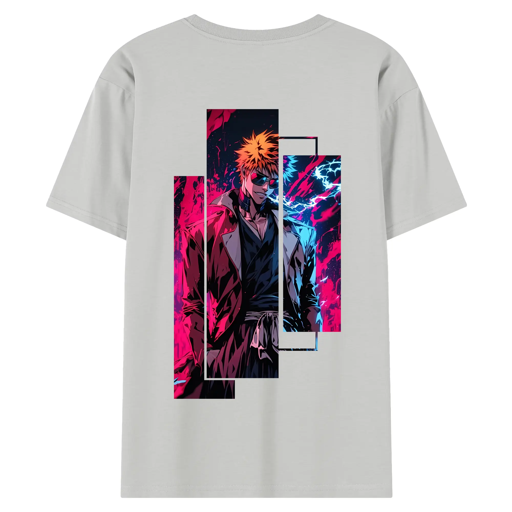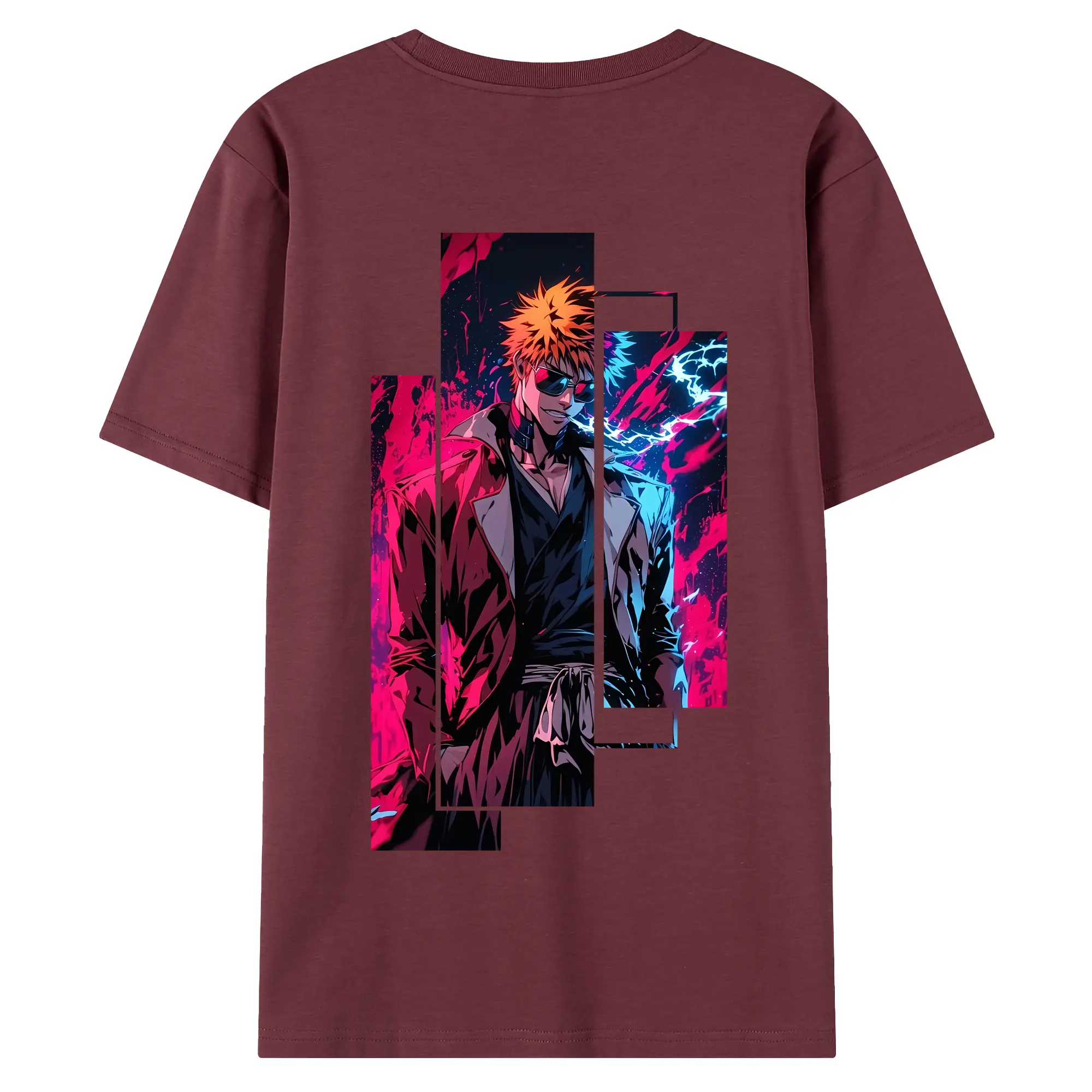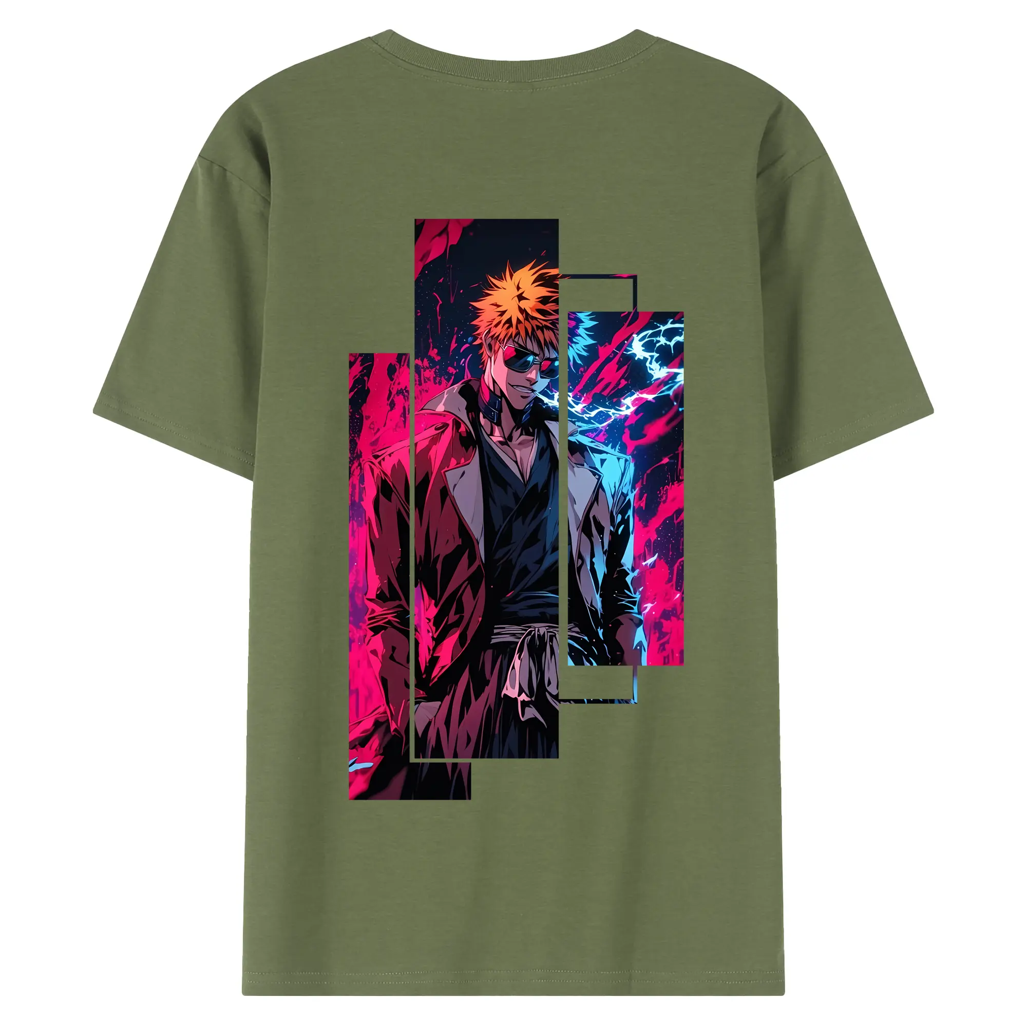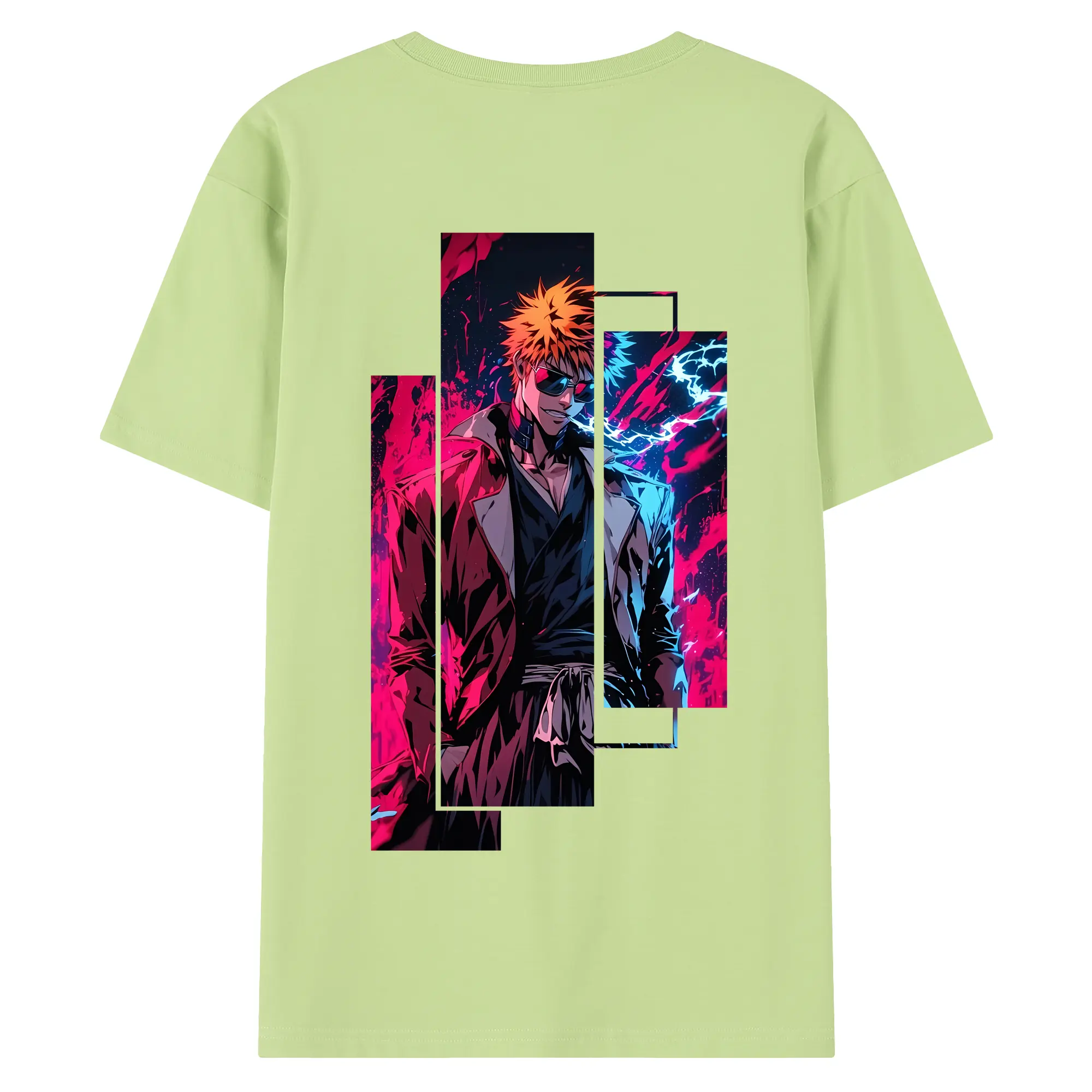 ブリーチ グッズ 黒崎 一護 - 綿100% ヴィンテージ風 半袖Tシャツ ・ 背面プリント ・ 柔らか肌触り ・ 通気性 快適 ・ スポーツ カジュアル 外出用
