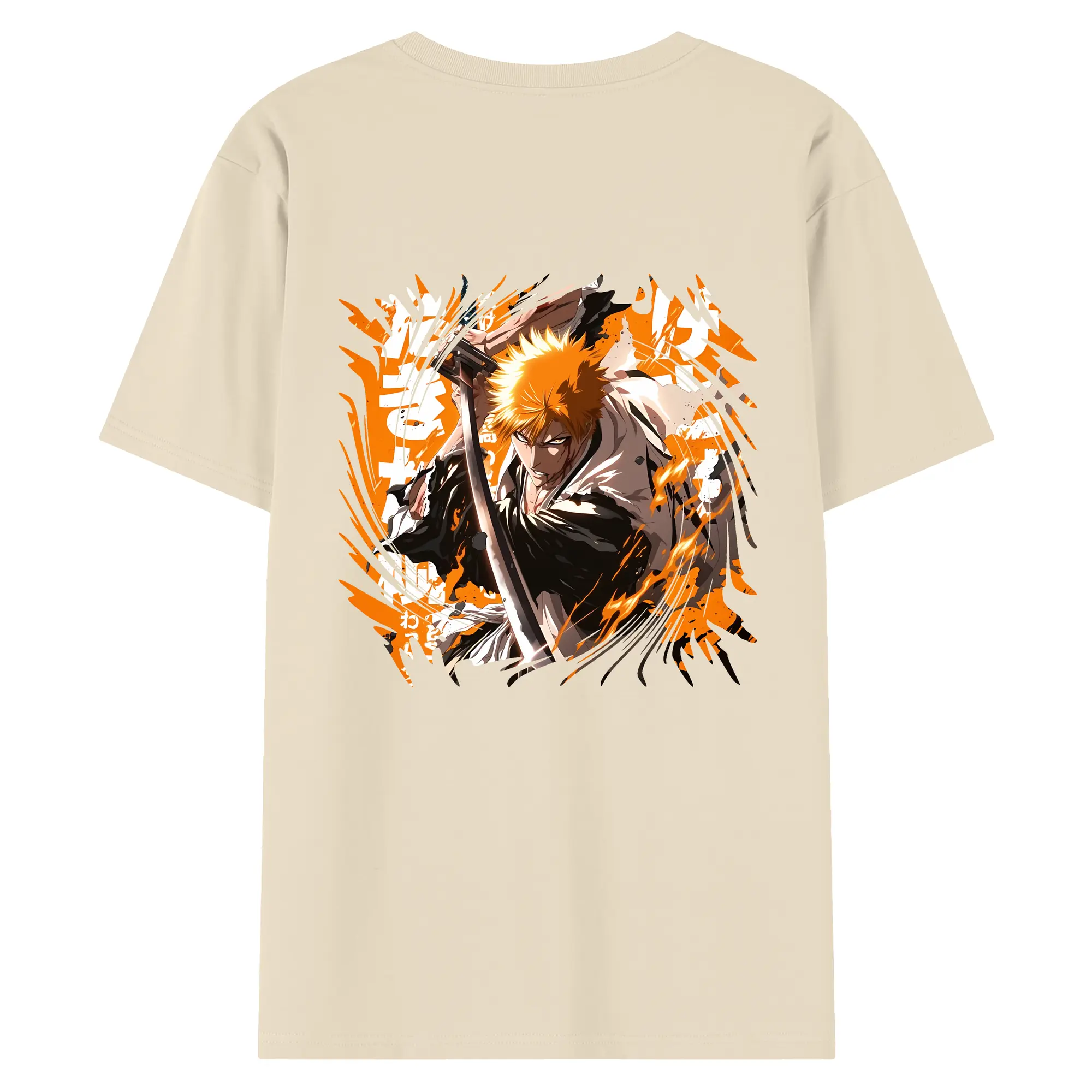 ブリーチ グッズ 黒崎 一護 - 綿100% ヴィンテージ風 半袖Tシャツ ・ 背面プリント ・ 柔らか肌触り ・ 通気性 快適 ・ スポーツ カジュアル 外出用