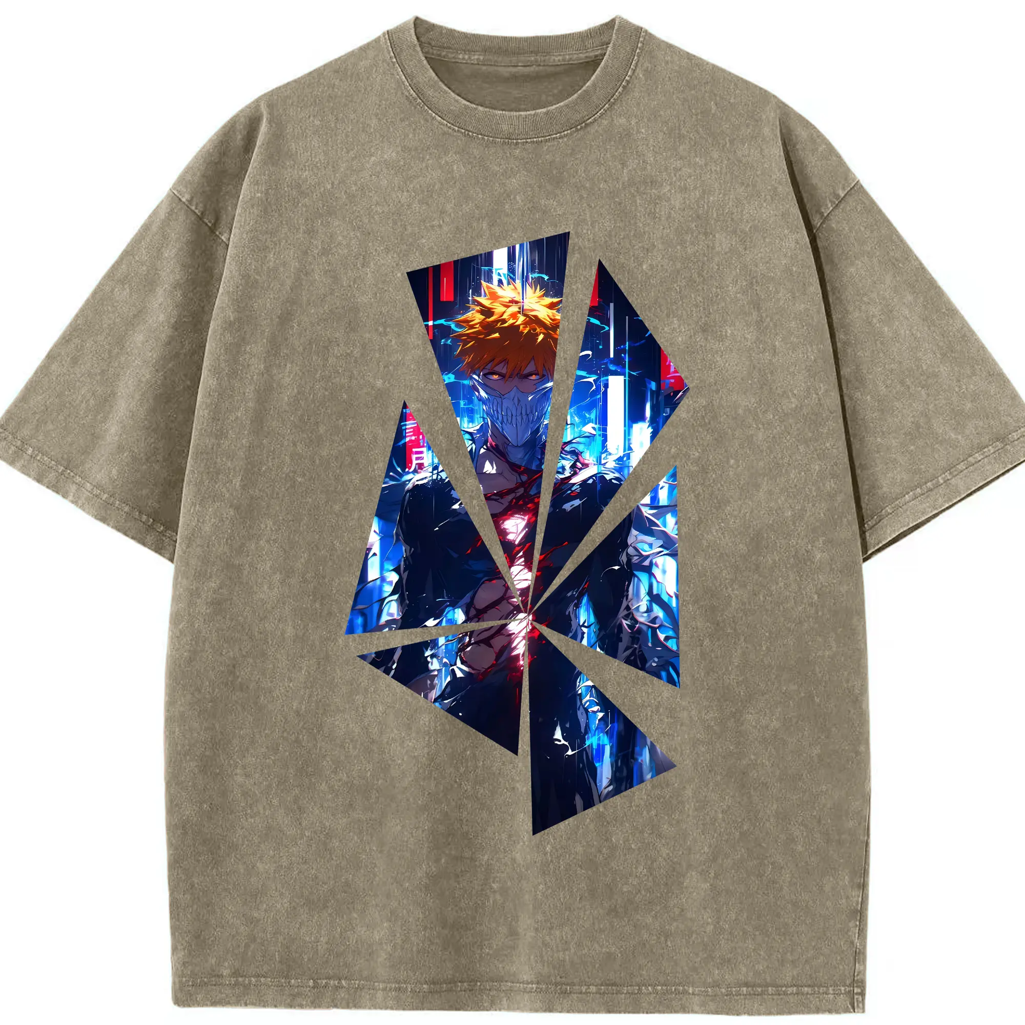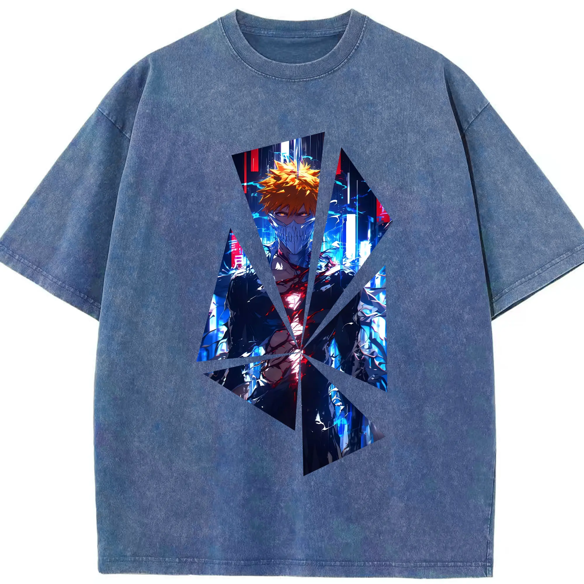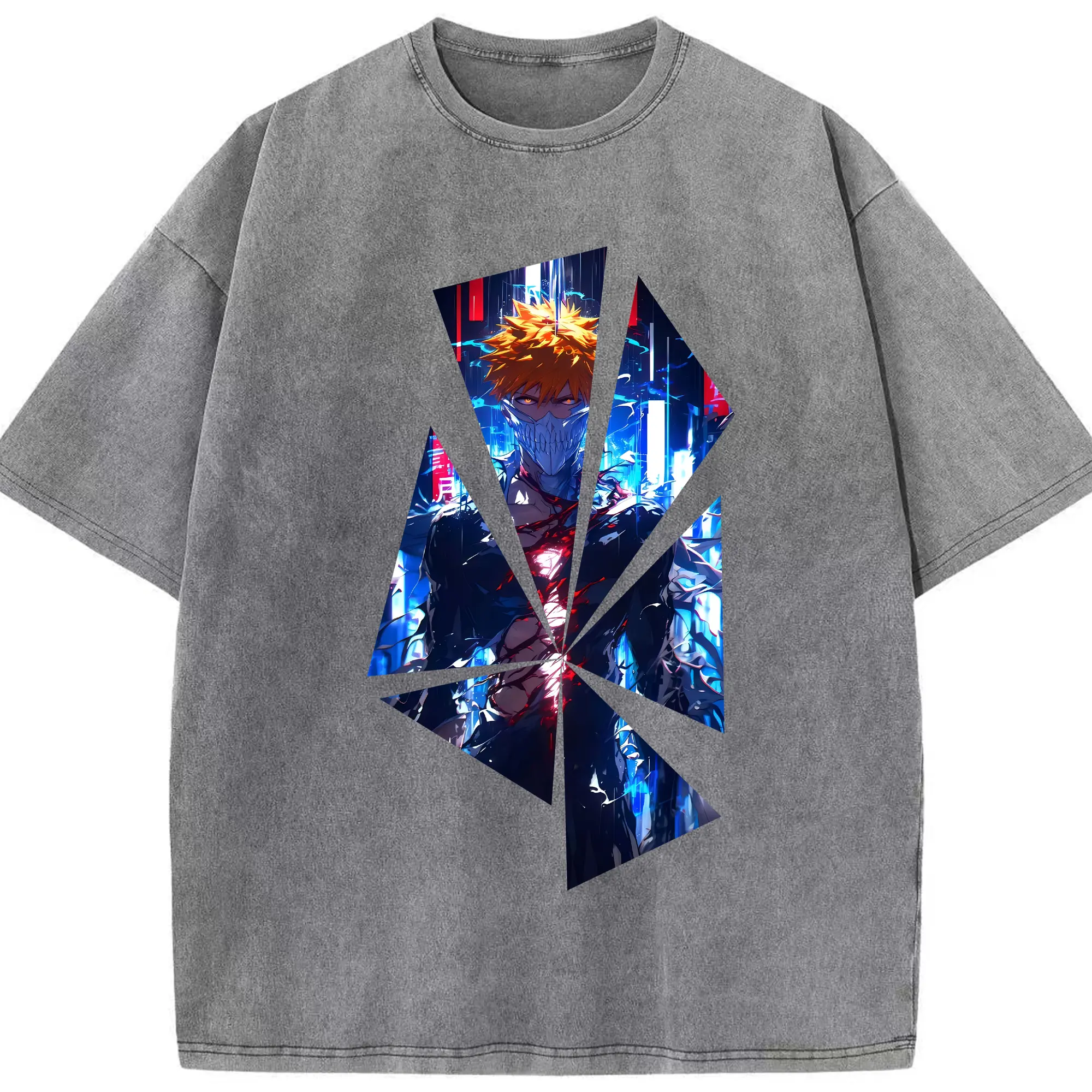 ブリーチ グッズ 黒崎 一護 - 綿100% ヴィンテージ風 半袖Tシャツ ・ 背面プリント ・ 柔らか肌触り ・ 通気性 快適 ・ スポーツ カジュアル 外出用