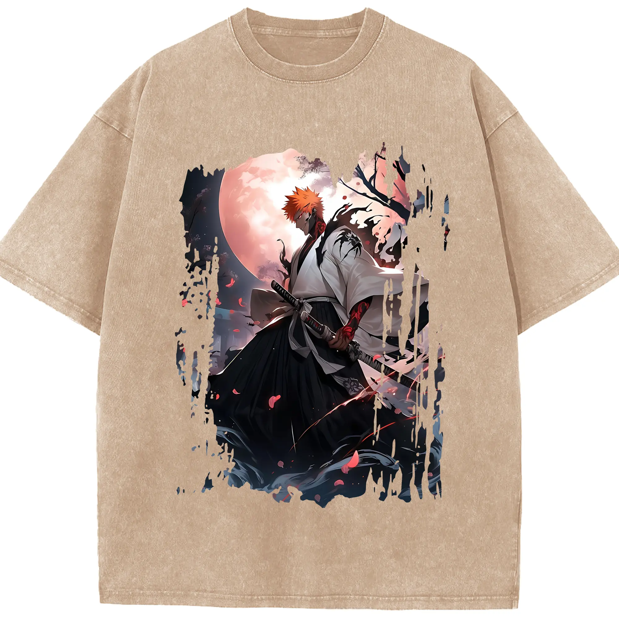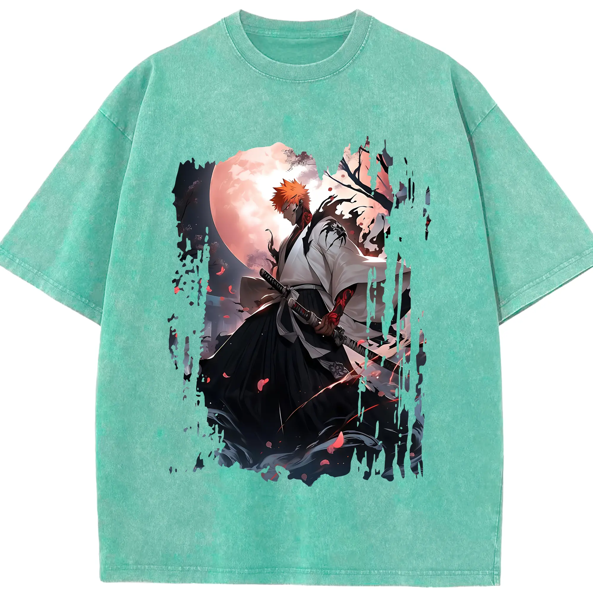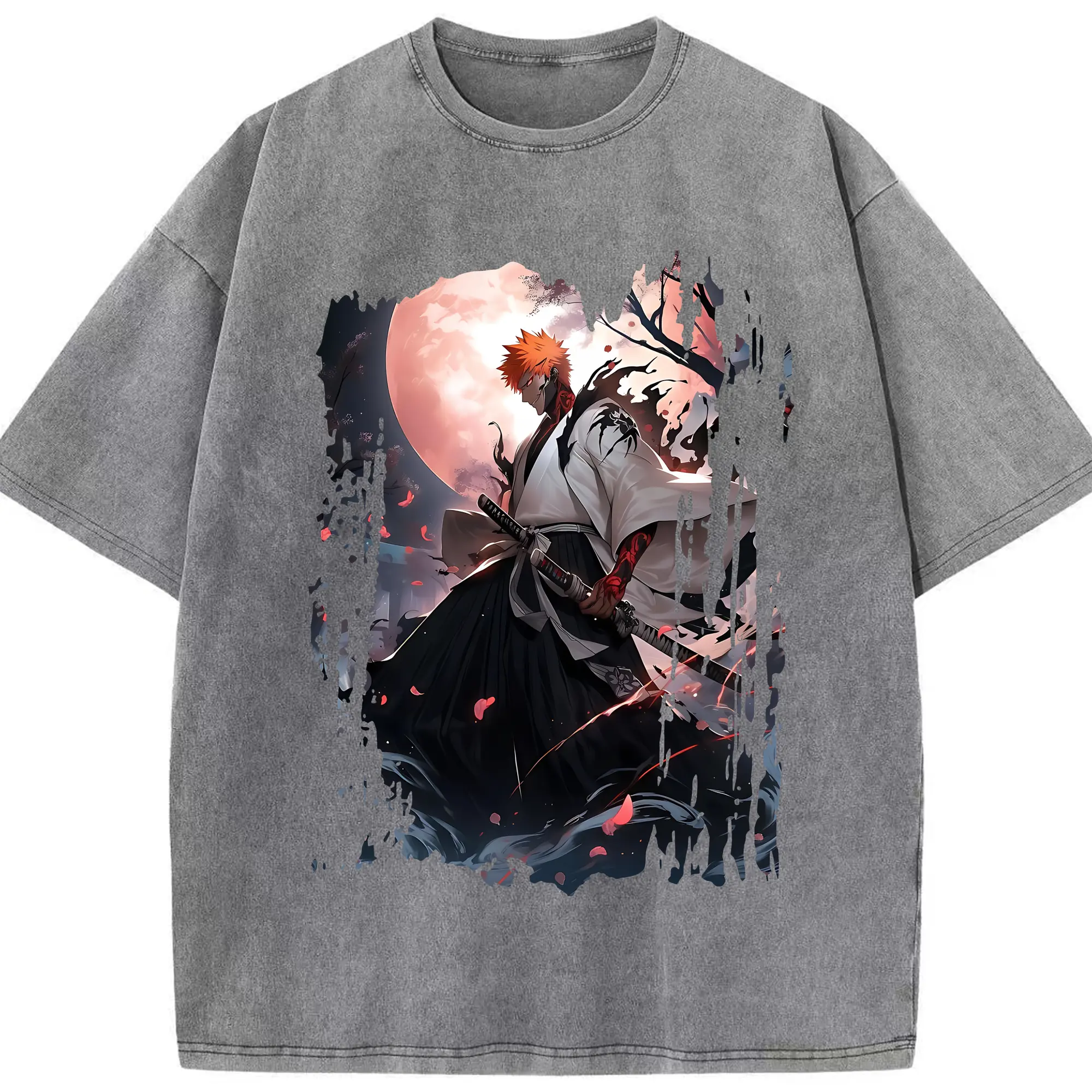 ブリーチ グッズ 黒崎 一護 - 綿100% ヴィンテージ風 半袖Tシャツ ・ 背面プリント ・ 柔らか肌触り ・ 通気性 快適 ・ スポーツ カジュアル 外出用