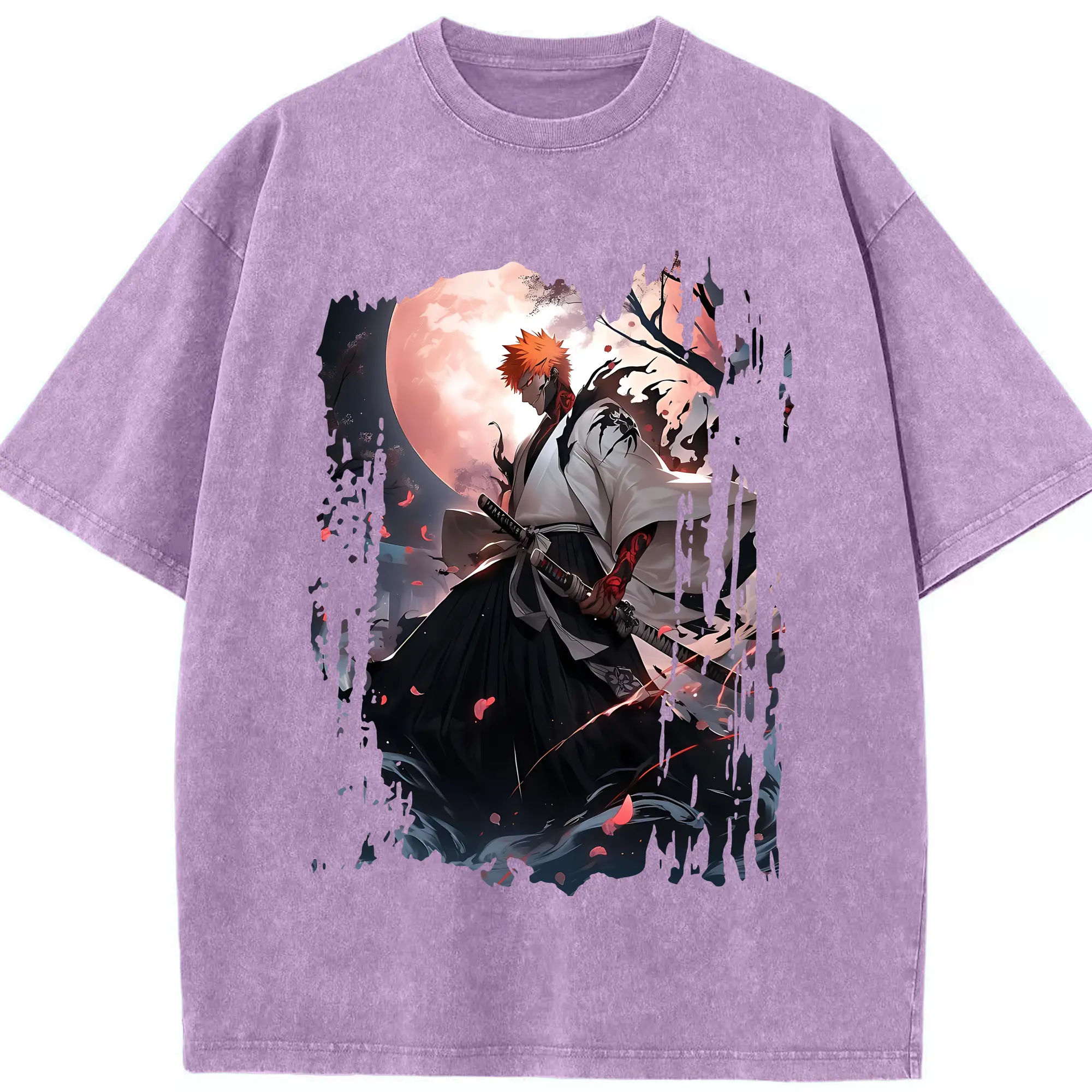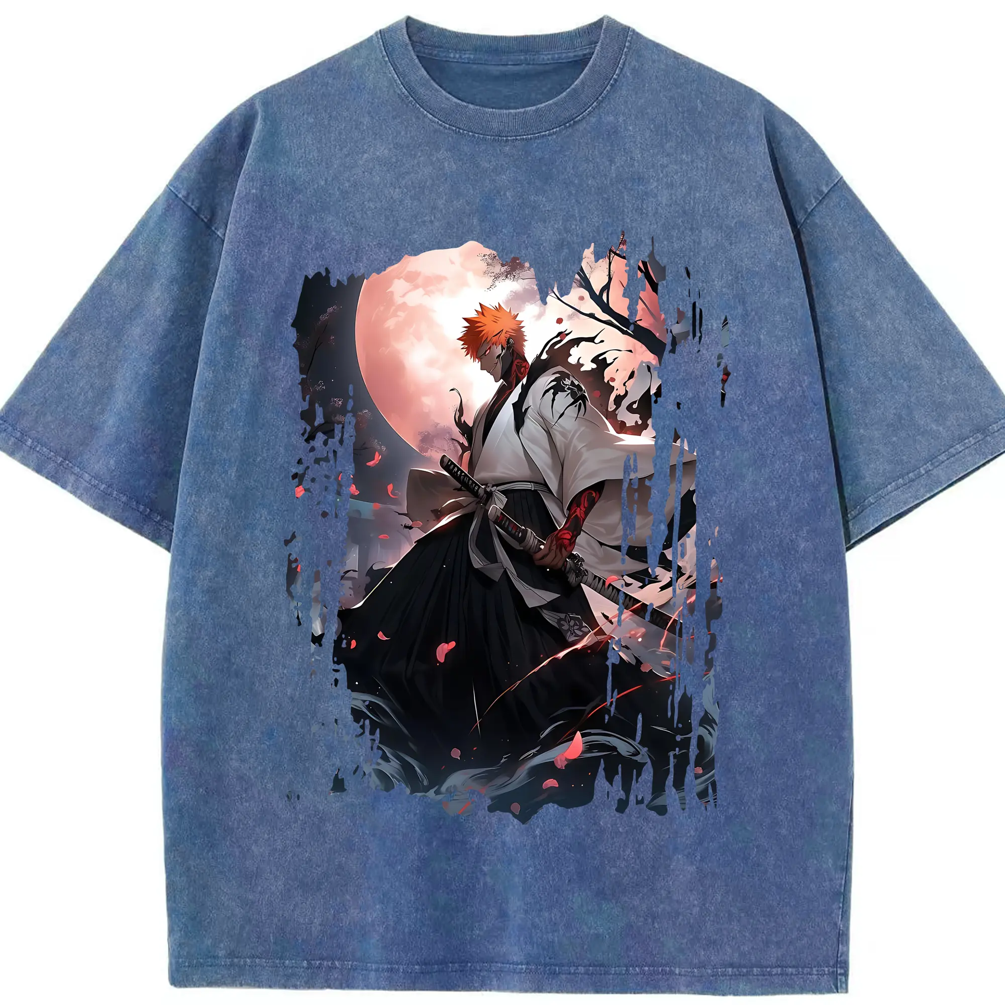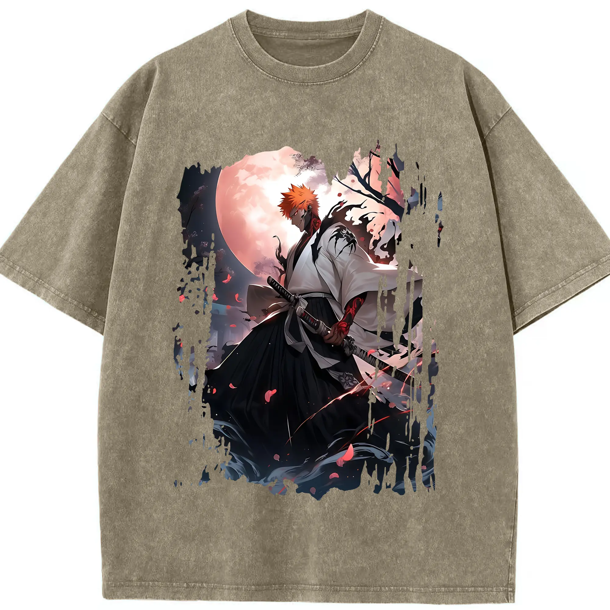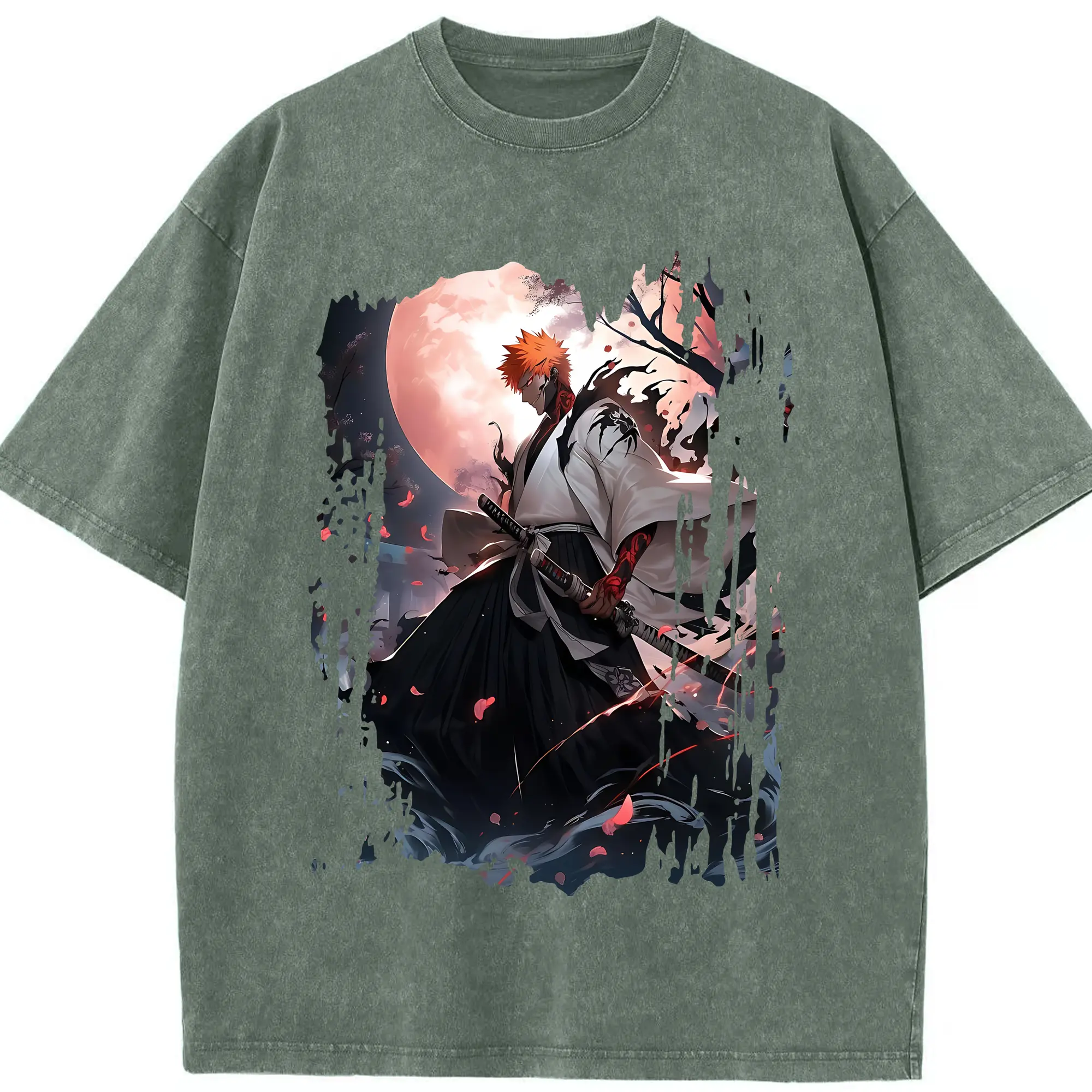 ブリーチ グッズ 黒崎 一護 - 綿100% ヴィンテージ風 半袖Tシャツ ・ 背面プリント ・ 柔らか肌触り ・ 通気性 快適 ・ スポーツ カジュアル 外出用
