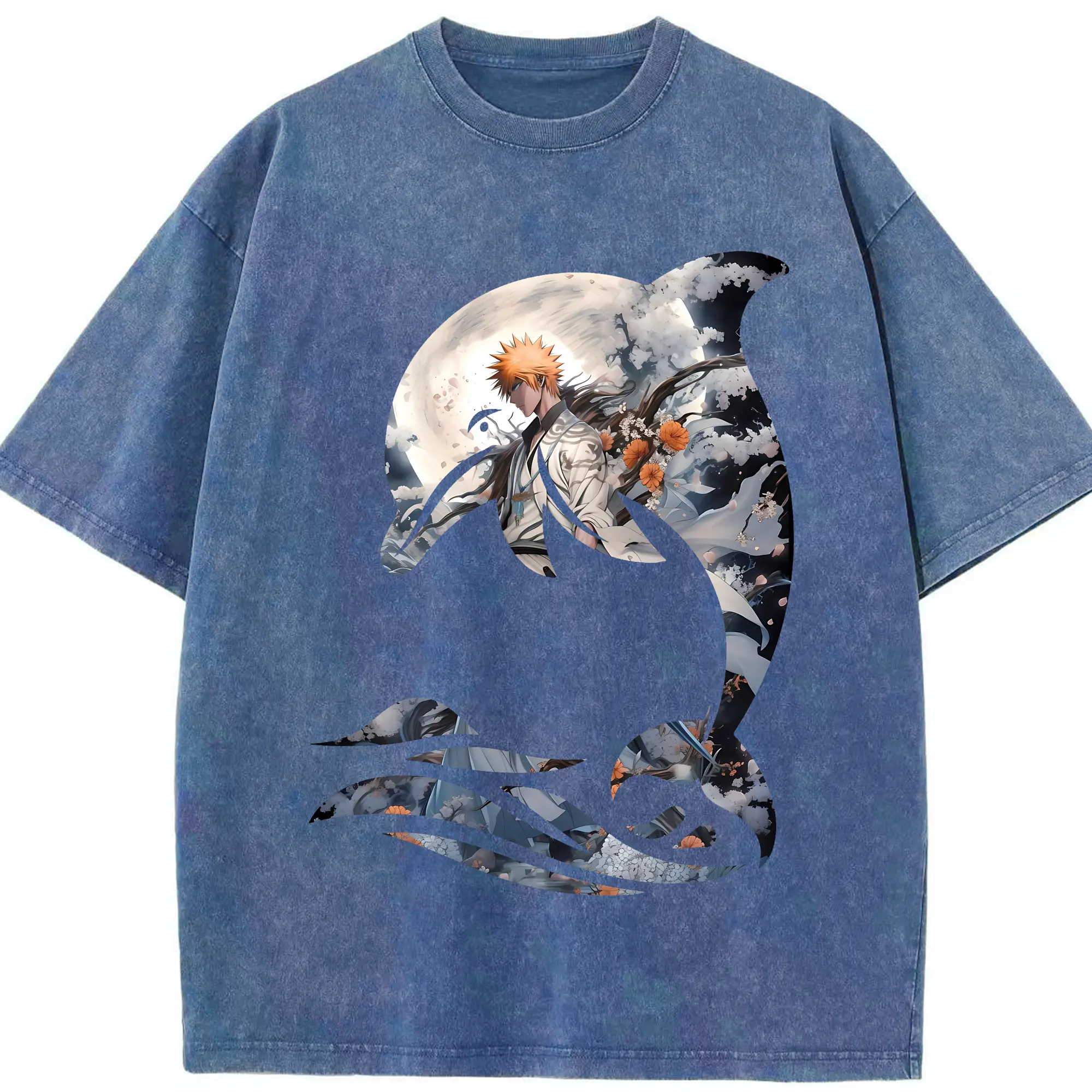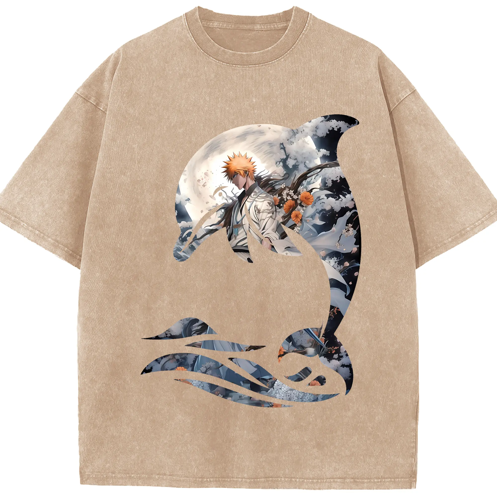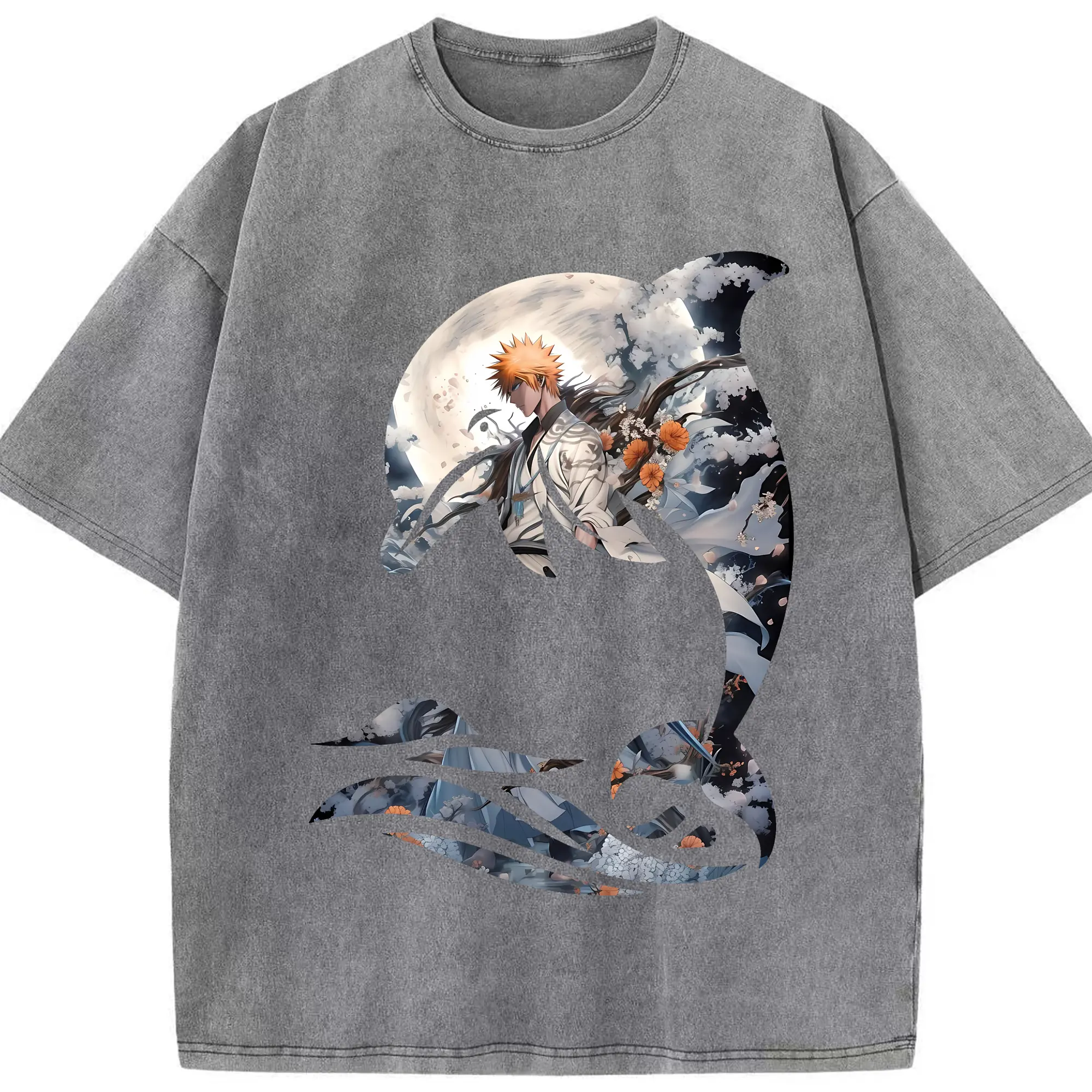 ブリーチ グッズ 黒崎 一護 - 綿100% ヴィンテージ風 半袖Tシャツ ・ 背面プリント ・ 柔らか肌触り ・ 通気性 快適 ・ スポーツ カジュアル 外出用