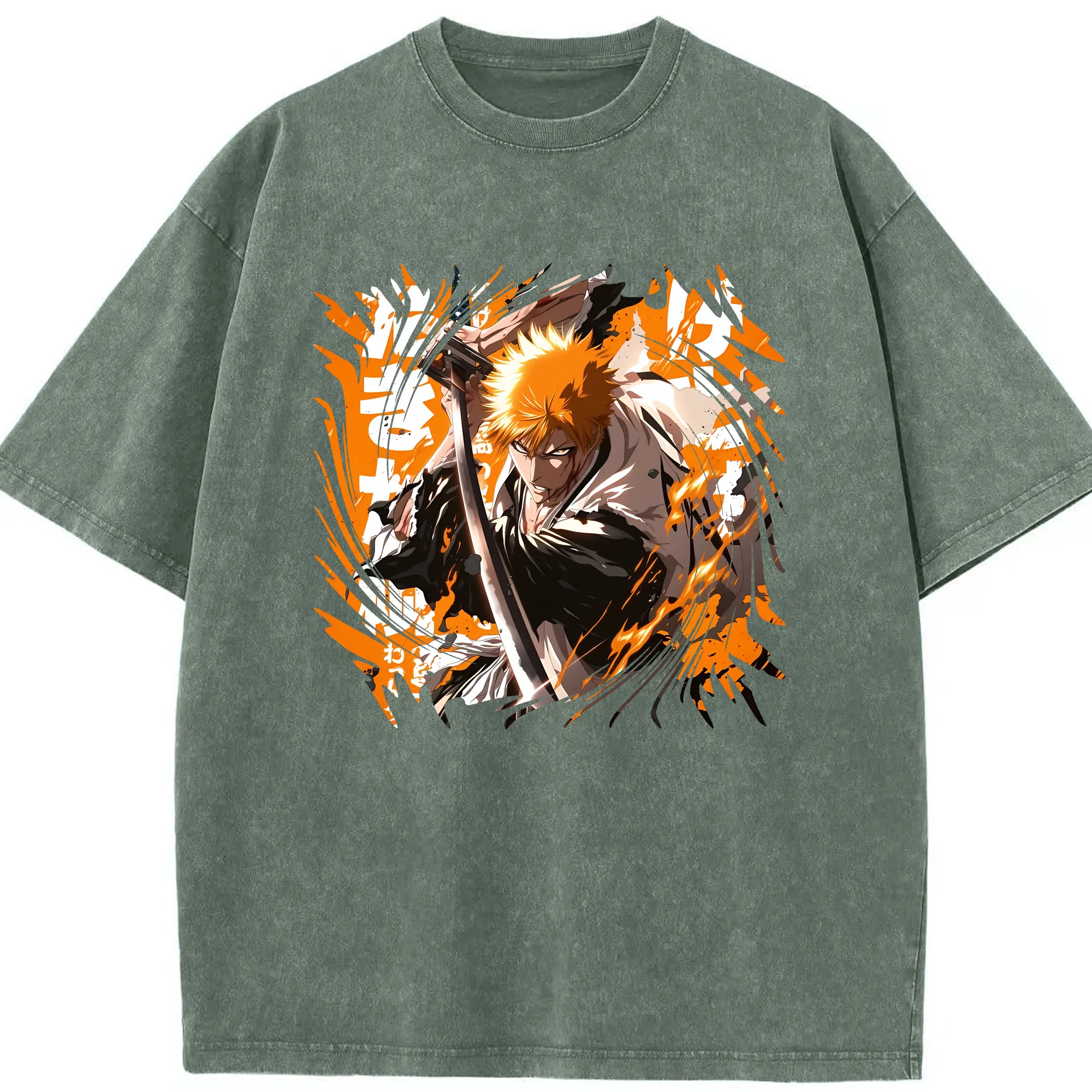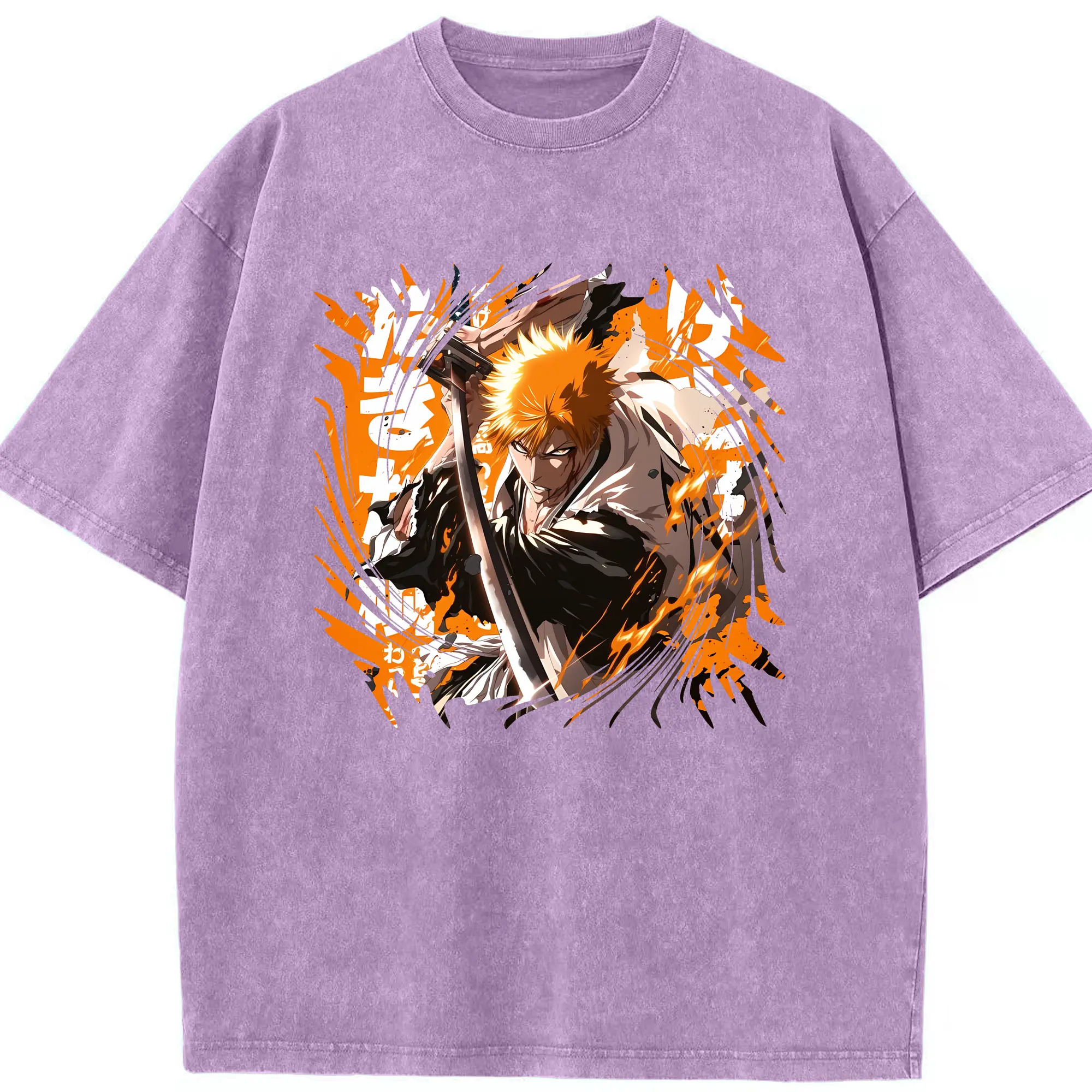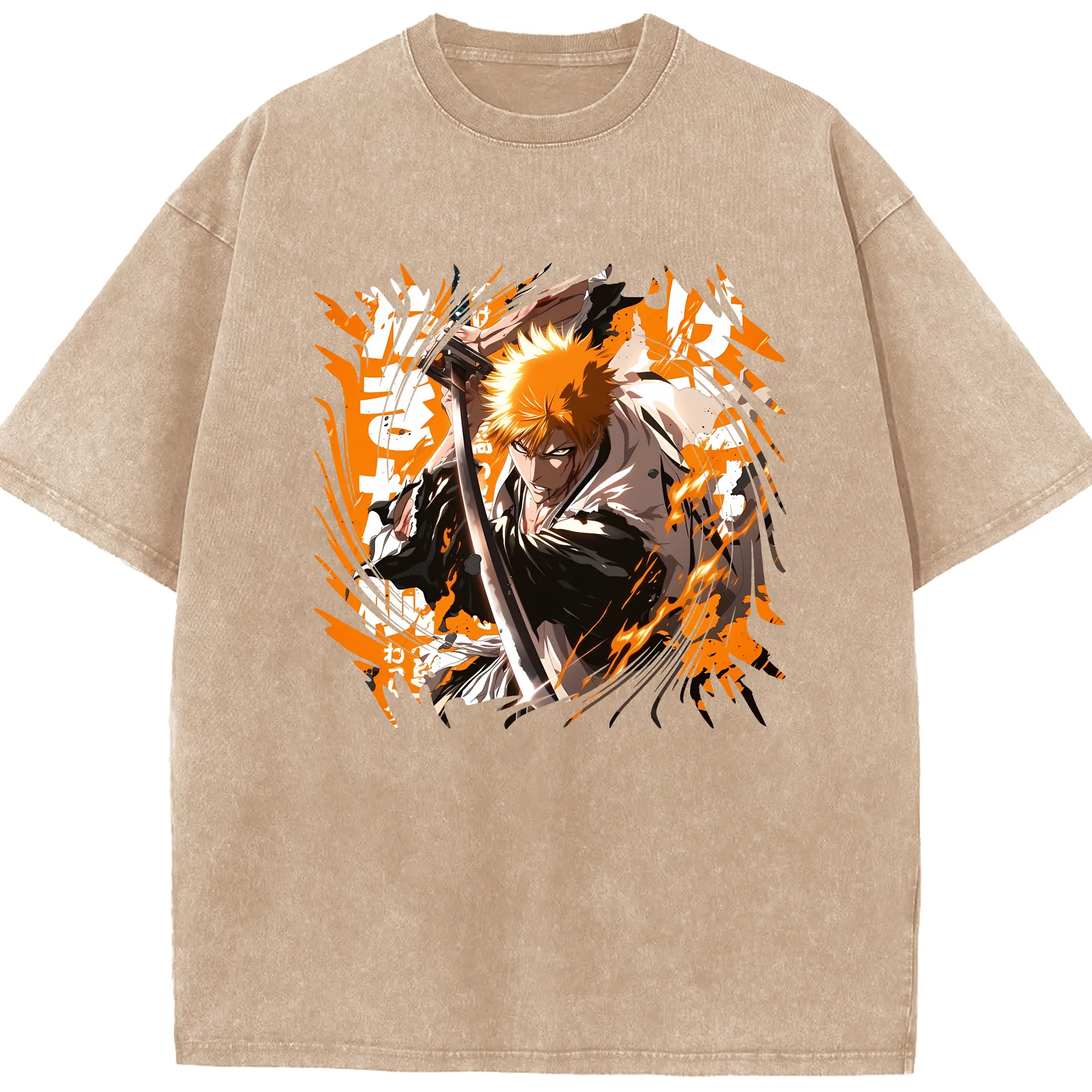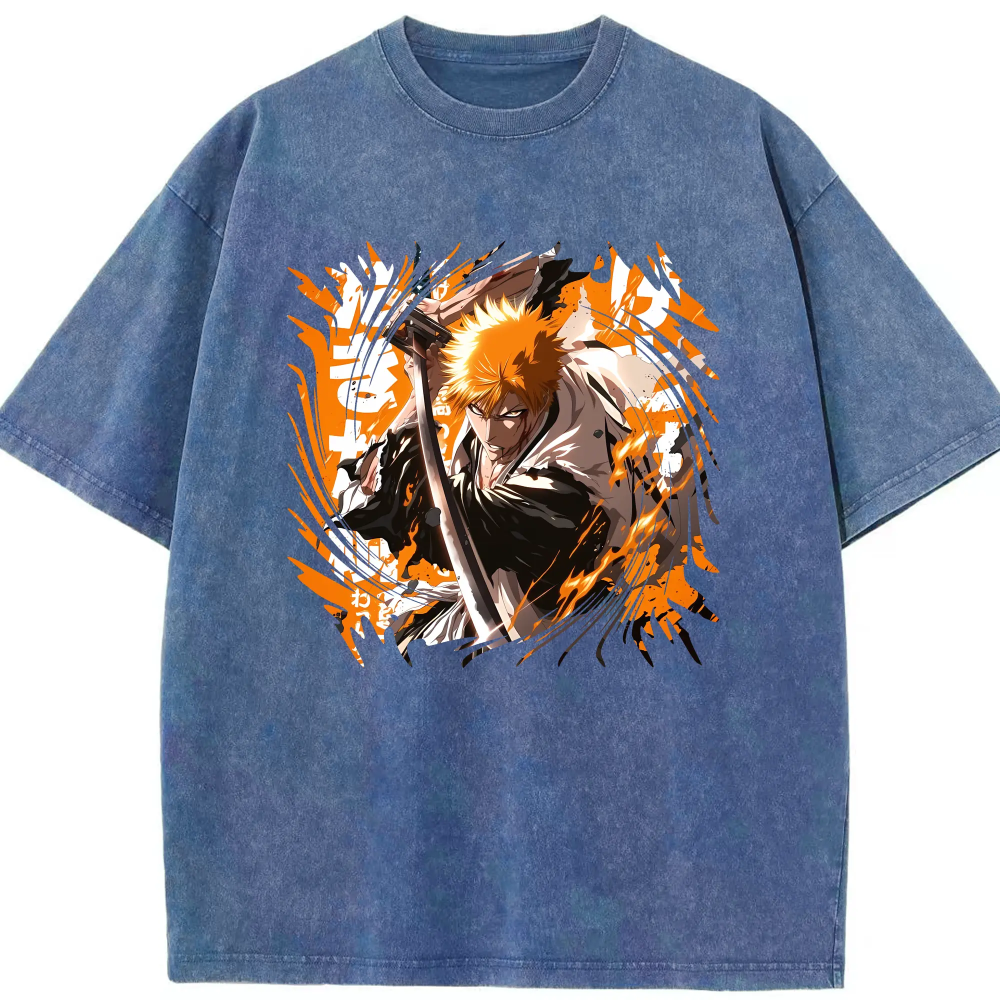 ブリーチ グッズ 黒崎 一護 - 綿100% ヴィンテージ風 半袖Tシャツ ・ 背面プリント ・ 柔らか肌触り ・ 通気性 快適 ・ スポーツ カジュアル 外出用