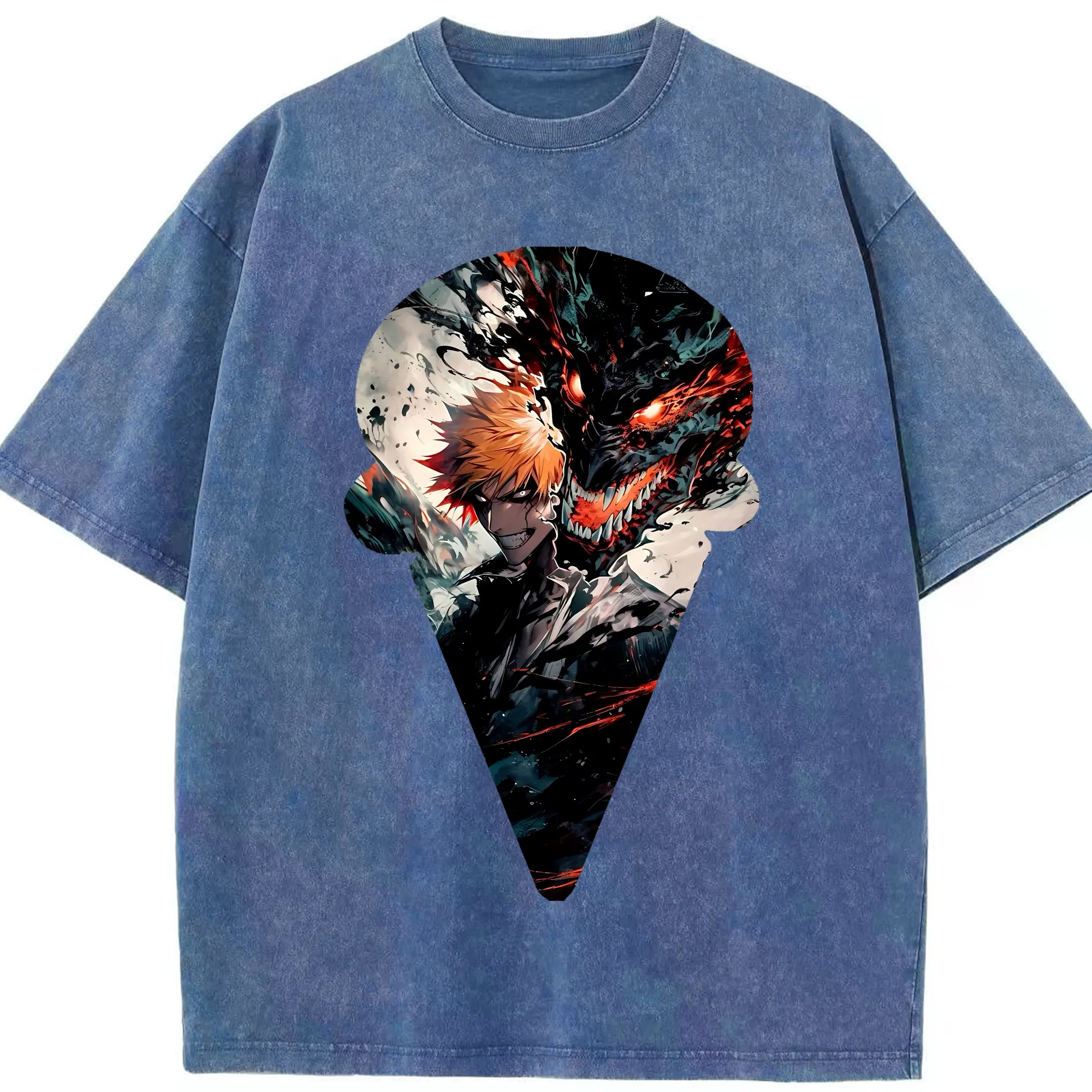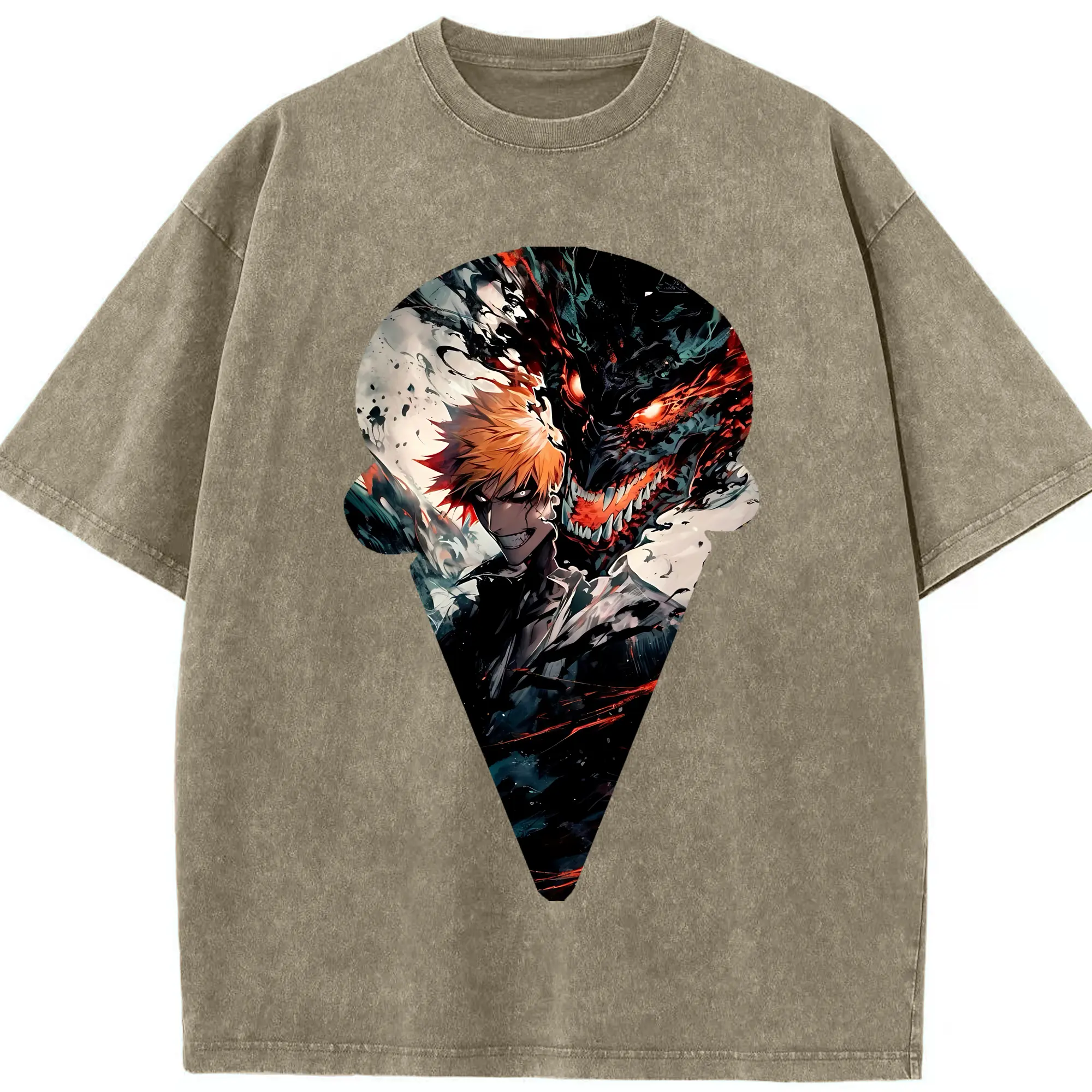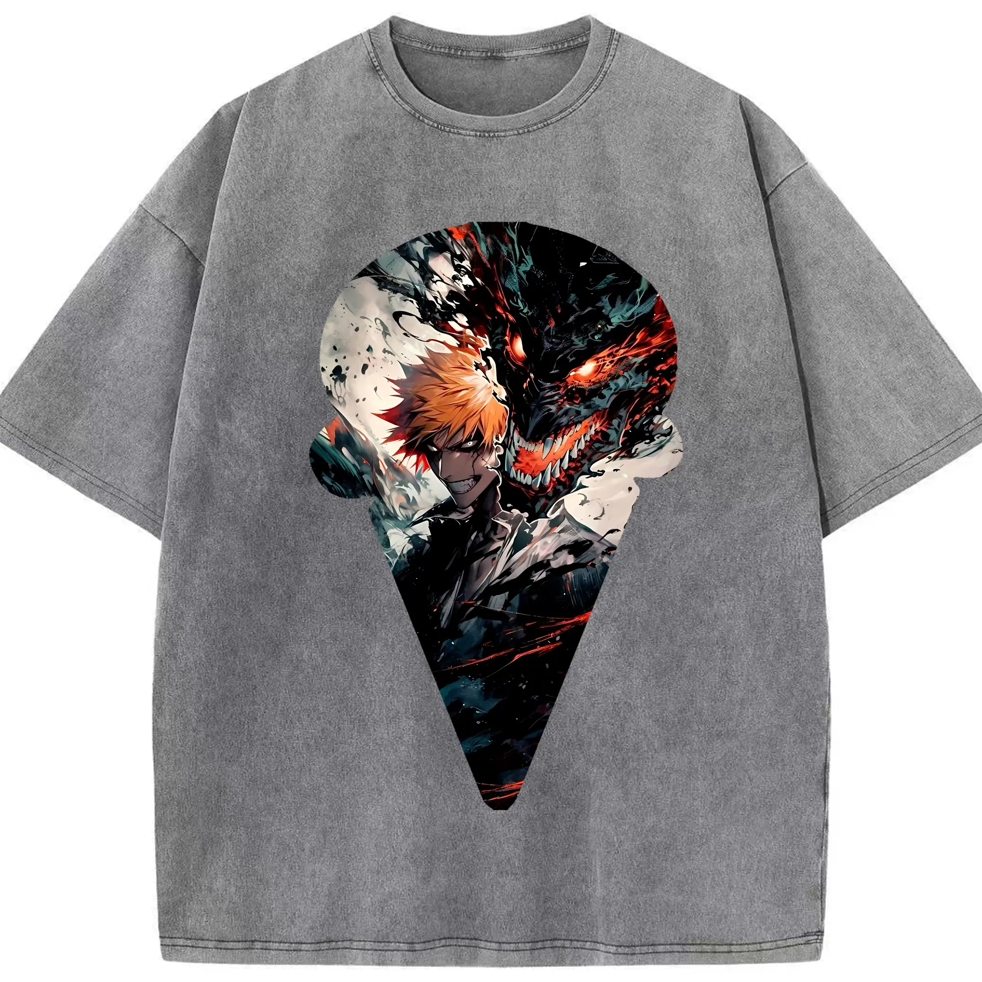 ブリーチ グッズ 黒崎 一護 - 綿100% ヴィンテージ風 半袖Tシャツ ・ 背面プリント ・ 柔らか肌触り ・ 通気性 快適 ・ スポーツ カジュアル 外出用