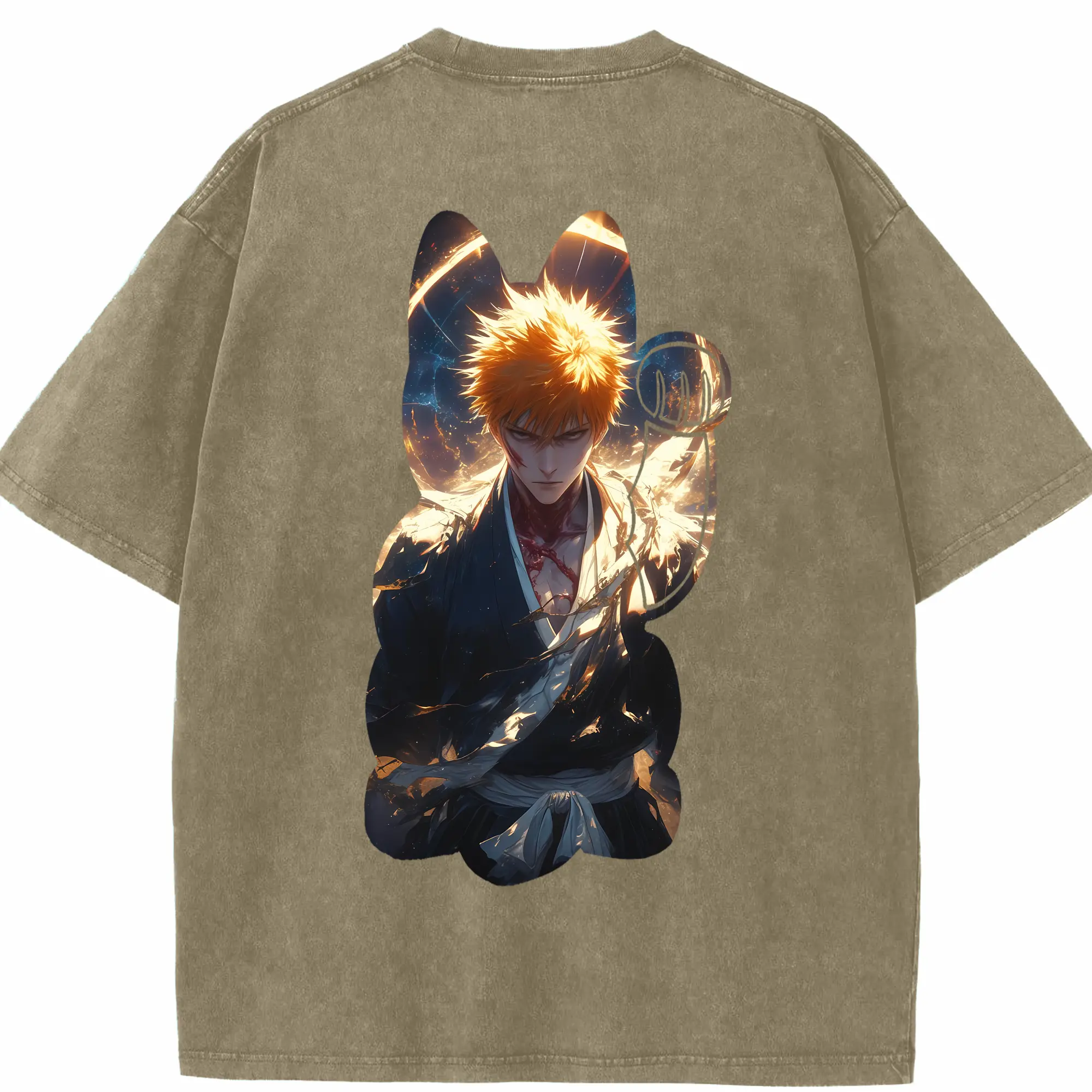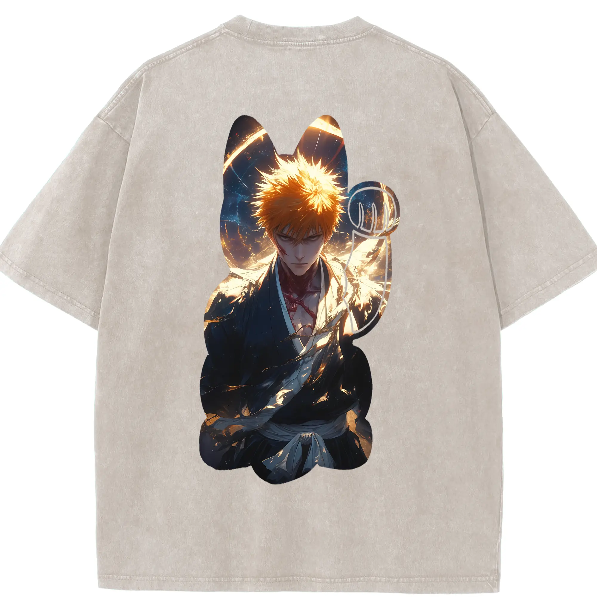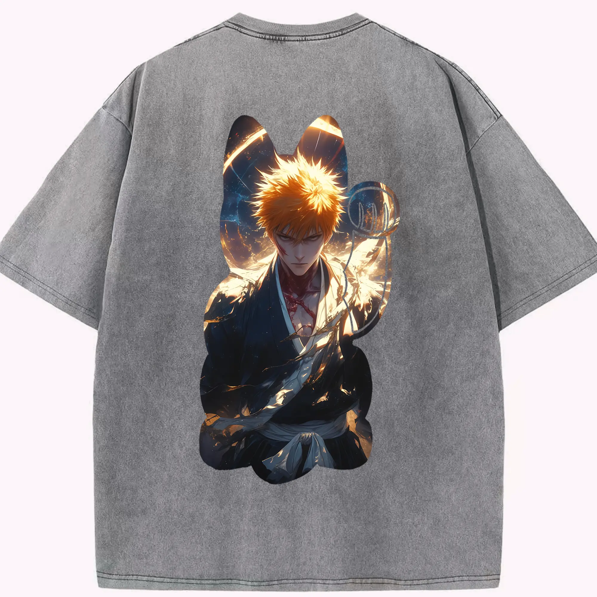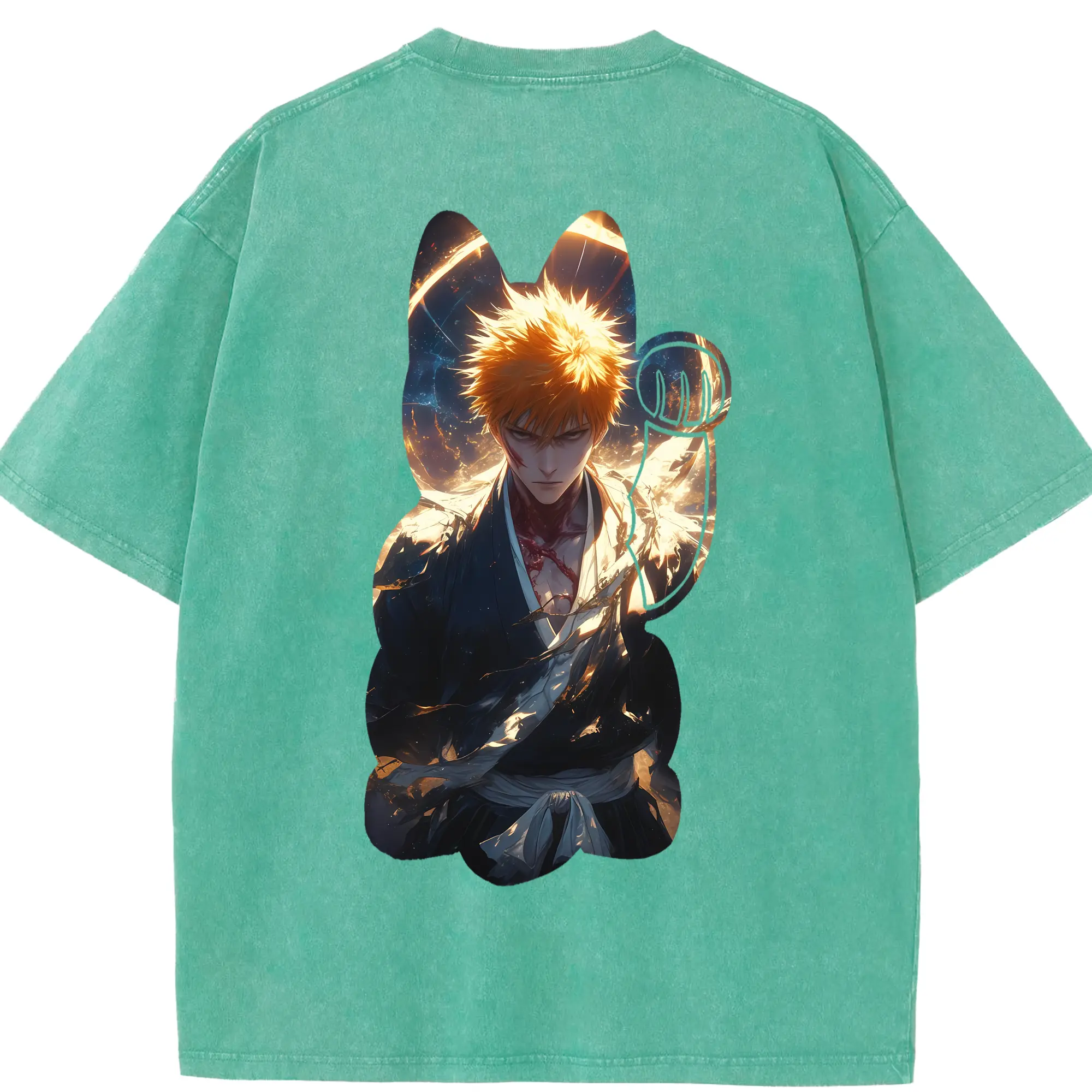 ブリーチ グッズ 黒崎 一護 - 綿100% ヴィンテージ風 半袖Tシャツ ・ フロントプリント ・ 柔らか肌触り ・ 通気性 快適 ・ スポーツ カジュアル 外出用